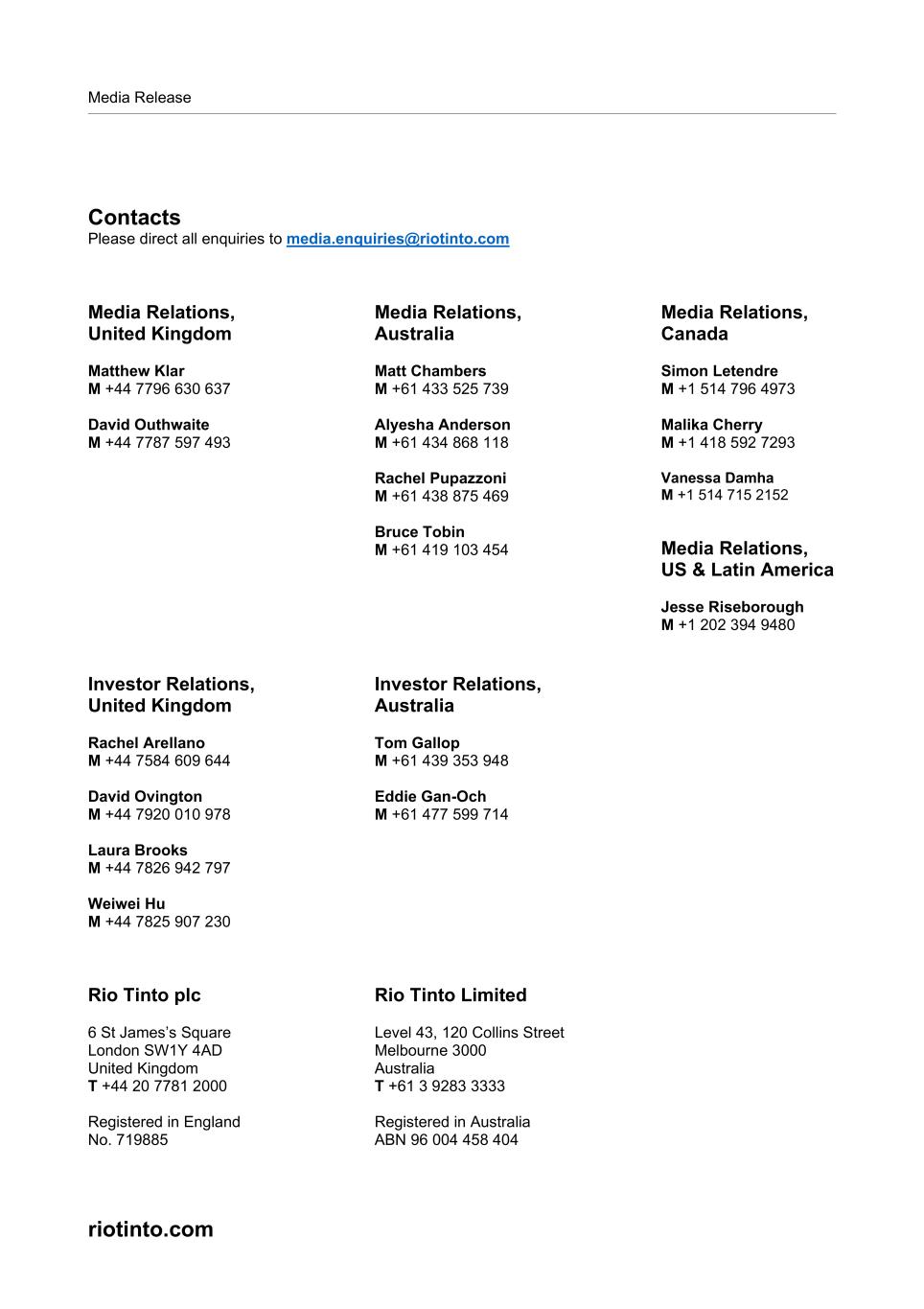 Media Release Contacts Please direct all enquiries to media.enquiries@riotinto.com Media Relations, United Kingdom Matthew Klar M +44 7796 630 637 David Outhwaite M +44 7787 597 493 Media Relations, Australia Matt Chambers M +61 433 525 739 Alyesha Anderson M +61 434 868 118 Rachel Pupazzoni M +61 438 875 469 Bruce Tobin  M +61 419 103 454 Media Relations, Canada Simon Letendre M +1 514 796 4973 Malika Cherry M +1 418 592 7293 Vanessa Damha M +1 514 715 2152 Media Relations, US & Latin America Jesse Riseborough M +1 202 394 9480 Investor Relations, United Kingdom Rachel Arellano M +44 7584 609 644 David Ovington M +44 7920 010 978 Laura Brooks M +44 7826 942 797 Weiwei Hu M +44 7825 907 230 Investor Relations, Australia Tom Gallop M +61 439 353 948 Eddie Gan-Och M +61 477 599 714 Rio Tinto plc 6 St James’s Square London SW1Y 4AD United Kingdom T +44 20 7781 2000 Registered in England No. 719885 Rio Tinto Limited Level 43, 120 Collins Street Melbourne 3000 Australia T +61 3 9283 3333 Registered in Australia ABN 96 004 458 404 riotinto.com