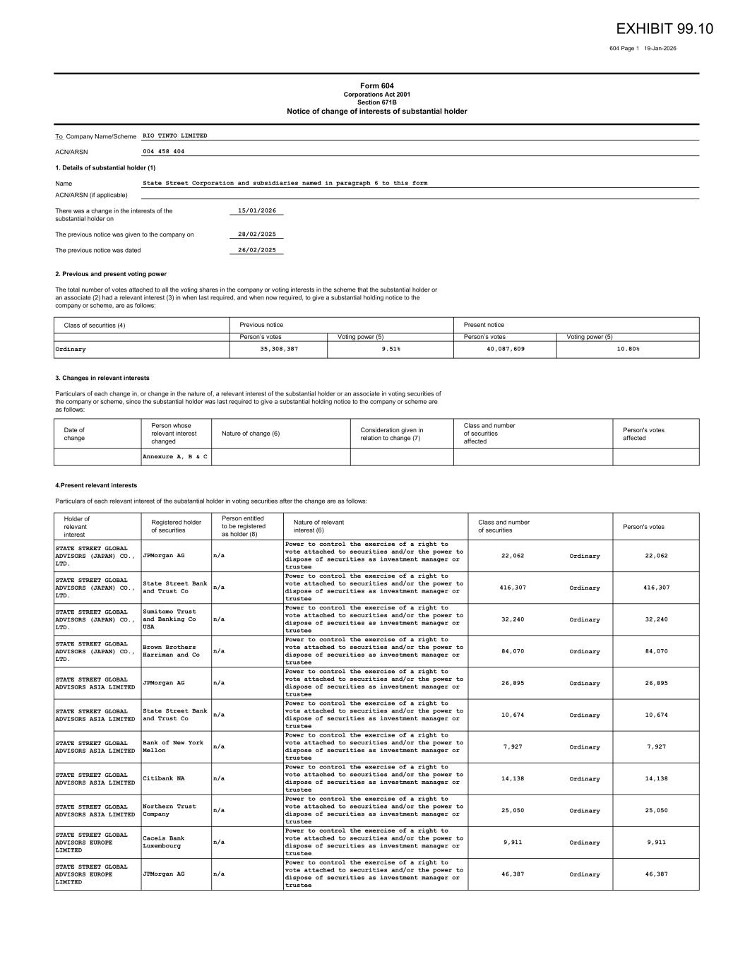 604 Page 1 19-Jan-2026 To Company Name/Scheme ACN/ARSN 1. Details of substantial holder (1) Name ACN/ARSN (if applicable) There was a change in the interests of the 15/01/2026 substantial holder on The previous notice was given to the company on 28/02/2025 The previous notice was dated 26/02/2025 2. Previous and present voting power The total number of votes attached to all the voting shares in the company or voting interests in the scheme that the substantial holder or an associate (2) had a relevant interest (3) in when last required, and when now required, to give a substantial holding notice to the company or scheme, are as follows: Class of securities (4) 3. Changes in relevant interests Particulars of each change in, or change in the nature of, a relevant interest of the substantial holder or an associate in voting securities of the company or scheme, since the substantial holder was last required to give a substantial holding notice to the company or scheme are as follows: Date of change Consideration given in relation to change (7) Person's votes affected 4.Present relevant interests Particulars of each relevant interest of the substantial holder in voting securities after the change are as follows: Holder of relevant interest Person's votes STATE STREET GLOBAL ADVISORS (JAPAN) CO., LTD. 22,062 Ordinary 22,062 STATE STREET GLOBAL ADVISORS (JAPAN) CO., LTD. 416,307 Ordinary 416,307 STATE STREET GLOBAL ADVISORS (JAPAN) CO., LTD. 32,240 Ordinary 32,240 STATE STREET GLOBAL ADVISORS (JAPAN) CO., LTD. 84,070 Ordinary 84,070 STATE STREET GLOBAL ADVISORS ASIA LIMITED 26,895 Ordinary 26,895 STATE STREET GLOBAL ADVISORS ASIA LIMITED 10,674 Ordinary 10,674 STATE STREET GLOBAL ADVISORS ASIA LIMITED 7,927 Ordinary 7,927 STATE STREET GLOBAL ADVISORS ASIA LIMITED 14,138 Ordinary 14,138 STATE STREET GLOBAL ADVISORS ASIA LIMITED 25,050 Ordinary 25,050 STATE STREET GLOBAL ADVISORS EUROPE LIMITED 9,911 Ordinary 9,911 STATE STREET GLOBAL ADVISORS EUROPE LIMITED 46,387 Ordinary 46,387 Present notice JPMorgan AG Voting power (5) n/a Person’s votes State Street Bank and Trust Co Power to control the exercise of a right to vote attached to securities and/or the power to dispose of securities as investment manager or trustee JPMorgan AG Brown Brothers Harriman and Co n/a Power to control the exercise of a right to vote attached to securities and/or the power to dispose of securities as investment manager or trustee Power to control the exercise of a right to vote attached to securities and/or the power to dispose of securities as investment manager or trustee Registered holder of securities n/a Power to control the exercise of a right to vote attached to securities and/or the power to dispose of securities as investment manager or trustee RIO TINTO LIMITED Power to control the exercise of a right to vote attached to securities and/or the power to dispose of securities as investment manager or trustee Class and number of securities affected Power to control the exercise of a right to vote attached to securities and/or the power to dispose of securities as investment manager or trustee JPMorgan AG Previous notice 10.80% n/a Nature of change (6) 004 458 404 Voting power (5) 40,087,609 Sumitomo Trust and Banking Co USA Person whose relevant interest changed 9.51% Annexure A, B & C 35,308,387 n/a n/a Power to control the exercise of a right to vote attached to securities and/or the power to dispose of securities as investment manager or trustee Corporations Act 2001 Bank of New York Mellon n/a Power to control the exercise of a right to vote attached to securities and/or the power to dispose of securities as investment manager or trustee n/a n/a Form 604 State Street Bank and Trust Co n/a Nature of relevant interest (6) Caceis Bank Luxembourg Ordinary State Street Corporation and subsidiaries named in paragraph 6 to this form Power to control the exercise of a right to vote attached to securities and/or the power to dispose of securities as investment manager or trustee Power to control the exercise of a right to vote attached to securities and/or the power to dispose of securities as investment manager or trustee Person’s votes Section 671B Citibank NA n/a Notice of change of interests of substantial holder Class and number of securities Power to control the exercise of a right to vote attached to securities and/or the power to dispose of securities as investment manager or trustee Person entitled to be registered as holder (8) Northern Trust Company EXHIBIT 99.10