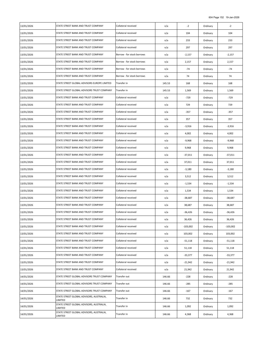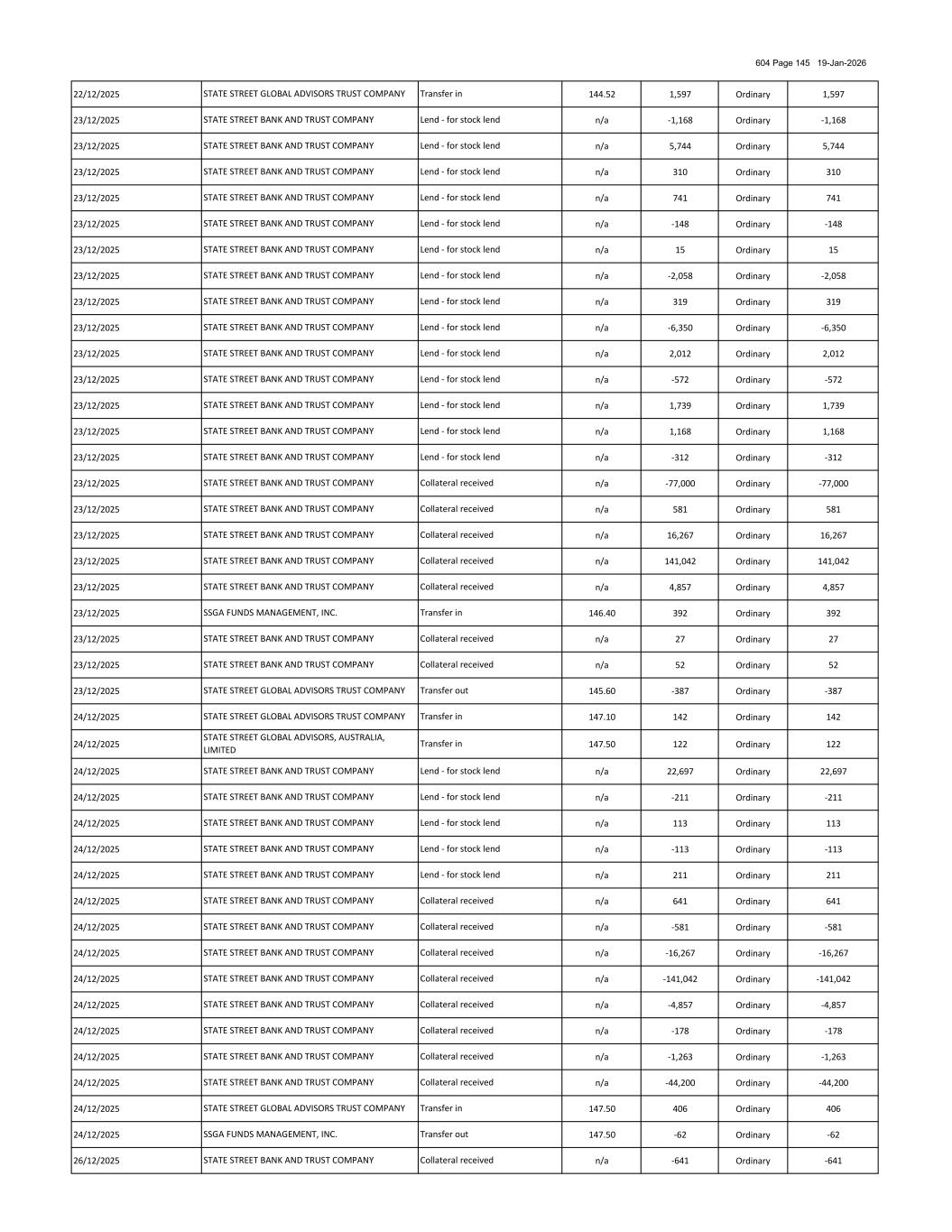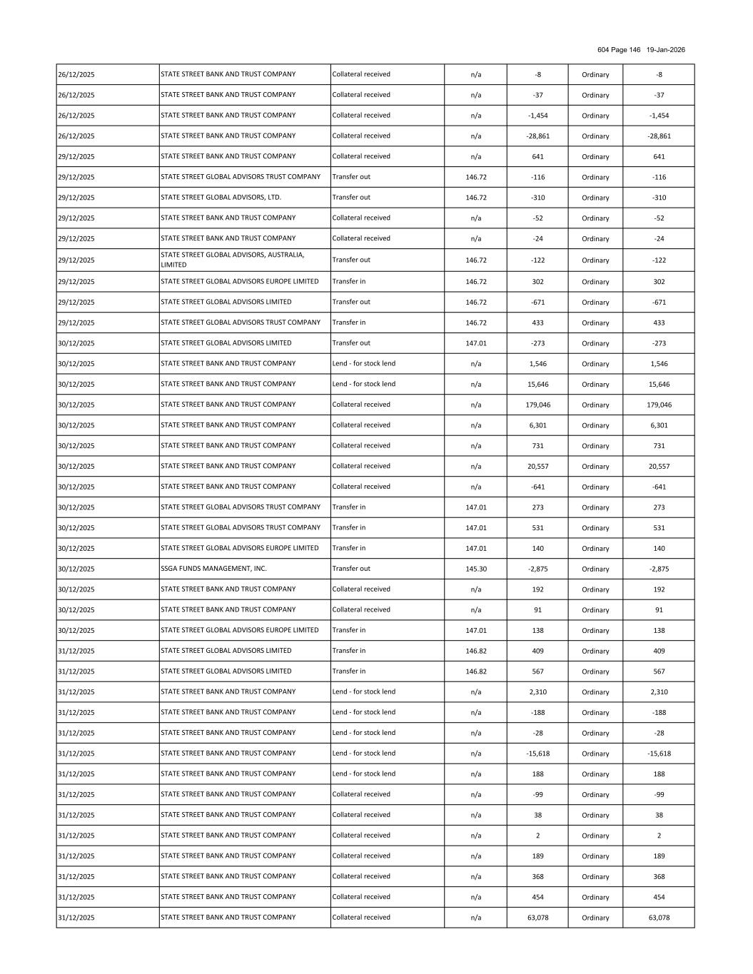 604 Page 152 19-Jan-2026 13/01/2026 n/a -2 Ordinary -2 13/01/2026 n/a 104 Ordinary 104 13/01/2026 n/a 233 Ordinary 233 13/01/2026 n/a 297 Ordinary 297 13/01/2026 n/a -2,157 Ordinary -2,157 13/01/2026 n/a 2,157 Ordinary 2,157 13/01/2026 n/a -74 Ordinary -74 13/01/2026 n/a 74 Ordinary 74 13/01/2026 145.53 168 Ordinary 168 13/01/2026 145.53 1,569 Ordinary 1,569 13/01/2026 n/a -729 Ordinary -729 13/01/2026 n/a 729 Ordinary 729 13/01/2026 n/a -357 Ordinary -357 13/01/2026 n/a 357 Ordinary 357 13/01/2026 n/a -3,916 Ordinary -3,916 13/01/2026 n/a 4,002 Ordinary 4,002 13/01/2026 n/a -9,968 Ordinary -9,968 13/01/2026 n/a 9,968 Ordinary 9,968 13/01/2026 n/a -37,011 Ordinary -37,011 13/01/2026 n/a 37,011 Ordinary 37,011 13/01/2026 n/a -3,180 Ordinary -3,180 13/01/2026 n/a 3,512 Ordinary 3,512 13/01/2026 n/a -1,534 Ordinary -1,534 13/01/2026 n/a 1,534 Ordinary 1,534 13/01/2026 n/a -38,687 Ordinary -38,687 13/01/2026 n/a 38,687 Ordinary 38,687 13/01/2026 n/a -36,426 Ordinary -36,426 13/01/2026 n/a 36,426 Ordinary 36,426 13/01/2026 n/a -103,002 Ordinary -103,002 13/01/2026 n/a 103,002 Ordinary 103,002 13/01/2026 n/a -51,118 Ordinary -51,118 13/01/2026 n/a 51,118 Ordinary 51,118 13/01/2026 n/a -33,377 Ordinary -33,377 13/01/2026 n/a -21,942 Ordinary -21,942 13/01/2026 n/a 21,942 Ordinary 21,942 14/01/2026 146.66 -228 Ordinary -228 14/01/2026 146.66 -285 Ordinary -285 14/01/2026 146.66 -167 Ordinary -167 14/01/2026 146.66 732 Ordinary 732 14/01/2026 146.66 1,092 Ordinary 1,092 14/01/2026 146.66 4,368 Ordinary 4,368 STATE STREET BANK AND TRUST COMPANY Transfer in Collateral received Collateral received Collateral received STATE STREET GLOBAL ADVISORS EUROPE LIMITED STATE STREET BANK AND TRUST COMPANY STATE STREET GLOBAL ADVISORS TRUST COMPANY STATE STREET BANK AND TRUST COMPANY Collateral received STATE STREET BANK AND TRUST COMPANY Collateral received Collateral received STATE STREET BANK AND TRUST COMPANY STATE STREET BANK AND TRUST COMPANY Collateral received Collateral received Collateral received Collateral received Collateral received STATE STREET BANK AND TRUST COMPANY STATE STREET BANK AND TRUST COMPANY STATE STREET BANK AND TRUST COMPANY STATE STREET BANK AND TRUST COMPANY Collateral received Collateral received STATE STREET BANK AND TRUST COMPANY Collateral received STATE STREET BANK AND TRUST COMPANY STATE STREET BANK AND TRUST COMPANY Collateral received Collateral received Transfer out Collateral received STATE STREET BANK AND TRUST COMPANY Transfer out STATE STREET BANK AND TRUST COMPANY STATE STREET BANK AND TRUST COMPANY STATE STREET BANK AND TRUST COMPANY STATE STREET BANK AND TRUST COMPANY STATE STREET BANK AND TRUST COMPANY Collateral received Collateral received STATE STREET GLOBAL ADVISORS TRUST COMPANY Borrow - for stock borrows STATE STREET GLOBAL ADVISORS TRUST COMPANY STATE STREET BANK AND TRUST COMPANY Collateral received Collateral received Collateral received Transfer outSTATE STREET GLOBAL ADVISORS TRUST COMPANY Collateral received Transfer in Transfer in STATE STREET BANK AND TRUST COMPANY STATE STREET BANK AND TRUST COMPANY STATE STREET BANK AND TRUST COMPANY STATE STREET BANK AND TRUST COMPANY Borrow - for stock borrowsSTATE STREET BANK AND TRUST COMPANY STATE STREET BANK AND TRUST COMPANY Borrow - for stock borrows STATE STREET BANK AND TRUST COMPANY STATE STREET GLOBAL ADVISORS, AUSTRALIA, LIMITED Collateral received Collateral received Borrow - for stock borrows Collateral received STATE STREET GLOBAL ADVISORS, AUSTRALIA, LIMITED Collateral received Transfer in STATE STREET BANK AND TRUST COMPANY STATE STREET BANK AND TRUST COMPANY STATE STREET BANK AND TRUST COMPANY STATE STREET BANK AND TRUST COMPANY STATE STREET BANK AND TRUST COMPANY Transfer in STATE STREET BANK AND TRUST COMPANY STATE STREET GLOBAL ADVISORS, AUSTRALIA, LIMITED Collateral received Collateral received