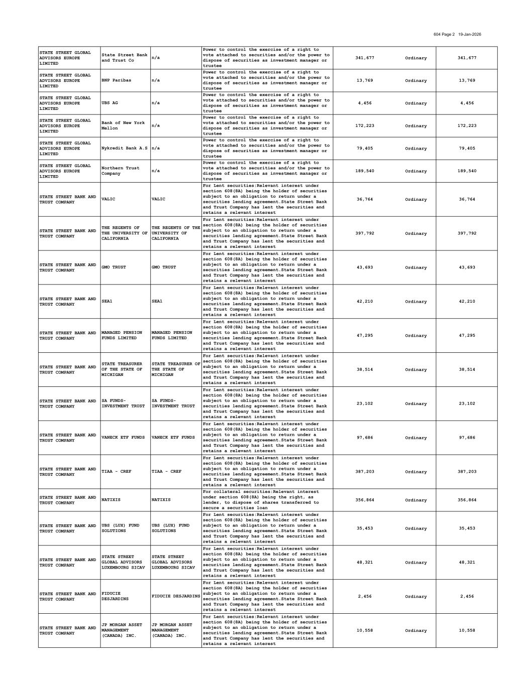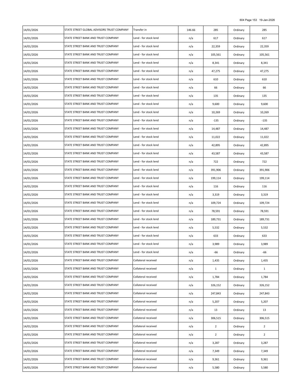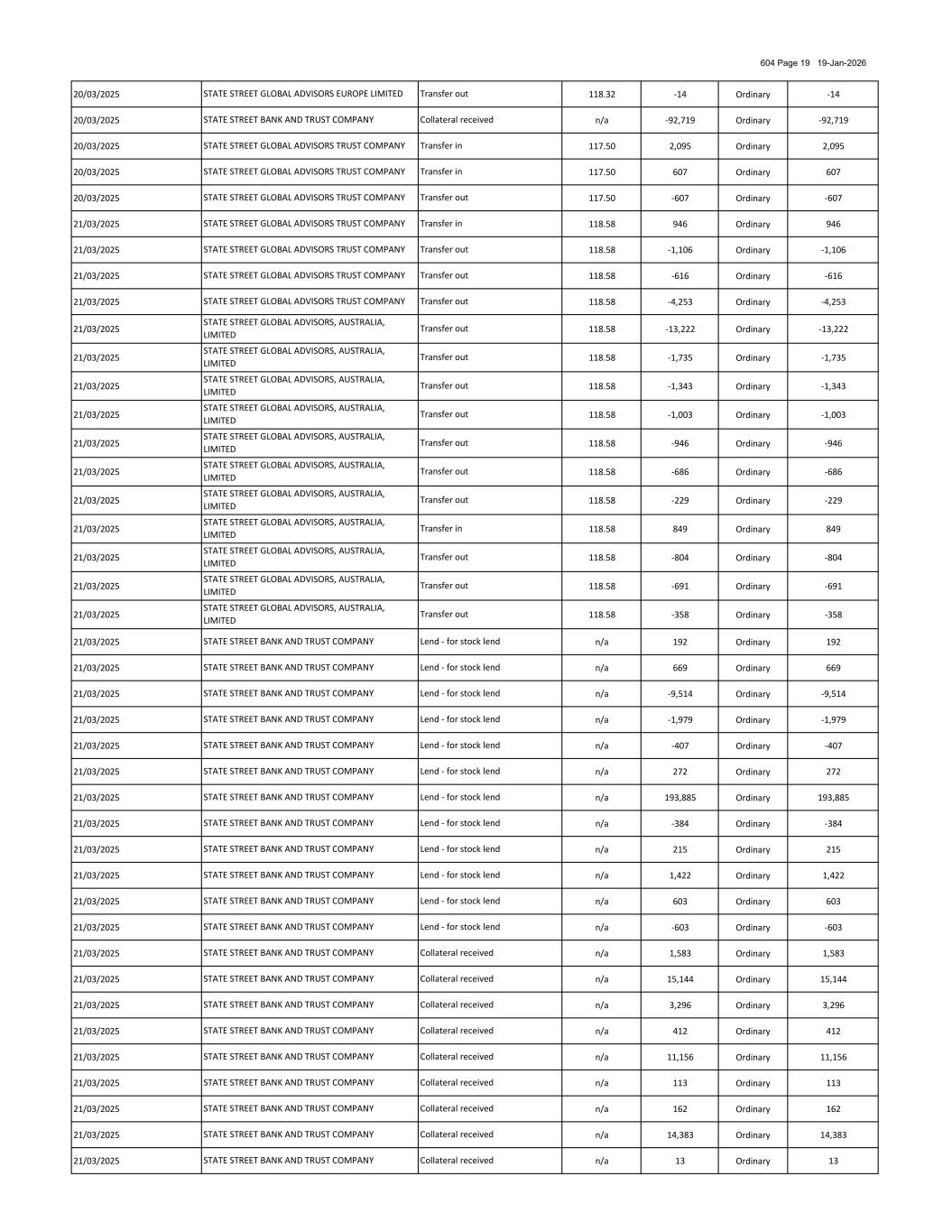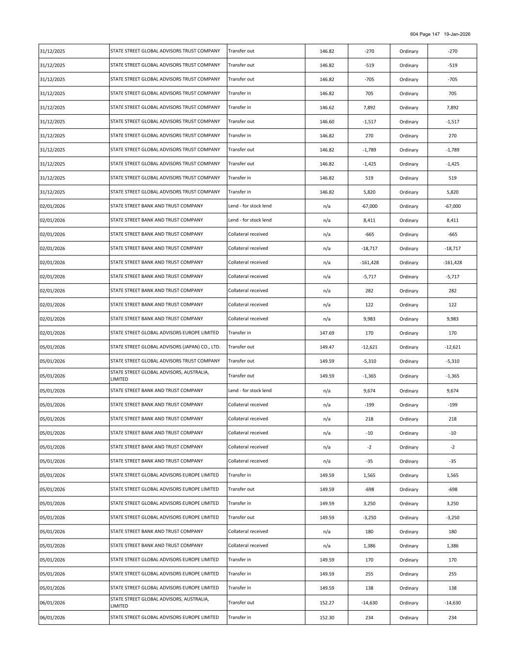 604 Page 152 19-Jan-2026 13/01/2026 n/a -2 Ordinary -2 13/01/2026 n/a 104 Ordinary 104 13/01/2026 n/a 233 Ordinary 233 13/01/2026 n/a 297 Ordinary 297 13/01/2026 n/a -2,157 Ordinary -2,157 13/01/2026 n/a 2,157 Ordinary 2,157 13/01/2026 n/a -74 Ordinary -74 13/01/2026 n/a 74 Ordinary 74 13/01/2026 145.53 168 Ordinary 168 13/01/2026 145.53 1,569 Ordinary 1,569 13/01/2026 n/a -729 Ordinary -729 13/01/2026 n/a 729 Ordinary 729 13/01/2026 n/a -357 Ordinary -357 13/01/2026 n/a 357 Ordinary 357 13/01/2026 n/a -3,916 Ordinary -3,916 13/01/2026 n/a 4,002 Ordinary 4,002 13/01/2026 n/a -9,968 Ordinary -9,968 13/01/2026 n/a 9,968 Ordinary 9,968 13/01/2026 n/a -37,011 Ordinary -37,011 13/01/2026 n/a 37,011 Ordinary 37,011 13/01/2026 n/a -3,180 Ordinary -3,180 13/01/2026 n/a 3,512 Ordinary 3,512 13/01/2026 n/a -1,534 Ordinary -1,534 13/01/2026 n/a 1,534 Ordinary 1,534 13/01/2026 n/a -38,687 Ordinary -38,687 13/01/2026 n/a 38,687 Ordinary 38,687 13/01/2026 n/a -36,426 Ordinary -36,426 13/01/2026 n/a 36,426 Ordinary 36,426 13/01/2026 n/a -103,002 Ordinary -103,002 13/01/2026 n/a 103,002 Ordinary 103,002 13/01/2026 n/a -51,118 Ordinary -51,118 13/01/2026 n/a 51,118 Ordinary 51,118 13/01/2026 n/a -33,377 Ordinary -33,377 13/01/2026 n/a -21,942 Ordinary -21,942 13/01/2026 n/a 21,942 Ordinary 21,942 14/01/2026 146.66 -228 Ordinary -228 14/01/2026 146.66 -285 Ordinary -285 14/01/2026 146.66 -167 Ordinary -167 14/01/2026 146.66 732 Ordinary 732 14/01/2026 146.66 1,092 Ordinary 1,092 14/01/2026 146.66 4,368 Ordinary 4,368 STATE STREET BANK AND TRUST COMPANY Transfer in Collateral received Collateral received Collateral received STATE STREET GLOBAL ADVISORS EUROPE LIMITED STATE STREET BANK AND TRUST COMPANY STATE STREET GLOBAL ADVISORS TRUST COMPANY STATE STREET BANK AND TRUST COMPANY Collateral received STATE STREET BANK AND TRUST COMPANY Collateral received Collateral received STATE STREET BANK AND TRUST COMPANY STATE STREET BANK AND TRUST COMPANY Collateral received Collateral received Collateral received Collateral received Collateral received STATE STREET BANK AND TRUST COMPANY STATE STREET BANK AND TRUST COMPANY STATE STREET BANK AND TRUST COMPANY STATE STREET BANK AND TRUST COMPANY Collateral received Collateral received STATE STREET BANK AND TRUST COMPANY Collateral received STATE STREET BANK AND TRUST COMPANY STATE STREET BANK AND TRUST COMPANY Collateral received Collateral received Transfer out Collateral received STATE STREET BANK AND TRUST COMPANY Transfer out STATE STREET BANK AND TRUST COMPANY STATE STREET BANK AND TRUST COMPANY STATE STREET BANK AND TRUST COMPANY STATE STREET BANK AND TRUST COMPANY STATE STREET BANK AND TRUST COMPANY Collateral received Collateral received STATE STREET GLOBAL ADVISORS TRUST COMPANY Borrow - for stock borrows STATE STREET GLOBAL ADVISORS TRUST COMPANY STATE STREET BANK AND TRUST COMPANY Collateral received Collateral received Collateral received Transfer outSTATE STREET GLOBAL ADVISORS TRUST COMPANY Collateral received Transfer in Transfer in STATE STREET BANK AND TRUST COMPANY STATE STREET BANK AND TRUST COMPANY STATE STREET BANK AND TRUST COMPANY STATE STREET BANK AND TRUST COMPANY Borrow - for stock borrowsSTATE STREET BANK AND TRUST COMPANY STATE STREET BANK AND TRUST COMPANY Borrow - for stock borrows STATE STREET BANK AND TRUST COMPANY STATE STREET GLOBAL ADVISORS, AUSTRALIA, LIMITED Collateral received Collateral received Borrow - for stock borrows Collateral received STATE STREET GLOBAL ADVISORS, AUSTRALIA, LIMITED Collateral received Transfer in STATE STREET BANK AND TRUST COMPANY STATE STREET BANK AND TRUST COMPANY STATE STREET BANK AND TRUST COMPANY STATE STREET BANK AND TRUST COMPANY STATE STREET BANK AND TRUST COMPANY Transfer in STATE STREET BANK AND TRUST COMPANY STATE STREET GLOBAL ADVISORS, AUSTRALIA, LIMITED Collateral received Collateral received