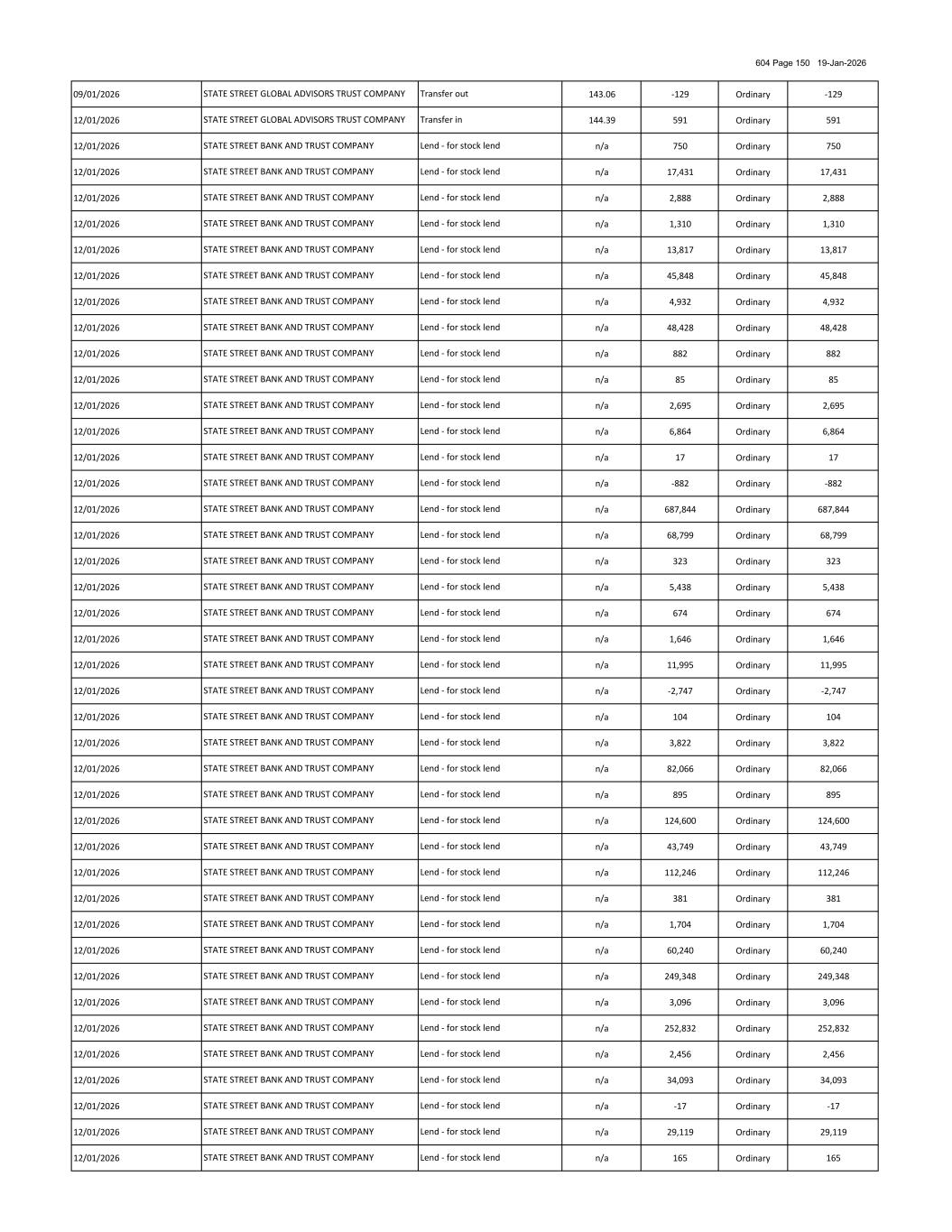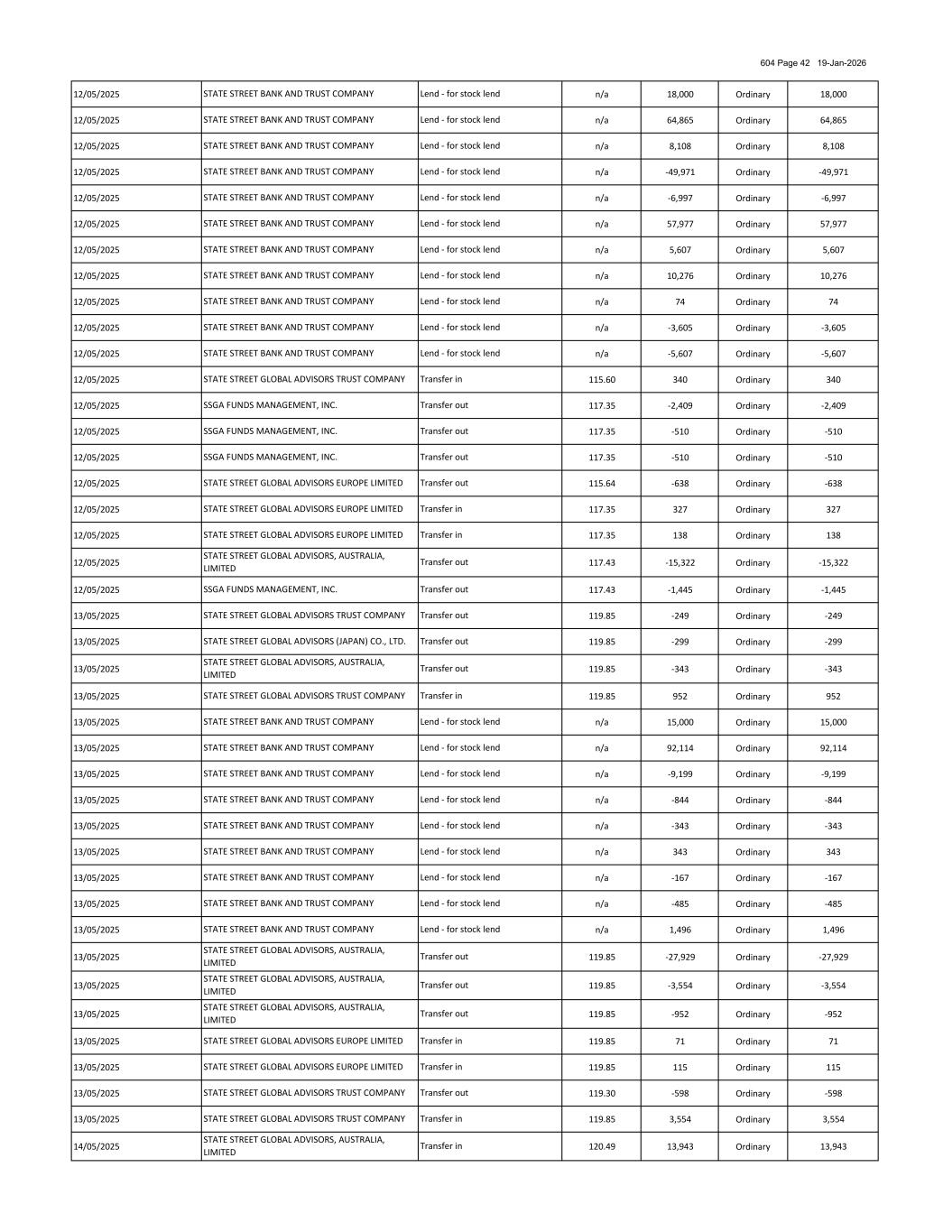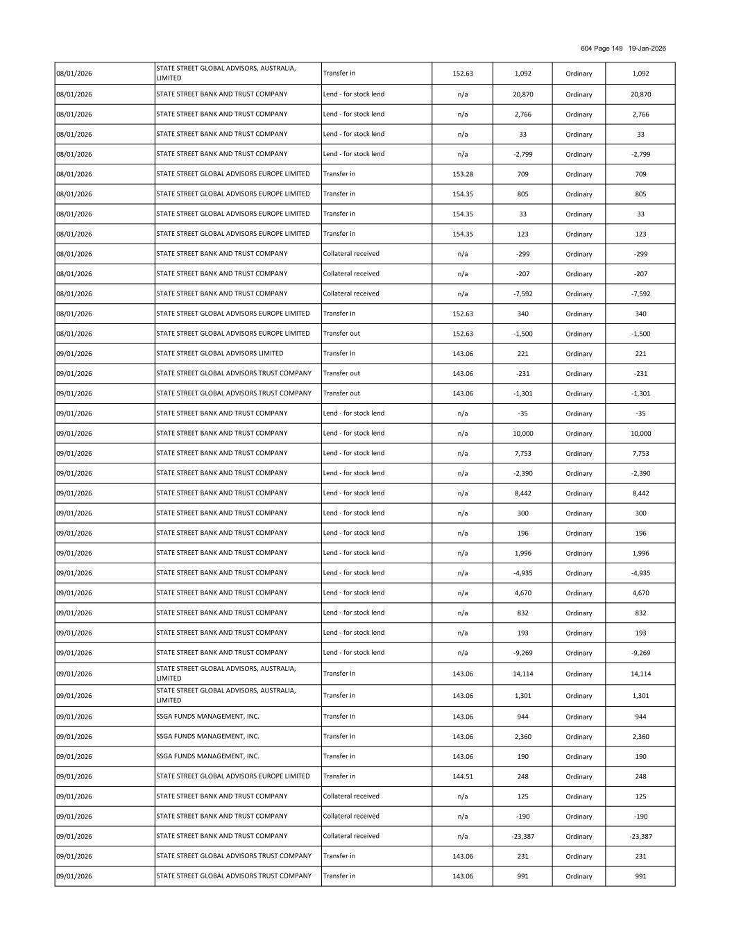 604 Page 150 19-Jan-2026 09/01/2026 143.06 -129 Ordinary -129 12/01/2026 144.39 591 Ordinary 591 12/01/2026 n/a 750 Ordinary 750 12/01/2026 n/a 17,431 Ordinary 17,431 12/01/2026 n/a 2,888 Ordinary 2,888 12/01/2026 n/a 1,310 Ordinary 1,310 12/01/2026 n/a 13,817 Ordinary 13,817 12/01/2026 n/a 45,848 Ordinary 45,848 12/01/2026 n/a 4,932 Ordinary 4,932 12/01/2026 n/a 48,428 Ordinary 48,428 12/01/2026 n/a 882 Ordinary 882 12/01/2026 n/a 85 Ordinary 85 12/01/2026 n/a 2,695 Ordinary 2,695 12/01/2026 n/a 6,864 Ordinary 6,864 12/01/2026 n/a 17 Ordinary 17 12/01/2026 n/a -882 Ordinary -882 12/01/2026 n/a 687,844 Ordinary 687,844 12/01/2026 n/a 68,799 Ordinary 68,799 12/01/2026 n/a 323 Ordinary 323 12/01/2026 n/a 5,438 Ordinary 5,438 12/01/2026 n/a 674 Ordinary 674 12/01/2026 n/a 1,646 Ordinary 1,646 12/01/2026 n/a 11,995 Ordinary 11,995 12/01/2026 n/a -2,747 Ordinary -2,747 12/01/2026 n/a 104 Ordinary 104 12/01/2026 n/a 3,822 Ordinary 3,822 12/01/2026 n/a 82,066 Ordinary 82,066 12/01/2026 n/a 895 Ordinary 895 12/01/2026 n/a 124,600 Ordinary 124,600 12/01/2026 n/a 43,749 Ordinary 43,749 12/01/2026 n/a 112,246 Ordinary 112,246 12/01/2026 n/a 381 Ordinary 381 12/01/2026 n/a 1,704 Ordinary 1,704 12/01/2026 n/a 60,240 Ordinary 60,240 12/01/2026 n/a 249,348 Ordinary 249,348 12/01/2026 n/a 3,096 Ordinary 3,096 12/01/2026 n/a 252,832 Ordinary 252,832 12/01/2026 n/a 2,456 Ordinary 2,456 12/01/2026 n/a 34,093 Ordinary 34,093 12/01/2026 n/a -17 Ordinary -17 12/01/2026 n/a 29,119 Ordinary 29,119 12/01/2026 n/a 165 Ordinary 165 STATE STREET BANK AND TRUST COMPANY Lend - for stock lend STATE STREET BANK AND TRUST COMPANY Lend - for stock lend Lend - for stock lend Lend - for stock lend Lend - for stock lend Lend - for stock lend STATE STREET BANK AND TRUST COMPANY STATE STREET BANK AND TRUST COMPANY STATE STREET BANK AND TRUST COMPANY STATE STREET BANK AND TRUST COMPANY STATE STREET BANK AND TRUST COMPANY Lend - for stock lend STATE STREET BANK AND TRUST COMPANY STATE STREET BANK AND TRUST COMPANY Lend - for stock lend STATE STREET BANK AND TRUST COMPANY Lend - for stock lend Lend - for stock lend Lend - for stock lend STATE STREET BANK AND TRUST COMPANY Lend - for stock lend Lend - for stock lend Lend - for stock lend STATE STREET BANK AND TRUST COMPANY STATE STREET BANK AND TRUST COMPANY STATE STREET BANK AND TRUST COMPANY STATE STREET BANK AND TRUST COMPANY Lend - for stock lend STATE STREET BANK AND TRUST COMPANY STATE STREET BANK AND TRUST COMPANY STATE STREET BANK AND TRUST COMPANY STATE STREET BANK AND TRUST COMPANY Lend - for stock lend Lend - for stock lend Lend - for stock lend Lend - for stock lend Lend - for stock lend Lend - for stock lend STATE STREET BANK AND TRUST COMPANY STATE STREET BANK AND TRUST COMPANY Transfer out STATE STREET BANK AND TRUST COMPANY Transfer in STATE STREET BANK AND TRUST COMPANY STATE STREET BANK AND TRUST COMPANY STATE STREET BANK AND TRUST COMPANY Lend - for stock lend Lend - for stock lend Lend - for stock lendSTATE STREET BANK AND TRUST COMPANY Lend - for stock lend Lend - for stock lend Lend - for stock lend STATE STREET GLOBAL ADVISORS TRUST COMPANY Lend - for stock lend STATE STREET GLOBAL ADVISORS TRUST COMPANY STATE STREET BANK AND TRUST COMPANY STATE STREET BANK AND TRUST COMPANY Lend - for stock lendSTATE STREET BANK AND TRUST COMPANY STATE STREET BANK AND TRUST COMPANY STATE STREET BANK AND TRUST COMPANY Lend - for stock lend STATE STREET BANK AND TRUST COMPANY Lend - for stock lend Lend - for stock lend Lend - for stock lend STATE STREET BANK AND TRUST COMPANY Lend - for stock lend Lend - for stock lend Lend - for stock lend Lend - for stock lend STATE STREET BANK AND TRUST COMPANY STATE STREET BANK AND TRUST COMPANY STATE STREET BANK AND TRUST COMPANY STATE STREET BANK AND TRUST COMPANY STATE STREET BANK AND TRUST COMPANY STATE STREET BANK AND TRUST COMPANY Lend - for stock lend STATE STREET BANK AND TRUST COMPANY Lend - for stock lend Lend - for stock lend
