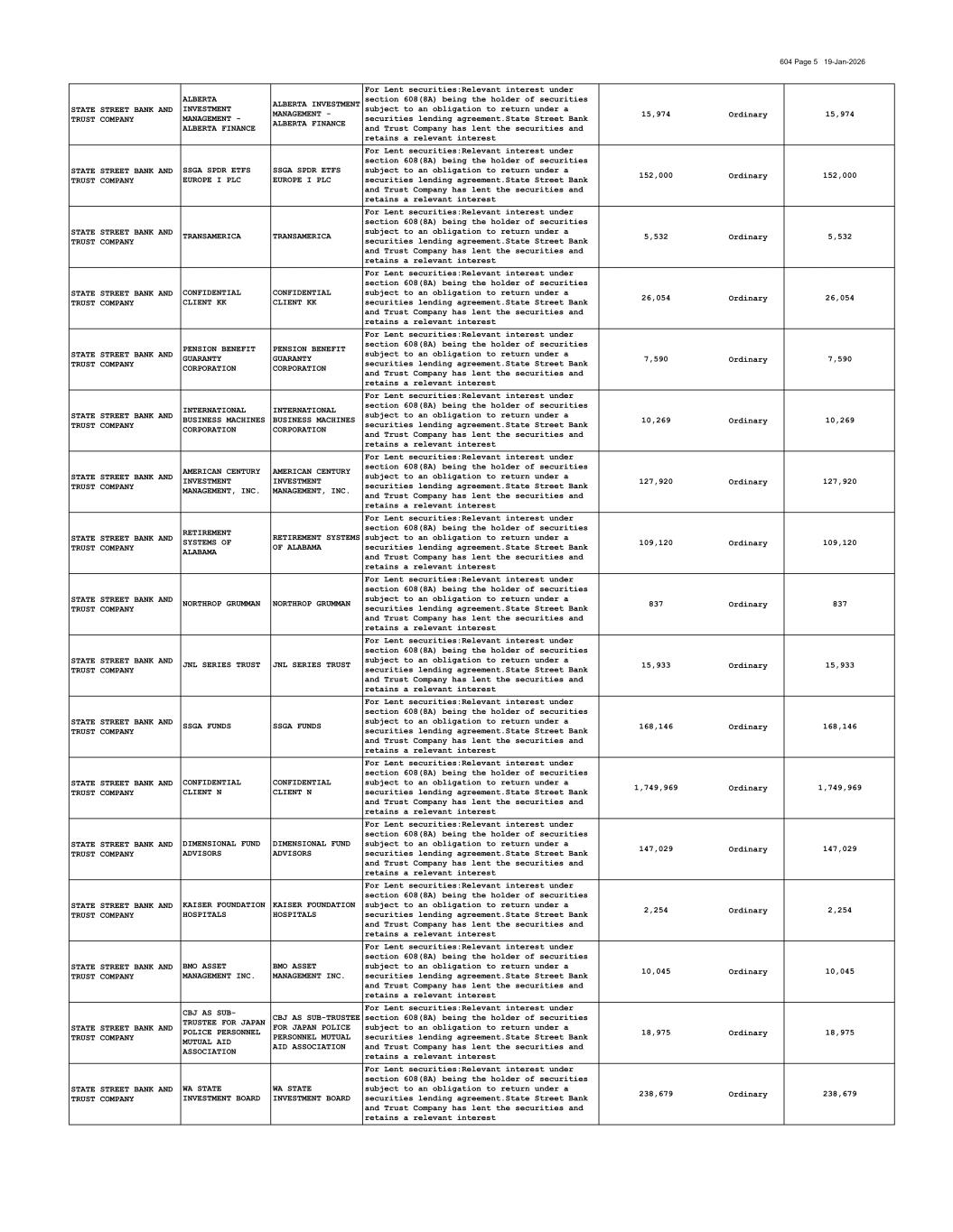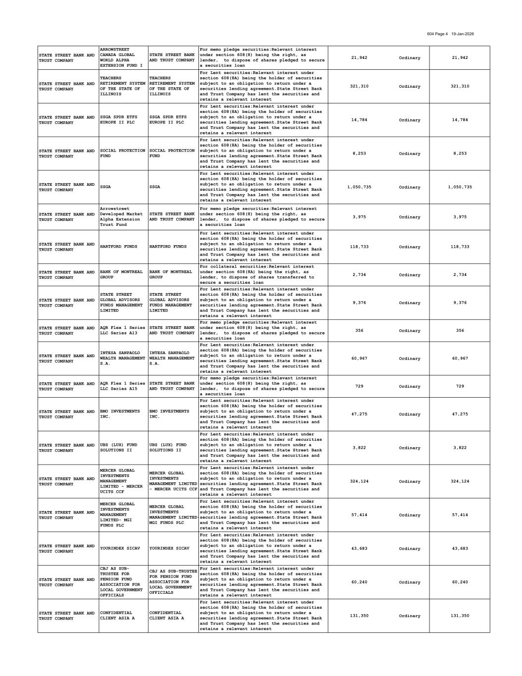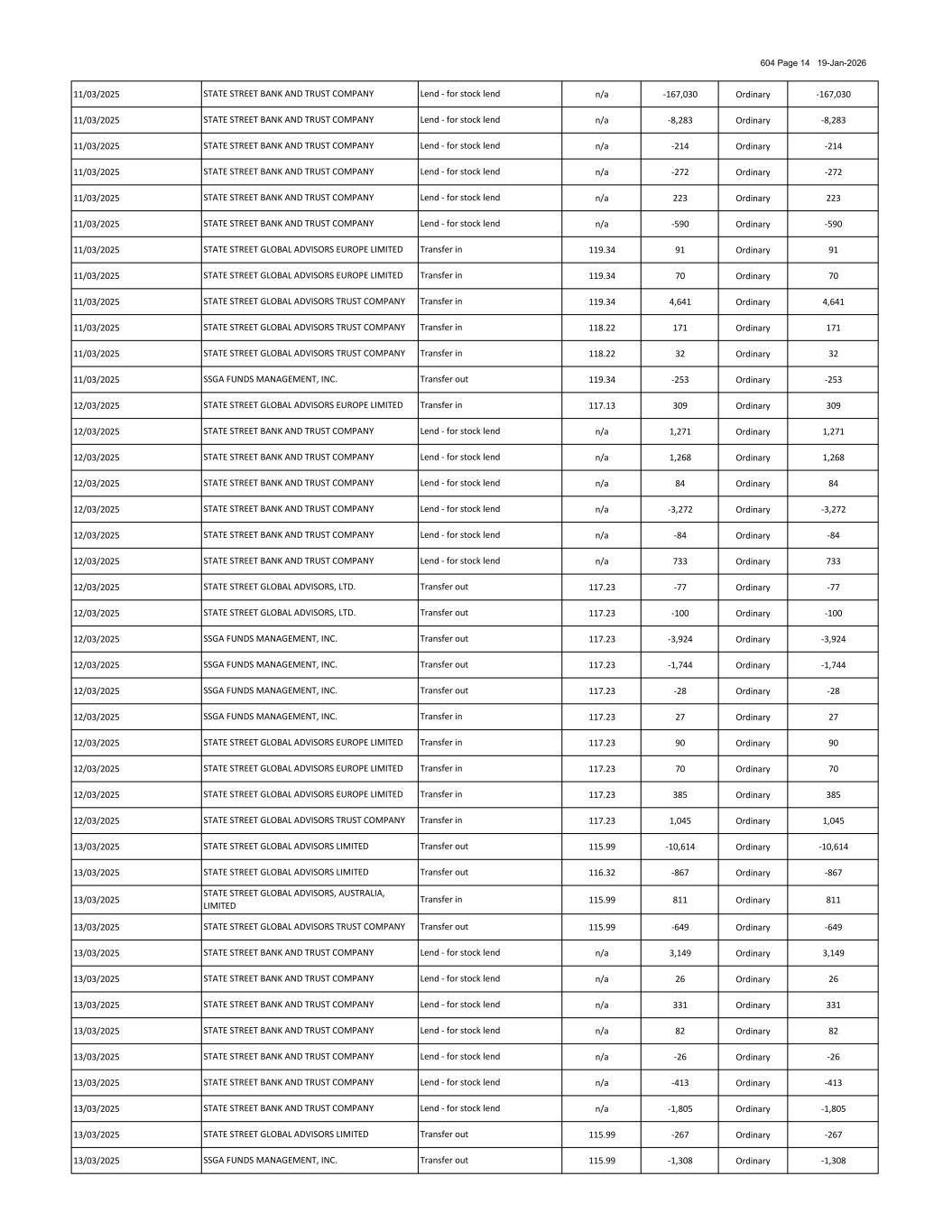 604 Page 150 19-Jan-2026 09/01/2026 143.06 -129 Ordinary -129 12/01/2026 144.39 591 Ordinary 591 12/01/2026 n/a 750 Ordinary 750 12/01/2026 n/a 17,431 Ordinary 17,431 12/01/2026 n/a 2,888 Ordinary 2,888 12/01/2026 n/a 1,310 Ordinary 1,310 12/01/2026 n/a 13,817 Ordinary 13,817 12/01/2026 n/a 45,848 Ordinary 45,848 12/01/2026 n/a 4,932 Ordinary 4,932 12/01/2026 n/a 48,428 Ordinary 48,428 12/01/2026 n/a 882 Ordinary 882 12/01/2026 n/a 85 Ordinary 85 12/01/2026 n/a 2,695 Ordinary 2,695 12/01/2026 n/a 6,864 Ordinary 6,864 12/01/2026 n/a 17 Ordinary 17 12/01/2026 n/a -882 Ordinary -882 12/01/2026 n/a 687,844 Ordinary 687,844 12/01/2026 n/a 68,799 Ordinary 68,799 12/01/2026 n/a 323 Ordinary 323 12/01/2026 n/a 5,438 Ordinary 5,438 12/01/2026 n/a 674 Ordinary 674 12/01/2026 n/a 1,646 Ordinary 1,646 12/01/2026 n/a 11,995 Ordinary 11,995 12/01/2026 n/a -2,747 Ordinary -2,747 12/01/2026 n/a 104 Ordinary 104 12/01/2026 n/a 3,822 Ordinary 3,822 12/01/2026 n/a 82,066 Ordinary 82,066 12/01/2026 n/a 895 Ordinary 895 12/01/2026 n/a 124,600 Ordinary 124,600 12/01/2026 n/a 43,749 Ordinary 43,749 12/01/2026 n/a 112,246 Ordinary 112,246 12/01/2026 n/a 381 Ordinary 381 12/01/2026 n/a 1,704 Ordinary 1,704 12/01/2026 n/a 60,240 Ordinary 60,240 12/01/2026 n/a 249,348 Ordinary 249,348 12/01/2026 n/a 3,096 Ordinary 3,096 12/01/2026 n/a 252,832 Ordinary 252,832 12/01/2026 n/a 2,456 Ordinary 2,456 12/01/2026 n/a 34,093 Ordinary 34,093 12/01/2026 n/a -17 Ordinary -17 12/01/2026 n/a 29,119 Ordinary 29,119 12/01/2026 n/a 165 Ordinary 165 STATE STREET BANK AND TRUST COMPANY Lend - for stock lend STATE STREET BANK AND TRUST COMPANY Lend - for stock lend Lend - for stock lend Lend - for stock lend Lend - for stock lend Lend - for stock lend STATE STREET BANK AND TRUST COMPANY STATE STREET BANK AND TRUST COMPANY STATE STREET BANK AND TRUST COMPANY STATE STREET BANK AND TRUST COMPANY STATE STREET BANK AND TRUST COMPANY Lend - for stock lend STATE STREET BANK AND TRUST COMPANY STATE STREET BANK AND TRUST COMPANY Lend - for stock lend STATE STREET BANK AND TRUST COMPANY Lend - for stock lend Lend - for stock lend Lend - for stock lend STATE STREET BANK AND TRUST COMPANY Lend - for stock lend Lend - for stock lend Lend - for stock lend STATE STREET BANK AND TRUST COMPANY STATE STREET BANK AND TRUST COMPANY STATE STREET BANK AND TRUST COMPANY STATE STREET BANK AND TRUST COMPANY Lend - for stock lend STATE STREET BANK AND TRUST COMPANY STATE STREET BANK AND TRUST COMPANY STATE STREET BANK AND TRUST COMPANY STATE STREET BANK AND TRUST COMPANY Lend - for stock lend Lend - for stock lend Lend - for stock lend Lend - for stock lend Lend - for stock lend Lend - for stock lend STATE STREET BANK AND TRUST COMPANY STATE STREET BANK AND TRUST COMPANY Transfer out STATE STREET BANK AND TRUST COMPANY Transfer in STATE STREET BANK AND TRUST COMPANY STATE STREET BANK AND TRUST COMPANY STATE STREET BANK AND TRUST COMPANY Lend - for stock lend Lend - for stock lend Lend - for stock lendSTATE STREET BANK AND TRUST COMPANY Lend - for stock lend Lend - for stock lend Lend - for stock lend STATE STREET GLOBAL ADVISORS TRUST COMPANY Lend - for stock lend STATE STREET GLOBAL ADVISORS TRUST COMPANY STATE STREET BANK AND TRUST COMPANY STATE STREET BANK AND TRUST COMPANY Lend - for stock lendSTATE STREET BANK AND TRUST COMPANY STATE STREET BANK AND TRUST COMPANY STATE STREET BANK AND TRUST COMPANY Lend - for stock lend STATE STREET BANK AND TRUST COMPANY Lend - for stock lend Lend - for stock lend Lend - for stock lend STATE STREET BANK AND TRUST COMPANY Lend - for stock lend Lend - for stock lend Lend - for stock lend Lend - for stock lend STATE STREET BANK AND TRUST COMPANY STATE STREET BANK AND TRUST COMPANY STATE STREET BANK AND TRUST COMPANY STATE STREET BANK AND TRUST COMPANY STATE STREET BANK AND TRUST COMPANY STATE STREET BANK AND TRUST COMPANY Lend - for stock lend STATE STREET BANK AND TRUST COMPANY Lend - for stock lend Lend - for stock lend