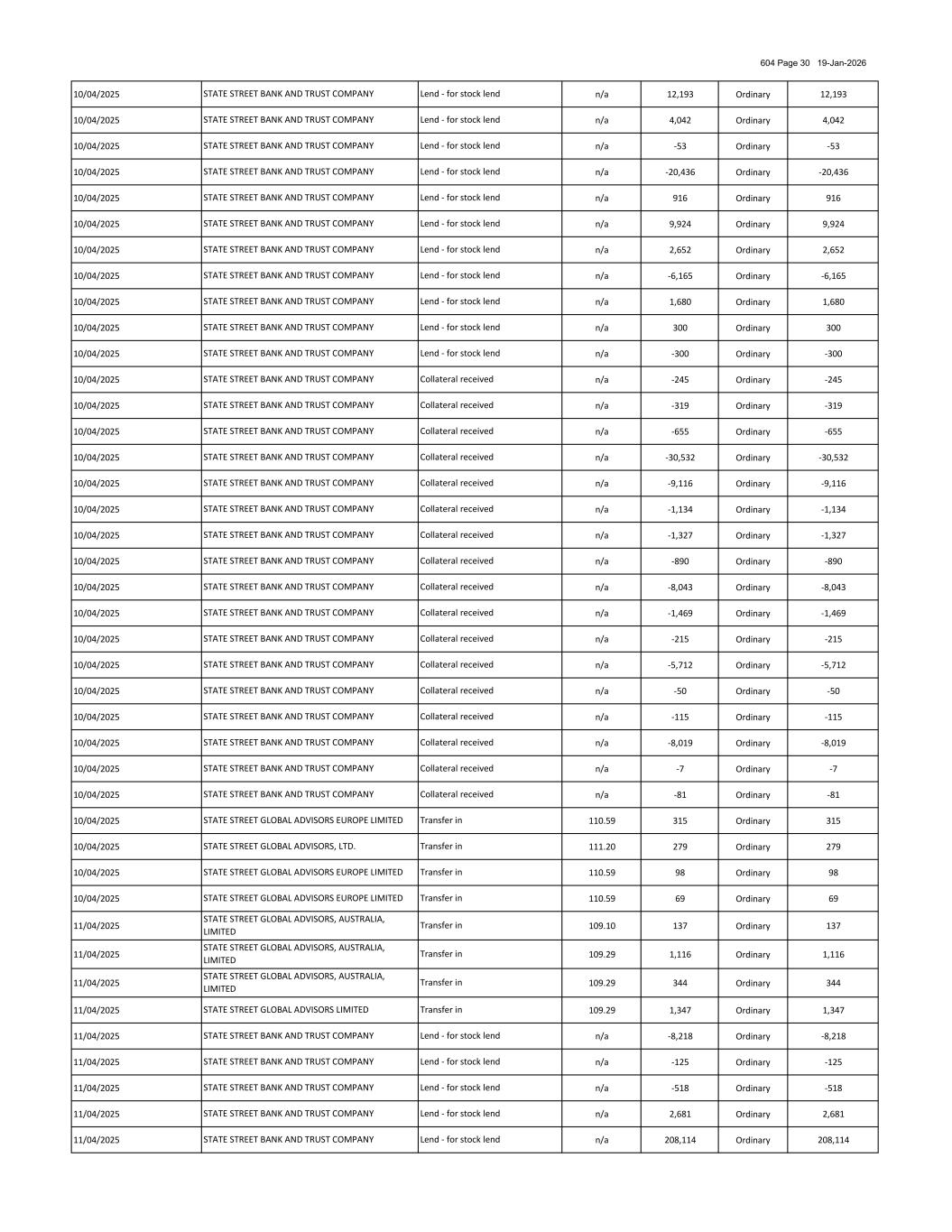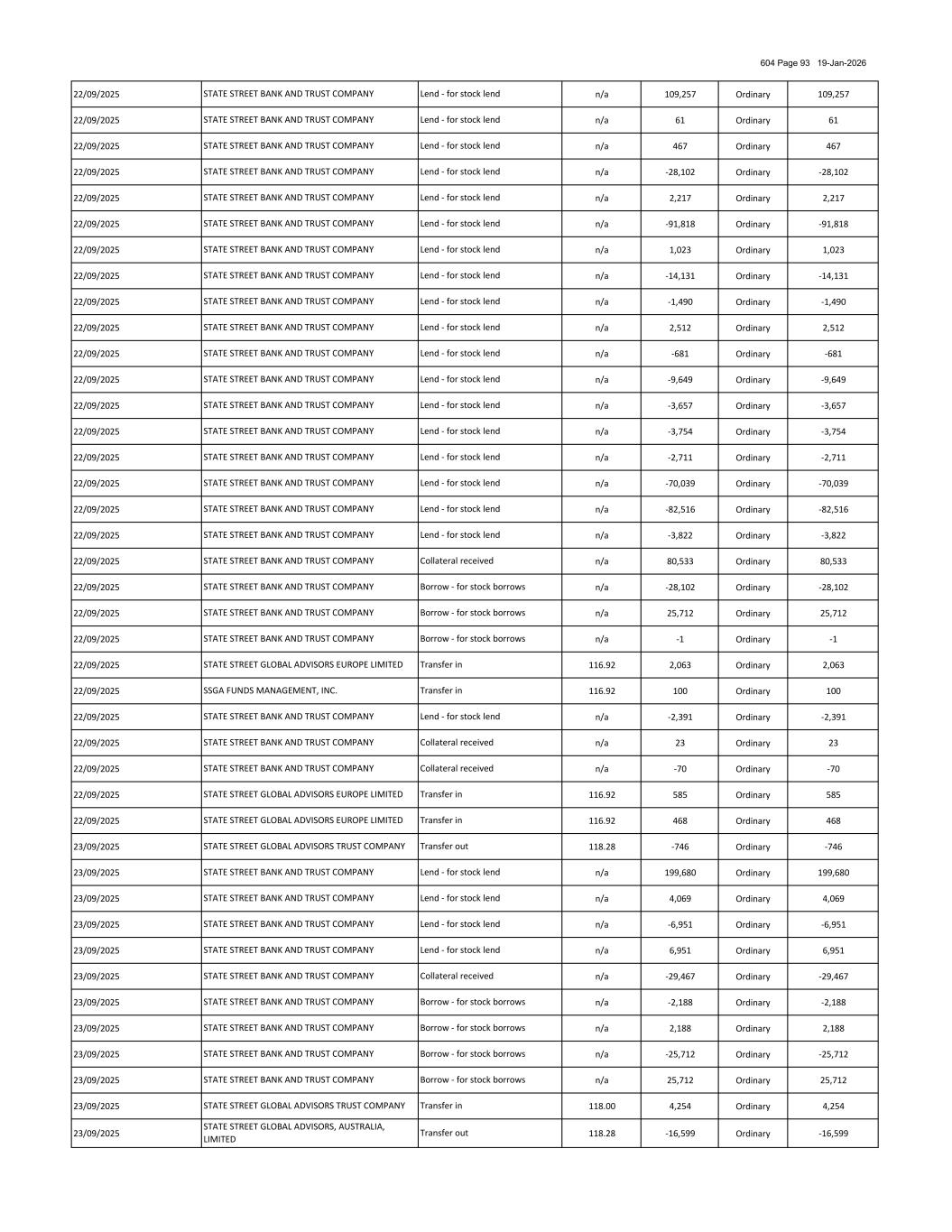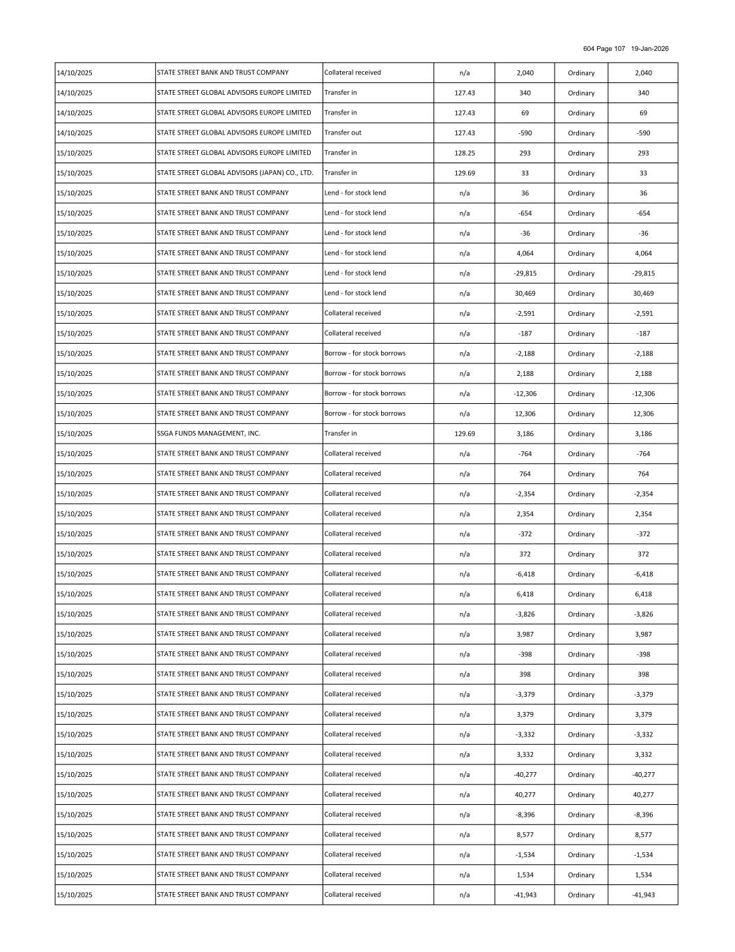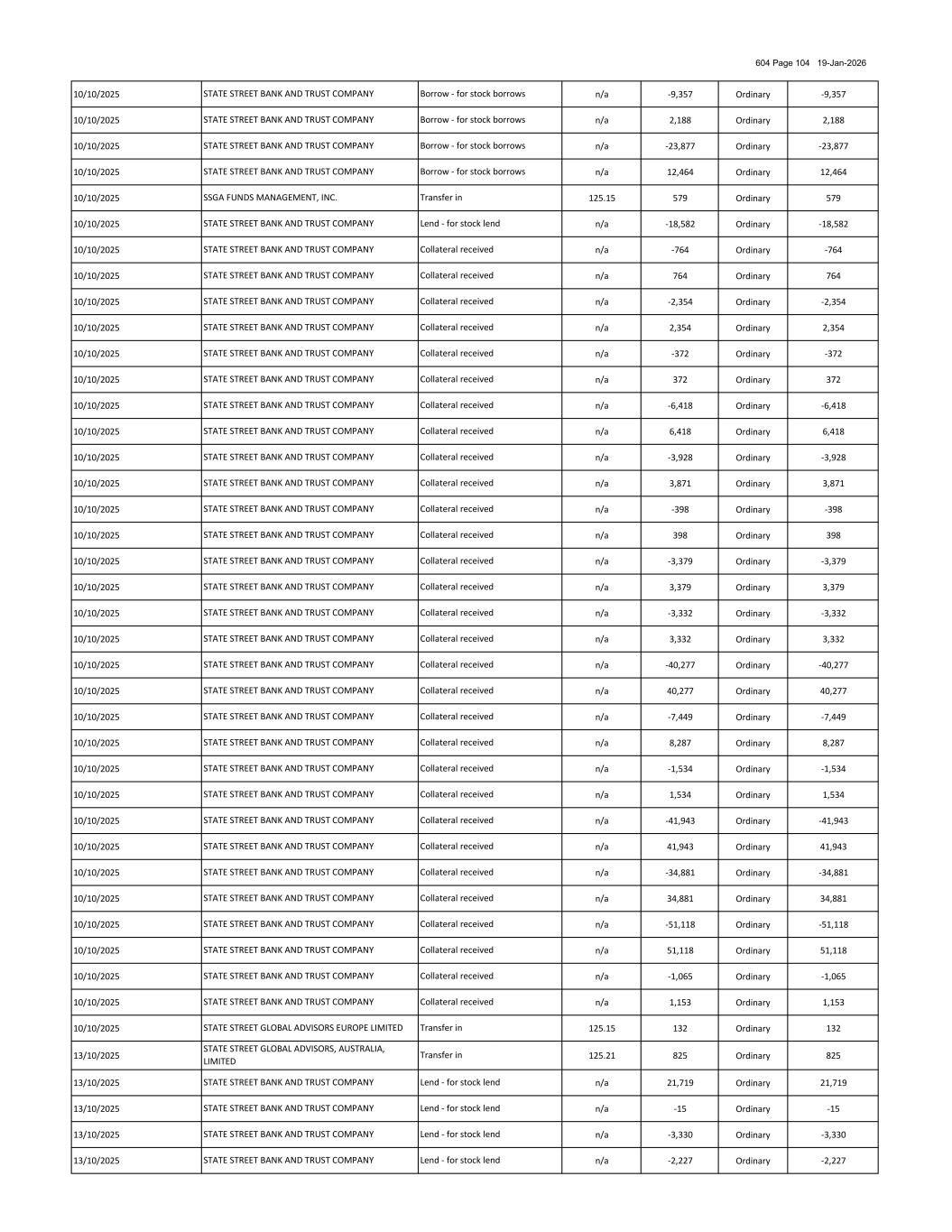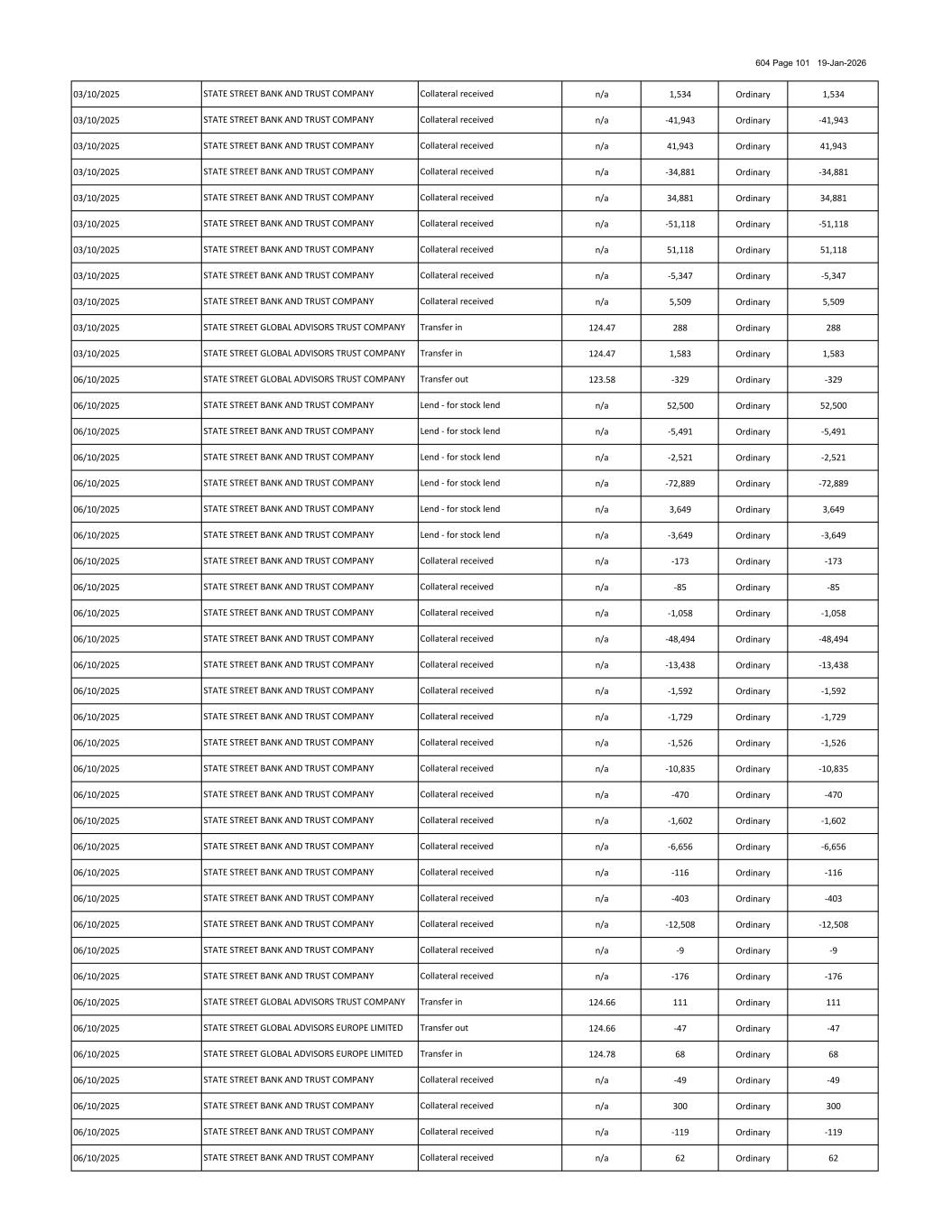 604 Page 100 19-Jan-2026 03/10/2025 n/a 173 Ordinary 173 03/10/2025 n/a 85 Ordinary 85 03/10/2025 n/a 1,058 Ordinary 1,058 03/10/2025 n/a 48,494 Ordinary 48,494 03/10/2025 n/a 13,438 Ordinary 13,438 03/10/2025 n/a 1,592 Ordinary 1,592 03/10/2025 n/a 1,729 Ordinary 1,729 03/10/2025 n/a 1,526 Ordinary 1,526 03/10/2025 n/a 10,835 Ordinary 10,835 03/10/2025 n/a 470 Ordinary 470 03/10/2025 n/a 1,602 Ordinary 1,602 03/10/2025 n/a 6,656 Ordinary 6,656 03/10/2025 n/a 116 Ordinary 116 03/10/2025 n/a 403 Ordinary 403 03/10/2025 n/a 12,508 Ordinary 12,508 03/10/2025 n/a 9 Ordinary 9 03/10/2025 n/a 176 Ordinary 176 03/10/2025 n/a -9,357 Ordinary -9,357 03/10/2025 n/a 9,357 Ordinary 9,357 03/10/2025 n/a -23,877 Ordinary -23,877 03/10/2025 n/a 23,877 Ordinary 23,877 03/10/2025 n/a -764 Ordinary -764 03/10/2025 n/a 764 Ordinary 764 03/10/2025 n/a -2,354 Ordinary -2,354 03/10/2025 n/a 2,354 Ordinary 2,354 03/10/2025 n/a -378 Ordinary -378 03/10/2025 n/a 378 Ordinary 378 03/10/2025 n/a -6,418 Ordinary -6,418 03/10/2025 n/a 6,418 Ordinary 6,418 03/10/2025 n/a -3,839 Ordinary -3,839 03/10/2025 n/a 4,060 Ordinary 4,060 03/10/2025 n/a -98 Ordinary -98 03/10/2025 n/a 98 Ordinary 98 03/10/2025 n/a -3,379 Ordinary -3,379 03/10/2025 n/a 3,379 Ordinary 3,379 03/10/2025 n/a -3,332 Ordinary -3,332 03/10/2025 n/a 3,332 Ordinary 3,332 03/10/2025 n/a -40,277 Ordinary -40,277 03/10/2025 n/a 40,277 Ordinary 40,277 03/10/2025 n/a -7,980 Ordinary -7,980 03/10/2025 n/a 7,844 Ordinary 7,844 03/10/2025 n/a -1,534 Ordinary -1,534 STATE STREET BANK AND TRUST COMPANY STATE STREET BANK AND TRUST COMPANY Collateral received Collateral received Collateral received Collateral received Collateral received STATE STREET BANK AND TRUST COMPANY STATE STREET BANK AND TRUST COMPANY Collateral received Collateral received Collateral received Collateral received Collateral received STATE STREET BANK AND TRUST COMPANY STATE STREET BANK AND TRUST COMPANY STATE STREET BANK AND TRUST COMPANY STATE STREET BANK AND TRUST COMPANY Collateral received Collateral received STATE STREET BANK AND TRUST COMPANY STATE STREET BANK AND TRUST COMPANY STATE STREET BANK AND TRUST COMPANY STATE STREET BANK AND TRUST COMPANY Collateral received STATE STREET BANK AND TRUST COMPANY Collateral received Collateral received STATE STREET BANK AND TRUST COMPANY STATE STREET BANK AND TRUST COMPANY Collateral received Collateral received Collateral received Collateral received Collateral received STATE STREET BANK AND TRUST COMPANY Collateral received Collateral received STATE STREET BANK AND TRUST COMPANY Collateral received STATE STREET BANK AND TRUST COMPANY STATE STREET BANK AND TRUST COMPANY Collateral received STATE STREET BANK AND TRUST COMPANY STATE STREET BANK AND TRUST COMPANY Collateral received STATE STREET BANK AND TRUST COMPANY STATE STREET BANK AND TRUST COMPANY STATE STREET BANK AND TRUST COMPANY Borrow - for stock borrows Collateral received STATE STREET BANK AND TRUST COMPANY STATE STREET BANK AND TRUST COMPANY STATE STREET BANK AND TRUST COMPANY Collateral received STATE STREET BANK AND TRUST COMPANY STATE STREET BANK AND TRUST COMPANY Collateral received STATE STREET BANK AND TRUST COMPANY Collateral received Collateral received Collateral received Collateral received Borrow - for stock borrows STATE STREET BANK AND TRUST COMPANY Collateral received STATE STREET BANK AND TRUST COMPANY STATE STREET BANK AND TRUST COMPANY STATE STREET BANK AND TRUST COMPANY Collateral received Borrow - for stock borrows STATE STREET BANK AND TRUST COMPANY Collateral received STATE STREET BANK AND TRUST COMPANY Borrow - for stock borrows STATE STREET BANK AND TRUST COMPANY STATE STREET BANK AND TRUST COMPANY STATE STREET BANK AND TRUST COMPANY Collateral received STATE STREET BANK AND TRUST COMPANY STATE STREET BANK AND TRUST COMPANY STATE STREET BANK AND TRUST COMPANY Collateral received Collateral received