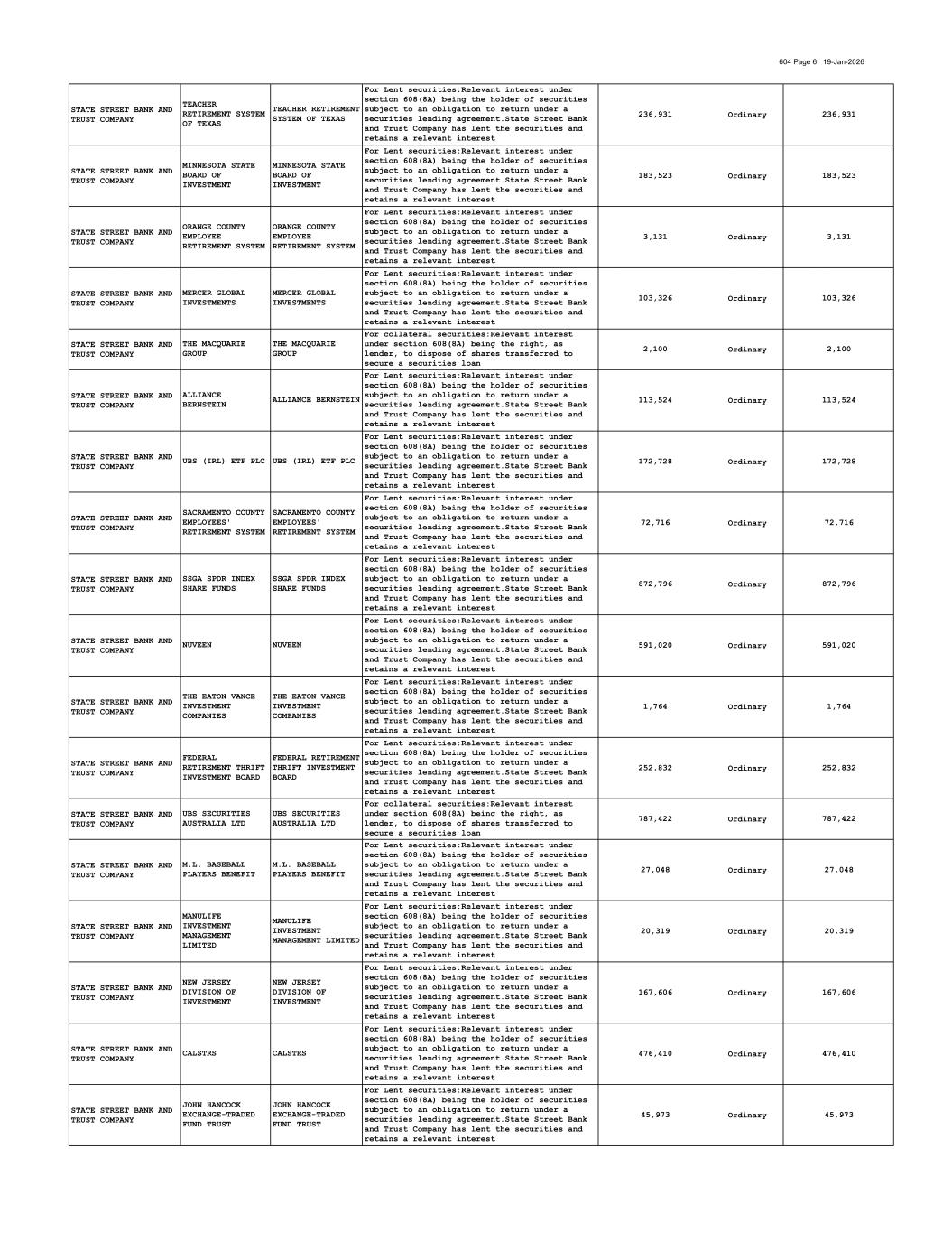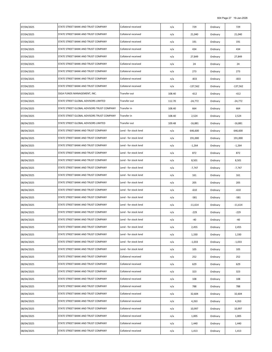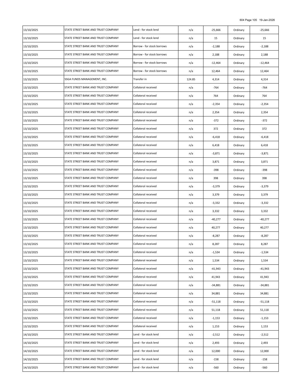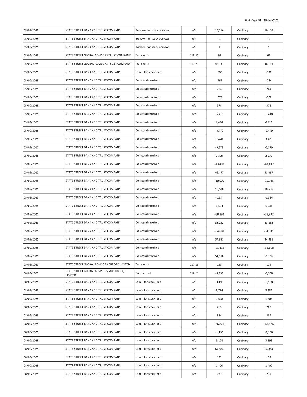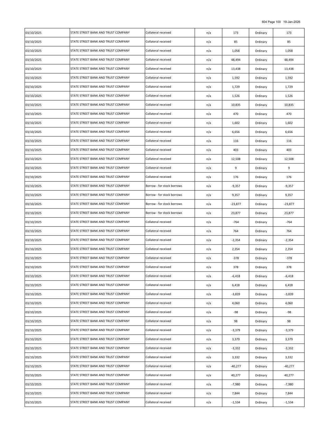 604 Page 100 19-Jan-2026 03/10/2025 n/a 173 Ordinary 173 03/10/2025 n/a 85 Ordinary 85 03/10/2025 n/a 1,058 Ordinary 1,058 03/10/2025 n/a 48,494 Ordinary 48,494 03/10/2025 n/a 13,438 Ordinary 13,438 03/10/2025 n/a 1,592 Ordinary 1,592 03/10/2025 n/a 1,729 Ordinary 1,729 03/10/2025 n/a 1,526 Ordinary 1,526 03/10/2025 n/a 10,835 Ordinary 10,835 03/10/2025 n/a 470 Ordinary 470 03/10/2025 n/a 1,602 Ordinary 1,602 03/10/2025 n/a 6,656 Ordinary 6,656 03/10/2025 n/a 116 Ordinary 116 03/10/2025 n/a 403 Ordinary 403 03/10/2025 n/a 12,508 Ordinary 12,508 03/10/2025 n/a 9 Ordinary 9 03/10/2025 n/a 176 Ordinary 176 03/10/2025 n/a -9,357 Ordinary -9,357 03/10/2025 n/a 9,357 Ordinary 9,357 03/10/2025 n/a -23,877 Ordinary -23,877 03/10/2025 n/a 23,877 Ordinary 23,877 03/10/2025 n/a -764 Ordinary -764 03/10/2025 n/a 764 Ordinary 764 03/10/2025 n/a -2,354 Ordinary -2,354 03/10/2025 n/a 2,354 Ordinary 2,354 03/10/2025 n/a -378 Ordinary -378 03/10/2025 n/a 378 Ordinary 378 03/10/2025 n/a -6,418 Ordinary -6,418 03/10/2025 n/a 6,418 Ordinary 6,418 03/10/2025 n/a -3,839 Ordinary -3,839 03/10/2025 n/a 4,060 Ordinary 4,060 03/10/2025 n/a -98 Ordinary -98 03/10/2025 n/a 98 Ordinary 98 03/10/2025 n/a -3,379 Ordinary -3,379 03/10/2025 n/a 3,379 Ordinary 3,379 03/10/2025 n/a -3,332 Ordinary -3,332 03/10/2025 n/a 3,332 Ordinary 3,332 03/10/2025 n/a -40,277 Ordinary -40,277 03/10/2025 n/a 40,277 Ordinary 40,277 03/10/2025 n/a -7,980 Ordinary -7,980 03/10/2025 n/a 7,844 Ordinary 7,844 03/10/2025 n/a -1,534 Ordinary -1,534 STATE STREET BANK AND TRUST COMPANY STATE STREET BANK AND TRUST COMPANY Collateral received Collateral received Collateral received Collateral received Collateral received STATE STREET BANK AND TRUST COMPANY STATE STREET BANK AND TRUST COMPANY Collateral received Collateral received Collateral received Collateral received Collateral received STATE STREET BANK AND TRUST COMPANY STATE STREET BANK AND TRUST COMPANY STATE STREET BANK AND TRUST COMPANY STATE STREET BANK AND TRUST COMPANY Collateral received Collateral received STATE STREET BANK AND TRUST COMPANY STATE STREET BANK AND TRUST COMPANY STATE STREET BANK AND TRUST COMPANY STATE STREET BANK AND TRUST COMPANY Collateral received STATE STREET BANK AND TRUST COMPANY Collateral received Collateral received STATE STREET BANK AND TRUST COMPANY STATE STREET BANK AND TRUST COMPANY Collateral received Collateral received Collateral received Collateral received Collateral received STATE STREET BANK AND TRUST COMPANY Collateral received Collateral received STATE STREET BANK AND TRUST COMPANY Collateral received STATE STREET BANK AND TRUST COMPANY STATE STREET BANK AND TRUST COMPANY Collateral received STATE STREET BANK AND TRUST COMPANY STATE STREET BANK AND TRUST COMPANY Collateral received STATE STREET BANK AND TRUST COMPANY STATE STREET BANK AND TRUST COMPANY STATE STREET BANK AND TRUST COMPANY Borrow - for stock borrows Collateral received STATE STREET BANK AND TRUST COMPANY STATE STREET BANK AND TRUST COMPANY STATE STREET BANK AND TRUST COMPANY Collateral received STATE STREET BANK AND TRUST COMPANY STATE STREET BANK AND TRUST COMPANY Collateral received STATE STREET BANK AND TRUST COMPANY Collateral received Collateral received Collateral received Collateral received Borrow - for stock borrows STATE STREET BANK AND TRUST COMPANY Collateral received STATE STREET BANK AND TRUST COMPANY STATE STREET BANK AND TRUST COMPANY STATE STREET BANK AND TRUST COMPANY Collateral received Borrow - for stock borrows STATE STREET BANK AND TRUST COMPANY Collateral received STATE STREET BANK AND TRUST COMPANY Borrow - for stock borrows STATE STREET BANK AND TRUST COMPANY STATE STREET BANK AND TRUST COMPANY STATE STREET BANK AND TRUST COMPANY Collateral received STATE STREET BANK AND TRUST COMPANY STATE STREET BANK AND TRUST COMPANY STATE STREET BANK AND TRUST COMPANY Collateral received Collateral received