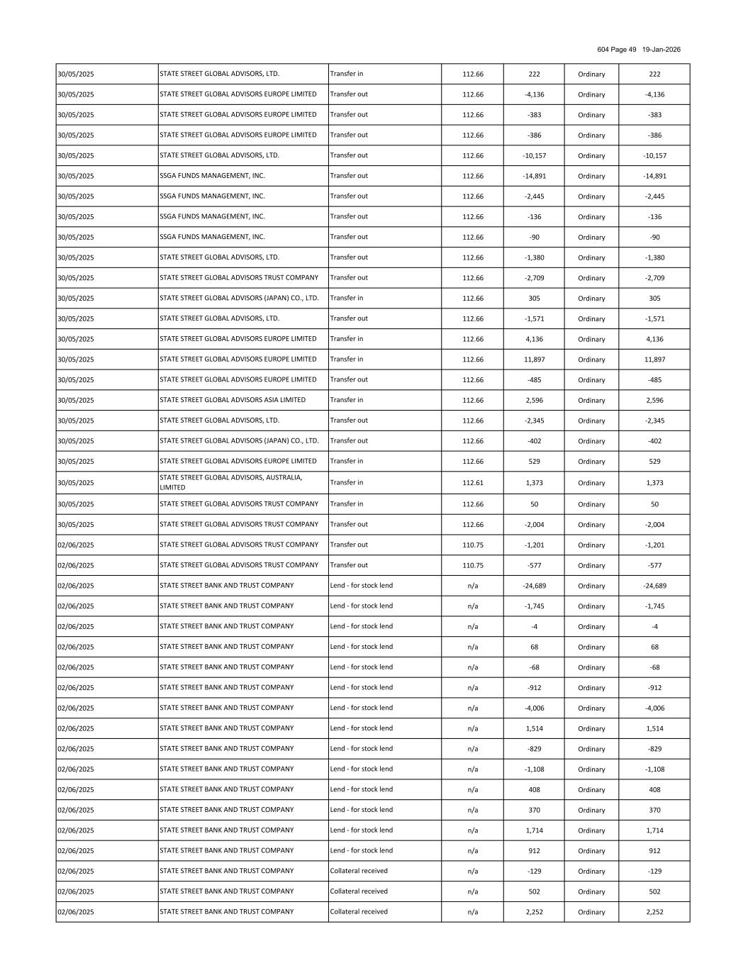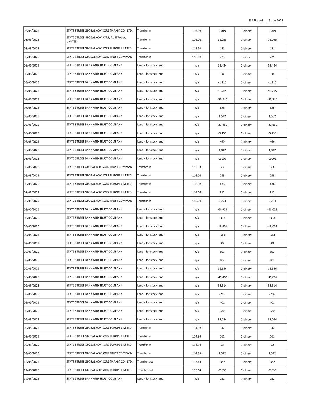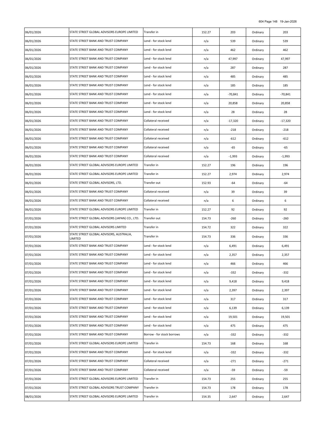 604 Page 148 19-Jan-2026 06/01/2026 152.27 203 Ordinary 203 06/01/2026 n/a 539 Ordinary 539 06/01/2026 n/a 462 Ordinary 462 06/01/2026 n/a 47,997 Ordinary 47,997 06/01/2026 n/a 287 Ordinary 287 06/01/2026 n/a 485 Ordinary 485 06/01/2026 n/a 185 Ordinary 185 06/01/2026 n/a -70,841 Ordinary -70,841 06/01/2026 n/a 20,858 Ordinary 20,858 06/01/2026 n/a 28 Ordinary 28 06/01/2026 n/a -17,320 Ordinary -17,320 06/01/2026 n/a -218 Ordinary -218 06/01/2026 n/a -612 Ordinary -612 06/01/2026 n/a -65 Ordinary -65 06/01/2026 n/a -1,993 Ordinary -1,993 06/01/2026 152.27 196 Ordinary 196 06/01/2026 152.27 2,974 Ordinary 2,974 06/01/2026 152.93 -64 Ordinary -64 06/01/2026 n/a 39 Ordinary 39 06/01/2026 n/a 6 Ordinary 6 06/01/2026 152.27 92 Ordinary 92 07/01/2026 154.73 -260 Ordinary -260 07/01/2026 154.72 322 Ordinary 322 07/01/2026 154.73 336 Ordinary 336 07/01/2026 n/a 6,491 Ordinary 6,491 07/01/2026 n/a 2,357 Ordinary 2,357 07/01/2026 n/a 466 Ordinary 466 07/01/2026 n/a -332 Ordinary -332 07/01/2026 n/a 9,418 Ordinary 9,418 07/01/2026 n/a 2,397 Ordinary 2,397 07/01/2026 n/a 317 Ordinary 317 07/01/2026 n/a 6,139 Ordinary 6,139 07/01/2026 n/a 19,501 Ordinary 19,501 07/01/2026 n/a 475 Ordinary 475 07/01/2026 n/a -332 Ordinary -332 07/01/2026 154.73 168 Ordinary 168 07/01/2026 n/a -332 Ordinary -332 07/01/2026 n/a -271 Ordinary -271 07/01/2026 n/a -59 Ordinary -59 07/01/2026 154.73 255 Ordinary 255 07/01/2026 154.73 178 Ordinary 178 08/01/2026 154.35 2,647 Ordinary 2,647 STATE STREET GLOBAL ADVISORS (JAPAN) CO., LTD. Transfer in STATE STREET BANK AND TRUST COMPANY Collateral received Transfer in Lend - for stock lend Transfer in Borrow - for stock borrows STATE STREET BANK AND TRUST COMPANY STATE STREET GLOBAL ADVISORS EUROPE LIMITED STATE STREET BANK AND TRUST COMPANY STATE STREET GLOBAL ADVISORS LIMITED Lend - for stock lend Collateral received STATE STREET BANK AND TRUST COMPANY STATE STREET BANK AND TRUST COMPANY STATE STREET GLOBAL ADVISORS, AUSTRALIA, LIMITED Lend - for stock lend STATE STREET BANK AND TRUST COMPANY Collateral received Lend - for stock lend Transfer in Collateral received Lend - for stock lend Lend - for stock lend STATE STREET BANK AND TRUST COMPANY STATE STREET BANK AND TRUST COMPANY STATE STREET BANK AND TRUST COMPANY STATE STREET BANK AND TRUST COMPANY STATE STREET BANK AND TRUST COMPANY Lend - for stock lend STATE STREET GLOBAL ADVISORS EUROPE LIMITED STATE STREET BANK AND TRUST COMPANY STATE STREET BANK AND TRUST COMPANY STATE STREET BANK AND TRUST COMPANY Lend - for stock lend Transfer in Lend - for stock lend Collateral received Lend - for stock lend STATE STREET BANK AND TRUST COMPANY Transfer in Lend - for stock lend Collateral received Transfer in STATE STREET BANK AND TRUST COMPANY STATE STREET GLOBAL ADVISORS EUROPE LIMITED STATE STREET BANK AND TRUST COMPANY STATE STREET BANK AND TRUST COMPANY STATE STREET GLOBAL ADVISORS EUROPE LIMITED Lend - for stock lend STATE STREET BANK AND TRUST COMPANY STATE STREET BANK AND TRUST COMPANY Transfer out Lend - for stock lendSTATE STREET BANK AND TRUST COMPANY Lend - for stock lend STATE STREET GLOBAL ADVISORS EUROPE LIMITED Collateral received Lend - for stock lend Transfer in Lend - for stock lend Transfer in STATE STREET BANK AND TRUST COMPANY STATE STREET GLOBAL ADVISORS, LTD. STATE STREET BANK AND TRUST COMPANY STATE STREET BANK AND TRUST COMPANY Lend - for stock lend STATE STREET BANK AND TRUST COMPANY STATE STREET GLOBAL ADVISORS TRUST COMPANY Collateral receivedSTATE STREET BANK AND TRUST COMPANY STATE STREET BANK AND TRUST COMPANY Lend - for stock lend STATE STREET GLOBAL ADVISORS EUROPE LIMITED Transfer in Transfer out Lend - for stock lend Lend - for stock lend STATE STREET BANK AND TRUST COMPANY STATE STREET BANK AND TRUST COMPANY STATE STREET GLOBAL ADVISORS EUROPE LIMITED Collateral received STATE STREET BANK AND TRUST COMPANY