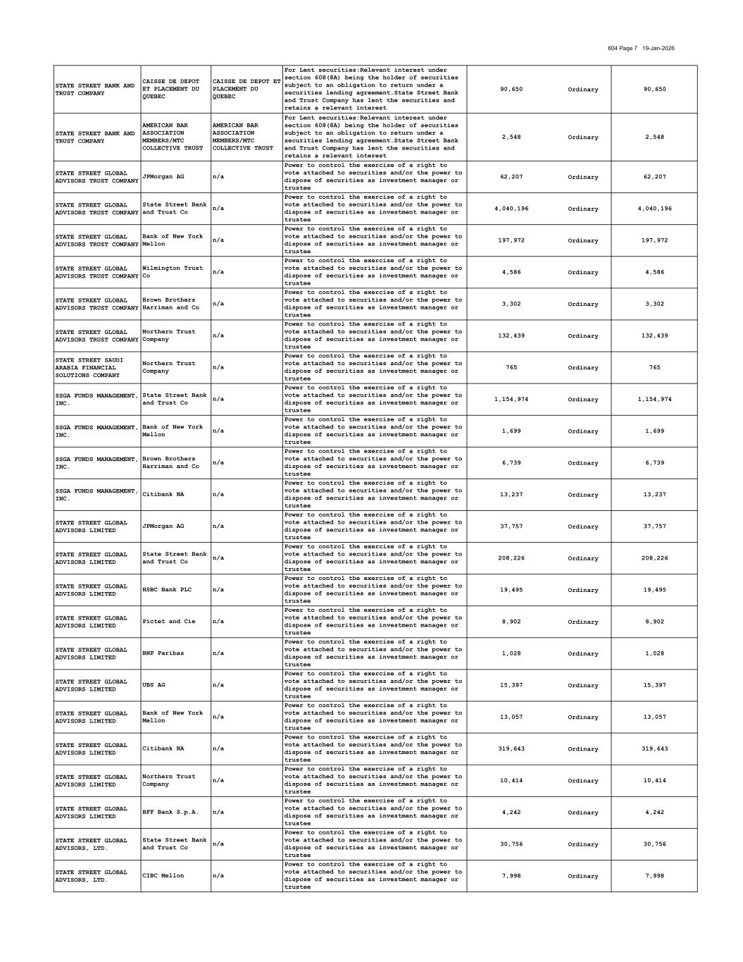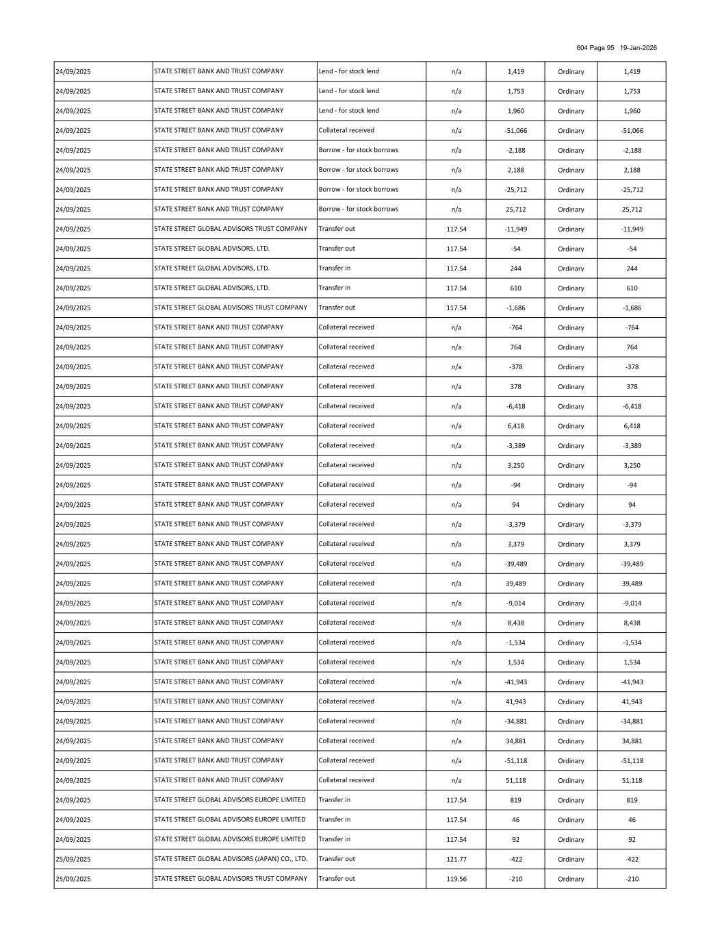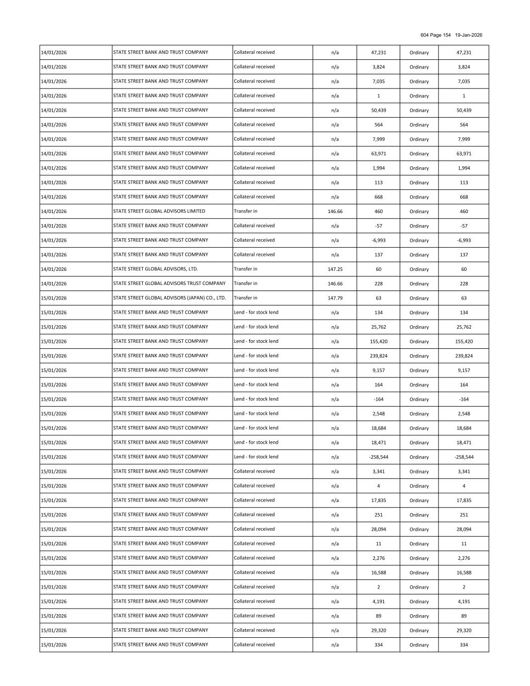 604 Page 148 19-Jan-2026 06/01/2026 152.27 203 Ordinary 203 06/01/2026 n/a 539 Ordinary 539 06/01/2026 n/a 462 Ordinary 462 06/01/2026 n/a 47,997 Ordinary 47,997 06/01/2026 n/a 287 Ordinary 287 06/01/2026 n/a 485 Ordinary 485 06/01/2026 n/a 185 Ordinary 185 06/01/2026 n/a -70,841 Ordinary -70,841 06/01/2026 n/a 20,858 Ordinary 20,858 06/01/2026 n/a 28 Ordinary 28 06/01/2026 n/a -17,320 Ordinary -17,320 06/01/2026 n/a -218 Ordinary -218 06/01/2026 n/a -612 Ordinary -612 06/01/2026 n/a -65 Ordinary -65 06/01/2026 n/a -1,993 Ordinary -1,993 06/01/2026 152.27 196 Ordinary 196 06/01/2026 152.27 2,974 Ordinary 2,974 06/01/2026 152.93 -64 Ordinary -64 06/01/2026 n/a 39 Ordinary 39 06/01/2026 n/a 6 Ordinary 6 06/01/2026 152.27 92 Ordinary 92 07/01/2026 154.73 -260 Ordinary -260 07/01/2026 154.72 322 Ordinary 322 07/01/2026 154.73 336 Ordinary 336 07/01/2026 n/a 6,491 Ordinary 6,491 07/01/2026 n/a 2,357 Ordinary 2,357 07/01/2026 n/a 466 Ordinary 466 07/01/2026 n/a -332 Ordinary -332 07/01/2026 n/a 9,418 Ordinary 9,418 07/01/2026 n/a 2,397 Ordinary 2,397 07/01/2026 n/a 317 Ordinary 317 07/01/2026 n/a 6,139 Ordinary 6,139 07/01/2026 n/a 19,501 Ordinary 19,501 07/01/2026 n/a 475 Ordinary 475 07/01/2026 n/a -332 Ordinary -332 07/01/2026 154.73 168 Ordinary 168 07/01/2026 n/a -332 Ordinary -332 07/01/2026 n/a -271 Ordinary -271 07/01/2026 n/a -59 Ordinary -59 07/01/2026 154.73 255 Ordinary 255 07/01/2026 154.73 178 Ordinary 178 08/01/2026 154.35 2,647 Ordinary 2,647 STATE STREET GLOBAL ADVISORS (JAPAN) CO., LTD. Transfer in STATE STREET BANK AND TRUST COMPANY Collateral received Transfer in Lend - for stock lend Transfer in Borrow - for stock borrows STATE STREET BANK AND TRUST COMPANY STATE STREET GLOBAL ADVISORS EUROPE LIMITED STATE STREET BANK AND TRUST COMPANY STATE STREET GLOBAL ADVISORS LIMITED Lend - for stock lend Collateral received STATE STREET BANK AND TRUST COMPANY STATE STREET BANK AND TRUST COMPANY STATE STREET GLOBAL ADVISORS, AUSTRALIA, LIMITED Lend - for stock lend STATE STREET BANK AND TRUST COMPANY Collateral received Lend - for stock lend Transfer in Collateral received Lend - for stock lend Lend - for stock lend STATE STREET BANK AND TRUST COMPANY STATE STREET BANK AND TRUST COMPANY STATE STREET BANK AND TRUST COMPANY STATE STREET BANK AND TRUST COMPANY STATE STREET BANK AND TRUST COMPANY Lend - for stock lend STATE STREET GLOBAL ADVISORS EUROPE LIMITED STATE STREET BANK AND TRUST COMPANY STATE STREET BANK AND TRUST COMPANY STATE STREET BANK AND TRUST COMPANY Lend - for stock lend Transfer in Lend - for stock lend Collateral received Lend - for stock lend STATE STREET BANK AND TRUST COMPANY Transfer in Lend - for stock lend Collateral received Transfer in STATE STREET BANK AND TRUST COMPANY STATE STREET GLOBAL ADVISORS EUROPE LIMITED STATE STREET BANK AND TRUST COMPANY STATE STREET BANK AND TRUST COMPANY STATE STREET GLOBAL ADVISORS EUROPE LIMITED Lend - for stock lend STATE STREET BANK AND TRUST COMPANY STATE STREET BANK AND TRUST COMPANY Transfer out Lend - for stock lendSTATE STREET BANK AND TRUST COMPANY Lend - for stock lend STATE STREET GLOBAL ADVISORS EUROPE LIMITED Collateral received Lend - for stock lend Transfer in Lend - for stock lend Transfer in STATE STREET BANK AND TRUST COMPANY STATE STREET GLOBAL ADVISORS, LTD. STATE STREET BANK AND TRUST COMPANY STATE STREET BANK AND TRUST COMPANY Lend - for stock lend STATE STREET BANK AND TRUST COMPANY STATE STREET GLOBAL ADVISORS TRUST COMPANY Collateral receivedSTATE STREET BANK AND TRUST COMPANY STATE STREET BANK AND TRUST COMPANY Lend - for stock lend STATE STREET GLOBAL ADVISORS EUROPE LIMITED Transfer in Transfer out Lend - for stock lend Lend - for stock lend STATE STREET BANK AND TRUST COMPANY STATE STREET BANK AND TRUST COMPANY STATE STREET GLOBAL ADVISORS EUROPE LIMITED Collateral received STATE STREET BANK AND TRUST COMPANY