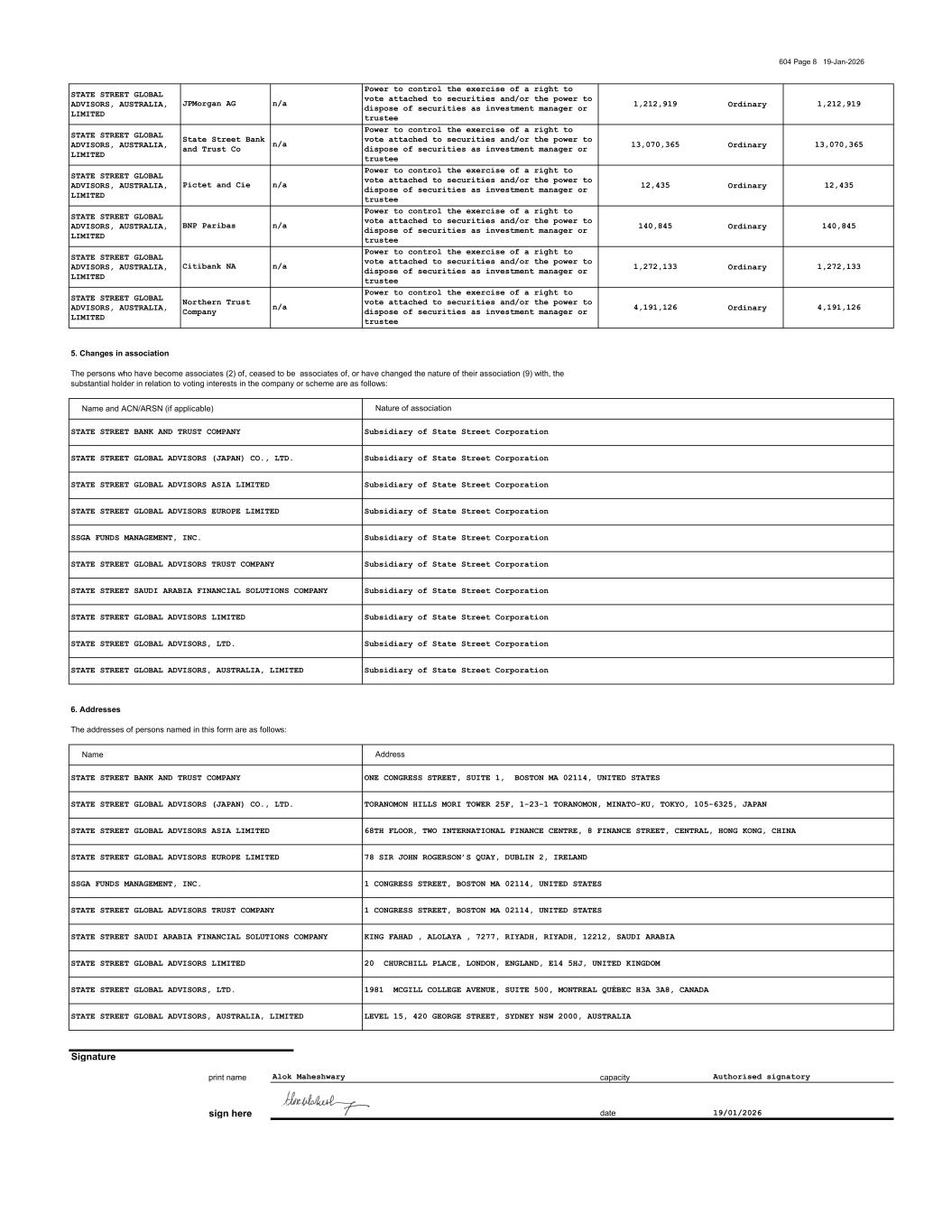 604 Page 8 19-Jan-2026 STATE STREET GLOBAL ADVISORS, AUSTRALIA, LIMITED 1,212,919 Ordinary 1,212,919 STATE STREET GLOBAL ADVISORS, AUSTRALIA, LIMITED 13,070,365 Ordinary 13,070,365 STATE STREET GLOBAL ADVISORS, AUSTRALIA, LIMITED 12,435 Ordinary 12,435 STATE STREET GLOBAL ADVISORS, AUSTRALIA, LIMITED 140,845 Ordinary 140,845 STATE STREET GLOBAL ADVISORS, AUSTRALIA, LIMITED 1,272,133 Ordinary 1,272,133 STATE STREET GLOBAL ADVISORS, AUSTRALIA, LIMITED 4,191,126 Ordinary 4,191,126 5. Changes in association The persons who have become associates (2) of, ceased to be associates of, or have changed the nature of their association (9) with, the substantial holder in relation to voting interests in the company or scheme are as follows: 6. Addresses The addresses of persons named in this form are as follows: Signature print name capacity sign here date 19/01/2026 STATE STREET GLOBAL ADVISORS ASIA LIMITED STATE STREET GLOBAL ADVISORS EUROPE LIMITED SSGA FUNDS MANAGEMENT, INC. STATE STREET GLOBAL ADVISORS TRUST COMPANY STATE STREET SAUDI ARABIA FINANCIAL SOLUTIONS COMPANY STATE STREET GLOBAL ADVISORS LIMITED STATE STREET GLOBAL ADVISORS, LTD. STATE STREET GLOBAL ADVISORS, AUSTRALIA, LIMITED 20 CHURCHILL PLACE, LONDON, ENGLAND, E14 5HJ, UNITED KINGDOM BNP Paribas STATE STREET GLOBAL ADVISORS TRUST COMPANY STATE STREET BANK AND TRUST COMPANY STATE STREET GLOBAL ADVISORS (JAPAN) CO., LTD. Power to control the exercise of a right to vote attached to securities and/or the power to dispose of securities as investment manager or trustee n/a KING FAHAD , ALOLAYA , 7277, RIYADH, RIYADH, 12212, SAUDI ARABIA Name and ACN/ARSN (if applicable) Pictet and Cie SSGA FUNDS MANAGEMENT, INC. n/a Subsidiary of State Street Corporation 1981 MCGILL COLLEGE AVENUE, SUITE 500, MONTREAL QUÉBEC H3A 3A8, CANADA Citibank NA STATE STREET SAUDI ARABIA FINANCIAL SOLUTIONS COMPANY Power to control the exercise of a right to vote attached to securities and/or the power to dispose of securities as investment manager or trustee Subsidiary of State Street Corporation n/a STATE STREET GLOBAL ADVISORS, LTD. STATE STREET GLOBAL ADVISORS (JAPAN) CO., LTD. LEVEL 15, 420 GEORGE STREET, SYDNEY NSW 2000, AUSTRALIA Northern Trust Company STATE STREET GLOBAL ADVISORS LIMITED ONE CONGRESS STREET, SUITE 1, BOSTON MA 02114, UNITED STATES STATE STREET GLOBAL ADVISORS, AUSTRALIA, LIMITED Subsidiary of State Street Corporation TORANOMON HILLS MORI TOWER 25F, 1-23-1 TORANOMON, MINATO-KU, TOKYO, 105-6325, JAPAN Subsidiary of State Street Corporation Address Subsidiary of State Street Corporation Name Subsidiary of State Street Corporation Subsidiary of State Street Corporation 1 CONGRESS STREET, BOSTON MA 02114, UNITED STATES JPMorgan AG Authorised signatory Subsidiary of State Street Corporation 68TH FLOOR, TWO INTERNATIONAL FINANCE CENTRE, 8 FINANCE STREET, CENTRAL, HONG KONG, CHINA STATE STREET BANK AND TRUST COMPANY Subsidiary of State Street Corporation Power to control the exercise of a right to vote attached to securities and/or the power to dispose of securities as investment manager or trustee Power to control the exercise of a right to vote attached to securities and/or the power to dispose of securities as investment manager or trustee n/a Power to control the exercise of a right to vote attached to securities and/or the power to dispose of securities as investment manager or trustee n/a Alok Maheshwary Power to control the exercise of a right to vote attached to securities and/or the power to dispose of securities as investment manager or trustee Nature of association 1 CONGRESS STREET, BOSTON MA 02114, UNITED STATES State Street Bank and Trust Co STATE STREET GLOBAL ADVISORS EUROPE LIMITED n/a 78 SIR JOHN ROGERSON’S QUAY, DUBLIN 2, IRELAND Subsidiary of State Street Corporation STATE STREET GLOBAL ADVISORS ASIA LIMITED