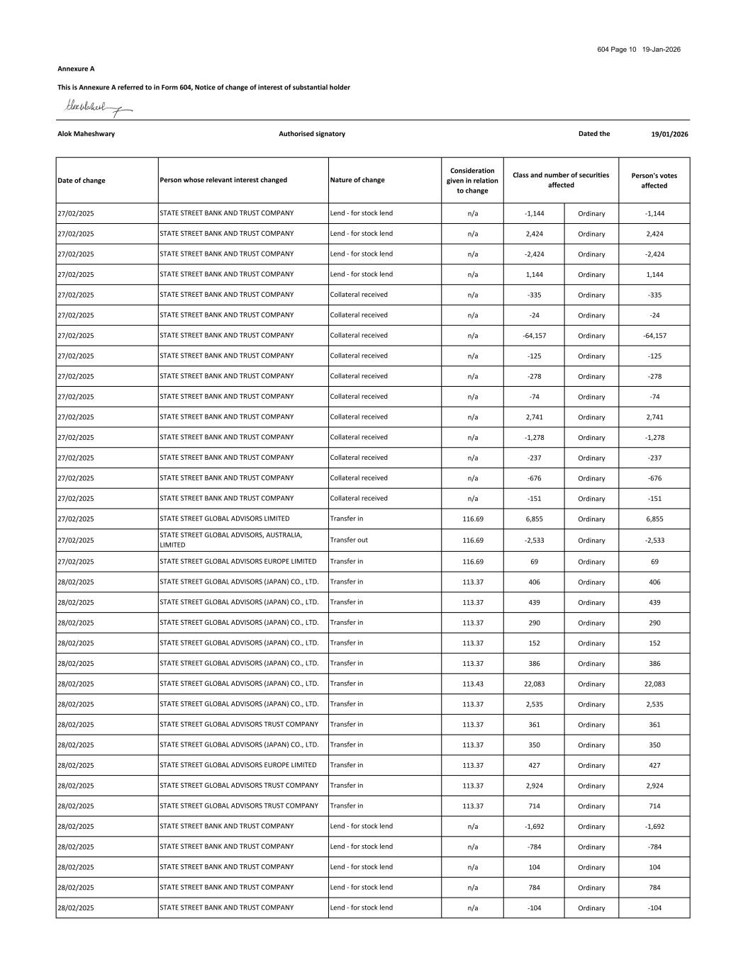 604 Page 10 19-Jan-2026 Annexure A This is Annexure A referred to in Form 604, Notice of change of interest of substantial holder 19/01/2026 Date of change Consideration given in relation to change Person's votes affected 27/02/2025 n/a -1,144 Ordinary -1,144 27/02/2025 n/a 2,424 Ordinary 2,424 27/02/2025 n/a -2,424 Ordinary -2,424 27/02/2025 n/a 1,144 Ordinary 1,144 27/02/2025 n/a -335 Ordinary -335 27/02/2025 n/a -24 Ordinary -24 27/02/2025 n/a -64,157 Ordinary -64,157 27/02/2025 n/a -125 Ordinary -125 27/02/2025 n/a -278 Ordinary -278 27/02/2025 n/a -74 Ordinary -74 27/02/2025 n/a 2,741 Ordinary 2,741 27/02/2025 n/a -1,278 Ordinary -1,278 27/02/2025 n/a -237 Ordinary -237 27/02/2025 n/a -676 Ordinary -676 27/02/2025 n/a -151 Ordinary -151 27/02/2025 116.69 6,855 Ordinary 6,855 27/02/2025 116.69 -2,533 Ordinary -2,533 27/02/2025 116.69 69 Ordinary 69 28/02/2025 113.37 406 Ordinary 406 28/02/2025 113.37 439 Ordinary 439 28/02/2025 113.37 290 Ordinary 290 28/02/2025 113.37 152 Ordinary 152 28/02/2025 113.37 386 Ordinary 386 28/02/2025 113.43 22,083 Ordinary 22,083 28/02/2025 113.37 2,535 Ordinary 2,535 28/02/2025 113.37 361 Ordinary 361 28/02/2025 113.37 350 Ordinary 350 28/02/2025 113.37 427 Ordinary 427 28/02/2025 113.37 2,924 Ordinary 2,924 28/02/2025 113.37 714 Ordinary 714 28/02/2025 n/a -1,692 Ordinary -1,692 28/02/2025 n/a -784 Ordinary -784 28/02/2025 n/a 104 Ordinary 104 28/02/2025 n/a 784 Ordinary 784 28/02/2025 n/a -104 Ordinary -104 Dated the Alok Maheshwary Lend - for stock lend Transfer in STATE STREET BANK AND TRUST COMPANY Collateral received STATE STREET BANK AND TRUST COMPANY STATE STREET GLOBAL ADVISORS (JAPAN) CO., LTD. Class and number of securities affected Lend - for stock lend STATE STREET GLOBAL ADVISORS EUROPE LIMITED STATE STREET GLOBAL ADVISORS TRUST COMPANY STATE STREET BANK AND TRUST COMPANY Lend - for stock lend STATE STREET GLOBAL ADVISORS TRUST COMPANY Collateral received STATE STREET GLOBAL ADVISORS (JAPAN) CO., LTD. Transfer in Authorised signatory STATE STREET BANK AND TRUST COMPANY STATE STREET BANK AND TRUST COMPANY Person whose relevant interest changed Transfer in Lend - for stock lend STATE STREET BANK AND TRUST COMPANY Collateral received STATE STREET GLOBAL ADVISORS (JAPAN) CO., LTD. Lend - for stock lend STATE STREET BANK AND TRUST COMPANY STATE STREET BANK AND TRUST COMPANY Collateral received Transfer in Nature of change STATE STREET BANK AND TRUST COMPANY STATE STREET BANK AND TRUST COMPANY STATE STREET GLOBAL ADVISORS (JAPAN) CO., LTD. Transfer in Lend - for stock lend Collateral received Lend - for stock lend STATE STREET BANK AND TRUST COMPANY Lend - for stock lend STATE STREET GLOBAL ADVISORS (JAPAN) CO., LTD. STATE STREET BANK AND TRUST COMPANY STATE STREET GLOBAL ADVISORS (JAPAN) CO., LTD. STATE STREET BANK AND TRUST COMPANY Transfer in STATE STREET GLOBAL ADVISORS TRUST COMPANY Collateral received Transfer in STATE STREET BANK AND TRUST COMPANY Lend - for stock lend Collateral received STATE STREET BANK AND TRUST COMPANY STATE STREET BANK AND TRUST COMPANY Collateral received Transfer in STATE STREET GLOBAL ADVISORS (JAPAN) CO., LTD. STATE STREET BANK AND TRUST COMPANY Transfer in Transfer in Collateral received Transfer in STATE STREET GLOBAL ADVISORS, AUSTRALIA, LIMITED STATE STREET BANK AND TRUST COMPANY STATE STREET GLOBAL ADVISORS EUROPE LIMITED Transfer in Transfer in Collateral received STATE STREET BANK AND TRUST COMPANY Transfer in Transfer out STATE STREET GLOBAL ADVISORS (JAPAN) CO., LTD. Collateral received STATE STREET BANK AND TRUST COMPANY STATE STREET GLOBAL ADVISORS LIMITED