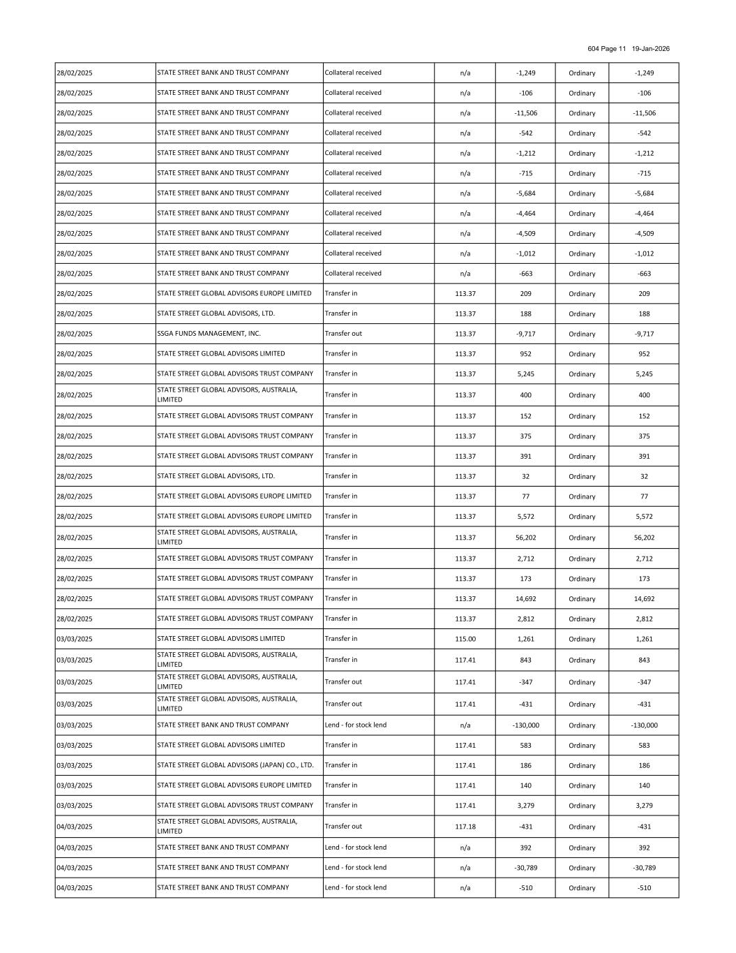 604 Page 11 19-Jan-2026 28/02/2025 n/a -1,249 Ordinary -1,249 28/02/2025 n/a -106 Ordinary -106 28/02/2025 n/a -11,506 Ordinary -11,506 28/02/2025 n/a -542 Ordinary -542 28/02/2025 n/a -1,212 Ordinary -1,212 28/02/2025 n/a -715 Ordinary -715 28/02/2025 n/a -5,684 Ordinary -5,684 28/02/2025 n/a -4,464 Ordinary -4,464 28/02/2025 n/a -4,509 Ordinary -4,509 28/02/2025 n/a -1,012 Ordinary -1,012 28/02/2025 n/a -663 Ordinary -663 28/02/2025 113.37 209 Ordinary 209 28/02/2025 113.37 188 Ordinary 188 28/02/2025 113.37 -9,717 Ordinary -9,717 28/02/2025 113.37 952 Ordinary 952 28/02/2025 113.37 5,245 Ordinary 5,245 28/02/2025 113.37 400 Ordinary 400 28/02/2025 113.37 152 Ordinary 152 28/02/2025 113.37 375 Ordinary 375 28/02/2025 113.37 391 Ordinary 391 28/02/2025 113.37 32 Ordinary 32 28/02/2025 113.37 77 Ordinary 77 28/02/2025 113.37 5,572 Ordinary 5,572 28/02/2025 113.37 56,202 Ordinary 56,202 28/02/2025 113.37 2,712 Ordinary 2,712 28/02/2025 113.37 173 Ordinary 173 28/02/2025 113.37 14,692 Ordinary 14,692 28/02/2025 113.37 2,812 Ordinary 2,812 03/03/2025 115.00 1,261 Ordinary 1,261 03/03/2025 117.41 843 Ordinary 843 03/03/2025 117.41 -347 Ordinary -347 03/03/2025 117.41 -431 Ordinary -431 03/03/2025 n/a -130,000 Ordinary -130,000 03/03/2025 117.41 583 Ordinary 583 03/03/2025 117.41 186 Ordinary 186 03/03/2025 117.41 140 Ordinary 140 03/03/2025 117.41 3,279 Ordinary 3,279 04/03/2025 117.18 -431 Ordinary -431 04/03/2025 n/a 392 Ordinary 392 04/03/2025 n/a -30,789 Ordinary -30,789 04/03/2025 n/a -510 Ordinary -510 STATE STREET BANK AND TRUST COMPANY Transfer in STATE STREET GLOBAL ADVISORS LIMITED Collateral received STATE STREET BANK AND TRUST COMPANY STATE STREET GLOBAL ADVISORS TRUST COMPANY Transfer out Collateral received STATE STREET BANK AND TRUST COMPANY Transfer in STATE STREET GLOBAL ADVISORS, AUSTRALIA, LIMITED Transfer in STATE STREET GLOBAL ADVISORS TRUST COMPANY Lend - for stock lend STATE STREET BANK AND TRUST COMPANY Transfer in STATE STREET GLOBAL ADVISORS TRUST COMPANY Collateral received STATE STREET GLOBAL ADVISORS, AUSTRALIA, LIMITED STATE STREET BANK AND TRUST COMPANY Lend - for stock lend Transfer in Lend - for stock lend Transfer in STATE STREET GLOBAL ADVISORS, AUSTRALIA, LIMITED Collateral received STATE STREET GLOBAL ADVISORS, LTD. STATE STREET BANK AND TRUST COMPANY Transfer in Transfer in STATE STREET BANK AND TRUST COMPANY Transfer in Transfer out STATE STREET GLOBAL ADVISORS, AUSTRALIA, LIMITED Collateral received STATE STREET GLOBAL ADVISORS TRUST COMPANY STATE STREET BANK AND TRUST COMPANY STATE STREET BANK AND TRUST COMPANY Transfer in Transfer in STATE STREET GLOBAL ADVISORS (JAPAN) CO., LTD. Transfer out STATE STREET GLOBAL ADVISORS, AUSTRALIA, LIMITED Collateral received STATE STREET GLOBAL ADVISORS, LTD. STATE STREET BANK AND TRUST COMPANY Transfer in Collateral received STATE STREET BANK AND TRUST COMPANY Transfer in STATE STREET GLOBAL ADVISORS EUROPE LIMITED STATE STREET BANK AND TRUST COMPANY STATE STREET GLOBAL ADVISORS EUROPE LIMITED STATE STREET GLOBAL ADVISORS EUROPE LIMITED Transfer in Transfer in Transfer in Collateral received STATE STREET GLOBAL ADVISORS LIMITED STATE STREET GLOBAL ADVISORS LIMITED STATE STREET GLOBAL ADVISORS TRUST COMPANY STATE STREET BANK AND TRUST COMPANY Lend - for stock lend Transfer in Transfer in STATE STREET GLOBAL ADVISORS TRUST COMPANY Collateral received STATE STREET GLOBAL ADVISORS, AUSTRALIA, LIMITED STATE STREET GLOBAL ADVISORS TRUST COMPANY STATE STREET BANK AND TRUST COMPANY Transfer in Transfer in STATE STREET GLOBAL ADVISORS EUROPE LIMITED Collateral received STATE STREET GLOBAL ADVISORS TRUST COMPANY STATE STREET BANK AND TRUST COMPANY SSGA FUNDS MANAGEMENT, INC. Transfer out Transfer in STATE STREET GLOBAL ADVISORS TRUST COMPANY Transfer in Collateral received