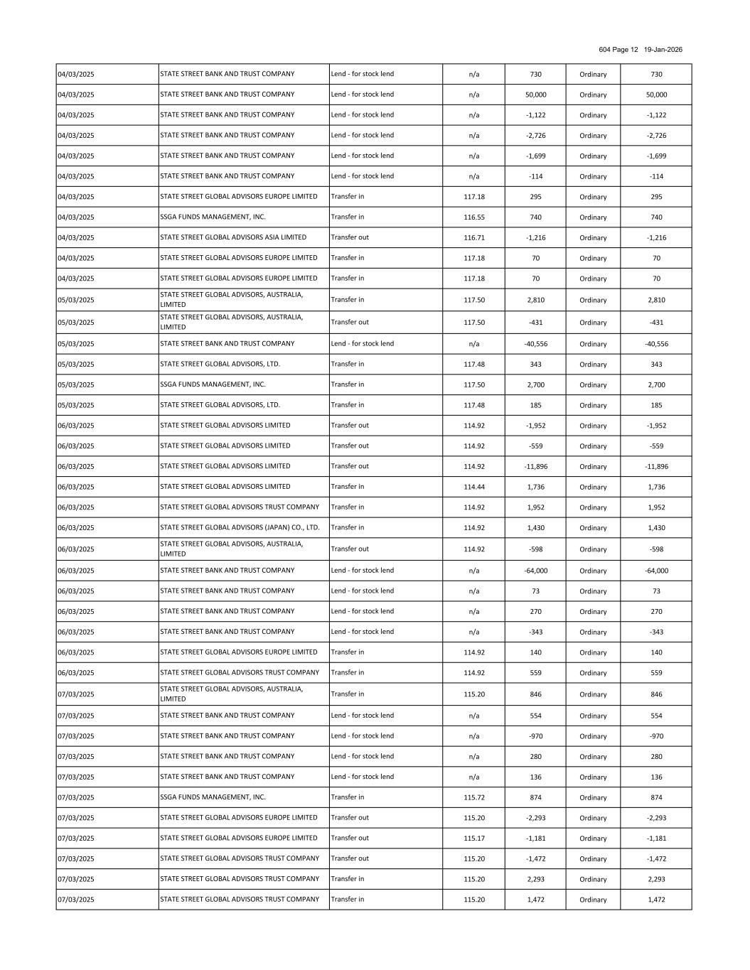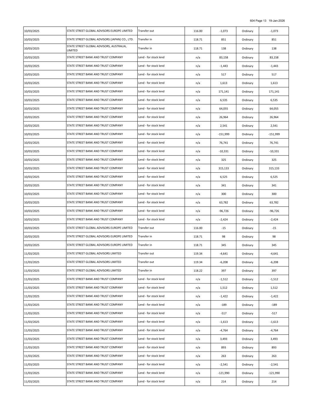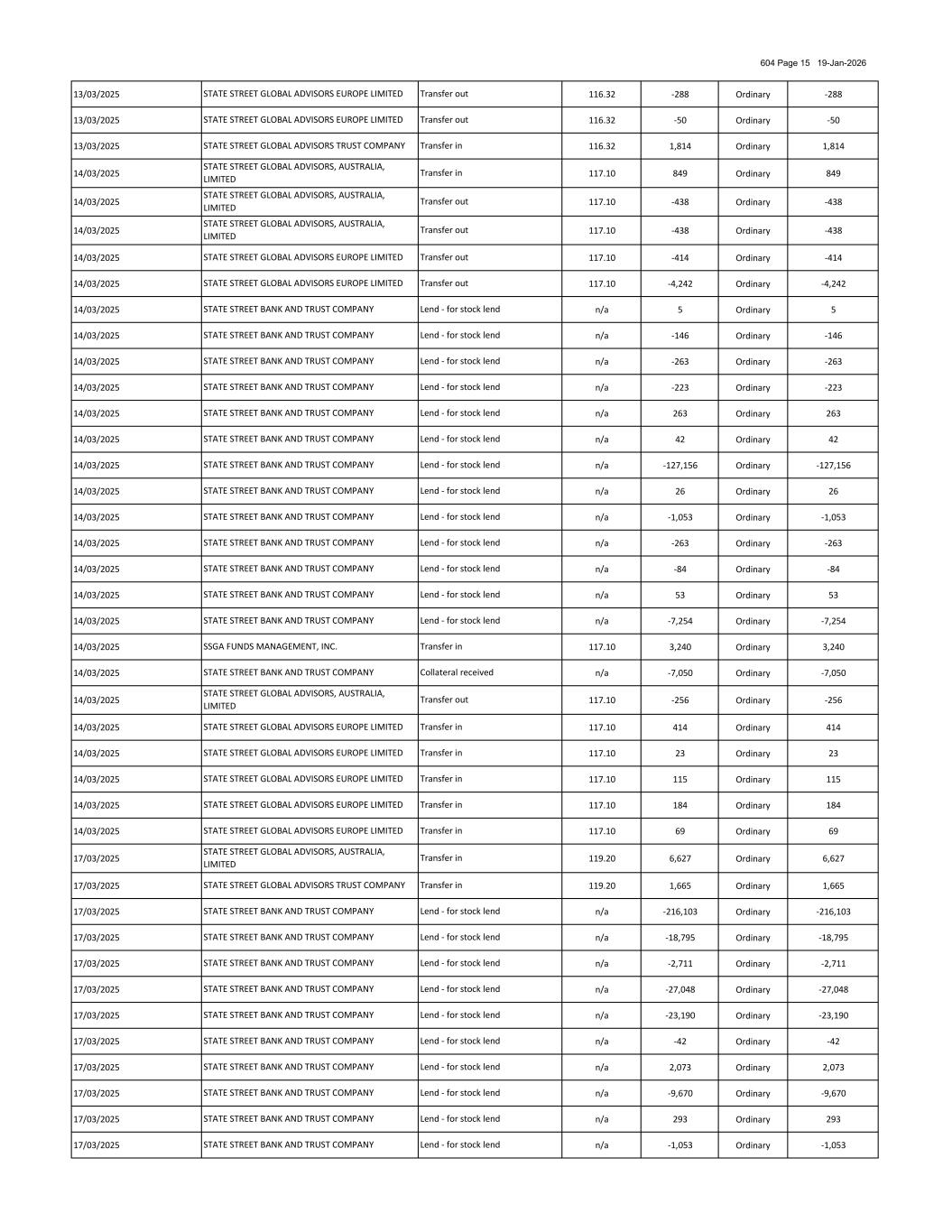 604 Page 12 19-Jan-2026 04/03/2025 n/a 730 Ordinary 730 04/03/2025 n/a 50,000 Ordinary 50,000 04/03/2025 n/a -1,122 Ordinary -1,122 04/03/2025 n/a -2,726 Ordinary -2,726 04/03/2025 n/a -1,699 Ordinary -1,699 04/03/2025 n/a -114 Ordinary -114 04/03/2025 117.18 295 Ordinary 295 04/03/2025 116.55 740 Ordinary 740 04/03/2025 116.71 -1,216 Ordinary -1,216 04/03/2025 117.18 70 Ordinary 70 04/03/2025 117.18 70 Ordinary 70 05/03/2025 117.50 2,810 Ordinary 2,810 05/03/2025 117.50 -431 Ordinary -431 05/03/2025 n/a -40,556 Ordinary -40,556 05/03/2025 117.48 343 Ordinary 343 05/03/2025 117.50 2,700 Ordinary 2,700 05/03/2025 117.48 185 Ordinary 185 06/03/2025 114.92 -1,952 Ordinary -1,952 06/03/2025 114.92 -559 Ordinary -559 06/03/2025 114.92 -11,896 Ordinary -11,896 06/03/2025 114.44 1,736 Ordinary 1,736 06/03/2025 114.92 1,952 Ordinary 1,952 06/03/2025 114.92 1,430 Ordinary 1,430 06/03/2025 114.92 -598 Ordinary -598 06/03/2025 n/a -64,000 Ordinary -64,000 06/03/2025 n/a 73 Ordinary 73 06/03/2025 n/a 270 Ordinary 270 06/03/2025 n/a -343 Ordinary -343 06/03/2025 114.92 140 Ordinary 140 06/03/2025 114.92 559 Ordinary 559 07/03/2025 115.20 846 Ordinary 846 07/03/2025 n/a 554 Ordinary 554 07/03/2025 n/a -970 Ordinary -970 07/03/2025 n/a 280 Ordinary 280 07/03/2025 n/a 136 Ordinary 136 07/03/2025 115.72 874 Ordinary 874 07/03/2025 115.20 -2,293 Ordinary -2,293 07/03/2025 115.17 -1,181 Ordinary -1,181 07/03/2025 115.20 -1,472 Ordinary -1,472 07/03/2025 115.20 2,293 Ordinary 2,293 07/03/2025 115.20 1,472 Ordinary 1,472 STATE STREET GLOBAL ADVISORS EUROPE LIMITED Lend - for stock lend Transfer in Lend - for stock lend STATE STREET BANK AND TRUST COMPANY Transfer in STATE STREET GLOBAL ADVISORS EUROPE LIMITED STATE STREET GLOBAL ADVISORS TRUST COMPANY STATE STREET GLOBAL ADVISORS, AUSTRALIA, LIMITED Transfer in STATE STREET GLOBAL ADVISORS LIMITED STATE STREET GLOBAL ADVISORS ASIA LIMITED Lend - for stock lend Transfer in STATE STREET BANK AND TRUST COMPANY Transfer in STATE STREET GLOBAL ADVISORS, AUSTRALIA, LIMITED STATE STREET GLOBAL ADVISORS LIMITED Lend - for stock lend STATE STREET BANK AND TRUST COMPANY STATE STREET GLOBAL ADVISORS, AUSTRALIA, LIMITED Transfer out Lend - for stock lend SSGA FUNDS MANAGEMENT, INC. Lend - for stock lend Transfer in STATE STREET BANK AND TRUST COMPANY STATE STREET BANK AND TRUST COMPANY STATE STREET BANK AND TRUST COMPANY Lend - for stock lend Transfer out Transfer out STATE STREET GLOBAL ADVISORS (JAPAN) CO., LTD. Lend - for stock lend STATE STREET BANK AND TRUST COMPANY STATE STREET GLOBAL ADVISORS, AUSTRALIA, LIMITED STATE STREET BANK AND TRUST COMPANY Transfer in Lend - for stock lend Lend - for stock lend Transfer in STATE STREET BANK AND TRUST COMPANY STATE STREET BANK AND TRUST COMPANY Lend - for stock lend Lend - for stock lend STATE STREET GLOBAL ADVISORS EUROPE LIMITED SSGA FUNDS MANAGEMENT, INC. STATE STREET BANK AND TRUST COMPANY Transfer in Transfer in Transfer out STATE STREET GLOBAL ADVISORS TRUST COMPANY STATE STREET BANK AND TRUST COMPANY Transfer in Transfer out Lend - for stock lend STATE STREET BANK AND TRUST COMPANY Lend - for stock lend STATE STREET GLOBAL ADVISORS EUROPE LIMITED Transfer in STATE STREET GLOBAL ADVISORS, LTD. STATE STREET BANK AND TRUST COMPANY Transfer out Transfer in Transfer out Transfer out STATE STREET GLOBAL ADVISORS TRUST COMPANY STATE STREET GLOBAL ADVISORS LIMITED STATE STREET GLOBAL ADVISORS TRUST COMPANY SSGA FUNDS MANAGEMENT, INC. STATE STREET BANK AND TRUST COMPANY Transfer in Lend - for stock lend STATE STREET GLOBAL ADVISORS, LTD. Transfer in Transfer in Transfer in STATE STREET GLOBAL ADVISORS TRUST COMPANY Transfer out STATE STREET GLOBAL ADVISORS EUROPE LIMITED STATE STREET GLOBAL ADVISORS EUROPE LIMITED STATE STREET GLOBAL ADVISORS LIMITED