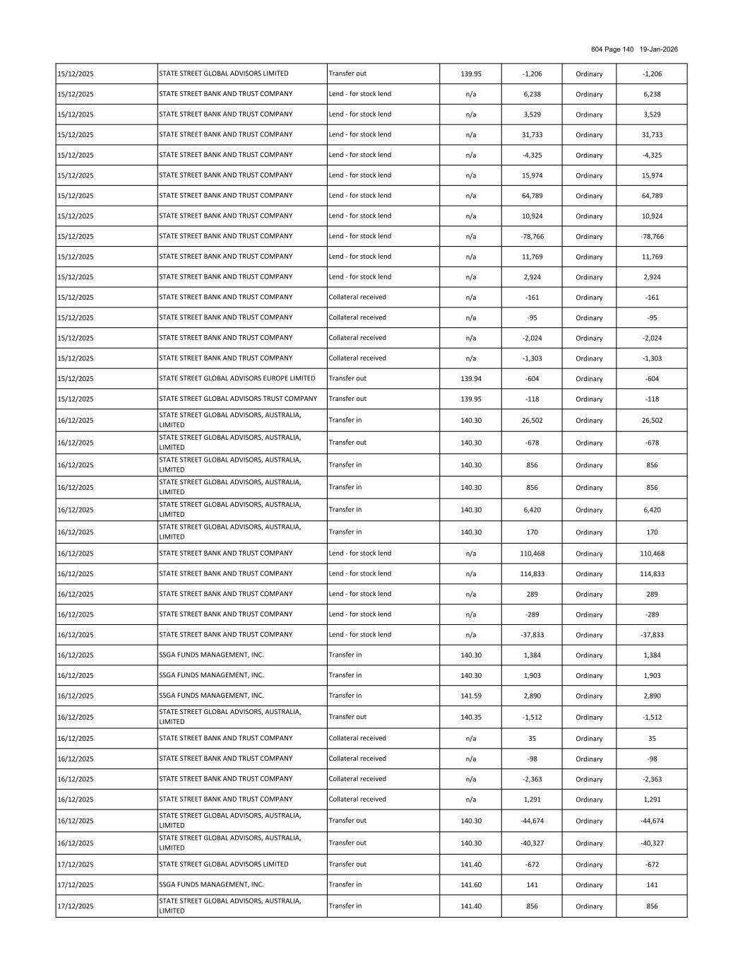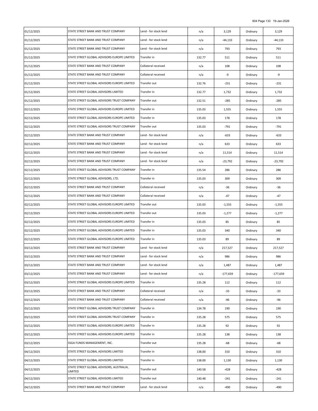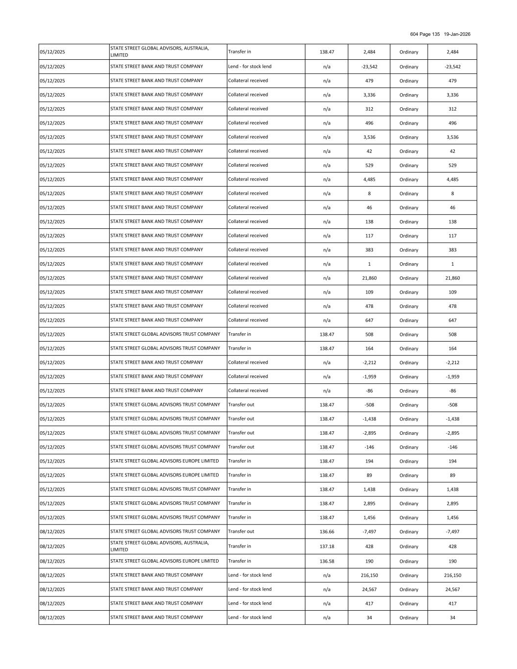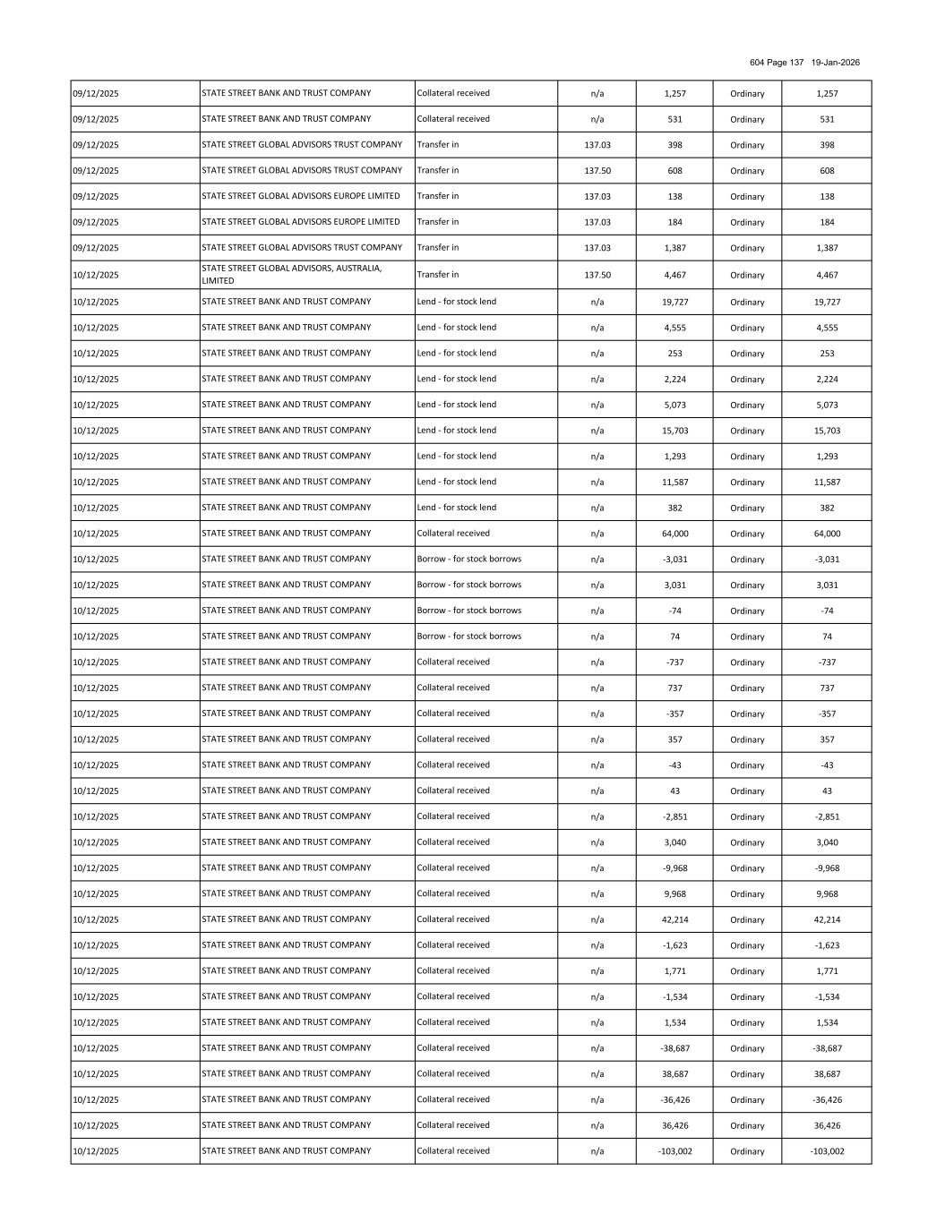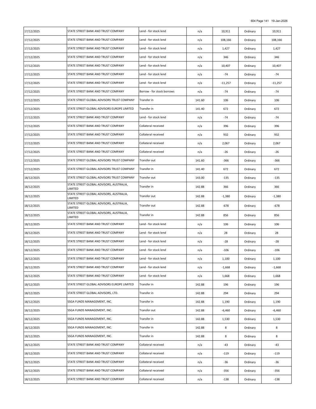 604 Page 134 19-Jan-2026 04/12/2025 n/a -3,766 Ordinary -3,766 04/12/2025 n/a -1,625 Ordinary -1,625 04/12/2025 n/a -382 Ordinary -382 04/12/2025 n/a -36,489 Ordinary -36,489 04/12/2025 n/a -4,972 Ordinary -4,972 04/12/2025 n/a -1,550 Ordinary -1,550 04/12/2025 n/a -726 Ordinary -726 04/12/2025 n/a -3,031 Ordinary -3,031 04/12/2025 n/a 3,031 Ordinary 3,031 04/12/2025 n/a -74 Ordinary -74 04/12/2025 n/a 74 Ordinary 74 04/12/2025 138.00 1,143 Ordinary 1,143 04/12/2025 n/a -737 Ordinary -737 04/12/2025 n/a 737 Ordinary 737 04/12/2025 n/a -357 Ordinary -357 04/12/2025 n/a 357 Ordinary 357 04/12/2025 n/a -5,135 Ordinary -5,135 04/12/2025 n/a 5,180 Ordinary 5,180 04/12/2025 n/a -9,968 Ordinary -9,968 04/12/2025 n/a 9,968 Ordinary 9,968 04/12/2025 n/a -42,214 Ordinary -42,214 04/12/2025 n/a 42,214 Ordinary 42,214 04/12/2025 n/a -5,673 Ordinary -5,673 04/12/2025 n/a 4,386 Ordinary 4,386 04/12/2025 n/a -1,534 Ordinary -1,534 04/12/2025 n/a 1,534 Ordinary 1,534 04/12/2025 n/a -38,687 Ordinary -38,687 04/12/2025 n/a 38,687 Ordinary 38,687 04/12/2025 n/a -36,426 Ordinary -36,426 04/12/2025 n/a 36,426 Ordinary 36,426 04/12/2025 n/a -34,881 Ordinary -34,881 04/12/2025 n/a 69,373 Ordinary 69,373 04/12/2025 n/a -51,118 Ordinary -51,118 04/12/2025 n/a 51,118 Ordinary 51,118 04/12/2025 n/a -110,175 Ordinary -110,175 04/12/2025 n/a 110,175 Ordinary 110,175 04/12/2025 n/a -21,942 Ordinary -21,942 04/12/2025 n/a 21,942 Ordinary 21,942 04/12/2025 140.58 92 Ordinary 92 04/12/2025 138.12 300 Ordinary 300 04/12/2025 140.48 -1,113 Ordinary -1,113 04/12/2025 138.00 -2,028 Ordinary -2,028STATE STREET GLOBAL ADVISORS TRUST COMPANY STATE STREET BANK AND TRUST COMPANY Borrow - for stock borrows STATE STREET BANK AND TRUST COMPANY STATE STREET BANK AND TRUST COMPANY STATE STREET BANK AND TRUST COMPANY Collateral received Collateral received STATE STREET BANK AND TRUST COMPANY Collateral received Collateral received Collateral received Collateral received Borrow - for stock borrows STATE STREET BANK AND TRUST COMPANY STATE STREET BANK AND TRUST COMPANY Collateral received STATE STREET BANK AND TRUST COMPANY Collateral received Collateral received STATE STREET BANK AND TRUST COMPANY Lend - for stock lend SSGA FUNDS MANAGEMENT, INC. STATE STREET BANK AND TRUST COMPANY Transfer in STATE STREET BANK AND TRUST COMPANY Lend - for stock lend STATE STREET BANK AND TRUST COMPANY Lend - for stock lend STATE STREET BANK AND TRUST COMPANY STATE STREET BANK AND TRUST COMPANY STATE STREET BANK AND TRUST COMPANY STATE STREET BANK AND TRUST COMPANY STATE STREET BANK AND TRUST COMPANY Collateral received Collateral received Collateral received Collateral received Collateral received Collateral received Lend - for stock lend STATE STREET BANK AND TRUST COMPANY Collateral received Collateral received Collateral received STATE STREET BANK AND TRUST COMPANY Lend - for stock lend STATE STREET BANK AND TRUST COMPANY STATE STREET BANK AND TRUST COMPANY STATE STREET BANK AND TRUST COMPANY Collateral received Collateral received STATE STREET BANK AND TRUST COMPANY STATE STREET BANK AND TRUST COMPANY Lend - for stock lend STATE STREET BANK AND TRUST COMPANY STATE STREET BANK AND TRUST COMPANY STATE STREET BANK AND TRUST COMPANY STATE STREET BANK AND TRUST COMPANY STATE STREET BANK AND TRUST COMPANY Transfer in STATE STREET BANK AND TRUST COMPANY STATE STREET BANK AND TRUST COMPANY Transfer out Collateral received Transfer in Collateral received Collateral received Lend - for stock lend STATE STREET GLOBAL ADVISORS EUROPE LIMITED STATE STREET BANK AND TRUST COMPANY Transfer out Collateral received Borrow - for stock borrows Collateral received STATE STREET GLOBAL ADVISORS TRUST COMPANY STATE STREET BANK AND TRUST COMPANY STATE STREET BANK AND TRUST COMPANY Collateral received STATE STREET GLOBAL ADVISORS EUROPE LIMITED STATE STREET BANK AND TRUST COMPANY Borrow - for stock borrows STATE STREET BANK AND TRUST COMPANY STATE STREET BANK AND TRUST COMPANY