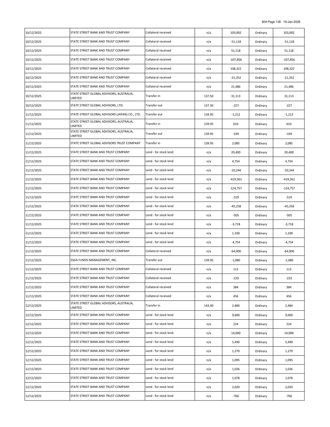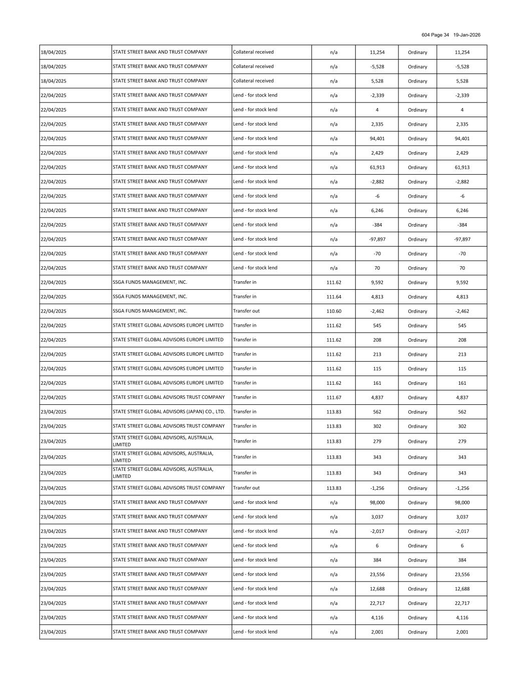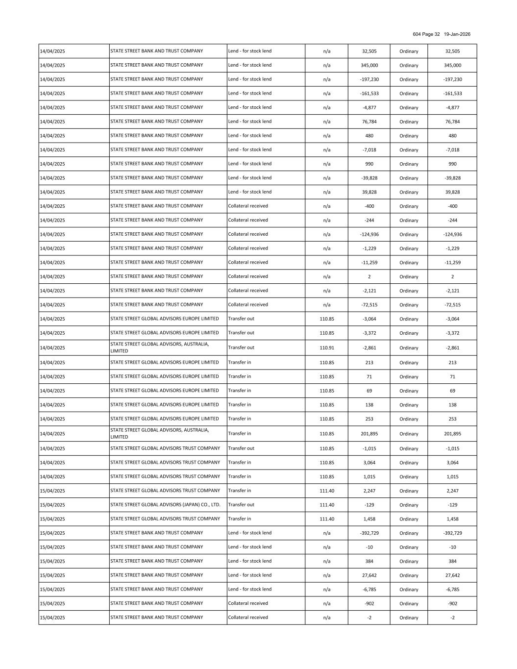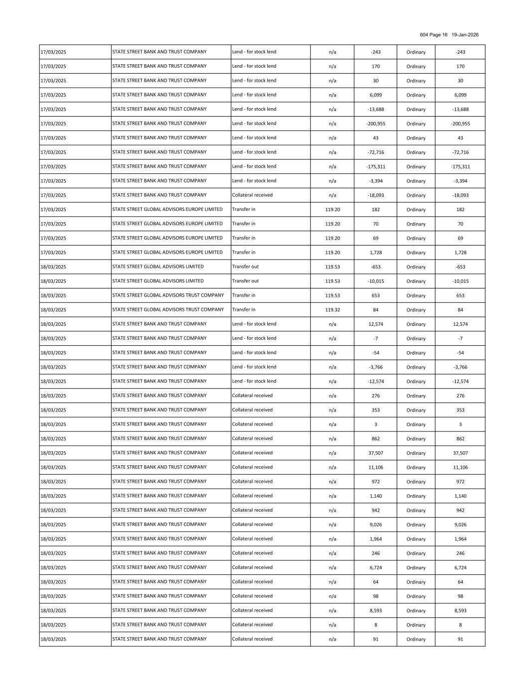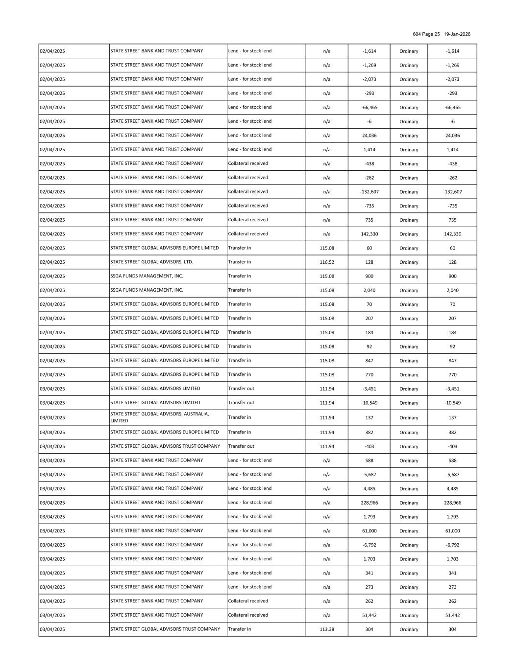 604 Page 134 19-Jan-2026 04/12/2025 n/a -3,766 Ordinary -3,766 04/12/2025 n/a -1,625 Ordinary -1,625 04/12/2025 n/a -382 Ordinary -382 04/12/2025 n/a -36,489 Ordinary -36,489 04/12/2025 n/a -4,972 Ordinary -4,972 04/12/2025 n/a -1,550 Ordinary -1,550 04/12/2025 n/a -726 Ordinary -726 04/12/2025 n/a -3,031 Ordinary -3,031 04/12/2025 n/a 3,031 Ordinary 3,031 04/12/2025 n/a -74 Ordinary -74 04/12/2025 n/a 74 Ordinary 74 04/12/2025 138.00 1,143 Ordinary 1,143 04/12/2025 n/a -737 Ordinary -737 04/12/2025 n/a 737 Ordinary 737 04/12/2025 n/a -357 Ordinary -357 04/12/2025 n/a 357 Ordinary 357 04/12/2025 n/a -5,135 Ordinary -5,135 04/12/2025 n/a 5,180 Ordinary 5,180 04/12/2025 n/a -9,968 Ordinary -9,968 04/12/2025 n/a 9,968 Ordinary 9,968 04/12/2025 n/a -42,214 Ordinary -42,214 04/12/2025 n/a 42,214 Ordinary 42,214 04/12/2025 n/a -5,673 Ordinary -5,673 04/12/2025 n/a 4,386 Ordinary 4,386 04/12/2025 n/a -1,534 Ordinary -1,534 04/12/2025 n/a 1,534 Ordinary 1,534 04/12/2025 n/a -38,687 Ordinary -38,687 04/12/2025 n/a 38,687 Ordinary 38,687 04/12/2025 n/a -36,426 Ordinary -36,426 04/12/2025 n/a 36,426 Ordinary 36,426 04/12/2025 n/a -34,881 Ordinary -34,881 04/12/2025 n/a 69,373 Ordinary 69,373 04/12/2025 n/a -51,118 Ordinary -51,118 04/12/2025 n/a 51,118 Ordinary 51,118 04/12/2025 n/a -110,175 Ordinary -110,175 04/12/2025 n/a 110,175 Ordinary 110,175 04/12/2025 n/a -21,942 Ordinary -21,942 04/12/2025 n/a 21,942 Ordinary 21,942 04/12/2025 140.58 92 Ordinary 92 04/12/2025 138.12 300 Ordinary 300 04/12/2025 140.48 -1,113 Ordinary -1,113 04/12/2025 138.00 -2,028 Ordinary -2,028STATE STREET GLOBAL ADVISORS TRUST COMPANY STATE STREET BANK AND TRUST COMPANY Borrow - for stock borrows STATE STREET BANK AND TRUST COMPANY STATE STREET BANK AND TRUST COMPANY STATE STREET BANK AND TRUST COMPANY Collateral received Collateral received STATE STREET BANK AND TRUST COMPANY Collateral received Collateral received Collateral received Collateral received Borrow - for stock borrows STATE STREET BANK AND TRUST COMPANY STATE STREET BANK AND TRUST COMPANY Collateral received STATE STREET BANK AND TRUST COMPANY Collateral received Collateral received STATE STREET BANK AND TRUST COMPANY Lend - for stock lend SSGA FUNDS MANAGEMENT, INC. STATE STREET BANK AND TRUST COMPANY Transfer in STATE STREET BANK AND TRUST COMPANY Lend - for stock lend STATE STREET BANK AND TRUST COMPANY Lend - for stock lend STATE STREET BANK AND TRUST COMPANY STATE STREET BANK AND TRUST COMPANY STATE STREET BANK AND TRUST COMPANY STATE STREET BANK AND TRUST COMPANY STATE STREET BANK AND TRUST COMPANY Collateral received Collateral received Collateral received Collateral received Collateral received Collateral received Lend - for stock lend STATE STREET BANK AND TRUST COMPANY Collateral received Collateral received Collateral received STATE STREET BANK AND TRUST COMPANY Lend - for stock lend STATE STREET BANK AND TRUST COMPANY STATE STREET BANK AND TRUST COMPANY STATE STREET BANK AND TRUST COMPANY Collateral received Collateral received STATE STREET BANK AND TRUST COMPANY STATE STREET BANK AND TRUST COMPANY Lend - for stock lend STATE STREET BANK AND TRUST COMPANY STATE STREET BANK AND TRUST COMPANY STATE STREET BANK AND TRUST COMPANY STATE STREET BANK AND TRUST COMPANY STATE STREET BANK AND TRUST COMPANY Transfer in STATE STREET BANK AND TRUST COMPANY STATE STREET BANK AND TRUST COMPANY Transfer out Collateral received Transfer in Collateral received Collateral received Lend - for stock lend STATE STREET GLOBAL ADVISORS EUROPE LIMITED STATE STREET BANK AND TRUST COMPANY Transfer out Collateral received Borrow - for stock borrows Collateral received STATE STREET GLOBAL ADVISORS TRUST COMPANY STATE STREET BANK AND TRUST COMPANY STATE STREET BANK AND TRUST COMPANY Collateral received STATE STREET GLOBAL ADVISORS EUROPE LIMITED STATE STREET BANK AND TRUST COMPANY Borrow - for stock borrows STATE STREET BANK AND TRUST COMPANY STATE STREET BANK AND TRUST COMPANY