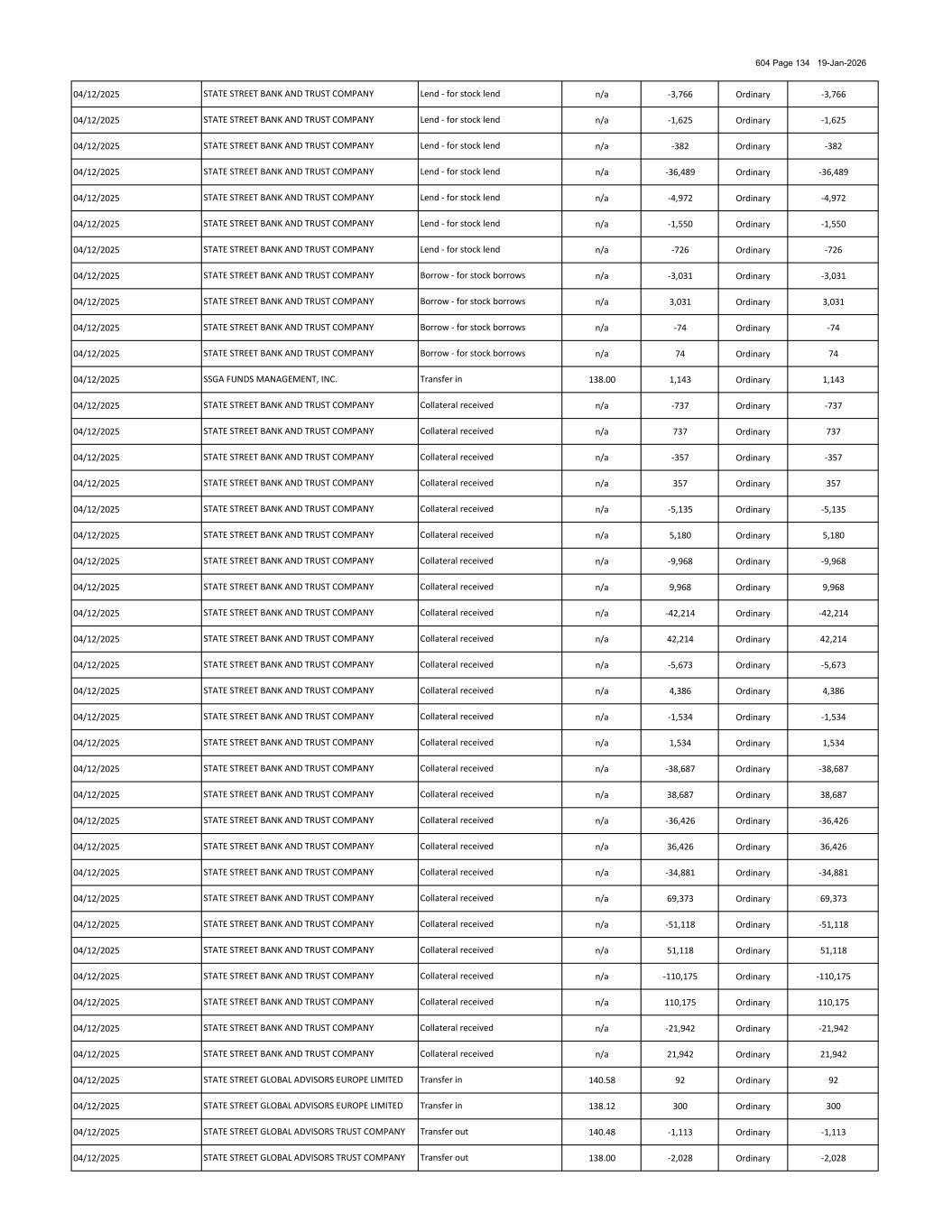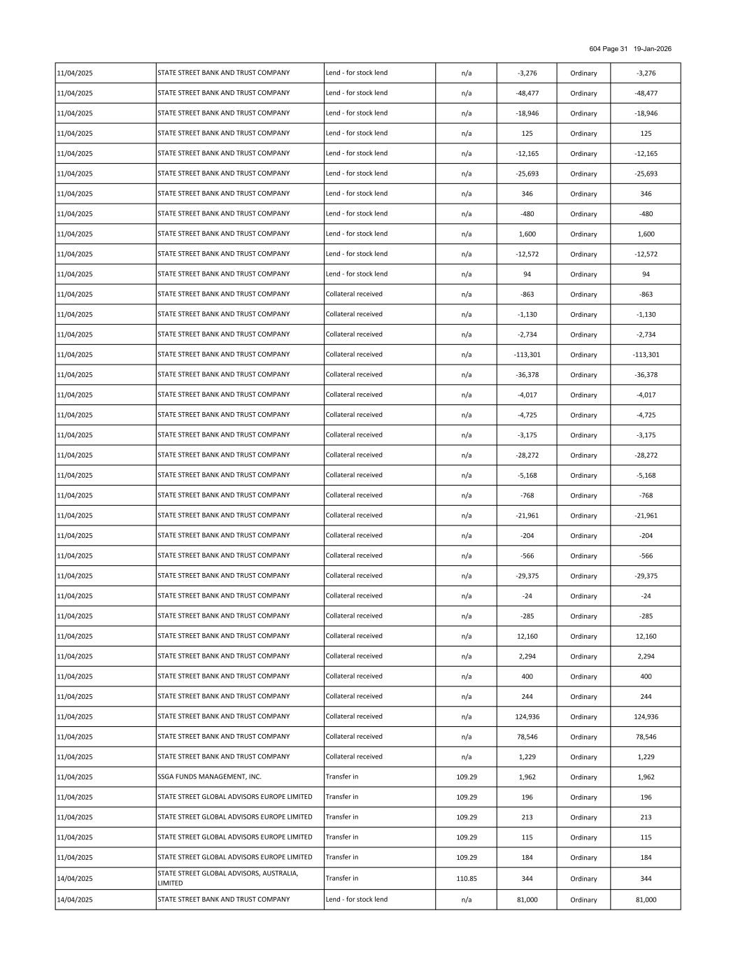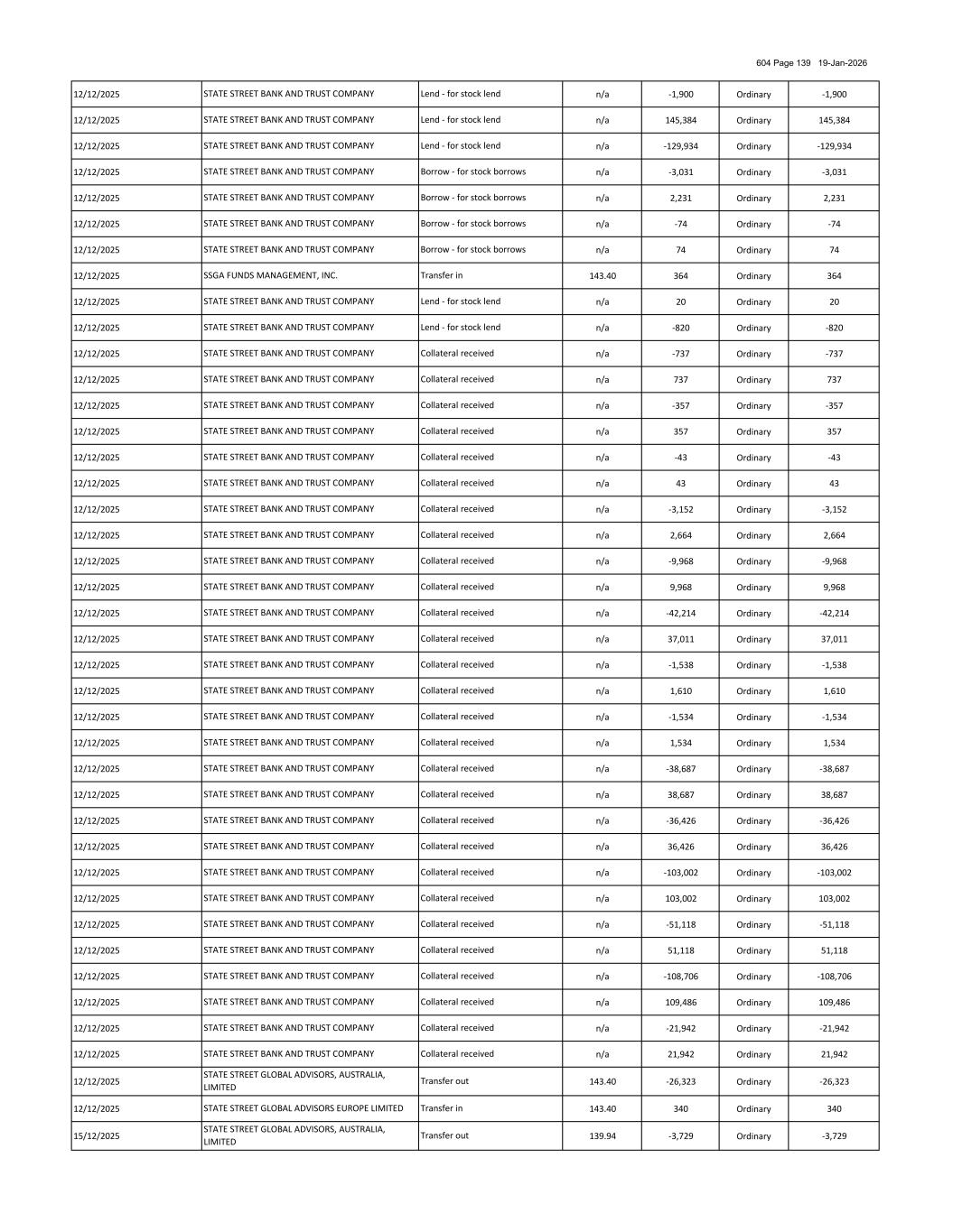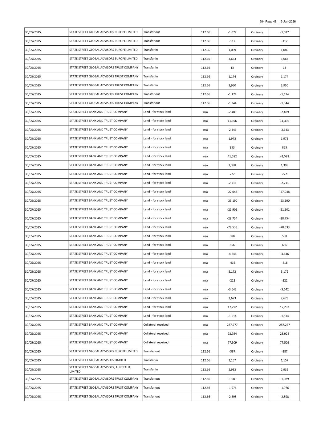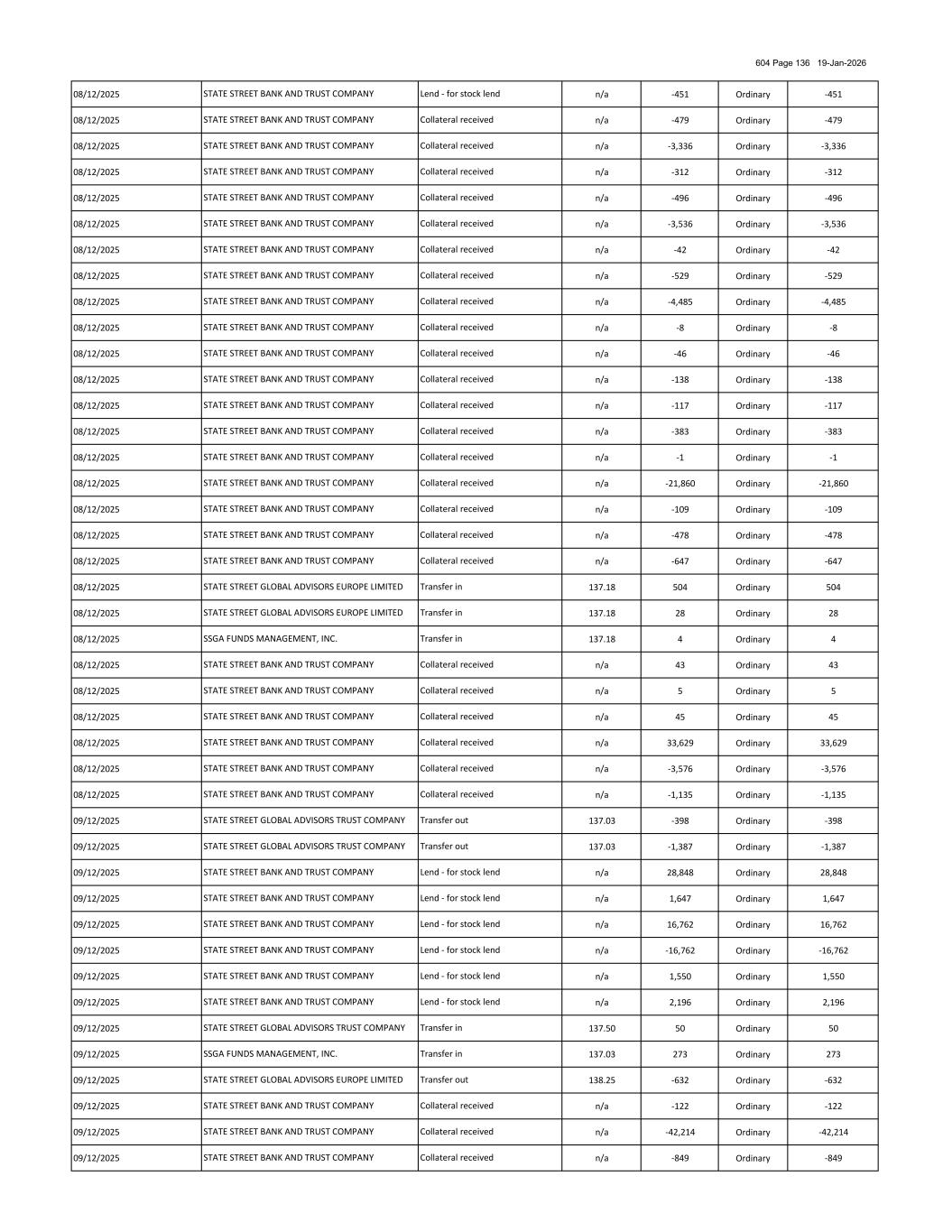 604 Page 134 19-Jan-2026 04/12/2025 n/a -3,766 Ordinary -3,766 04/12/2025 n/a -1,625 Ordinary -1,625 04/12/2025 n/a -382 Ordinary -382 04/12/2025 n/a -36,489 Ordinary -36,489 04/12/2025 n/a -4,972 Ordinary -4,972 04/12/2025 n/a -1,550 Ordinary -1,550 04/12/2025 n/a -726 Ordinary -726 04/12/2025 n/a -3,031 Ordinary -3,031 04/12/2025 n/a 3,031 Ordinary 3,031 04/12/2025 n/a -74 Ordinary -74 04/12/2025 n/a 74 Ordinary 74 04/12/2025 138.00 1,143 Ordinary 1,143 04/12/2025 n/a -737 Ordinary -737 04/12/2025 n/a 737 Ordinary 737 04/12/2025 n/a -357 Ordinary -357 04/12/2025 n/a 357 Ordinary 357 04/12/2025 n/a -5,135 Ordinary -5,135 04/12/2025 n/a 5,180 Ordinary 5,180 04/12/2025 n/a -9,968 Ordinary -9,968 04/12/2025 n/a 9,968 Ordinary 9,968 04/12/2025 n/a -42,214 Ordinary -42,214 04/12/2025 n/a 42,214 Ordinary 42,214 04/12/2025 n/a -5,673 Ordinary -5,673 04/12/2025 n/a 4,386 Ordinary 4,386 04/12/2025 n/a -1,534 Ordinary -1,534 04/12/2025 n/a 1,534 Ordinary 1,534 04/12/2025 n/a -38,687 Ordinary -38,687 04/12/2025 n/a 38,687 Ordinary 38,687 04/12/2025 n/a -36,426 Ordinary -36,426 04/12/2025 n/a 36,426 Ordinary 36,426 04/12/2025 n/a -34,881 Ordinary -34,881 04/12/2025 n/a 69,373 Ordinary 69,373 04/12/2025 n/a -51,118 Ordinary -51,118 04/12/2025 n/a 51,118 Ordinary 51,118 04/12/2025 n/a -110,175 Ordinary -110,175 04/12/2025 n/a 110,175 Ordinary 110,175 04/12/2025 n/a -21,942 Ordinary -21,942 04/12/2025 n/a 21,942 Ordinary 21,942 04/12/2025 140.58 92 Ordinary 92 04/12/2025 138.12 300 Ordinary 300 04/12/2025 140.48 -1,113 Ordinary -1,113 04/12/2025 138.00 -2,028 Ordinary -2,028STATE STREET GLOBAL ADVISORS TRUST COMPANY STATE STREET BANK AND TRUST COMPANY Borrow - for stock borrows STATE STREET BANK AND TRUST COMPANY STATE STREET BANK AND TRUST COMPANY STATE STREET BANK AND TRUST COMPANY Collateral received Collateral received STATE STREET BANK AND TRUST COMPANY Collateral received Collateral received Collateral received Collateral received Borrow - for stock borrows STATE STREET BANK AND TRUST COMPANY STATE STREET BANK AND TRUST COMPANY Collateral received STATE STREET BANK AND TRUST COMPANY Collateral received Collateral received STATE STREET BANK AND TRUST COMPANY Lend - for stock lend SSGA FUNDS MANAGEMENT, INC. STATE STREET BANK AND TRUST COMPANY Transfer in STATE STREET BANK AND TRUST COMPANY Lend - for stock lend STATE STREET BANK AND TRUST COMPANY Lend - for stock lend STATE STREET BANK AND TRUST COMPANY STATE STREET BANK AND TRUST COMPANY STATE STREET BANK AND TRUST COMPANY STATE STREET BANK AND TRUST COMPANY STATE STREET BANK AND TRUST COMPANY Collateral received Collateral received Collateral received Collateral received Collateral received Collateral received Lend - for stock lend STATE STREET BANK AND TRUST COMPANY Collateral received Collateral received Collateral received STATE STREET BANK AND TRUST COMPANY Lend - for stock lend STATE STREET BANK AND TRUST COMPANY STATE STREET BANK AND TRUST COMPANY STATE STREET BANK AND TRUST COMPANY Collateral received Collateral received STATE STREET BANK AND TRUST COMPANY STATE STREET BANK AND TRUST COMPANY Lend - for stock lend STATE STREET BANK AND TRUST COMPANY STATE STREET BANK AND TRUST COMPANY STATE STREET BANK AND TRUST COMPANY STATE STREET BANK AND TRUST COMPANY STATE STREET BANK AND TRUST COMPANY Transfer in STATE STREET BANK AND TRUST COMPANY STATE STREET BANK AND TRUST COMPANY Transfer out Collateral received Transfer in Collateral received Collateral received Lend - for stock lend STATE STREET GLOBAL ADVISORS EUROPE LIMITED STATE STREET BANK AND TRUST COMPANY Transfer out Collateral received Borrow - for stock borrows Collateral received STATE STREET GLOBAL ADVISORS TRUST COMPANY STATE STREET BANK AND TRUST COMPANY STATE STREET BANK AND TRUST COMPANY Collateral received STATE STREET GLOBAL ADVISORS EUROPE LIMITED STATE STREET BANK AND TRUST COMPANY Borrow - for stock borrows STATE STREET BANK AND TRUST COMPANY STATE STREET BANK AND TRUST COMPANY