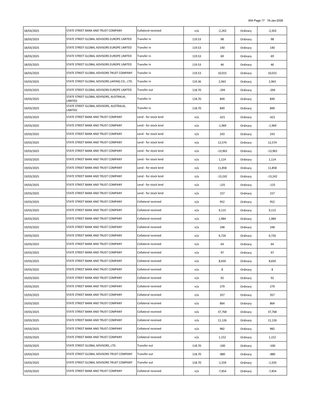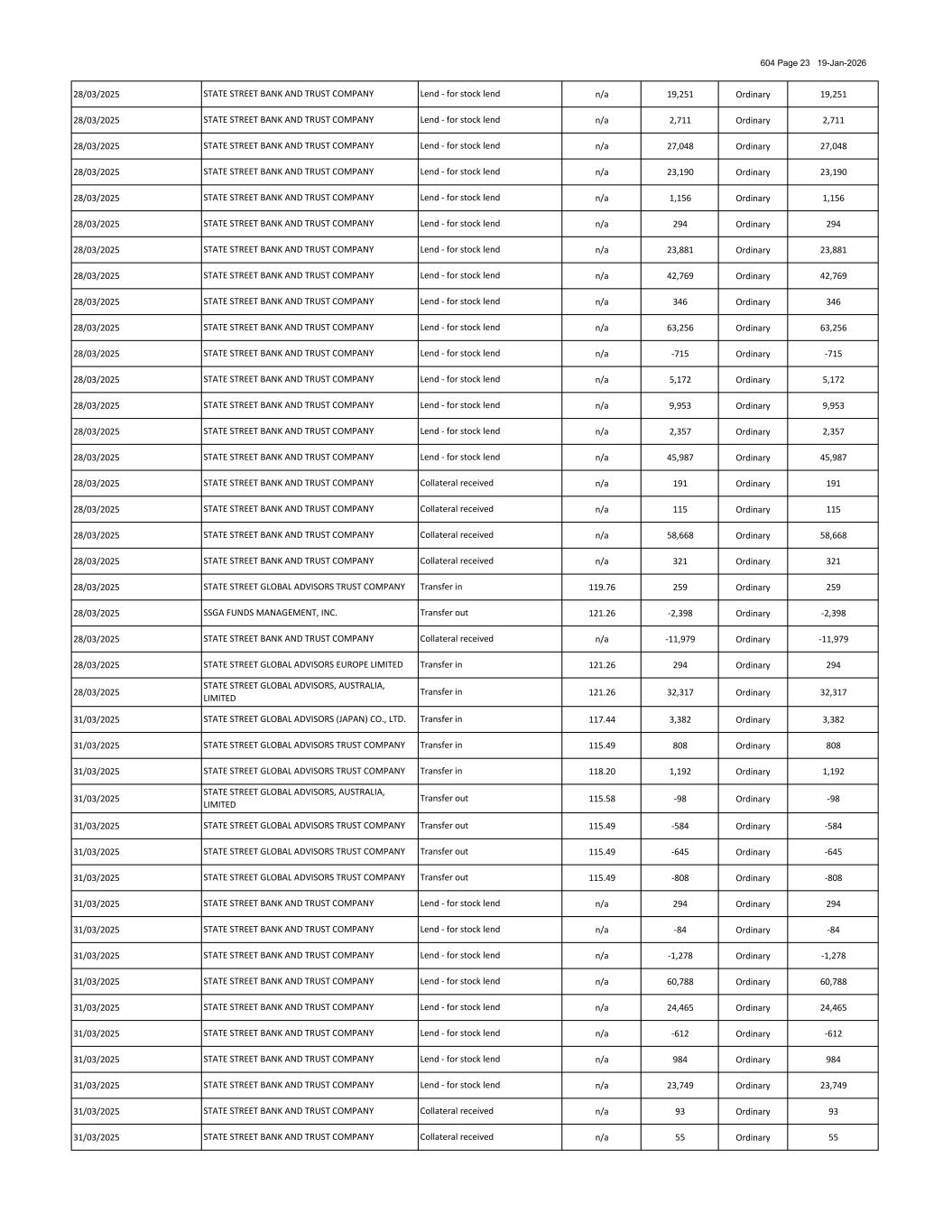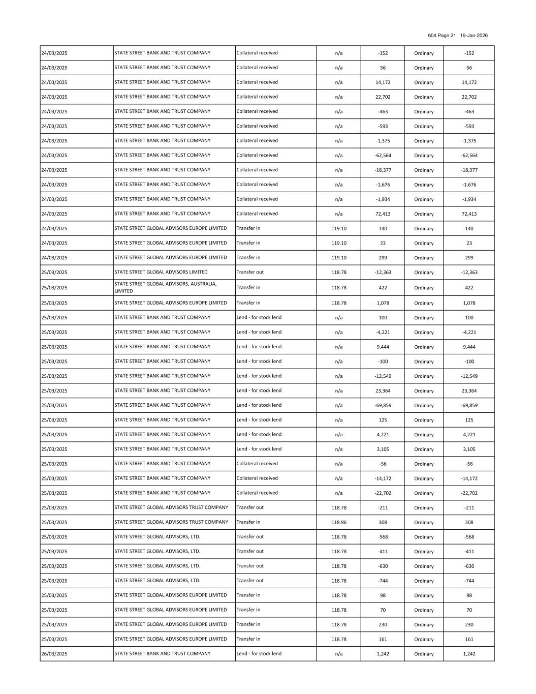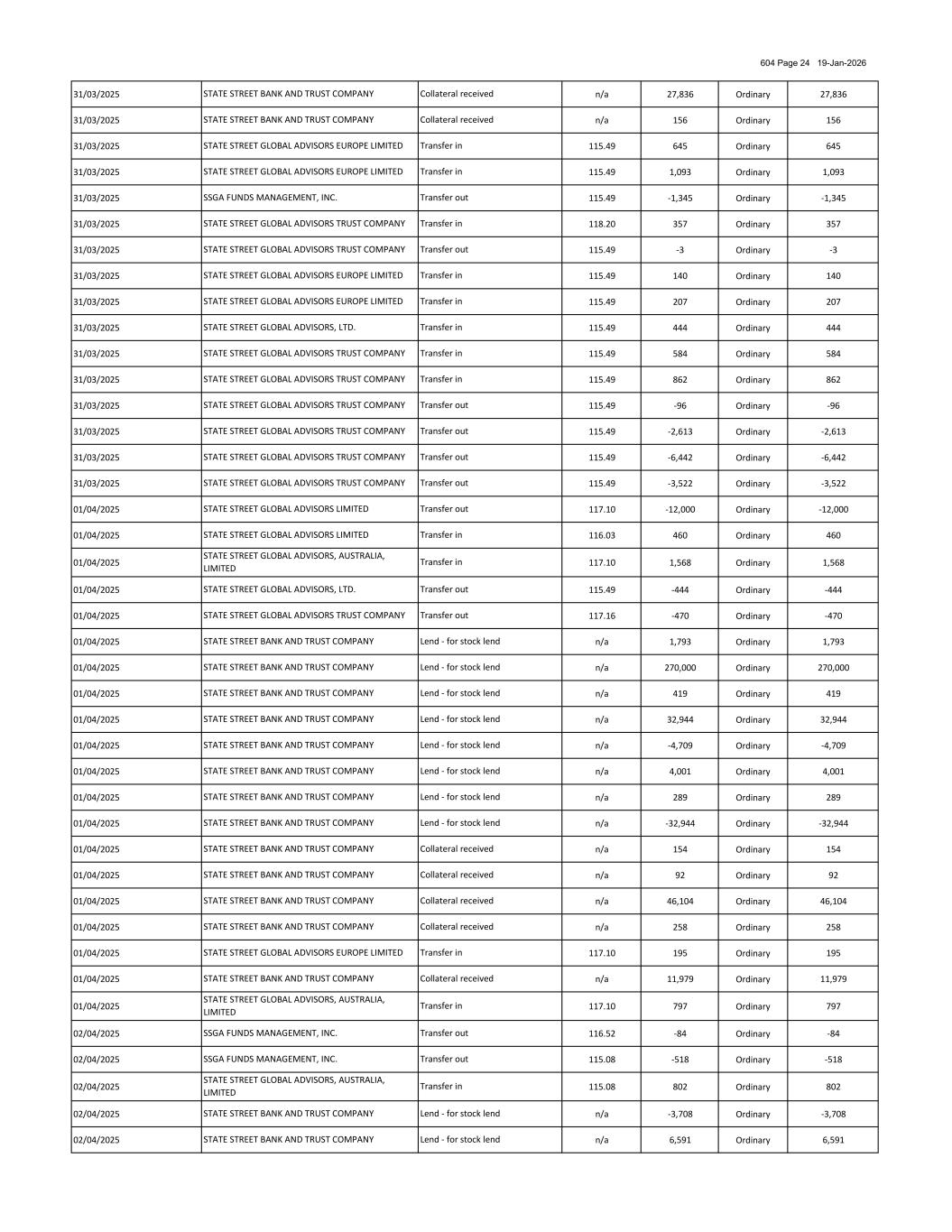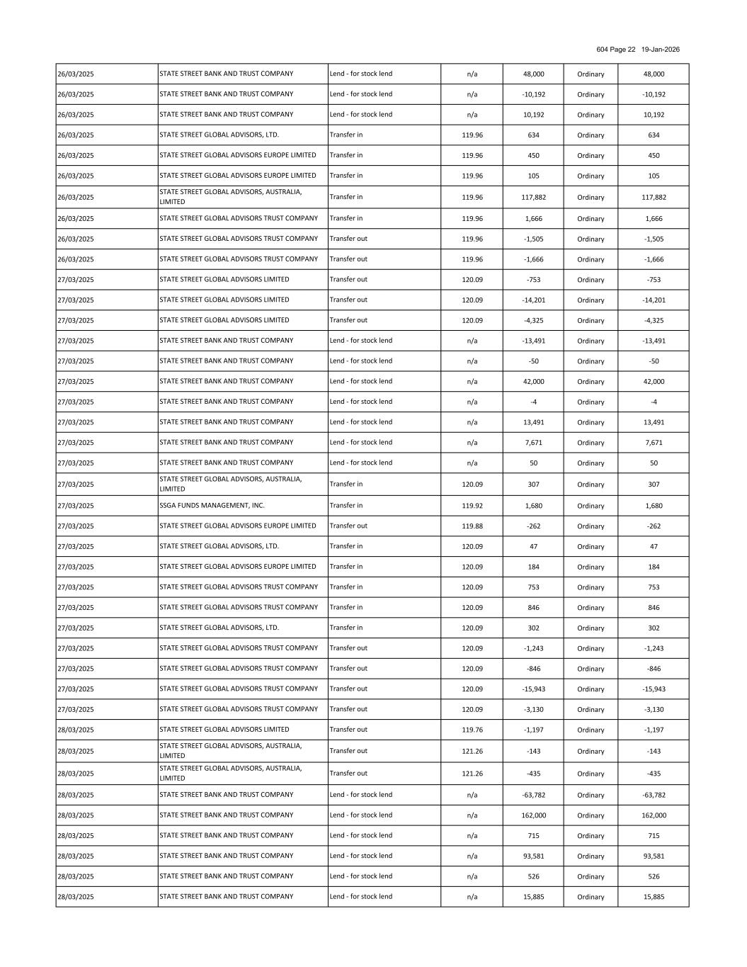 604 Page 21 19-Jan-2026 24/03/2025 n/a -152 Ordinary -152 24/03/2025 n/a 56 Ordinary 56 24/03/2025 n/a 14,172 Ordinary 14,172 24/03/2025 n/a 22,702 Ordinary 22,702 24/03/2025 n/a -463 Ordinary -463 24/03/2025 n/a -593 Ordinary -593 24/03/2025 n/a -1,375 Ordinary -1,375 24/03/2025 n/a -62,564 Ordinary -62,564 24/03/2025 n/a -18,377 Ordinary -18,377 24/03/2025 n/a -1,676 Ordinary -1,676 24/03/2025 n/a -1,934 Ordinary -1,934 24/03/2025 n/a 72,413 Ordinary 72,413 24/03/2025 119.10 140 Ordinary 140 24/03/2025 119.10 23 Ordinary 23 24/03/2025 119.10 299 Ordinary 299 25/03/2025 118.78 -12,363 Ordinary -12,363 25/03/2025 118.78 422 Ordinary 422 25/03/2025 118.78 1,078 Ordinary 1,078 25/03/2025 n/a 100 Ordinary 100 25/03/2025 n/a -4,221 Ordinary -4,221 25/03/2025 n/a 9,444 Ordinary 9,444 25/03/2025 n/a -100 Ordinary -100 25/03/2025 n/a -12,549 Ordinary -12,549 25/03/2025 n/a 23,364 Ordinary 23,364 25/03/2025 n/a -69,859 Ordinary -69,859 25/03/2025 n/a 125 Ordinary 125 25/03/2025 n/a 4,221 Ordinary 4,221 25/03/2025 n/a 3,105 Ordinary 3,105 25/03/2025 n/a -56 Ordinary -56 25/03/2025 n/a -14,172 Ordinary -14,172 25/03/2025 n/a -22,702 Ordinary -22,702 25/03/2025 118.78 -211 Ordinary -211 25/03/2025 118.96 308 Ordinary 308 25/03/2025 118.78 -568 Ordinary -568 25/03/2025 118.78 -411 Ordinary -411 25/03/2025 118.78 -630 Ordinary -630 25/03/2025 118.78 -744 Ordinary -744 25/03/2025 118.78 98 Ordinary 98 25/03/2025 118.78 70 Ordinary 70 25/03/2025 118.78 230 Ordinary 230 25/03/2025 118.78 161 Ordinary 161 26/03/2025 n/a 1,242 Ordinary 1,242 Transfer in STATE STREET BANK AND TRUST COMPANY Transfer in Collateral received STATE STREET BANK AND TRUST COMPANY Collateral received STATE STREET GLOBAL ADVISORS EUROPE LIMITED STATE STREET GLOBAL ADVISORS, AUSTRALIA, LIMITED STATE STREET BANK AND TRUST COMPANY STATE STREET BANK AND TRUST COMPANY Transfer in Collateral received STATE STREET GLOBAL ADVISORS EUROPE LIMITED Transfer in Lend - for stock lend STATE STREET GLOBAL ADVISORS EUROPE LIMITED Collateral received Transfer in STATE STREET GLOBAL ADVISORS LIMITED STATE STREET BANK AND TRUST COMPANY STATE STREET BANK AND TRUST COMPANY STATE STREET BANK AND TRUST COMPANY STATE STREET BANK AND TRUST COMPANY Transfer out STATE STREET BANK AND TRUST COMPANY Collateral received STATE STREET BANK AND TRUST COMPANY Lend - for stock lend STATE STREET BANK AND TRUST COMPANY STATE STREET BANK AND TRUST COMPANY Lend - for stock lend Collateral received STATE STREET BANK AND TRUST COMPANY STATE STREET GLOBAL ADVISORS EUROPE LIMITED Collateral received STATE STREET GLOBAL ADVISORS EUROPE LIMITED STATE STREET BANK AND TRUST COMPANY Collateral received Lend - for stock lend Lend - for stock lend STATE STREET BANK AND TRUST COMPANY STATE STREET GLOBAL ADVISORS EUROPE LIMITED STATE STREET GLOBAL ADVISORS TRUST COMPANY Collateral received Collateral received STATE STREET BANK AND TRUST COMPANY Collateral received STATE STREET BANK AND TRUST COMPANY Transfer out Lend - for stock lend STATE STREET GLOBAL ADVISORS, LTD. Collateral received Transfer in STATE STREET BANK AND TRUST COMPANY STATE STREET BANK AND TRUST COMPANY Lend - for stock lend Transfer in Collateral received STATE STREET BANK AND TRUST COMPANY STATE STREET GLOBAL ADVISORS TRUST COMPANY STATE STREET BANK AND TRUST COMPANY Transfer out Lend - for stock lend Transfer in Lend - for stock lend STATE STREET BANK AND TRUST COMPANY Collateral received STATE STREET GLOBAL ADVISORS, LTD. Transfer out STATE STREET GLOBAL ADVISORS EUROPE LIMITED STATE STREET BANK AND TRUST COMPANY Lend - for stock lend STATE STREET BANK AND TRUST COMPANY Transfer in STATE STREET GLOBAL ADVISORS, LTD. Transfer out Transfer out Transfer in Lend - for stock lend Collateral received STATE STREET GLOBAL ADVISORS, LTD. STATE STREET BANK AND TRUST COMPANY STATE STREET GLOBAL ADVISORS EUROPE LIMITED STATE STREET BANK AND TRUST COMPANY