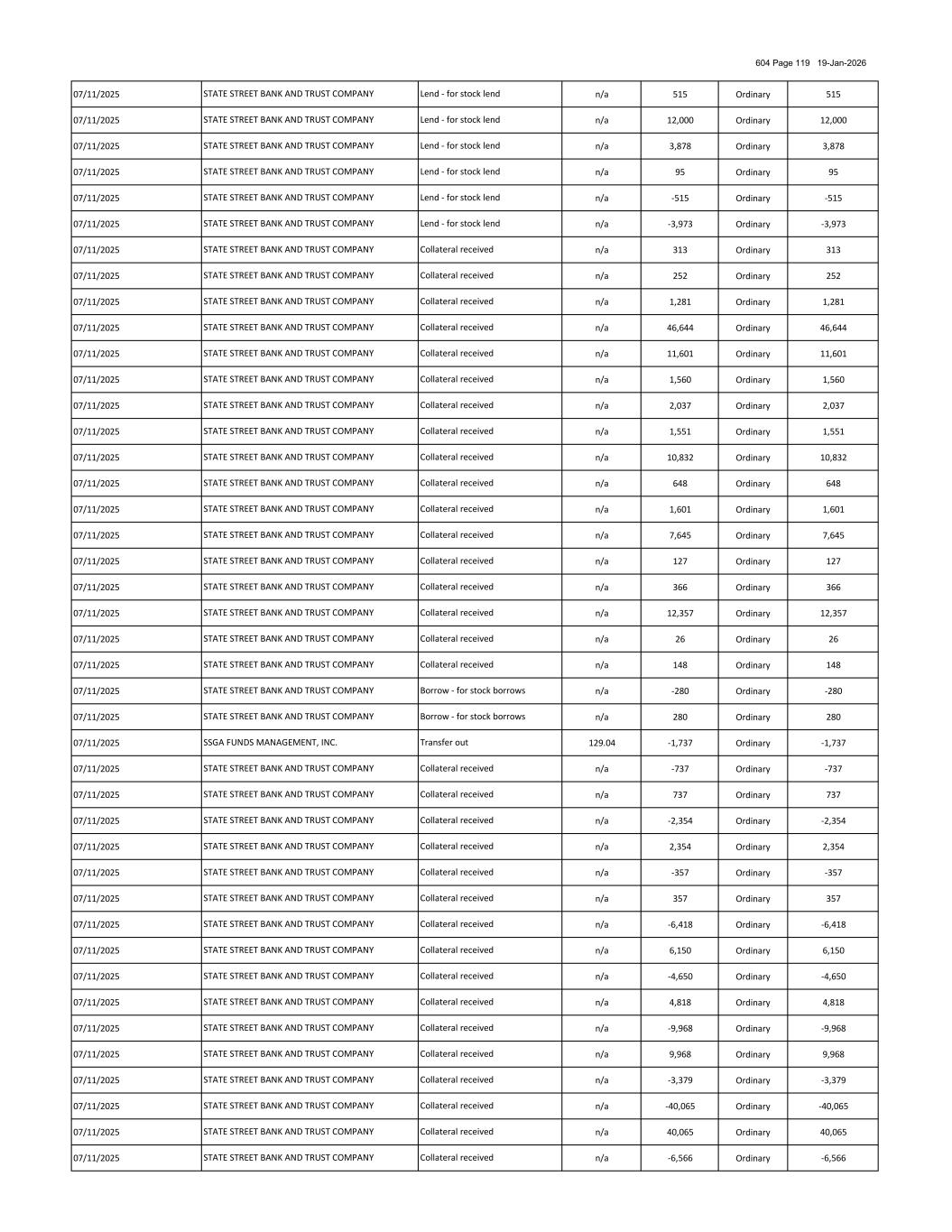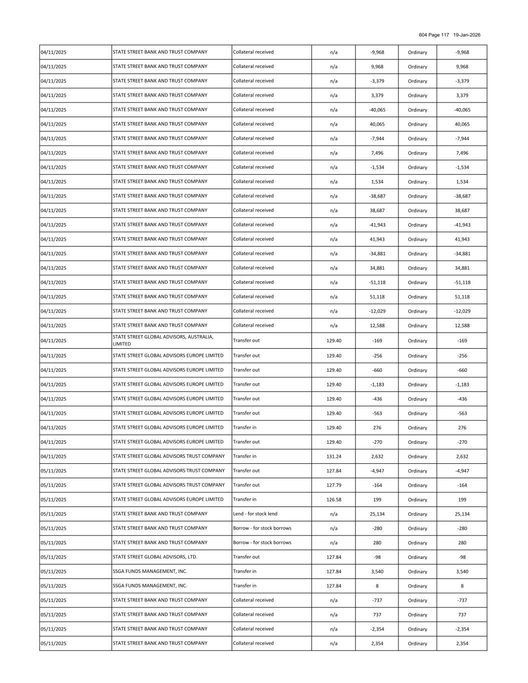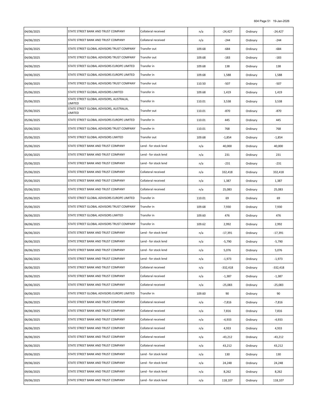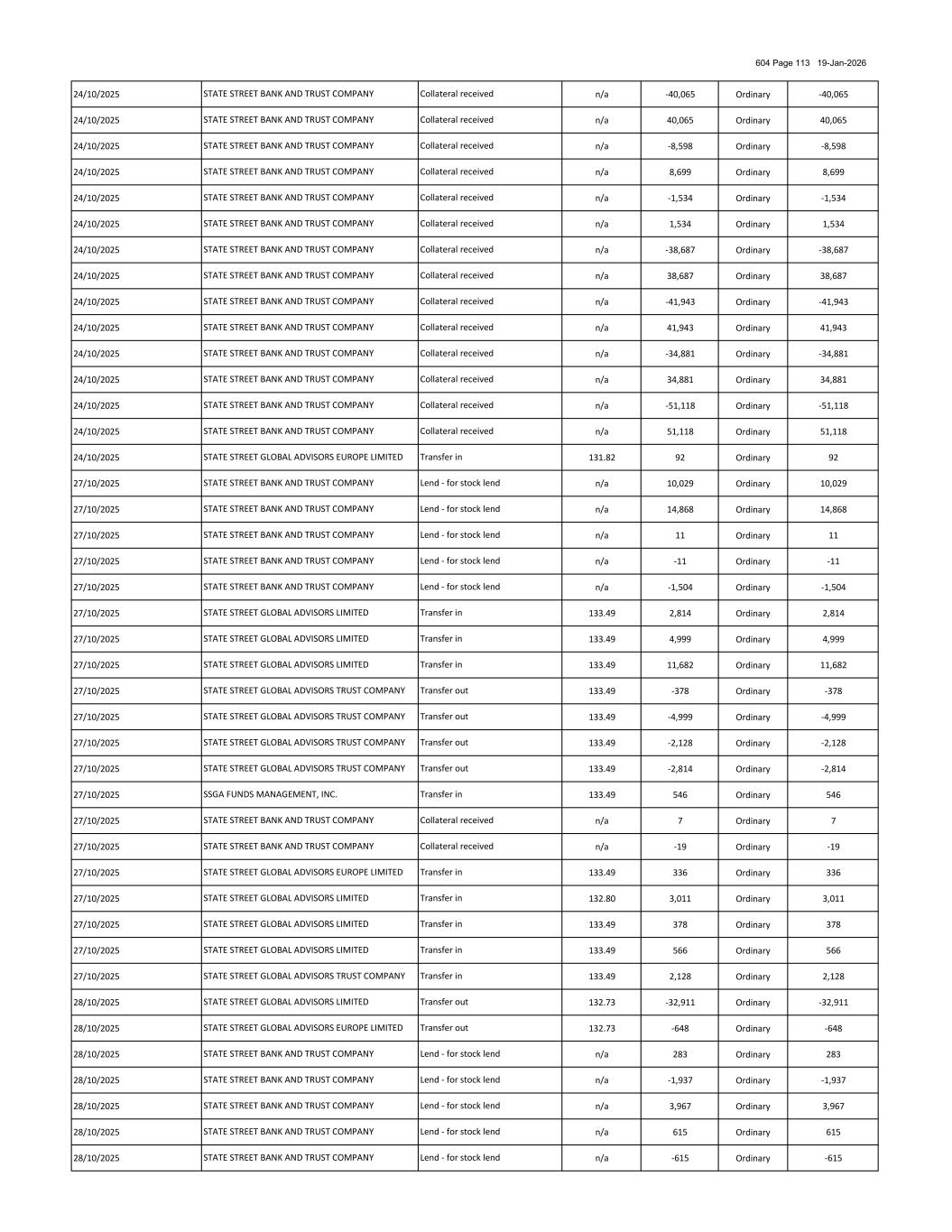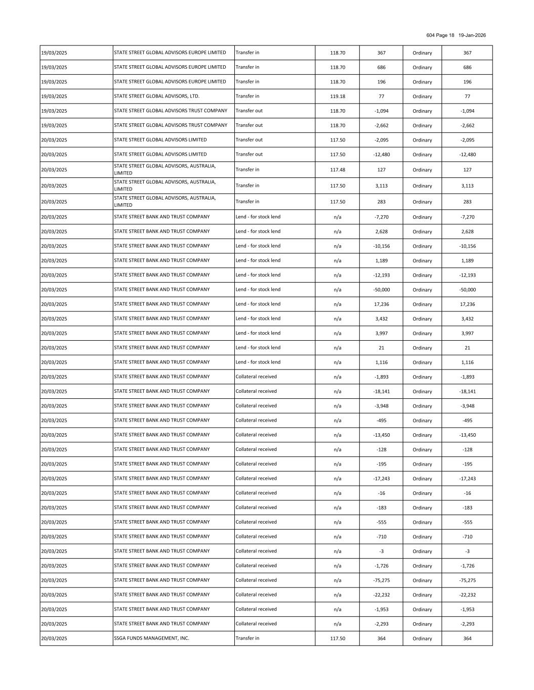 604 Page 119 19-Jan-2026 07/11/2025 n/a 515 Ordinary 515 07/11/2025 n/a 12,000 Ordinary 12,000 07/11/2025 n/a 3,878 Ordinary 3,878 07/11/2025 n/a 95 Ordinary 95 07/11/2025 n/a -515 Ordinary -515 07/11/2025 n/a -3,973 Ordinary -3,973 07/11/2025 n/a 313 Ordinary 313 07/11/2025 n/a 252 Ordinary 252 07/11/2025 n/a 1,281 Ordinary 1,281 07/11/2025 n/a 46,644 Ordinary 46,644 07/11/2025 n/a 11,601 Ordinary 11,601 07/11/2025 n/a 1,560 Ordinary 1,560 07/11/2025 n/a 2,037 Ordinary 2,037 07/11/2025 n/a 1,551 Ordinary 1,551 07/11/2025 n/a 10,832 Ordinary 10,832 07/11/2025 n/a 648 Ordinary 648 07/11/2025 n/a 1,601 Ordinary 1,601 07/11/2025 n/a 7,645 Ordinary 7,645 07/11/2025 n/a 127 Ordinary 127 07/11/2025 n/a 366 Ordinary 366 07/11/2025 n/a 12,357 Ordinary 12,357 07/11/2025 n/a 26 Ordinary 26 07/11/2025 n/a 148 Ordinary 148 07/11/2025 n/a -280 Ordinary -280 07/11/2025 n/a 280 Ordinary 280 07/11/2025 129.04 -1,737 Ordinary -1,737 07/11/2025 n/a -737 Ordinary -737 07/11/2025 n/a 737 Ordinary 737 07/11/2025 n/a -2,354 Ordinary -2,354 07/11/2025 n/a 2,354 Ordinary 2,354 07/11/2025 n/a -357 Ordinary -357 07/11/2025 n/a 357 Ordinary 357 07/11/2025 n/a -6,418 Ordinary -6,418 07/11/2025 n/a 6,150 Ordinary 6,150 07/11/2025 n/a -4,650 Ordinary -4,650 07/11/2025 n/a 4,818 Ordinary 4,818 07/11/2025 n/a -9,968 Ordinary -9,968 07/11/2025 n/a 9,968 Ordinary 9,968 07/11/2025 n/a -3,379 Ordinary -3,379 07/11/2025 n/a -40,065 Ordinary -40,065 07/11/2025 n/a 40,065 Ordinary 40,065 07/11/2025 n/a -6,566 Ordinary -6,566 STATE STREET BANK AND TRUST COMPANY STATE STREET BANK AND TRUST COMPANY STATE STREET BANK AND TRUST COMPANY Collateral received Collateral received STATE STREET BANK AND TRUST COMPANY Collateral received Collateral received Collateral received STATE STREET BANK AND TRUST COMPANY Collateral received Collateral received Collateral received Collateral received STATE STREET BANK AND TRUST COMPANY STATE STREET BANK AND TRUST COMPANY STATE STREET BANK AND TRUST COMPANY Borrow - for stock borrows Lend - for stock lend STATE STREET BANK AND TRUST COMPANY STATE STREET BANK AND TRUST COMPANY Collateral received STATE STREET BANK AND TRUST COMPANY STATE STREET BANK AND TRUST COMPANY STATE STREET BANK AND TRUST COMPANY Lend - for stock lend STATE STREET BANK AND TRUST COMPANY STATE STREET BANK AND TRUST COMPANY Collateral received STATE STREET BANK AND TRUST COMPANY STATE STREET BANK AND TRUST COMPANY Collateral received Collateral received Collateral received Borrow - for stock borrows Lend - for stock lend STATE STREET BANK AND TRUST COMPANY Collateral received Collateral received STATE STREET BANK AND TRUST COMPANY Collateral received SSGA FUNDS MANAGEMENT, INC. Lend - for stock lend Collateral received Transfer out Lend - for stock lend STATE STREET BANK AND TRUST COMPANY STATE STREET BANK AND TRUST COMPANY STATE STREET BANK AND TRUST COMPANY Lend - for stock lend STATE STREET BANK AND TRUST COMPANY STATE STREET BANK AND TRUST COMPANY Collateral received STATE STREET BANK AND TRUST COMPANY STATE STREET BANK AND TRUST COMPANY STATE STREET BANK AND TRUST COMPANY Collateral received STATE STREET BANK AND TRUST COMPANY STATE STREET BANK AND TRUST COMPANY Collateral received STATE STREET BANK AND TRUST COMPANY Collateral received Collateral received Collateral received Collateral received Collateral received Collateral received Collateral received Collateral received STATE STREET BANK AND TRUST COMPANY STATE STREET BANK AND TRUST COMPANY STATE STREET BANK AND TRUST COMPANY STATE STREET BANK AND TRUST COMPANY Collateral received Collateral received STATE STREET BANK AND TRUST COMPANY Collateral received STATE STREET BANK AND TRUST COMPANY STATE STREET BANK AND TRUST COMPANY STATE STREET BANK AND TRUST COMPANY Collateral received STATE STREET BANK AND TRUST COMPANY STATE STREET BANK AND TRUST COMPANY STATE STREET BANK AND TRUST COMPANY