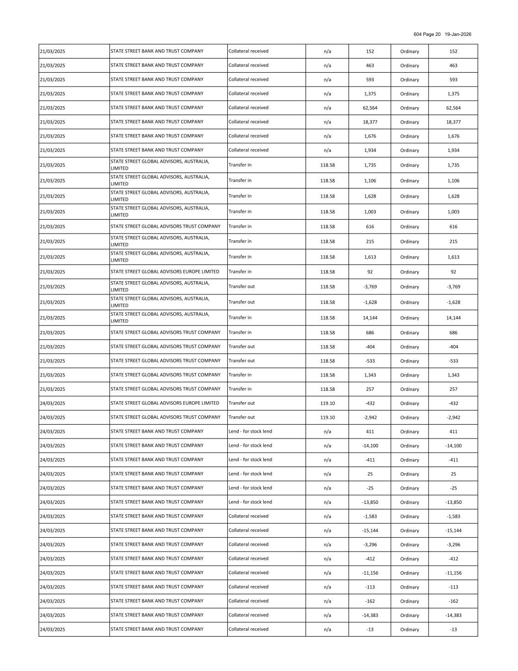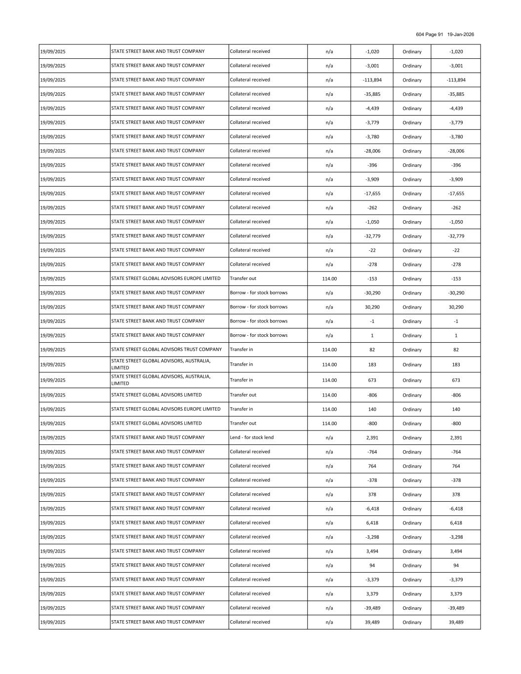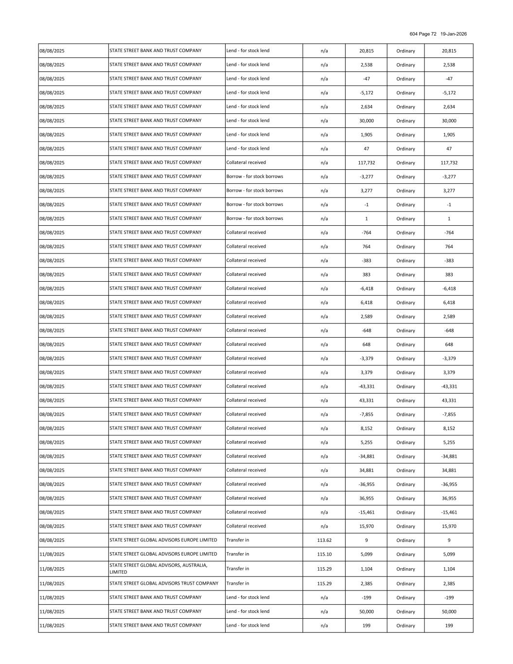 604 Page 77 19-Jan-2026 20/08/2025 n/a -5,354 Ordinary -5,354 20/08/2025 n/a -70 Ordinary -70 20/08/2025 n/a -759 Ordinary -759 20/08/2025 n/a -3,835 Ordinary -3,835 20/08/2025 n/a -53 Ordinary -53 20/08/2025 n/a -125 Ordinary -125 20/08/2025 n/a -6,155 Ordinary -6,155 20/08/2025 n/a -4 Ordinary -4 20/08/2025 n/a -53 Ordinary -53 20/08/2025 n/a -68 Ordinary -68 20/08/2025 n/a -221 Ordinary -221 20/08/2025 n/a -556 Ordinary -556 20/08/2025 n/a -21,434 Ordinary -21,434 20/08/2025 n/a -6,952 Ordinary -6,952 20/08/2025 n/a -822 Ordinary -822 20/08/2025 n/a -718 Ordinary -718 20/08/2025 n/a -1,400 Ordinary -1,400 20/08/2025 n/a 1,400 Ordinary 1,400 20/08/2025 n/a -2,486 Ordinary -2,486 20/08/2025 n/a 2,486 Ordinary 2,486 20/08/2025 n/a -1 Ordinary -1 20/08/2025 n/a 1 Ordinary 1 20/08/2025 112.90 -5,488 Ordinary -5,488 20/08/2025 n/a -764 Ordinary -764 20/08/2025 n/a 764 Ordinary 764 20/08/2025 n/a -378 Ordinary -378 20/08/2025 n/a 378 Ordinary 378 20/08/2025 n/a -6,418 Ordinary -6,418 20/08/2025 n/a 6,418 Ordinary 6,418 20/08/2025 n/a -2,826 Ordinary -2,826 20/08/2025 n/a 3,194 Ordinary 3,194 20/08/2025 n/a -648 Ordinary -648 20/08/2025 n/a 648 Ordinary 648 20/08/2025 n/a -3,379 Ordinary -3,379 20/08/2025 n/a 3,379 Ordinary 3,379 20/08/2025 n/a -43,497 Ordinary -43,497 20/08/2025 n/a 43,497 Ordinary 43,497 20/08/2025 n/a -9,671 Ordinary -9,671 20/08/2025 n/a 10,898 Ordinary 10,898 20/08/2025 n/a 1,534 Ordinary 1,534 20/08/2025 n/a -32,316 Ordinary -32,316 20/08/2025 n/a 32,316 Ordinary 32,316 STATE STREET BANK AND TRUST COMPANY STATE STREET BANK AND TRUST COMPANY STATE STREET BANK AND TRUST COMPANY Collateral received Borrow - for stock borrows STATE STREET BANK AND TRUST COMPANY STATE STREET BANK AND TRUST COMPANY Collateral received Collateral received STATE STREET BANK AND TRUST COMPANY STATE STREET BANK AND TRUST COMPANY STATE STREET BANK AND TRUST COMPANY Collateral received Collateral received STATE STREET BANK AND TRUST COMPANY Borrow - for stock borrows Collateral received STATE STREET BANK AND TRUST COMPANY STATE STREET BANK AND TRUST COMPANY Collateral received Collateral received Borrow - for stock borrows Collateral received STATE STREET BANK AND TRUST COMPANY STATE STREET BANK AND TRUST COMPANY STATE STREET BANK AND TRUST COMPANY Collateral received Borrow - for stock borrows STATE STREET BANK AND TRUST COMPANY STATE STREET BANK AND TRUST COMPANY STATE STREET BANK AND TRUST COMPANY STATE STREET BANK AND TRUST COMPANY Collateral received STATE STREET BANK AND TRUST COMPANY Collateral received Borrow - for stock borrows STATE STREET BANK AND TRUST COMPANY STATE STREET BANK AND TRUST COMPANY Collateral received STATE STREET BANK AND TRUST COMPANY Collateral received Collateral received STATE STREET BANK AND TRUST COMPANY Collateral received STATE STREET BANK AND TRUST COMPANY STATE STREET BANK AND TRUST COMPANY Collateral received Collateral received STATE STREET BANK AND TRUST COMPANY Transfer out STATE STREET BANK AND TRUST COMPANY STATE STREET BANK AND TRUST COMPANY Collateral received Collateral received Collateral received Collateral received STATE STREET BANK AND TRUST COMPANY Collateral received Collateral received STATE STREET BANK AND TRUST COMPANY STATE STREET GLOBAL ADVISORS, AUSTRALIA, LIMITED STATE STREET BANK AND TRUST COMPANY STATE STREET BANK AND TRUST COMPANY STATE STREET BANK AND TRUST COMPANY Collateral received STATE STREET BANK AND TRUST COMPANY STATE STREET BANK AND TRUST COMPANY Collateral received Collateral received Collateral received STATE STREET BANK AND TRUST COMPANY Collateral received Collateral received Borrow - for stock borrows STATE STREET BANK AND TRUST COMPANY Collateral received STATE STREET BANK AND TRUST COMPANY Collateral received STATE STREET BANK AND TRUST COMPANY STATE STREET BANK AND TRUST COMPANY Collateral received Collateral received Collateral received STATE STREET BANK AND TRUST COMPANY