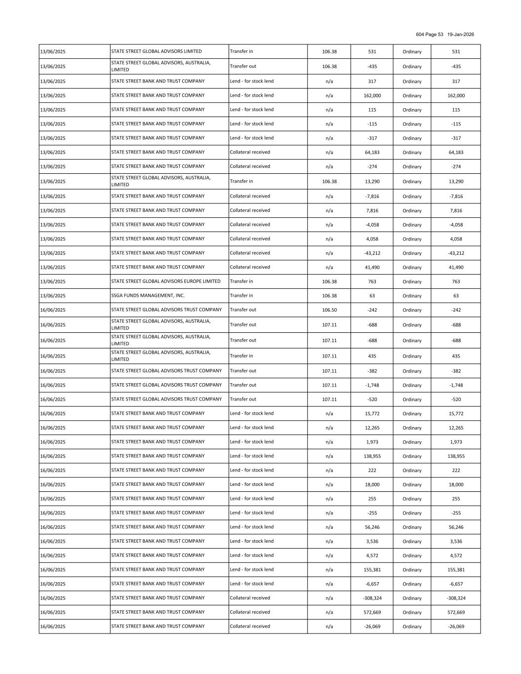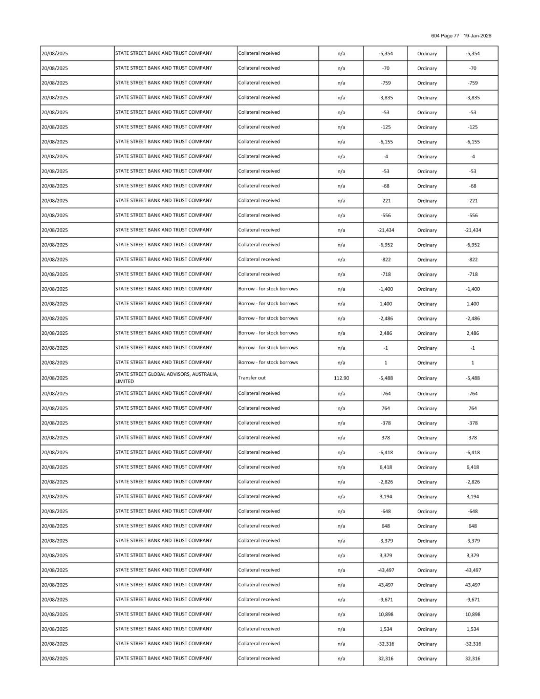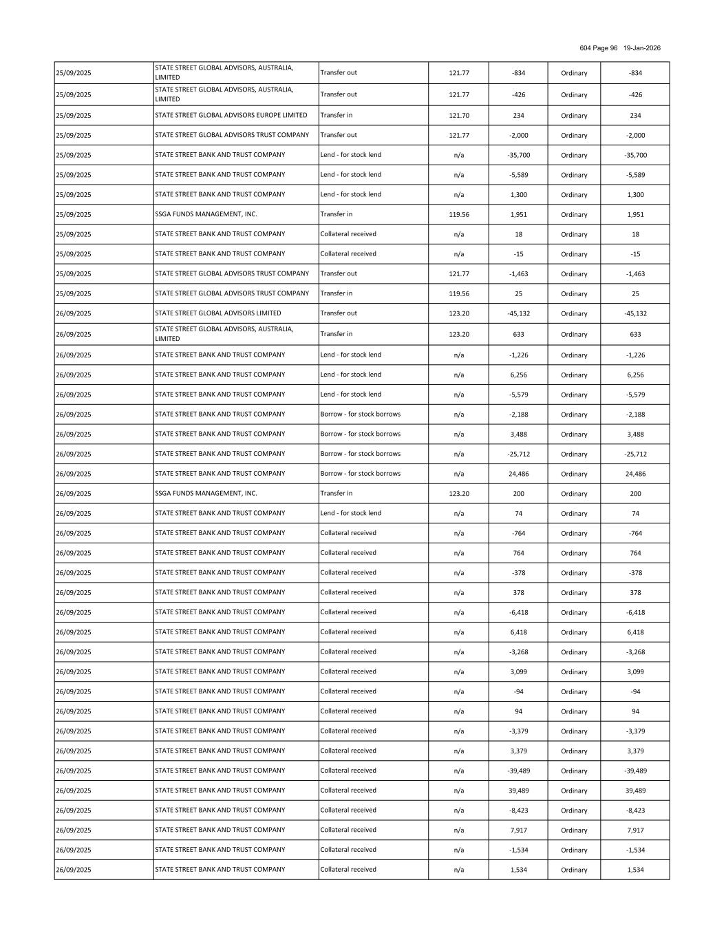 604 Page 77 19-Jan-2026 20/08/2025 n/a -5,354 Ordinary -5,354 20/08/2025 n/a -70 Ordinary -70 20/08/2025 n/a -759 Ordinary -759 20/08/2025 n/a -3,835 Ordinary -3,835 20/08/2025 n/a -53 Ordinary -53 20/08/2025 n/a -125 Ordinary -125 20/08/2025 n/a -6,155 Ordinary -6,155 20/08/2025 n/a -4 Ordinary -4 20/08/2025 n/a -53 Ordinary -53 20/08/2025 n/a -68 Ordinary -68 20/08/2025 n/a -221 Ordinary -221 20/08/2025 n/a -556 Ordinary -556 20/08/2025 n/a -21,434 Ordinary -21,434 20/08/2025 n/a -6,952 Ordinary -6,952 20/08/2025 n/a -822 Ordinary -822 20/08/2025 n/a -718 Ordinary -718 20/08/2025 n/a -1,400 Ordinary -1,400 20/08/2025 n/a 1,400 Ordinary 1,400 20/08/2025 n/a -2,486 Ordinary -2,486 20/08/2025 n/a 2,486 Ordinary 2,486 20/08/2025 n/a -1 Ordinary -1 20/08/2025 n/a 1 Ordinary 1 20/08/2025 112.90 -5,488 Ordinary -5,488 20/08/2025 n/a -764 Ordinary -764 20/08/2025 n/a 764 Ordinary 764 20/08/2025 n/a -378 Ordinary -378 20/08/2025 n/a 378 Ordinary 378 20/08/2025 n/a -6,418 Ordinary -6,418 20/08/2025 n/a 6,418 Ordinary 6,418 20/08/2025 n/a -2,826 Ordinary -2,826 20/08/2025 n/a 3,194 Ordinary 3,194 20/08/2025 n/a -648 Ordinary -648 20/08/2025 n/a 648 Ordinary 648 20/08/2025 n/a -3,379 Ordinary -3,379 20/08/2025 n/a 3,379 Ordinary 3,379 20/08/2025 n/a -43,497 Ordinary -43,497 20/08/2025 n/a 43,497 Ordinary 43,497 20/08/2025 n/a -9,671 Ordinary -9,671 20/08/2025 n/a 10,898 Ordinary 10,898 20/08/2025 n/a 1,534 Ordinary 1,534 20/08/2025 n/a -32,316 Ordinary -32,316 20/08/2025 n/a 32,316 Ordinary 32,316 STATE STREET BANK AND TRUST COMPANY STATE STREET BANK AND TRUST COMPANY STATE STREET BANK AND TRUST COMPANY Collateral received Borrow - for stock borrows STATE STREET BANK AND TRUST COMPANY STATE STREET BANK AND TRUST COMPANY Collateral received Collateral received STATE STREET BANK AND TRUST COMPANY STATE STREET BANK AND TRUST COMPANY STATE STREET BANK AND TRUST COMPANY Collateral received Collateral received STATE STREET BANK AND TRUST COMPANY Borrow - for stock borrows Collateral received STATE STREET BANK AND TRUST COMPANY STATE STREET BANK AND TRUST COMPANY Collateral received Collateral received Borrow - for stock borrows Collateral received STATE STREET BANK AND TRUST COMPANY STATE STREET BANK AND TRUST COMPANY STATE STREET BANK AND TRUST COMPANY Collateral received Borrow - for stock borrows STATE STREET BANK AND TRUST COMPANY STATE STREET BANK AND TRUST COMPANY STATE STREET BANK AND TRUST COMPANY STATE STREET BANK AND TRUST COMPANY Collateral received STATE STREET BANK AND TRUST COMPANY Collateral received Borrow - for stock borrows STATE STREET BANK AND TRUST COMPANY STATE STREET BANK AND TRUST COMPANY Collateral received STATE STREET BANK AND TRUST COMPANY Collateral received Collateral received STATE STREET BANK AND TRUST COMPANY Collateral received STATE STREET BANK AND TRUST COMPANY STATE STREET BANK AND TRUST COMPANY Collateral received Collateral received STATE STREET BANK AND TRUST COMPANY Transfer out STATE STREET BANK AND TRUST COMPANY STATE STREET BANK AND TRUST COMPANY Collateral received Collateral received Collateral received Collateral received STATE STREET BANK AND TRUST COMPANY Collateral received Collateral received STATE STREET BANK AND TRUST COMPANY STATE STREET GLOBAL ADVISORS, AUSTRALIA, LIMITED STATE STREET BANK AND TRUST COMPANY STATE STREET BANK AND TRUST COMPANY STATE STREET BANK AND TRUST COMPANY Collateral received STATE STREET BANK AND TRUST COMPANY STATE STREET BANK AND TRUST COMPANY Collateral received Collateral received Collateral received STATE STREET BANK AND TRUST COMPANY Collateral received Collateral received Borrow - for stock borrows STATE STREET BANK AND TRUST COMPANY Collateral received STATE STREET BANK AND TRUST COMPANY Collateral received STATE STREET BANK AND TRUST COMPANY STATE STREET BANK AND TRUST COMPANY Collateral received Collateral received Collateral received STATE STREET BANK AND TRUST COMPANY