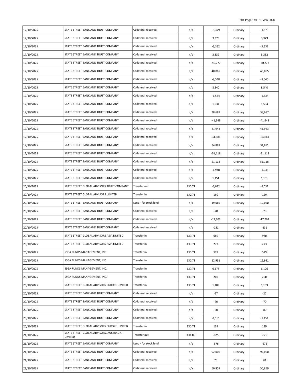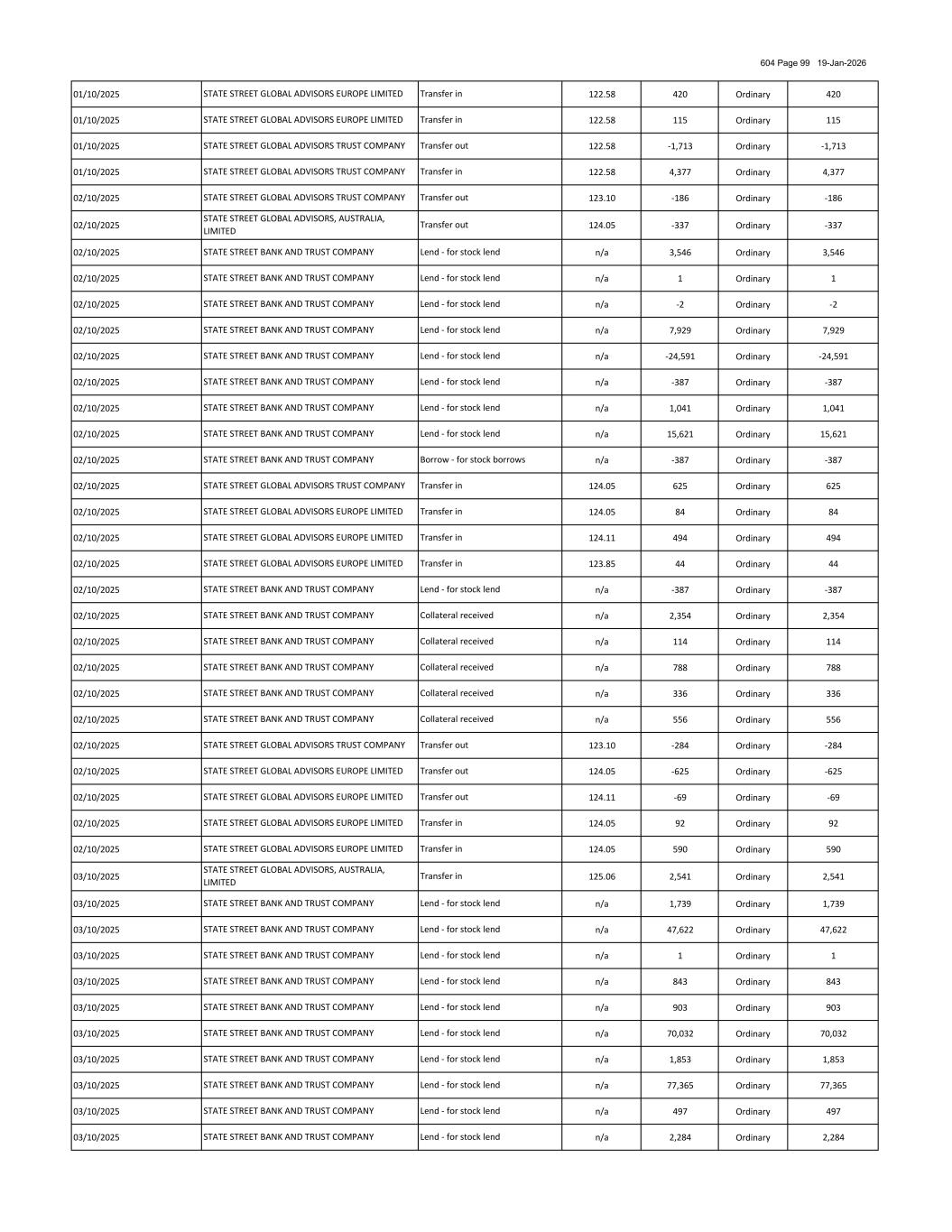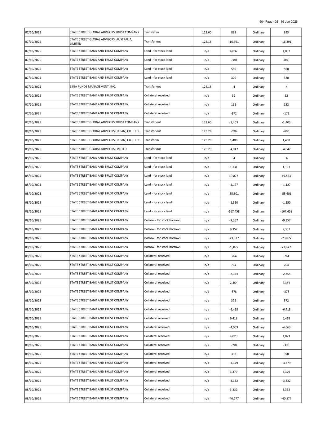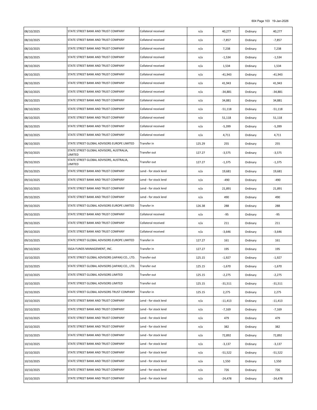 604 Page 103 19-Jan-2026 08/10/2025 n/a 40,277 Ordinary 40,277 08/10/2025 n/a -7,857 Ordinary -7,857 08/10/2025 n/a 7,238 Ordinary 7,238 08/10/2025 n/a -1,534 Ordinary -1,534 08/10/2025 n/a 1,534 Ordinary 1,534 08/10/2025 n/a -41,943 Ordinary -41,943 08/10/2025 n/a 41,943 Ordinary 41,943 08/10/2025 n/a -34,881 Ordinary -34,881 08/10/2025 n/a 34,881 Ordinary 34,881 08/10/2025 n/a -51,118 Ordinary -51,118 08/10/2025 n/a 51,118 Ordinary 51,118 08/10/2025 n/a -5,399 Ordinary -5,399 08/10/2025 n/a 4,711 Ordinary 4,711 08/10/2025 125.29 255 Ordinary 255 09/10/2025 127.27 -3,575 Ordinary -3,575 09/10/2025 127.27 -1,375 Ordinary -1,375 09/10/2025 n/a 19,681 Ordinary 19,681 09/10/2025 n/a -490 Ordinary -490 09/10/2025 n/a 21,891 Ordinary 21,891 09/10/2025 n/a 490 Ordinary 490 09/10/2025 126.38 288 Ordinary 288 09/10/2025 n/a -95 Ordinary -95 09/10/2025 n/a 211 Ordinary 211 09/10/2025 n/a -3,646 Ordinary -3,646 09/10/2025 127.27 161 Ordinary 161 09/10/2025 127.27 195 Ordinary 195 10/10/2025 125.15 -1,927 Ordinary -1,927 10/10/2025 125.15 -1,670 Ordinary -1,670 10/10/2025 125.15 -2,275 Ordinary -2,275 10/10/2025 125.15 -31,511 Ordinary -31,511 10/10/2025 125.15 2,275 Ordinary 2,275 10/10/2025 n/a -11,413 Ordinary -11,413 10/10/2025 n/a -7,169 Ordinary -7,169 10/10/2025 n/a 479 Ordinary 479 10/10/2025 n/a 382 Ordinary 382 10/10/2025 n/a 72,892 Ordinary 72,892 10/10/2025 n/a -3,137 Ordinary -3,137 10/10/2025 n/a -51,522 Ordinary -51,522 10/10/2025 n/a 1,550 Ordinary 1,550 10/10/2025 n/a 726 Ordinary 726 10/10/2025 n/a -24,478 Ordinary -24,478STATE STREET BANK AND TRUST COMPANY Lend - for stock lend Transfer in STATE STREET BANK AND TRUST COMPANY STATE STREET BANK AND TRUST COMPANY Collateral received STATE STREET GLOBAL ADVISORS LIMITED STATE STREET BANK AND TRUST COMPANY STATE STREET GLOBAL ADVISORS LIMITED Collateral received STATE STREET BANK AND TRUST COMPANY STATE STREET BANK AND TRUST COMPANY STATE STREET BANK AND TRUST COMPANY STATE STREET GLOBAL ADVISORS TRUST COMPANY Transfer in Collateral received Lend - for stock lend Lend - for stock lend STATE STREET BANK AND TRUST COMPANY Collateral received Collateral received Collateral received STATE STREET BANK AND TRUST COMPANY Collateral received Lend - for stock lend Collateral received STATE STREET BANK AND TRUST COMPANY STATE STREET BANK AND TRUST COMPANY STATE STREET GLOBAL ADVISORS EUROPE LIMITED STATE STREET BANK AND TRUST COMPANY Collateral received Collateral received STATE STREET BANK AND TRUST COMPANY STATE STREET BANK AND TRUST COMPANY STATE STREET BANK AND TRUST COMPANY Collateral received Lend - for stock lend STATE STREET BANK AND TRUST COMPANY STATE STREET BANK AND TRUST COMPANY STATE STREET BANK AND TRUST COMPANY Lend - for stock lend Transfer in Lend - for stock lend STATE STREET BANK AND TRUST COMPANY Collateral received STATE STREET BANK AND TRUST COMPANY Transfer in Transfer in Transfer out Lend - for stock lend Collateral received SSGA FUNDS MANAGEMENT, INC. STATE STREET BANK AND TRUST COMPANY Transfer out STATE STREET GLOBAL ADVISORS EUROPE LIMITED Collateral received Transfer out STATE STREET BANK AND TRUST COMPANY STATE STREET BANK AND TRUST COMPANY STATE STREET GLOBAL ADVISORS EUROPE LIMITED STATE STREET GLOBAL ADVISORS, AUSTRALIA, LIMITED STATE STREET GLOBAL ADVISORS (JAPAN) CO., LTD. STATE STREET BANK AND TRUST COMPANY Collateral received Lend - for stock lend STATE STREET BANK AND TRUST COMPANY STATE STREET BANK AND TRUST COMPANY STATE STREET GLOBAL ADVISORS, AUSTRALIA, LIMITED Lend - for stock lend Transfer out STATE STREET BANK AND TRUST COMPANY Lend - for stock lend STATE STREET BANK AND TRUST COMPANY Lend - for stock lend Transfer out Lend - for stock lend Transfer out Lend - for stock lend STATE STREET BANK AND TRUST COMPANY STATE STREET GLOBAL ADVISORS (JAPAN) CO., LTD. Collateral received STATE STREET BANK AND TRUST COMPANY