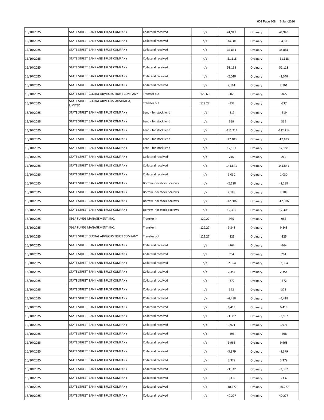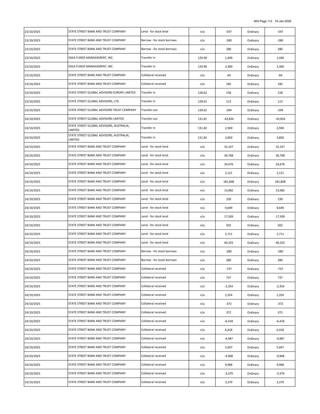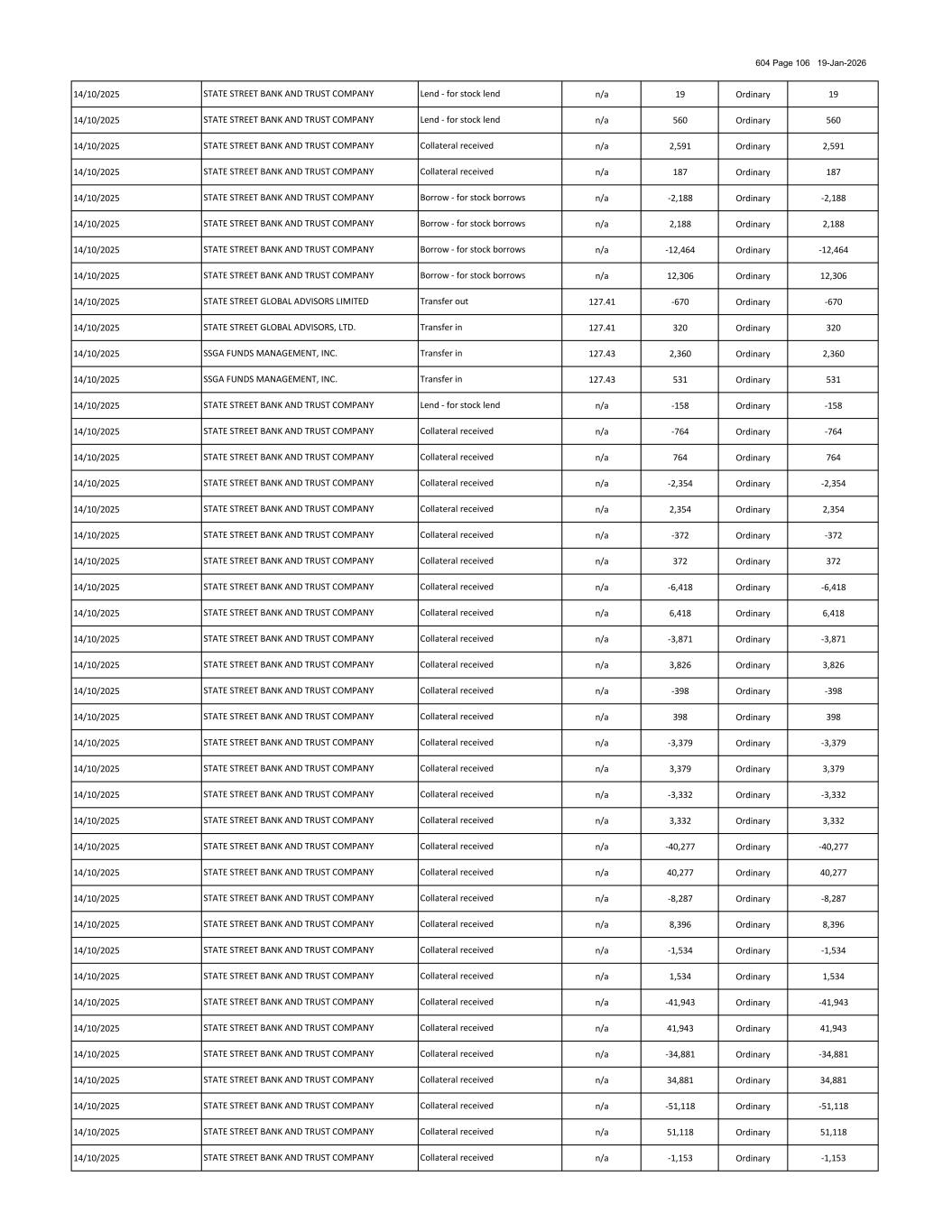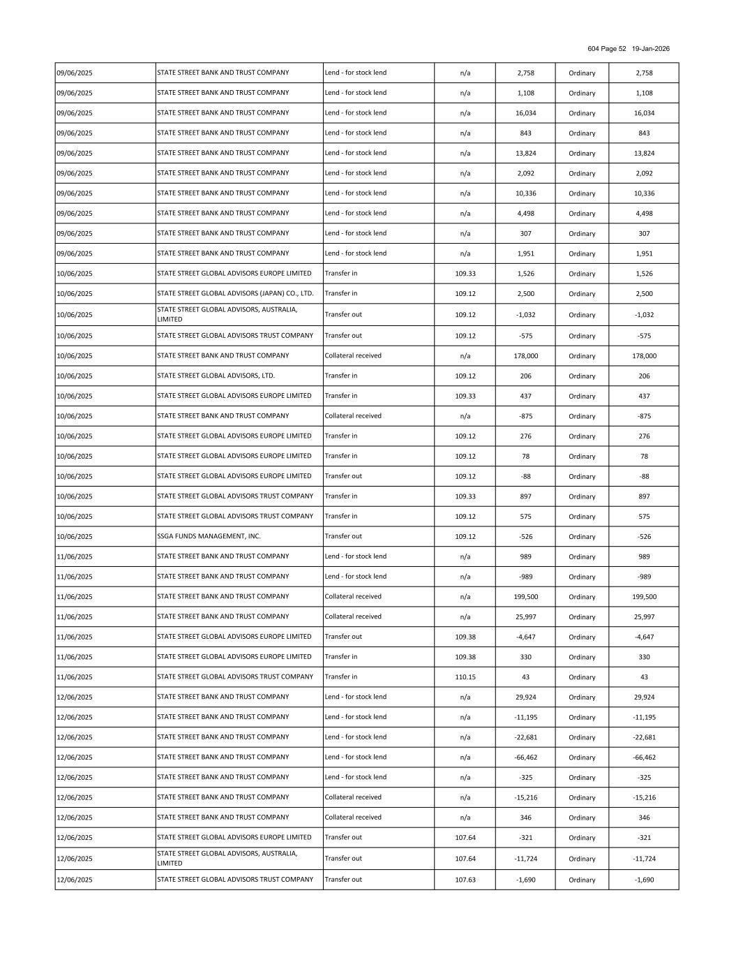 604 Page 103 19-Jan-2026 08/10/2025 n/a 40,277 Ordinary 40,277 08/10/2025 n/a -7,857 Ordinary -7,857 08/10/2025 n/a 7,238 Ordinary 7,238 08/10/2025 n/a -1,534 Ordinary -1,534 08/10/2025 n/a 1,534 Ordinary 1,534 08/10/2025 n/a -41,943 Ordinary -41,943 08/10/2025 n/a 41,943 Ordinary 41,943 08/10/2025 n/a -34,881 Ordinary -34,881 08/10/2025 n/a 34,881 Ordinary 34,881 08/10/2025 n/a -51,118 Ordinary -51,118 08/10/2025 n/a 51,118 Ordinary 51,118 08/10/2025 n/a -5,399 Ordinary -5,399 08/10/2025 n/a 4,711 Ordinary 4,711 08/10/2025 125.29 255 Ordinary 255 09/10/2025 127.27 -3,575 Ordinary -3,575 09/10/2025 127.27 -1,375 Ordinary -1,375 09/10/2025 n/a 19,681 Ordinary 19,681 09/10/2025 n/a -490 Ordinary -490 09/10/2025 n/a 21,891 Ordinary 21,891 09/10/2025 n/a 490 Ordinary 490 09/10/2025 126.38 288 Ordinary 288 09/10/2025 n/a -95 Ordinary -95 09/10/2025 n/a 211 Ordinary 211 09/10/2025 n/a -3,646 Ordinary -3,646 09/10/2025 127.27 161 Ordinary 161 09/10/2025 127.27 195 Ordinary 195 10/10/2025 125.15 -1,927 Ordinary -1,927 10/10/2025 125.15 -1,670 Ordinary -1,670 10/10/2025 125.15 -2,275 Ordinary -2,275 10/10/2025 125.15 -31,511 Ordinary -31,511 10/10/2025 125.15 2,275 Ordinary 2,275 10/10/2025 n/a -11,413 Ordinary -11,413 10/10/2025 n/a -7,169 Ordinary -7,169 10/10/2025 n/a 479 Ordinary 479 10/10/2025 n/a 382 Ordinary 382 10/10/2025 n/a 72,892 Ordinary 72,892 10/10/2025 n/a -3,137 Ordinary -3,137 10/10/2025 n/a -51,522 Ordinary -51,522 10/10/2025 n/a 1,550 Ordinary 1,550 10/10/2025 n/a 726 Ordinary 726 10/10/2025 n/a -24,478 Ordinary -24,478STATE STREET BANK AND TRUST COMPANY Lend - for stock lend Transfer in STATE STREET BANK AND TRUST COMPANY STATE STREET BANK AND TRUST COMPANY Collateral received STATE STREET GLOBAL ADVISORS LIMITED STATE STREET BANK AND TRUST COMPANY STATE STREET GLOBAL ADVISORS LIMITED Collateral received STATE STREET BANK AND TRUST COMPANY STATE STREET BANK AND TRUST COMPANY STATE STREET BANK AND TRUST COMPANY STATE STREET GLOBAL ADVISORS TRUST COMPANY Transfer in Collateral received Lend - for stock lend Lend - for stock lend STATE STREET BANK AND TRUST COMPANY Collateral received Collateral received Collateral received STATE STREET BANK AND TRUST COMPANY Collateral received Lend - for stock lend Collateral received STATE STREET BANK AND TRUST COMPANY STATE STREET BANK AND TRUST COMPANY STATE STREET GLOBAL ADVISORS EUROPE LIMITED STATE STREET BANK AND TRUST COMPANY Collateral received Collateral received STATE STREET BANK AND TRUST COMPANY STATE STREET BANK AND TRUST COMPANY STATE STREET BANK AND TRUST COMPANY Collateral received Lend - for stock lend STATE STREET BANK AND TRUST COMPANY STATE STREET BANK AND TRUST COMPANY STATE STREET BANK AND TRUST COMPANY Lend - for stock lend Transfer in Lend - for stock lend STATE STREET BANK AND TRUST COMPANY Collateral received STATE STREET BANK AND TRUST COMPANY Transfer in Transfer in Transfer out Lend - for stock lend Collateral received SSGA FUNDS MANAGEMENT, INC. STATE STREET BANK AND TRUST COMPANY Transfer out STATE STREET GLOBAL ADVISORS EUROPE LIMITED Collateral received Transfer out STATE STREET BANK AND TRUST COMPANY STATE STREET BANK AND TRUST COMPANY STATE STREET GLOBAL ADVISORS EUROPE LIMITED STATE STREET GLOBAL ADVISORS, AUSTRALIA, LIMITED STATE STREET GLOBAL ADVISORS (JAPAN) CO., LTD. STATE STREET BANK AND TRUST COMPANY Collateral received Lend - for stock lend STATE STREET BANK AND TRUST COMPANY STATE STREET BANK AND TRUST COMPANY STATE STREET GLOBAL ADVISORS, AUSTRALIA, LIMITED Lend - for stock lend Transfer out STATE STREET BANK AND TRUST COMPANY Lend - for stock lend STATE STREET BANK AND TRUST COMPANY Lend - for stock lend Transfer out Lend - for stock lend Transfer out Lend - for stock lend STATE STREET BANK AND TRUST COMPANY STATE STREET GLOBAL ADVISORS (JAPAN) CO., LTD. Collateral received STATE STREET BANK AND TRUST COMPANY