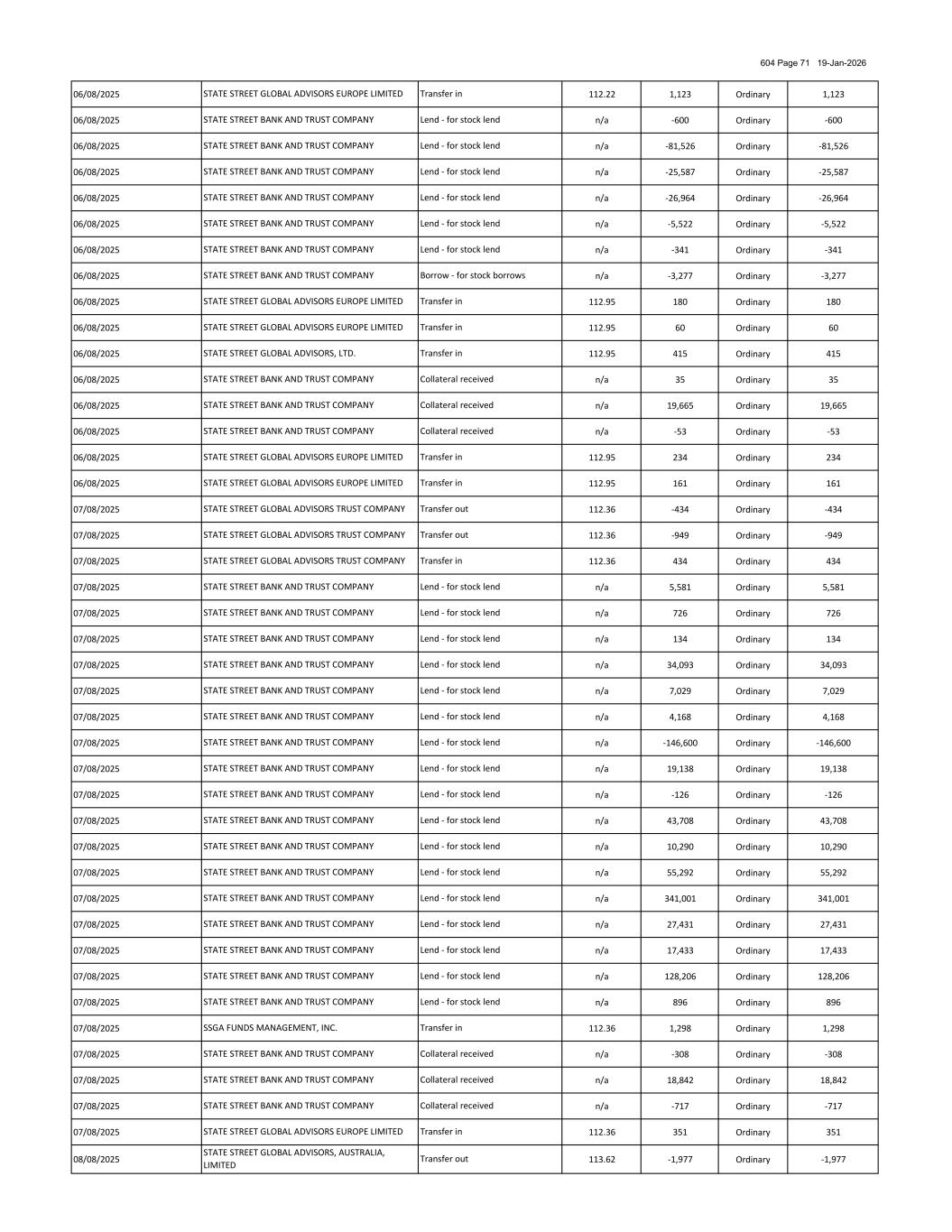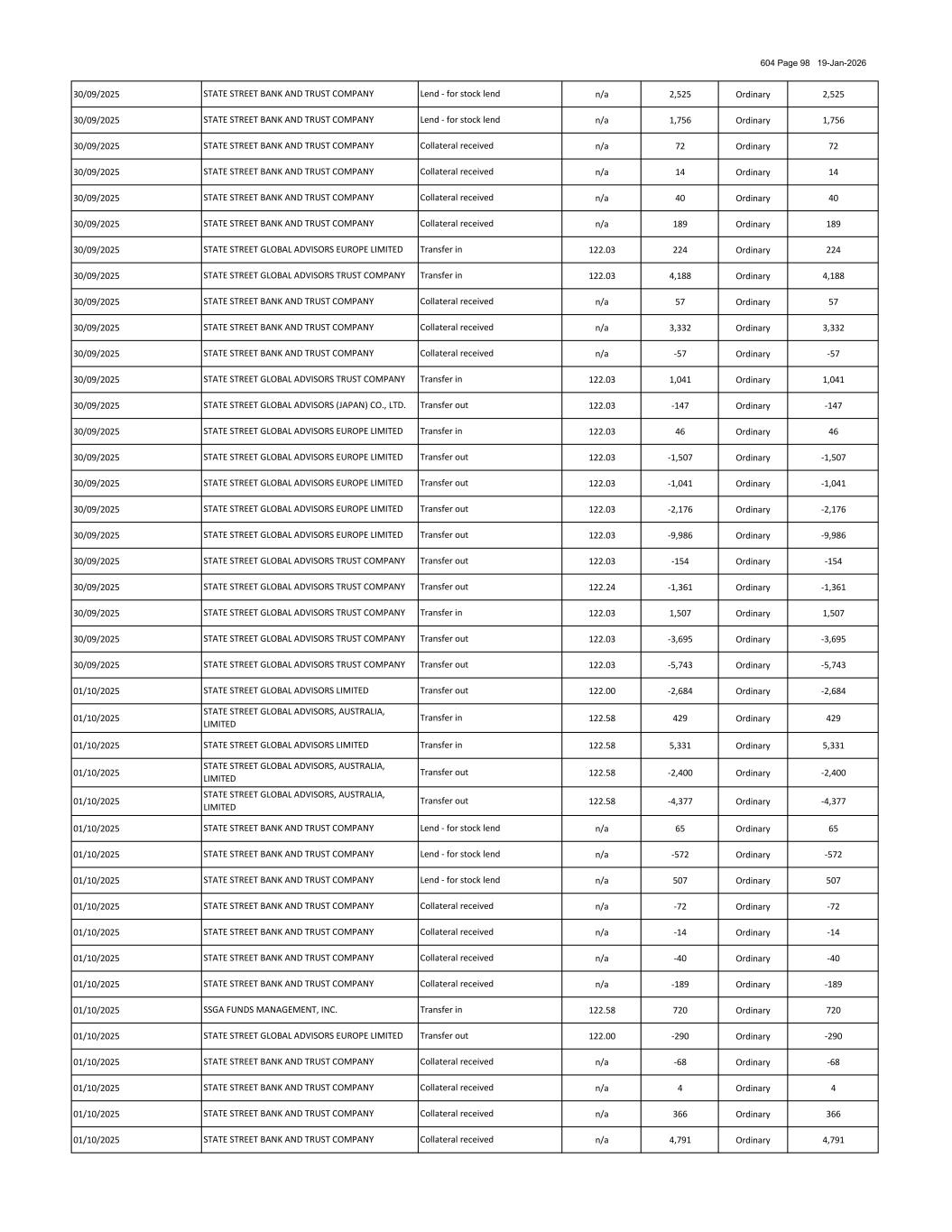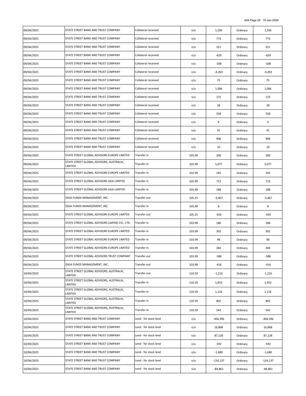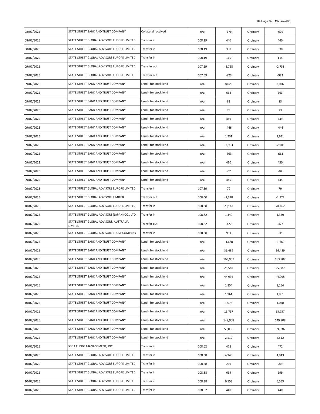 604 Page 103 19-Jan-2026 08/10/2025 n/a 40,277 Ordinary 40,277 08/10/2025 n/a -7,857 Ordinary -7,857 08/10/2025 n/a 7,238 Ordinary 7,238 08/10/2025 n/a -1,534 Ordinary -1,534 08/10/2025 n/a 1,534 Ordinary 1,534 08/10/2025 n/a -41,943 Ordinary -41,943 08/10/2025 n/a 41,943 Ordinary 41,943 08/10/2025 n/a -34,881 Ordinary -34,881 08/10/2025 n/a 34,881 Ordinary 34,881 08/10/2025 n/a -51,118 Ordinary -51,118 08/10/2025 n/a 51,118 Ordinary 51,118 08/10/2025 n/a -5,399 Ordinary -5,399 08/10/2025 n/a 4,711 Ordinary 4,711 08/10/2025 125.29 255 Ordinary 255 09/10/2025 127.27 -3,575 Ordinary -3,575 09/10/2025 127.27 -1,375 Ordinary -1,375 09/10/2025 n/a 19,681 Ordinary 19,681 09/10/2025 n/a -490 Ordinary -490 09/10/2025 n/a 21,891 Ordinary 21,891 09/10/2025 n/a 490 Ordinary 490 09/10/2025 126.38 288 Ordinary 288 09/10/2025 n/a -95 Ordinary -95 09/10/2025 n/a 211 Ordinary 211 09/10/2025 n/a -3,646 Ordinary -3,646 09/10/2025 127.27 161 Ordinary 161 09/10/2025 127.27 195 Ordinary 195 10/10/2025 125.15 -1,927 Ordinary -1,927 10/10/2025 125.15 -1,670 Ordinary -1,670 10/10/2025 125.15 -2,275 Ordinary -2,275 10/10/2025 125.15 -31,511 Ordinary -31,511 10/10/2025 125.15 2,275 Ordinary 2,275 10/10/2025 n/a -11,413 Ordinary -11,413 10/10/2025 n/a -7,169 Ordinary -7,169 10/10/2025 n/a 479 Ordinary 479 10/10/2025 n/a 382 Ordinary 382 10/10/2025 n/a 72,892 Ordinary 72,892 10/10/2025 n/a -3,137 Ordinary -3,137 10/10/2025 n/a -51,522 Ordinary -51,522 10/10/2025 n/a 1,550 Ordinary 1,550 10/10/2025 n/a 726 Ordinary 726 10/10/2025 n/a -24,478 Ordinary -24,478STATE STREET BANK AND TRUST COMPANY Lend - for stock lend Transfer in STATE STREET BANK AND TRUST COMPANY STATE STREET BANK AND TRUST COMPANY Collateral received STATE STREET GLOBAL ADVISORS LIMITED STATE STREET BANK AND TRUST COMPANY STATE STREET GLOBAL ADVISORS LIMITED Collateral received STATE STREET BANK AND TRUST COMPANY STATE STREET BANK AND TRUST COMPANY STATE STREET BANK AND TRUST COMPANY STATE STREET GLOBAL ADVISORS TRUST COMPANY Transfer in Collateral received Lend - for stock lend Lend - for stock lend STATE STREET BANK AND TRUST COMPANY Collateral received Collateral received Collateral received STATE STREET BANK AND TRUST COMPANY Collateral received Lend - for stock lend Collateral received STATE STREET BANK AND TRUST COMPANY STATE STREET BANK AND TRUST COMPANY STATE STREET GLOBAL ADVISORS EUROPE LIMITED STATE STREET BANK AND TRUST COMPANY Collateral received Collateral received STATE STREET BANK AND TRUST COMPANY STATE STREET BANK AND TRUST COMPANY STATE STREET BANK AND TRUST COMPANY Collateral received Lend - for stock lend STATE STREET BANK AND TRUST COMPANY STATE STREET BANK AND TRUST COMPANY STATE STREET BANK AND TRUST COMPANY Lend - for stock lend Transfer in Lend - for stock lend STATE STREET BANK AND TRUST COMPANY Collateral received STATE STREET BANK AND TRUST COMPANY Transfer in Transfer in Transfer out Lend - for stock lend Collateral received SSGA FUNDS MANAGEMENT, INC. STATE STREET BANK AND TRUST COMPANY Transfer out STATE STREET GLOBAL ADVISORS EUROPE LIMITED Collateral received Transfer out STATE STREET BANK AND TRUST COMPANY STATE STREET BANK AND TRUST COMPANY STATE STREET GLOBAL ADVISORS EUROPE LIMITED STATE STREET GLOBAL ADVISORS, AUSTRALIA, LIMITED STATE STREET GLOBAL ADVISORS (JAPAN) CO., LTD. STATE STREET BANK AND TRUST COMPANY Collateral received Lend - for stock lend STATE STREET BANK AND TRUST COMPANY STATE STREET BANK AND TRUST COMPANY STATE STREET GLOBAL ADVISORS, AUSTRALIA, LIMITED Lend - for stock lend Transfer out STATE STREET BANK AND TRUST COMPANY Lend - for stock lend STATE STREET BANK AND TRUST COMPANY Lend - for stock lend Transfer out Lend - for stock lend Transfer out Lend - for stock lend STATE STREET BANK AND TRUST COMPANY STATE STREET GLOBAL ADVISORS (JAPAN) CO., LTD. Collateral received STATE STREET BANK AND TRUST COMPANY