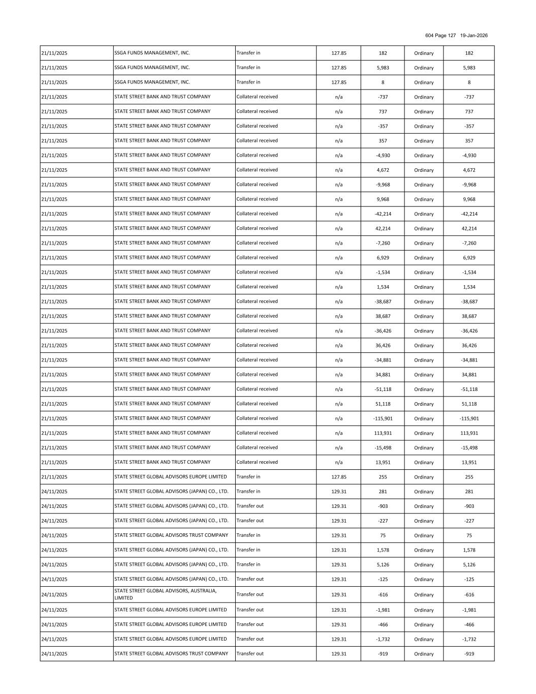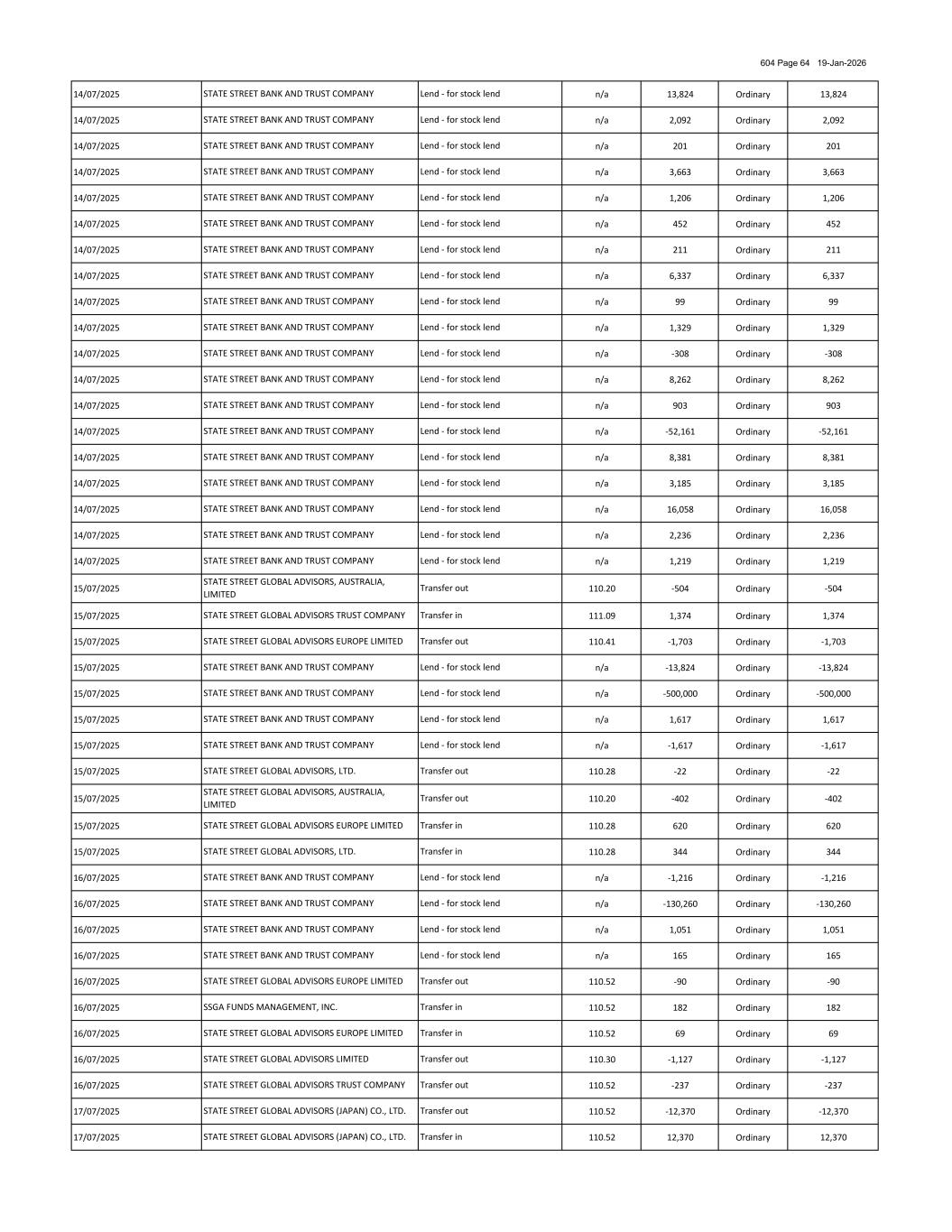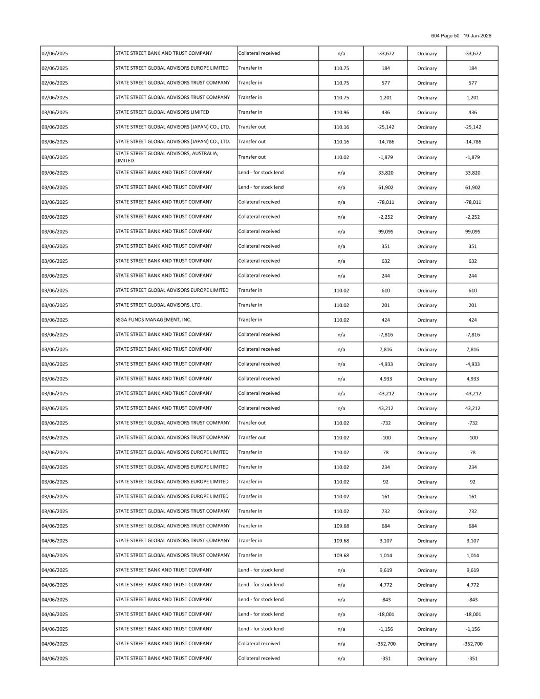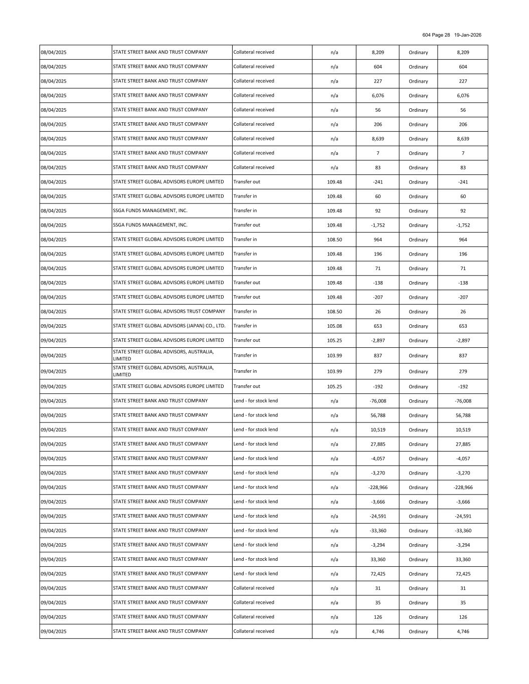604 Page 103 19-Jan-2026 08/10/2025 n/a 40,277 Ordinary 40,277 08/10/2025 n/a -7,857 Ordinary -7,857 08/10/2025 n/a 7,238 Ordinary 7,238 08/10/2025 n/a -1,534 Ordinary -1,534 08/10/2025 n/a 1,534 Ordinary 1,534 08/10/2025 n/a -41,943 Ordinary -41,943 08/10/2025 n/a 41,943 Ordinary 41,943 08/10/2025 n/a -34,881 Ordinary -34,881 08/10/2025 n/a 34,881 Ordinary 34,881 08/10/2025 n/a -51,118 Ordinary -51,118 08/10/2025 n/a 51,118 Ordinary 51,118 08/10/2025 n/a -5,399 Ordinary -5,399 08/10/2025 n/a 4,711 Ordinary 4,711 08/10/2025 125.29 255 Ordinary 255 09/10/2025 127.27 -3,575 Ordinary -3,575 09/10/2025 127.27 -1,375 Ordinary -1,375 09/10/2025 n/a 19,681 Ordinary 19,681 09/10/2025 n/a -490 Ordinary -490 09/10/2025 n/a 21,891 Ordinary 21,891 09/10/2025 n/a 490 Ordinary 490 09/10/2025 126.38 288 Ordinary 288 09/10/2025 n/a -95 Ordinary -95 09/10/2025 n/a 211 Ordinary 211 09/10/2025 n/a -3,646 Ordinary -3,646 09/10/2025 127.27 161 Ordinary 161 09/10/2025 127.27 195 Ordinary 195 10/10/2025 125.15 -1,927 Ordinary -1,927 10/10/2025 125.15 -1,670 Ordinary -1,670 10/10/2025 125.15 -2,275 Ordinary -2,275 10/10/2025 125.15 -31,511 Ordinary -31,511 10/10/2025 125.15 2,275 Ordinary 2,275 10/10/2025 n/a -11,413 Ordinary -11,413 10/10/2025 n/a -7,169 Ordinary -7,169 10/10/2025 n/a 479 Ordinary 479 10/10/2025 n/a 382 Ordinary 382 10/10/2025 n/a 72,892 Ordinary 72,892 10/10/2025 n/a -3,137 Ordinary -3,137 10/10/2025 n/a -51,522 Ordinary -51,522 10/10/2025 n/a 1,550 Ordinary 1,550 10/10/2025 n/a 726 Ordinary 726 10/10/2025 n/a -24,478 Ordinary -24,478STATE STREET BANK AND TRUST COMPANY Lend - for stock lend Transfer in STATE STREET BANK AND TRUST COMPANY STATE STREET BANK AND TRUST COMPANY Collateral received STATE STREET GLOBAL ADVISORS LIMITED STATE STREET BANK AND TRUST COMPANY STATE STREET GLOBAL ADVISORS LIMITED Collateral received STATE STREET BANK AND TRUST COMPANY STATE STREET BANK AND TRUST COMPANY STATE STREET BANK AND TRUST COMPANY STATE STREET GLOBAL ADVISORS TRUST COMPANY Transfer in Collateral received Lend - for stock lend Lend - for stock lend STATE STREET BANK AND TRUST COMPANY Collateral received Collateral received Collateral received STATE STREET BANK AND TRUST COMPANY Collateral received Lend - for stock lend Collateral received STATE STREET BANK AND TRUST COMPANY STATE STREET BANK AND TRUST COMPANY STATE STREET GLOBAL ADVISORS EUROPE LIMITED STATE STREET BANK AND TRUST COMPANY Collateral received Collateral received STATE STREET BANK AND TRUST COMPANY STATE STREET BANK AND TRUST COMPANY STATE STREET BANK AND TRUST COMPANY Collateral received Lend - for stock lend STATE STREET BANK AND TRUST COMPANY STATE STREET BANK AND TRUST COMPANY STATE STREET BANK AND TRUST COMPANY Lend - for stock lend Transfer in Lend - for stock lend STATE STREET BANK AND TRUST COMPANY Collateral received STATE STREET BANK AND TRUST COMPANY Transfer in Transfer in Transfer out Lend - for stock lend Collateral received SSGA FUNDS MANAGEMENT, INC. STATE STREET BANK AND TRUST COMPANY Transfer out STATE STREET GLOBAL ADVISORS EUROPE LIMITED Collateral received Transfer out STATE STREET BANK AND TRUST COMPANY STATE STREET BANK AND TRUST COMPANY STATE STREET GLOBAL ADVISORS EUROPE LIMITED STATE STREET GLOBAL ADVISORS, AUSTRALIA, LIMITED STATE STREET GLOBAL ADVISORS (JAPAN) CO., LTD. STATE STREET BANK AND TRUST COMPANY Collateral received Lend - for stock lend STATE STREET BANK AND TRUST COMPANY STATE STREET BANK AND TRUST COMPANY STATE STREET GLOBAL ADVISORS, AUSTRALIA, LIMITED Lend - for stock lend Transfer out STATE STREET BANK AND TRUST COMPANY Lend - for stock lend STATE STREET BANK AND TRUST COMPANY Lend - for stock lend Transfer out Lend - for stock lend Transfer out Lend - for stock lend STATE STREET BANK AND TRUST COMPANY STATE STREET GLOBAL ADVISORS (JAPAN) CO., LTD. Collateral received STATE STREET BANK AND TRUST COMPANY