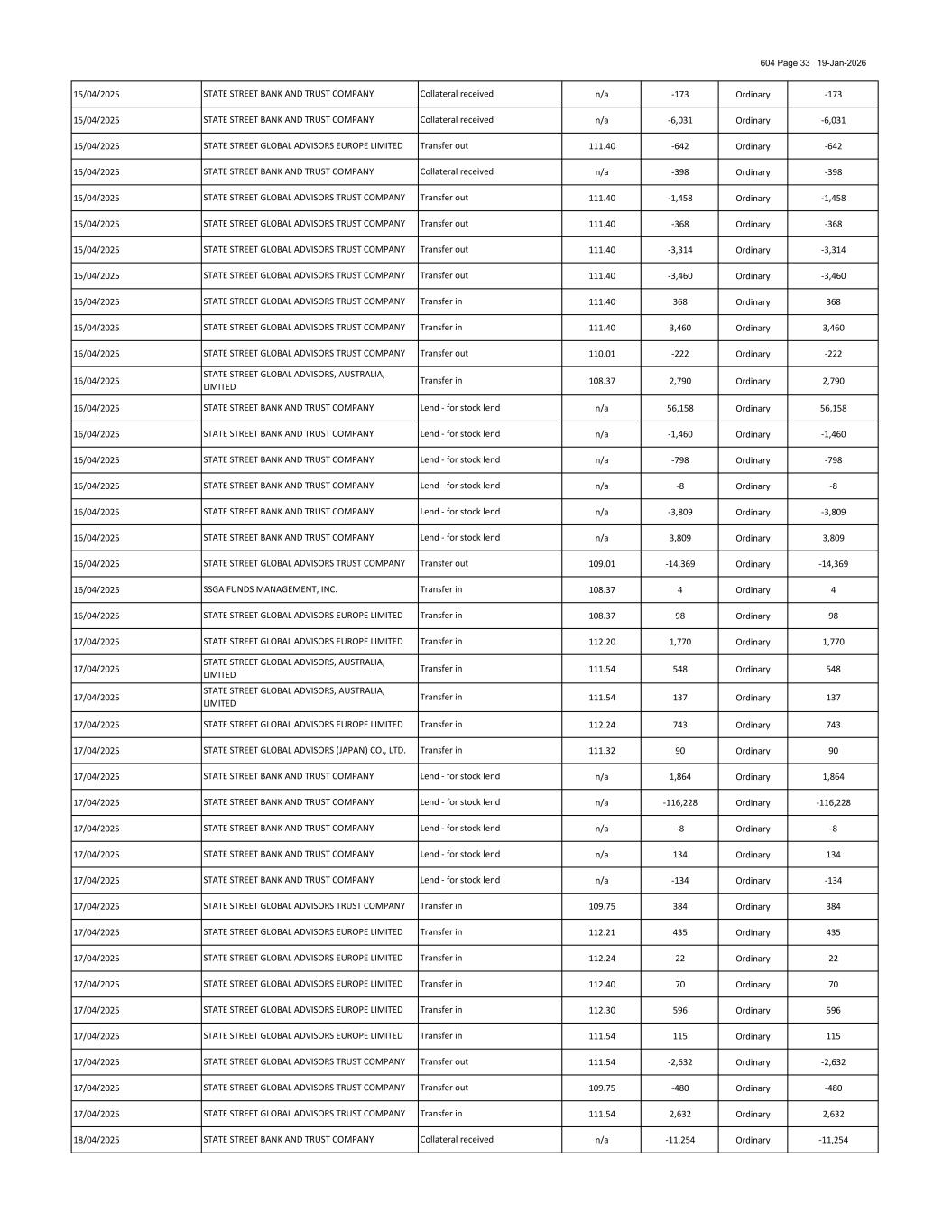 604 Page 32 19-Jan-2026 14/04/2025 n/a 32,505 Ordinary 32,505 14/04/2025 n/a 345,000 Ordinary 345,000 14/04/2025 n/a -197,230 Ordinary -197,230 14/04/2025 n/a -161,533 Ordinary -161,533 14/04/2025 n/a -4,877 Ordinary -4,877 14/04/2025 n/a 76,784 Ordinary 76,784 14/04/2025 n/a 480 Ordinary 480 14/04/2025 n/a -7,018 Ordinary -7,018 14/04/2025 n/a 990 Ordinary 990 14/04/2025 n/a -39,828 Ordinary -39,828 14/04/2025 n/a 39,828 Ordinary 39,828 14/04/2025 n/a -400 Ordinary -400 14/04/2025 n/a -244 Ordinary -244 14/04/2025 n/a -124,936 Ordinary -124,936 14/04/2025 n/a -1,229 Ordinary -1,229 14/04/2025 n/a -11,259 Ordinary -11,259 14/04/2025 n/a 2 Ordinary 2 14/04/2025 n/a -2,121 Ordinary -2,121 14/04/2025 n/a -72,515 Ordinary -72,515 14/04/2025 110.85 -3,064 Ordinary -3,064 14/04/2025 110.85 -3,372 Ordinary -3,372 14/04/2025 110.91 -2,861 Ordinary -2,861 14/04/2025 110.85 213 Ordinary 213 14/04/2025 110.85 71 Ordinary 71 14/04/2025 110.85 69 Ordinary 69 14/04/2025 110.85 138 Ordinary 138 14/04/2025 110.85 253 Ordinary 253 14/04/2025 110.85 201,895 Ordinary 201,895 14/04/2025 110.85 -1,015 Ordinary -1,015 14/04/2025 110.85 3,064 Ordinary 3,064 14/04/2025 110.85 1,015 Ordinary 1,015 15/04/2025 111.40 2,247 Ordinary 2,247 15/04/2025 111.40 -129 Ordinary -129 15/04/2025 111.40 1,458 Ordinary 1,458 15/04/2025 n/a -392,729 Ordinary -392,729 15/04/2025 n/a -10 Ordinary -10 15/04/2025 n/a 384 Ordinary 384 15/04/2025 n/a 27,642 Ordinary 27,642 15/04/2025 n/a -6,785 Ordinary -6,785 15/04/2025 n/a -902 Ordinary -902 15/04/2025 n/a -2 Ordinary -2 Collateral received Transfer out Collateral received STATE STREET BANK AND TRUST COMPANY Lend - for stock lend STATE STREET GLOBAL ADVISORS, AUSTRALIA, LIMITED STATE STREET BANK AND TRUST COMPANY STATE STREET BANK AND TRUST COMPANY Collateral received Transfer in STATE STREET GLOBAL ADVISORS EUROPE LIMITED STATE STREET BANK AND TRUST COMPANY STATE STREET BANK AND TRUST COMPANY Lend - for stock lend Transfer in Collateral received STATE STREET BANK AND TRUST COMPANY Lend - for stock lend STATE STREET GLOBAL ADVISORS EUROPE LIMITED STATE STREET BANK AND TRUST COMPANY STATE STREET BANK AND TRUST COMPANY STATE STREET BANK AND TRUST COMPANY STATE STREET BANK AND TRUST COMPANY Transfer in Transfer out Lend - for stock lend STATE STREET GLOBAL ADVISORS TRUST COMPANY STATE STREET GLOBAL ADVISORS EUROPE LIMITED STATE STREET BANK AND TRUST COMPANY Collateral received STATE STREET BANK AND TRUST COMPANY Lend - for stock lend STATE STREET GLOBAL ADVISORS TRUST COMPANY STATE STREET BANK AND TRUST COMPANY STATE STREET BANK AND TRUST COMPANY Transfer in Lend - for stock lend STATE STREET BANK AND TRUST COMPANY Transfer out STATE STREET GLOBAL ADVISORS TRUST COMPANY Collateral received STATE STREET GLOBAL ADVISORS (JAPAN) CO., LTD. Lend - for stock lend STATE STREET GLOBAL ADVISORS, AUSTRALIA, LIMITED STATE STREET BANK AND TRUST COMPANY Lend - for stock lend Transfer in Collateral received STATE STREET GLOBAL ADVISORS TRUST COMPANY Lend - for stock lend STATE STREET GLOBAL ADVISORS EUROPE LIMITED STATE STREET BANK AND TRUST COMPANY Transfer out Transfer out Lend - for stock lend STATE STREET GLOBAL ADVISORS TRUST COMPANY STATE STREET GLOBAL ADVISORS EUROPE LIMITED STATE STREET BANK AND TRUST COMPANY Transfer in Transfer in Lend - for stock lend Transfer in Collateral received STATE STREET BANK AND TRUST COMPANY Lend - for stock lend STATE STREET GLOBAL ADVISORS EUROPE LIMITED STATE STREET BANK AND TRUST COMPANY STATE STREET BANK AND TRUST COMPANY Lend - for stock lend Transfer in STATE STREET BANK AND TRUST COMPANY Collateral received Lend - for stock lend STATE STREET BANK AND TRUST COMPANY Lend - for stock lend Transfer in Collateral received STATE STREET BANK AND TRUST COMPANY Lend - for stock lend STATE STREET GLOBAL ADVISORS EUROPE LIMITED STATE STREET BANK AND TRUST COMPANY STATE STREET BANK AND TRUST COMPANY
