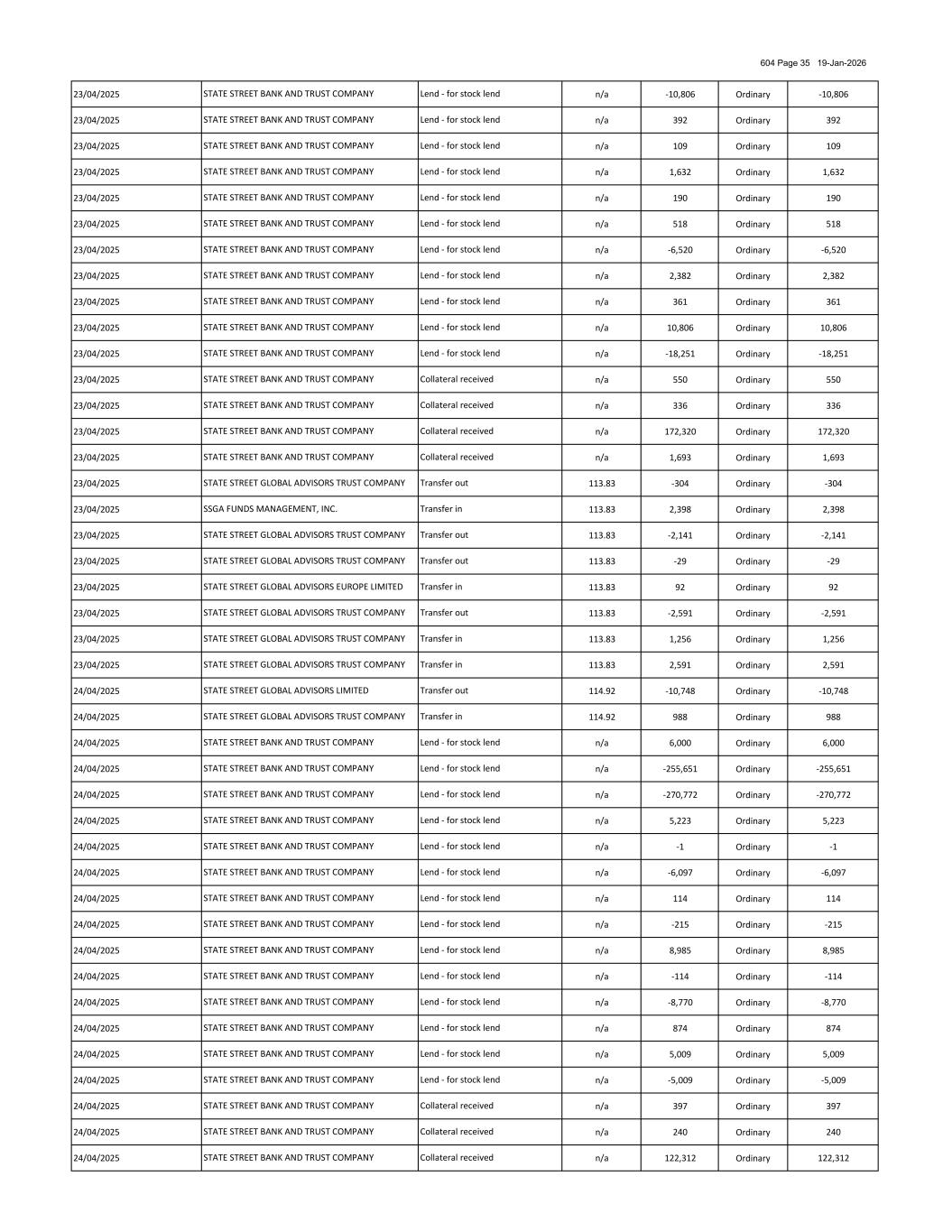 604 Page 35 19-Jan-2026 23/04/2025 n/a -10,806 Ordinary -10,806 23/04/2025 n/a 392 Ordinary 392 23/04/2025 n/a 109 Ordinary 109 23/04/2025 n/a 1,632 Ordinary 1,632 23/04/2025 n/a 190 Ordinary 190 23/04/2025 n/a 518 Ordinary 518 23/04/2025 n/a -6,520 Ordinary -6,520 23/04/2025 n/a 2,382 Ordinary 2,382 23/04/2025 n/a 361 Ordinary 361 23/04/2025 n/a 10,806 Ordinary 10,806 23/04/2025 n/a -18,251 Ordinary -18,251 23/04/2025 n/a 550 Ordinary 550 23/04/2025 n/a 336 Ordinary 336 23/04/2025 n/a 172,320 Ordinary 172,320 23/04/2025 n/a 1,693 Ordinary 1,693 23/04/2025 113.83 -304 Ordinary -304 23/04/2025 113.83 2,398 Ordinary 2,398 23/04/2025 113.83 -2,141 Ordinary -2,141 23/04/2025 113.83 -29 Ordinary -29 23/04/2025 113.83 92 Ordinary 92 23/04/2025 113.83 -2,591 Ordinary -2,591 23/04/2025 113.83 1,256 Ordinary 1,256 23/04/2025 113.83 2,591 Ordinary 2,591 24/04/2025 114.92 -10,748 Ordinary -10,748 24/04/2025 114.92 988 Ordinary 988 24/04/2025 n/a 6,000 Ordinary 6,000 24/04/2025 n/a -255,651 Ordinary -255,651 24/04/2025 n/a -270,772 Ordinary -270,772 24/04/2025 n/a 5,223 Ordinary 5,223 24/04/2025 n/a -1 Ordinary -1 24/04/2025 n/a -6,097 Ordinary -6,097 24/04/2025 n/a 114 Ordinary 114 24/04/2025 n/a -215 Ordinary -215 24/04/2025 n/a 8,985 Ordinary 8,985 24/04/2025 n/a -114 Ordinary -114 24/04/2025 n/a -8,770 Ordinary -8,770 24/04/2025 n/a 874 Ordinary 874 24/04/2025 n/a 5,009 Ordinary 5,009 24/04/2025 n/a -5,009 Ordinary -5,009 24/04/2025 n/a 397 Ordinary 397 24/04/2025 n/a 240 Ordinary 240 24/04/2025 n/a 122,312 Ordinary 122,312 Lend - for stock lend Transfer in STATE STREET BANK AND TRUST COMPANY Lend - for stock lend STATE STREET BANK AND TRUST COMPANY STATE STREET GLOBAL ADVISORS TRUST COMPANY STATE STREET BANK AND TRUST COMPANY Lend - for stock lend Collateral received Transfer out STATE STREET BANK AND TRUST COMPANY Lend - for stock lend STATE STREET BANK AND TRUST COMPANY Lend - for stock lend Lend - for stock lend Transfer out STATE STREET BANK AND TRUST COMPANY STATE STREET BANK AND TRUST COMPANY Lend - for stock lend STATE STREET BANK AND TRUST COMPANY STATE STREET BANK AND TRUST COMPANY Lend - for stock lend Collateral received Lend - for stock lend Transfer in STATE STREET BANK AND TRUST COMPANY Lend - for stock lend STATE STREET BANK AND TRUST COMPANY STATE STREET GLOBAL ADVISORS TRUST COMPANY STATE STREET BANK AND TRUST COMPANY Lend - for stock lend Transfer out SSGA FUNDS MANAGEMENT, INC. STATE STREET BANK AND TRUST COMPANY Collateral received Lend - for stock lend Transfer out STATE STREET BANK AND TRUST COMPANY Lend - for stock lend STATE STREET BANK AND TRUST COMPANY STATE STREET GLOBAL ADVISORS TRUST COMPANY STATE STREET BANK AND TRUST COMPANY Lend - for stock lend Transfer in Collateral received STATE STREET BANK AND TRUST COMPANY Lend - for stock lend STATE STREET BANK AND TRUST COMPANY STATE STREET GLOBAL ADVISORS TRUST COMPANY STATE STREET BANK AND TRUST COMPANY Lend - for stock lend STATE STREET BANK AND TRUST COMPANY STATE STREET GLOBAL ADVISORS EUROPE LIMITED STATE STREET BANK AND TRUST COMPANY Lend - for stock lend Transfer in Lend - for stock lend STATE STREET BANK AND TRUST COMPANY STATE STREET GLOBAL ADVISORS TRUST COMPANY STATE STREET BANK AND TRUST COMPANY Lend - for stock lend STATE STREET GLOBAL ADVISORS LIMITED STATE STREET BANK AND TRUST COMPANY STATE STREET BANK AND TRUST COMPANY Lend - for stock lend Lend - for stock lend Collateral received STATE STREET BANK AND TRUST COMPANY Lend - for stock lend STATE STREET BANK AND TRUST COMPANY STATE STREET BANK AND TRUST COMPANY Lend - for stock lend Transfer out Collateral received STATE STREET BANK AND TRUST COMPANY Lend - for stock lend STATE STREET GLOBAL ADVISORS TRUST COMPANY STATE STREET GLOBAL ADVISORS TRUST COMPANY STATE STREET BANK AND TRUST COMPANY STATE STREET BANK AND TRUST COMPANY Lend - for stock lend Transfer in Collateral received STATE STREET BANK AND TRUST COMPANY