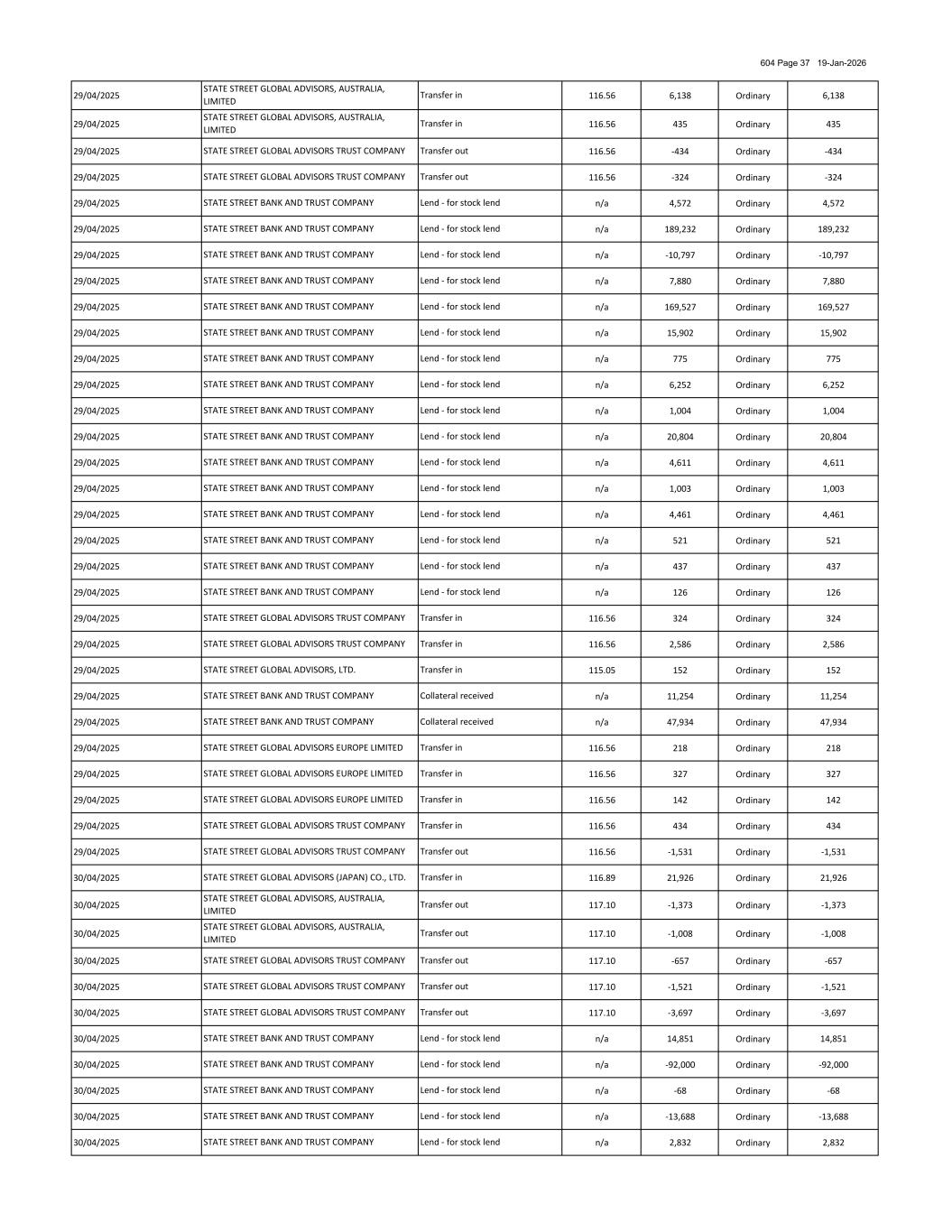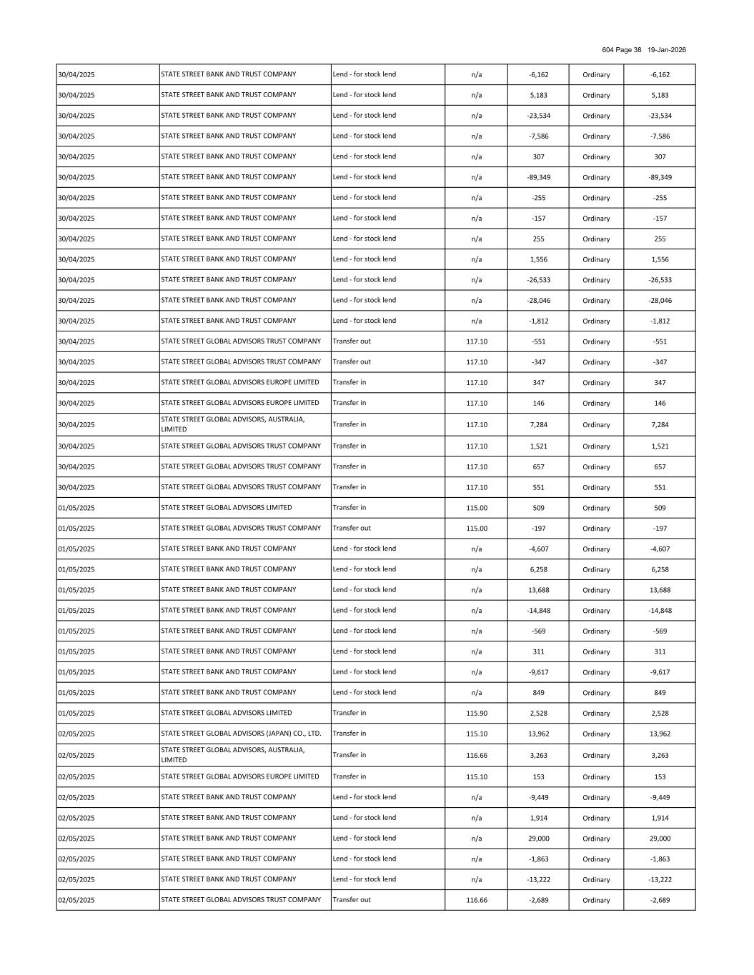 604 Page 38 19-Jan-2026 30/04/2025 n/a -6,162 Ordinary -6,162 30/04/2025 n/a 5,183 Ordinary 5,183 30/04/2025 n/a -23,534 Ordinary -23,534 30/04/2025 n/a -7,586 Ordinary -7,586 30/04/2025 n/a 307 Ordinary 307 30/04/2025 n/a -89,349 Ordinary -89,349 30/04/2025 n/a -255 Ordinary -255 30/04/2025 n/a -157 Ordinary -157 30/04/2025 n/a 255 Ordinary 255 30/04/2025 n/a 1,556 Ordinary 1,556 30/04/2025 n/a -26,533 Ordinary -26,533 30/04/2025 n/a -28,046 Ordinary -28,046 30/04/2025 n/a -1,812 Ordinary -1,812 30/04/2025 117.10 -551 Ordinary -551 30/04/2025 117.10 -347 Ordinary -347 30/04/2025 117.10 347 Ordinary 347 30/04/2025 117.10 146 Ordinary 146 30/04/2025 117.10 7,284 Ordinary 7,284 30/04/2025 117.10 1,521 Ordinary 1,521 30/04/2025 117.10 657 Ordinary 657 30/04/2025 117.10 551 Ordinary 551 01/05/2025 115.00 509 Ordinary 509 01/05/2025 115.00 -197 Ordinary -197 01/05/2025 n/a -4,607 Ordinary -4,607 01/05/2025 n/a 6,258 Ordinary 6,258 01/05/2025 n/a 13,688 Ordinary 13,688 01/05/2025 n/a -14,848 Ordinary -14,848 01/05/2025 n/a -569 Ordinary -569 01/05/2025 n/a 311 Ordinary 311 01/05/2025 n/a -9,617 Ordinary -9,617 01/05/2025 n/a 849 Ordinary 849 01/05/2025 115.90 2,528 Ordinary 2,528 02/05/2025 115.10 13,962 Ordinary 13,962 02/05/2025 116.66 3,263 Ordinary 3,263 02/05/2025 115.10 153 Ordinary 153 02/05/2025 n/a -9,449 Ordinary -9,449 02/05/2025 n/a 1,914 Ordinary 1,914 02/05/2025 n/a 29,000 Ordinary 29,000 02/05/2025 n/a -1,863 Ordinary -1,863 02/05/2025 n/a -13,222 Ordinary -13,222 02/05/2025 116.66 -2,689 Ordinary -2,689 STATE STREET BANK AND TRUST COMPANY Lend - for stock lend STATE STREET BANK AND TRUST COMPANY Transfer out Lend - for stock lend Lend - for stock lend STATE STREET BANK AND TRUST COMPANY STATE STREET BANK AND TRUST COMPANY STATE STREET BANK AND TRUST COMPANY Lend - for stock lend STATE STREET GLOBAL ADVISORS EUROPE LIMITED Transfer out Lend - for stock lend STATE STREET BANK AND TRUST COMPANY STATE STREET GLOBAL ADVISORS TRUST COMPANY STATE STREET BANK AND TRUST COMPANY Lend - for stock lend STATE STREET BANK AND TRUST COMPANY Transfer in Lend - for stock lend Lend - for stock lend STATE STREET BANK AND TRUST COMPANY STATE STREET GLOBAL ADVISORS TRUST COMPANY Transfer in Lend - for stock lend Lend - for stock lend STATE STREET BANK AND TRUST COMPANY Lend - for stock lend STATE STREET GLOBAL ADVISORS EUROPE LIMITED STATE STREET BANK AND TRUST COMPANY STATE STREET BANK AND TRUST COMPANY Lend - for stock lend Transfer in Lend - for stock lend STATE STREET GLOBAL ADVISORS, AUSTRALIA, LIMITED STATE STREET BANK AND TRUST COMPANY Lend - for stock lend STATE STREET BANK AND TRUST COMPANY Transfer in Lend - for stock lend Transfer out STATE STREET BANK AND TRUST COMPANY STATE STREET BANK AND TRUST COMPANY Lend - for stock lend STATE STREET GLOBAL ADVISORS EUROPE LIMITED Lend - for stock lend STATE STREET BANK AND TRUST COMPANY STATE STREET BANK AND TRUST COMPANY STATE STREET GLOBAL ADVISORS TRUST COMPANY STATE STREET BANK AND TRUST COMPANY STATE STREET GLOBAL ADVISORS TRUST COMPANY Transfer in Lend - for stock lend STATE STREET BANK AND TRUST COMPANY Lend - for stock lend Transfer in Transfer in STATE STREET BANK AND TRUST COMPANY STATE STREET GLOBAL ADVISORS TRUST COMPANY STATE STREET BANK AND TRUST COMPANY Lend - for stock lend Transfer in Transfer in STATE STREET GLOBAL ADVISORS LIMITED STATE STREET BANK AND TRUST COMPANY Lend - for stock lend STATE STREET GLOBAL ADVISORS (JAPAN) CO., LTD. Lend - for stock lend Transfer out Transfer in STATE STREET BANK AND TRUST COMPANY STATE STREET GLOBAL ADVISORS TRUST COMPANY STATE STREET GLOBAL ADVISORS LIMITED Lend - for stock lend STATE STREET BANK AND TRUST COMPANY STATE STREET BANK AND TRUST COMPANY STATE STREET GLOBAL ADVISORS TRUST COMPANY Lend - for stock lend STATE STREET GLOBAL ADVISORS, AUSTRALIA, LIMITED Lend - for stock lend Lend - for stock lend Transfer in