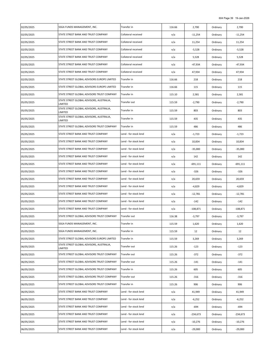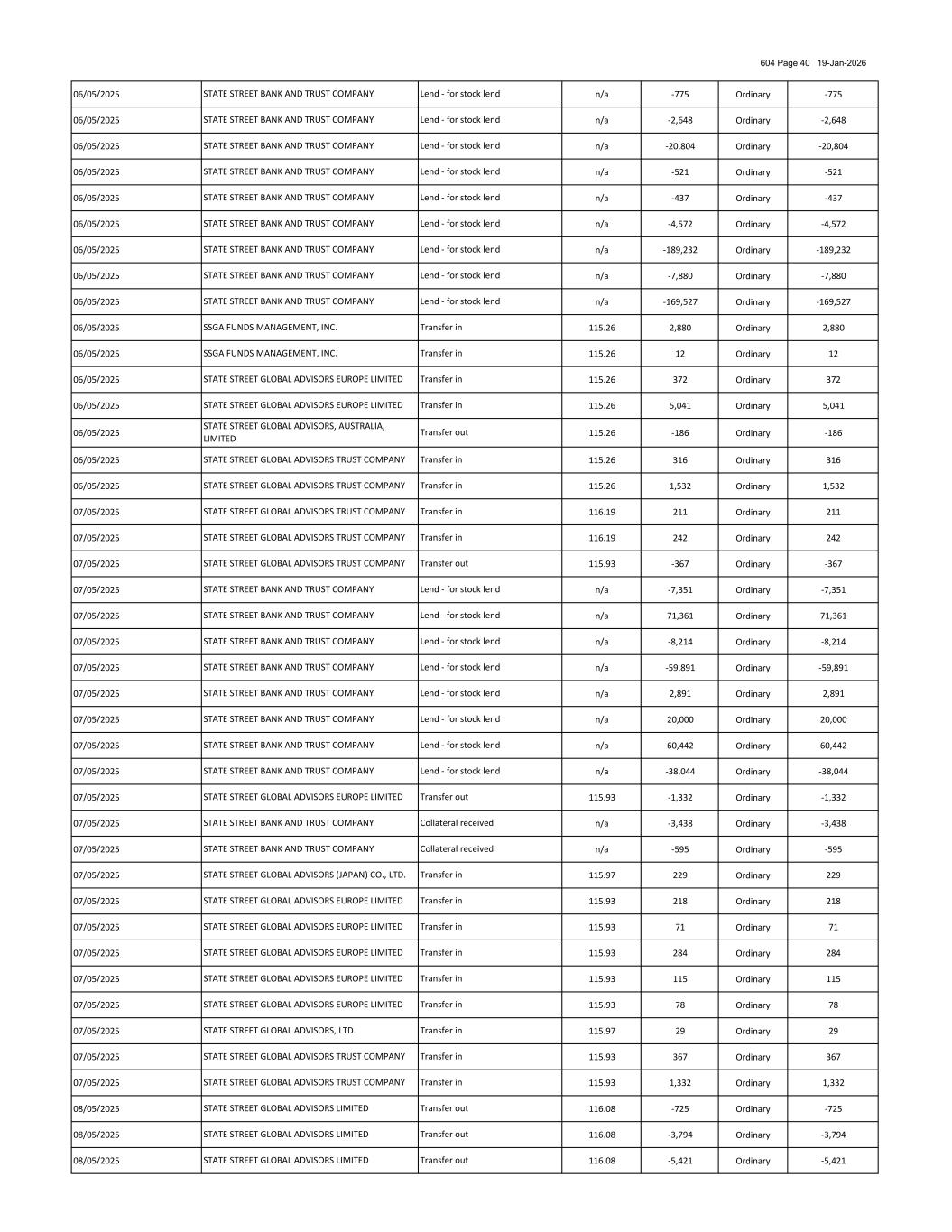 604 Page 40 19-Jan-2026 06/05/2025 n/a -775 Ordinary -775 06/05/2025 n/a -2,648 Ordinary -2,648 06/05/2025 n/a -20,804 Ordinary -20,804 06/05/2025 n/a -521 Ordinary -521 06/05/2025 n/a -437 Ordinary -437 06/05/2025 n/a -4,572 Ordinary -4,572 06/05/2025 n/a -189,232 Ordinary -189,232 06/05/2025 n/a -7,880 Ordinary -7,880 06/05/2025 n/a -169,527 Ordinary -169,527 06/05/2025 115.26 2,880 Ordinary 2,880 06/05/2025 115.26 12 Ordinary 12 06/05/2025 115.26 372 Ordinary 372 06/05/2025 115.26 5,041 Ordinary 5,041 06/05/2025 115.26 -186 Ordinary -186 06/05/2025 115.26 316 Ordinary 316 06/05/2025 115.26 1,532 Ordinary 1,532 07/05/2025 116.19 211 Ordinary 211 07/05/2025 116.19 242 Ordinary 242 07/05/2025 115.93 -367 Ordinary -367 07/05/2025 n/a -7,351 Ordinary -7,351 07/05/2025 n/a 71,361 Ordinary 71,361 07/05/2025 n/a -8,214 Ordinary -8,214 07/05/2025 n/a -59,891 Ordinary -59,891 07/05/2025 n/a 2,891 Ordinary 2,891 07/05/2025 n/a 20,000 Ordinary 20,000 07/05/2025 n/a 60,442 Ordinary 60,442 07/05/2025 n/a -38,044 Ordinary -38,044 07/05/2025 115.93 -1,332 Ordinary -1,332 07/05/2025 n/a -3,438 Ordinary -3,438 07/05/2025 n/a -595 Ordinary -595 07/05/2025 115.97 229 Ordinary 229 07/05/2025 115.93 218 Ordinary 218 07/05/2025 115.93 71 Ordinary 71 07/05/2025 115.93 284 Ordinary 284 07/05/2025 115.93 115 Ordinary 115 07/05/2025 115.93 78 Ordinary 78 07/05/2025 115.97 29 Ordinary 29 07/05/2025 115.93 367 Ordinary 367 07/05/2025 115.93 1,332 Ordinary 1,332 08/05/2025 116.08 -725 Ordinary -725 08/05/2025 116.08 -3,794 Ordinary -3,794 08/05/2025 116.08 -5,421 Ordinary -5,421 STATE STREET GLOBAL ADVISORS EUROPE LIMITED Transfer in Lend - for stock lend Transfer in STATE STREET BANK AND TRUST COMPANY STATE STREET GLOBAL ADVISORS (JAPAN) CO., LTD. STATE STREET BANK AND TRUST COMPANY STATE STREET GLOBAL ADVISORS LIMITED Transfer in Lend - for stock lend Transfer in SSGA FUNDS MANAGEMENT, INC. STATE STREET BANK AND TRUST COMPANY Lend - for stock lend STATE STREET GLOBAL ADVISORS EUROPE LIMITED Transfer in Transfer in Lend - for stock lend SSGA FUNDS MANAGEMENT, INC. STATE STREET BANK AND TRUST COMPANY Transfer in STATE STREET BANK AND TRUST COMPANY STATE STREET GLOBAL ADVISORS EUROPE LIMITED STATE STREET BANK AND TRUST COMPANY Lend - for stock lend Lend - for stock lend STATE STREET GLOBAL ADVISORS EUROPE LIMITED Transfer in Transfer in Lend - for stock lend STATE STREET BANK AND TRUST COMPANY Lend - for stock lend STATE STREET GLOBAL ADVISORS EUROPE LIMITED Transfer in Transfer in STATE STREET BANK AND TRUST COMPANY STATE STREET GLOBAL ADVISORS EUROPE LIMITED STATE STREET BANK AND TRUST COMPANY STATE STREET GLOBAL ADVISORS EUROPE LIMITED Lend - for stock lend Transfer out Lend - for stock lend STATE STREET BANK AND TRUST COMPANY STATE STREET GLOBAL ADVISORS TRUST COMPANY STATE STREET BANK AND TRUST COMPANY Lend - for stock lend STATE STREET GLOBAL ADVISORS, LTD. Transfer in Lend - for stock lend Transfer in STATE STREET BANK AND TRUST COMPANY STATE STREET GLOBAL ADVISORS, AUSTRALIA, LIMITED Transfer in Collateral received Transfer out STATE STREET BANK AND TRUST COMPANY STATE STREET GLOBAL ADVISORS TRUST COMPANY STATE STREET BANK AND TRUST COMPANY Lend - for stock lend STATE STREET GLOBAL ADVISORS TRUST COMPANY Transfer in Transfer in Transfer out STATE STREET GLOBAL ADVISORS TRUST COMPANY STATE STREET BANK AND TRUST COMPANY Lend - for stock lend STATE STREET GLOBAL ADVISORS LIMITED Transfer out Collateral received Transfer out STATE STREET BANK AND TRUST COMPANY STATE STREET GLOBAL ADVISORS TRUST COMPANY STATE STREET GLOBAL ADVISORS EUROPE LIMITED Lend - for stock lend STATE STREET GLOBAL ADVISORS TRUST COMPANY STATE STREET BANK AND TRUST COMPANY STATE STREET GLOBAL ADVISORS TRUST COMPANY STATE STREET BANK AND TRUST COMPANY Lend - for stock lend STATE STREET GLOBAL ADVISORS LIMITED Lend - for stock lend Transfer in Transfer out STATE STREET BANK AND TRUST COMPANY