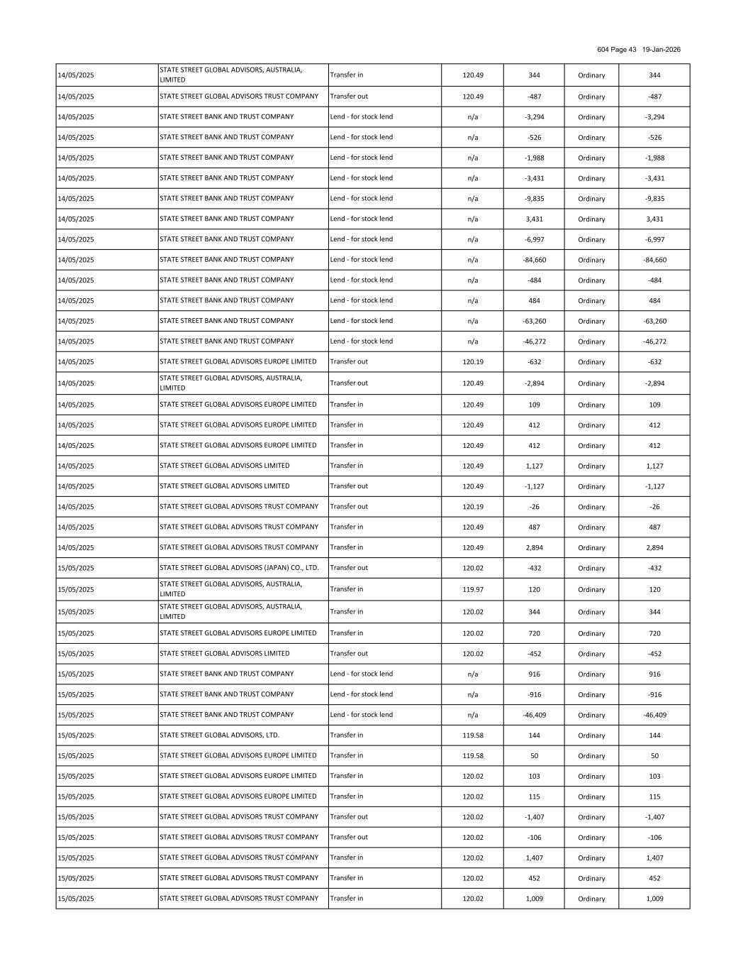 604 Page 42 19-Jan-2026 12/05/2025 n/a 18,000 Ordinary 18,000 12/05/2025 n/a 64,865 Ordinary 64,865 12/05/2025 n/a 8,108 Ordinary 8,108 12/05/2025 n/a -49,971 Ordinary -49,971 12/05/2025 n/a -6,997 Ordinary -6,997 12/05/2025 n/a 57,977 Ordinary 57,977 12/05/2025 n/a 5,607 Ordinary 5,607 12/05/2025 n/a 10,276 Ordinary 10,276 12/05/2025 n/a 74 Ordinary 74 12/05/2025 n/a -3,605 Ordinary -3,605 12/05/2025 n/a -5,607 Ordinary -5,607 12/05/2025 115.60 340 Ordinary 340 12/05/2025 117.35 -2,409 Ordinary -2,409 12/05/2025 117.35 -510 Ordinary -510 12/05/2025 117.35 -510 Ordinary -510 12/05/2025 115.64 -638 Ordinary -638 12/05/2025 117.35 327 Ordinary 327 12/05/2025 117.35 138 Ordinary 138 12/05/2025 117.43 -15,322 Ordinary -15,322 12/05/2025 117.43 -1,445 Ordinary -1,445 13/05/2025 119.85 -249 Ordinary -249 13/05/2025 119.85 -299 Ordinary -299 13/05/2025 119.85 -343 Ordinary -343 13/05/2025 119.85 952 Ordinary 952 13/05/2025 n/a 15,000 Ordinary 15,000 13/05/2025 n/a 92,114 Ordinary 92,114 13/05/2025 n/a -9,199 Ordinary -9,199 13/05/2025 n/a -844 Ordinary -844 13/05/2025 n/a -343 Ordinary -343 13/05/2025 n/a 343 Ordinary 343 13/05/2025 n/a -167 Ordinary -167 13/05/2025 n/a -485 Ordinary -485 13/05/2025 n/a 1,496 Ordinary 1,496 13/05/2025 119.85 -27,929 Ordinary -27,929 13/05/2025 119.85 -3,554 Ordinary -3,554 13/05/2025 119.85 -952 Ordinary -952 13/05/2025 119.85 71 Ordinary 71 13/05/2025 119.85 115 Ordinary 115 13/05/2025 119.30 -598 Ordinary -598 13/05/2025 119.85 3,554 Ordinary 3,554 14/05/2025 120.49 13,943 Ordinary 13,943 STATE STREET GLOBAL ADVISORS EUROPE LIMITED Transfer out Lend - for stock lend STATE STREET GLOBAL ADVISORS EUROPE LIMITED Transfer in STATE STREET BANK AND TRUST COMPANY SSGA FUNDS MANAGEMENT, INC. STATE STREET BANK AND TRUST COMPANY Lend - for stock lend STATE STREET GLOBAL ADVISORS, AUSTRALIA, LIMITED Transfer out Lend - for stock lend STATE STREET BANK AND TRUST COMPANY Transfer in STATE STREET BANK AND TRUST COMPANY Lend - for stock lend STATE STREET GLOBAL ADVISORS EUROPE LIMITED Transfer in Lend - for stock lend Transfer out STATE STREET BANK AND TRUST COMPANY SSGA FUNDS MANAGEMENT, INC. STATE STREET BANK AND TRUST COMPANY Lend - for stock lend Transfer in STATE STREET BANK AND TRUST COMPANY STATE STREET GLOBAL ADVISORS EUROPE LIMITED STATE STREET BANK AND TRUST COMPANY Lend - for stock lend Lend - for stock lend STATE STREET GLOBAL ADVISORS TRUST COMPANY Transfer in Lend - for stock lend Transfer in STATE STREET BANK AND TRUST COMPANY Lend - for stock lend STATE STREET GLOBAL ADVISORS, AUSTRALIA, LIMITED Transfer out STATE STREET BANK AND TRUST COMPANY STATE STREET GLOBAL ADVISORS EUROPE LIMITED STATE STREET GLOBAL ADVISORS TRUST COMPANY STATE STREET BANK AND TRUST COMPANY Lend - for stock lend Transfer out Lend - for stock lend SSGA FUNDS MANAGEMENT, INC. STATE STREET BANK AND TRUST COMPANY STATE STREET BANK AND TRUST COMPANY Lend - for stock lend Transfer out Lend - for stock lend STATE STREET GLOBAL ADVISORS, AUSTRALIA, LIMITED Transfer out STATE STREET BANK AND TRUST COMPANY Transfer out STATE STREET BANK AND TRUST COMPANY STATE STREET GLOBAL ADVISORS TRUST COMPANY STATE STREET BANK AND TRUST COMPANY Lend - for stock lend Transfer out Lend - for stock lend STATE STREET GLOBAL ADVISORS, AUSTRALIA, LIMITED STATE STREET GLOBAL ADVISORS, AUSTRALIA, LIMITED Lend - for stock lend Transfer out Transfer in Transfer out STATE STREET BANK AND TRUST COMPANY STATE STREET GLOBAL ADVISORS (JAPAN) CO., LTD. Lend - for stock lend STATE STREET BANK AND TRUST COMPANY Transfer in SSGA FUNDS MANAGEMENT, INC. STATE STREET BANK AND TRUST COMPANY STATE STREET GLOBAL ADVISORS TRUST COMPANY Lend - for stock lend STATE STREET GLOBAL ADVISORS, AUSTRALIA, LIMITED Transfer out Lend - for stock lend Transfer out STATE STREET BANK AND TRUST COMPANY STATE STREET GLOBAL ADVISORS TRUST COMPANY