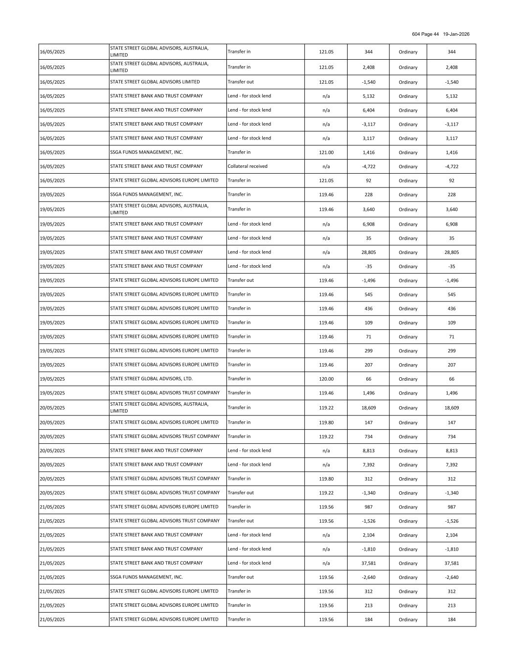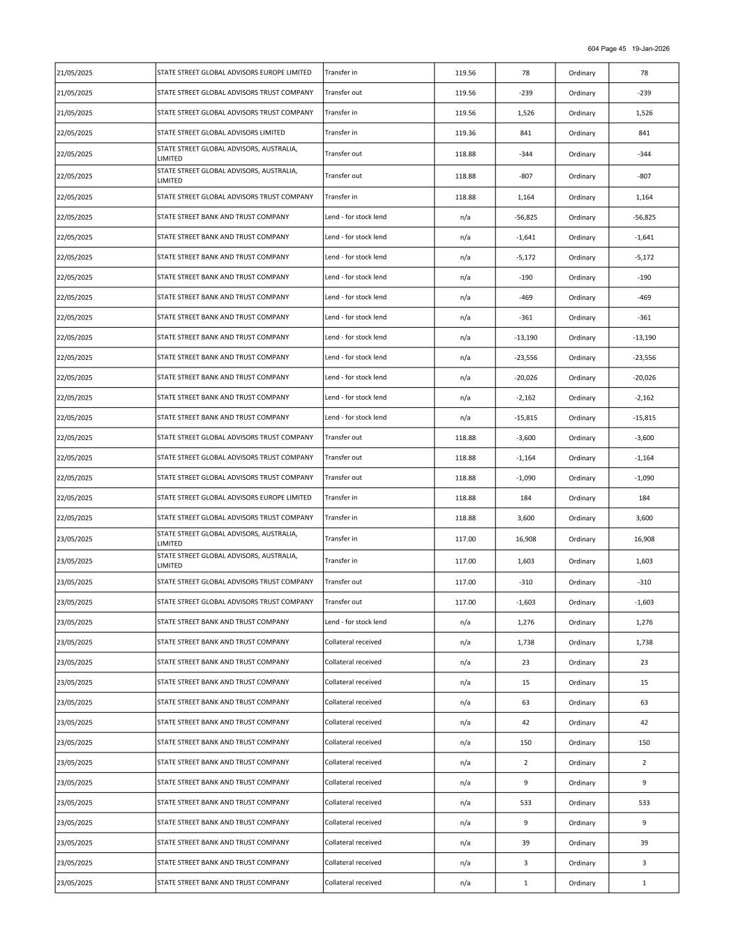 604 Page 44 19-Jan-2026 16/05/2025 121.05 344 Ordinary 344 16/05/2025 121.05 2,408 Ordinary 2,408 16/05/2025 121.05 -1,540 Ordinary -1,540 16/05/2025 n/a 5,132 Ordinary 5,132 16/05/2025 n/a 6,404 Ordinary 6,404 16/05/2025 n/a -3,117 Ordinary -3,117 16/05/2025 n/a 3,117 Ordinary 3,117 16/05/2025 121.00 1,416 Ordinary 1,416 16/05/2025 n/a -4,722 Ordinary -4,722 16/05/2025 121.05 92 Ordinary 92 19/05/2025 119.46 228 Ordinary 228 19/05/2025 119.46 3,640 Ordinary 3,640 19/05/2025 n/a 6,908 Ordinary 6,908 19/05/2025 n/a 35 Ordinary 35 19/05/2025 n/a 28,805 Ordinary 28,805 19/05/2025 n/a -35 Ordinary -35 19/05/2025 119.46 -1,496 Ordinary -1,496 19/05/2025 119.46 545 Ordinary 545 19/05/2025 119.46 436 Ordinary 436 19/05/2025 119.46 109 Ordinary 109 19/05/2025 119.46 71 Ordinary 71 19/05/2025 119.46 299 Ordinary 299 19/05/2025 119.46 207 Ordinary 207 19/05/2025 120.00 66 Ordinary 66 19/05/2025 119.46 1,496 Ordinary 1,496 20/05/2025 119.22 18,609 Ordinary 18,609 20/05/2025 119.80 147 Ordinary 147 20/05/2025 119.22 734 Ordinary 734 20/05/2025 n/a 8,813 Ordinary 8,813 20/05/2025 n/a 7,392 Ordinary 7,392 20/05/2025 119.80 312 Ordinary 312 20/05/2025 119.22 -1,340 Ordinary -1,340 21/05/2025 119.56 987 Ordinary 987 21/05/2025 119.56 -1,526 Ordinary -1,526 21/05/2025 n/a 2,104 Ordinary 2,104 21/05/2025 n/a -1,810 Ordinary -1,810 21/05/2025 n/a 37,581 Ordinary 37,581 21/05/2025 119.56 -2,640 Ordinary -2,640 21/05/2025 119.56 312 Ordinary 312 21/05/2025 119.56 213 Ordinary 213 21/05/2025 119.56 184 Ordinary 184 Transfer out Transfer in STATE STREET GLOBAL ADVISORS EUROPE LIMITED STATE STREET GLOBAL ADVISORS EUROPE LIMITED STATE STREET GLOBAL ADVISORS TRUST COMPANY Transfer in Transfer in Transfer in STATE STREET GLOBAL ADVISORS, AUSTRALIA, LIMITED STATE STREET GLOBAL ADVISORS EUROPE LIMITED STATE STREET GLOBAL ADVISORS TRUST COMPANY Transfer in Lend - for stock lend Transfer in Lend - for stock lend SSGA FUNDS MANAGEMENT, INC. Transfer in STATE STREET GLOBAL ADVISORS EUROPE LIMITED STATE STREET GLOBAL ADVISORS EUROPE LIMITED Transfer in STATE STREET BANK AND TRUST COMPANY STATE STREET GLOBAL ADVISORS, AUSTRALIA, LIMITED Transfer out STATE STREET GLOBAL ADVISORS, LTD. STATE STREET BANK AND TRUST COMPANY Lend - for stock lend Transfer in Lend - for stock lend STATE STREET GLOBAL ADVISORS, AUSTRALIA, LIMITED STATE STREET BANK AND TRUST COMPANY Lend - for stock lend Transfer in Transfer out STATE STREET GLOBAL ADVISORS LIMITED STATE STREET BANK AND TRUST COMPANY STATE STREET GLOBAL ADVISORS TRUST COMPANY STATE STREET BANK AND TRUST COMPANY Lend - for stock lend Lend - for stock lend Transfer in STATE STREET BANK AND TRUST COMPANY Lend - for stock lend STATE STREET BANK AND TRUST COMPANY STATE STREET GLOBAL ADVISORS EUROPE LIMITED SSGA FUNDS MANAGEMENT, INC. Lend - for stock lend Transfer out Transfer in Transfer in STATE STREET BANK AND TRUST COMPANY STATE STREET BANK AND TRUST COMPANY Lend - for stock lend STATE STREET GLOBAL ADVISORS, AUSTRALIA, LIMITED Lend - for stock lend Transfer in STATE STREET BANK AND TRUST COMPANY STATE STREET GLOBAL ADVISORS EUROPE LIMITED Transfer in STATE STREET GLOBAL ADVISORS TRUST COMPANY Lend - for stock lend STATE STREET GLOBAL ADVISORS EUROPE LIMITED Transfer in Lend - for stock lend STATE STREET BANK AND TRUST COMPANY Collateral received STATE STREET GLOBAL ADVISORS EUROPE LIMITED Transfer in Transfer in STATE STREET BANK AND TRUST COMPANY STATE STREET GLOBAL ADVISORS EUROPE LIMITED STATE STREET BANK AND TRUST COMPANY STATE STREET GLOBAL ADVISORS EUROPE LIMITED Transfer in Transfer in STATE STREET BANK AND TRUST COMPANY STATE STREET GLOBAL ADVISORS EUROPE LIMITED STATE STREET GLOBAL ADVISORS TRUST COMPANY Transfer in Transfer in Transfer out STATE STREET GLOBAL ADVISORS EUROPE LIMITED SSGA FUNDS MANAGEMENT, INC.