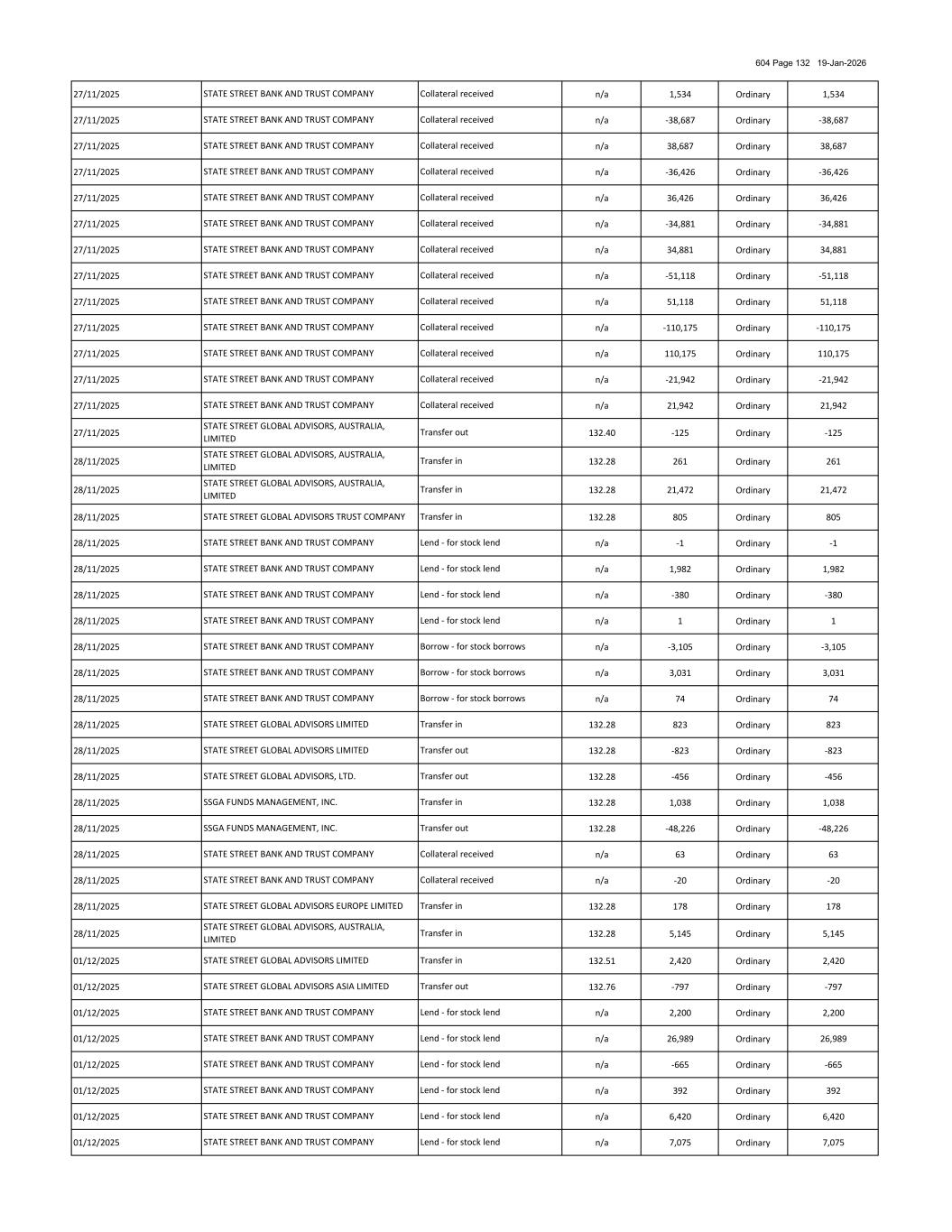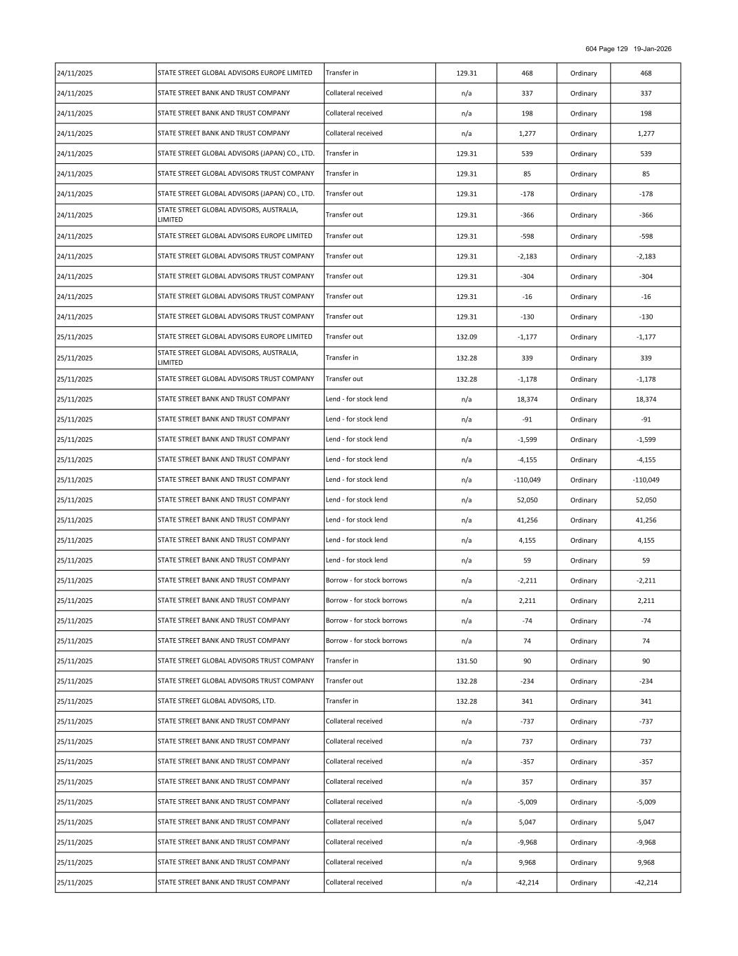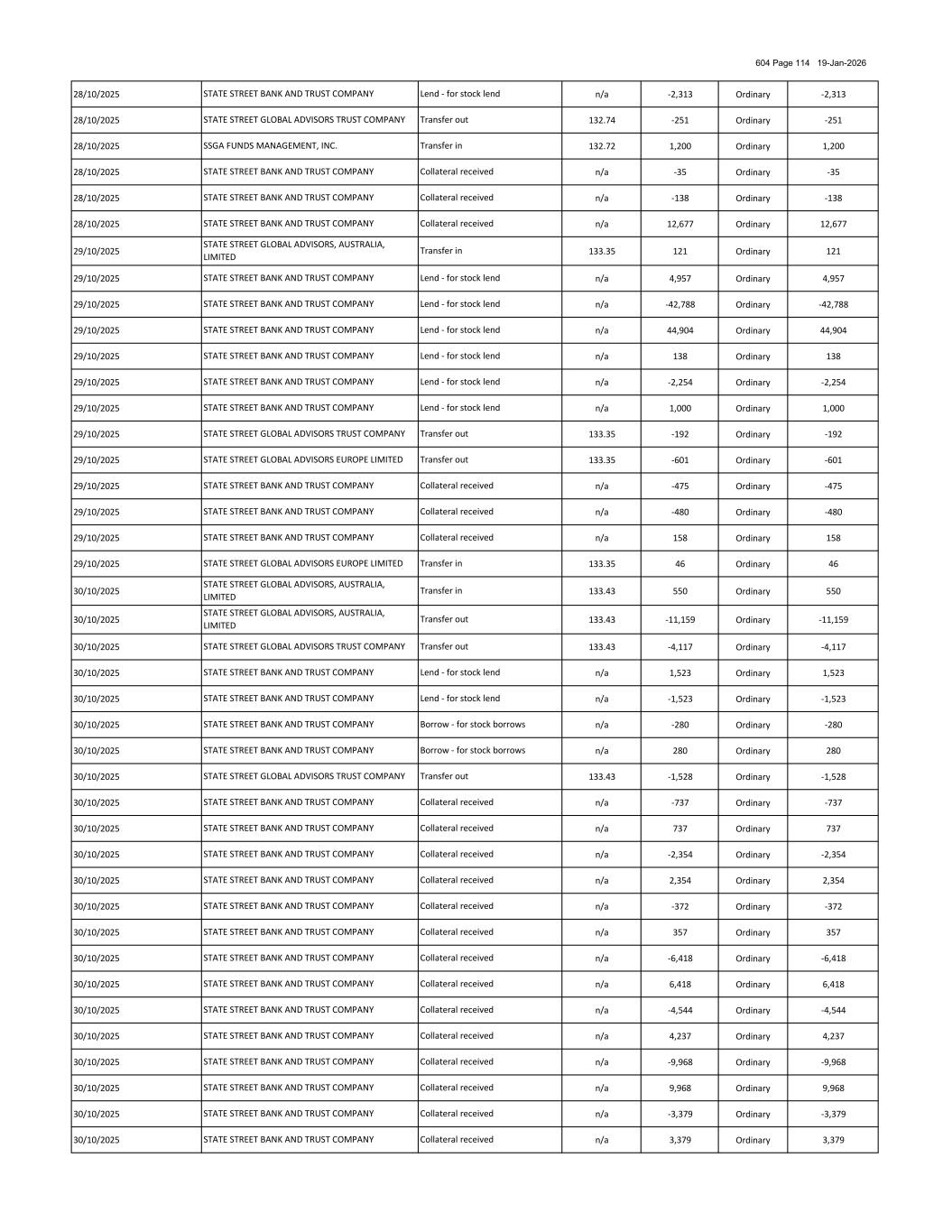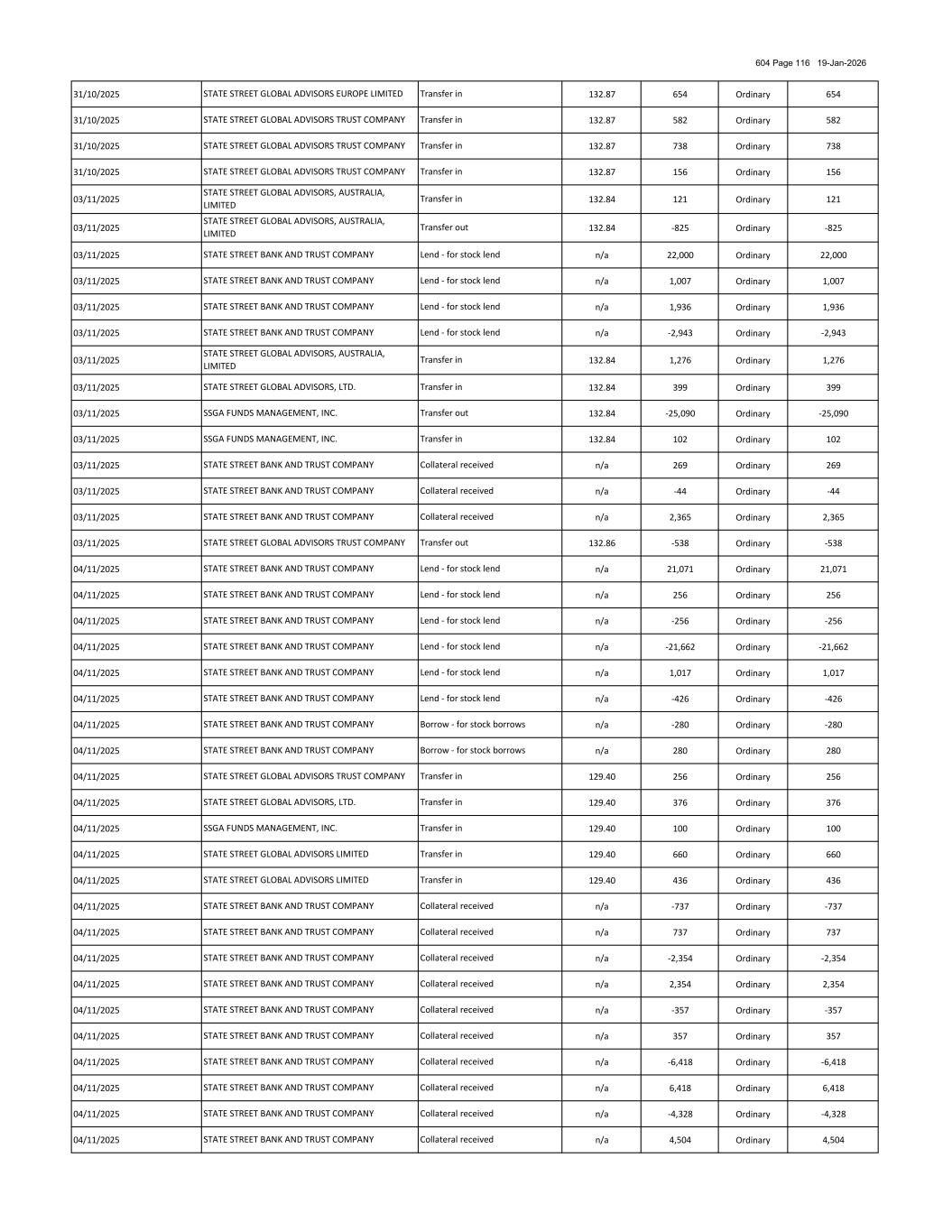 604 Page 120 19-Jan-2026 07/11/2025 n/a 6,256 Ordinary 6,256 07/11/2025 n/a -1,534 Ordinary -1,534 07/11/2025 n/a 1,534 Ordinary 1,534 07/11/2025 n/a -38,687 Ordinary -38,687 07/11/2025 n/a 38,687 Ordinary 38,687 07/11/2025 n/a -41,943 Ordinary -41,943 07/11/2025 n/a 41,943 Ordinary 41,943 07/11/2025 n/a -34,881 Ordinary -34,881 07/11/2025 n/a 34,881 Ordinary 34,881 07/11/2025 n/a -51,118 Ordinary -51,118 07/11/2025 n/a 51,118 Ordinary 51,118 07/11/2025 n/a -10,675 Ordinary -10,675 07/11/2025 n/a 11,680 Ordinary 11,680 10/11/2025 129.79 191 Ordinary 191 10/11/2025 129.79 5,136 Ordinary 5,136 10/11/2025 n/a -85 Ordinary -85 10/11/2025 n/a 1,270 Ordinary 1,270 10/11/2025 n/a 85 Ordinary 85 10/11/2025 n/a -313 Ordinary -313 10/11/2025 n/a -252 Ordinary -252 10/11/2025 n/a -1,281 Ordinary -1,281 10/11/2025 n/a -46,644 Ordinary -46,644 10/11/2025 n/a -11,601 Ordinary -11,601 10/11/2025 n/a -1,560 Ordinary -1,560 10/11/2025 n/a -2,037 Ordinary -2,037 10/11/2025 n/a -1,551 Ordinary -1,551 10/11/2025 n/a -10,832 Ordinary -10,832 10/11/2025 n/a -648 Ordinary -648 10/11/2025 n/a -1,601 Ordinary -1,601 10/11/2025 n/a -7,645 Ordinary -7,645 10/11/2025 n/a -127 Ordinary -127 10/11/2025 n/a -366 Ordinary -366 10/11/2025 n/a -12,357 Ordinary -12,357 10/11/2025 n/a -26 Ordinary -26 10/11/2025 n/a -148 Ordinary -148 10/11/2025 n/a 6,000 Ordinary 6,000 10/11/2025 n/a 201 Ordinary 201 10/11/2025 n/a 67 Ordinary 67 10/11/2025 n/a 171 Ordinary 171 10/11/2025 n/a 897 Ordinary 897 10/11/2025 129.22 -283 Ordinary -283 11/11/2025 131.48 192 Ordinary 192 Collateral received Collateral received Collateral received Collateral receivedSTATE STREET BANK AND TRUST COMPANY Collateral received STATE STREET BANK AND TRUST COMPANY STATE STREET BANK AND TRUST COMPANY STATE STREET BANK AND TRUST COMPANY Collateral received Collateral received STATE STREET BANK AND TRUST COMPANY STATE STREET BANK AND TRUST COMPANY Transfer in STATE STREET BANK AND TRUST COMPANY Collateral received STATE STREET BANK AND TRUST COMPANY STATE STREET BANK AND TRUST COMPANY STATE STREET BANK AND TRUST COMPANY STATE STREET BANK AND TRUST COMPANY Collateral received Collateral received STATE STREET BANK AND TRUST COMPANY STATE STREET GLOBAL ADVISORS LIMITED Collateral received Collateral received Collateral received Collateral received STATE STREET BANK AND TRUST COMPANY Transfer in Lend - for stock lend STATE STREET BANK AND TRUST COMPANY STATE STREET BANK AND TRUST COMPANY Collateral received Collateral received Collateral received Collateral received STATE STREET BANK AND TRUST COMPANY STATE STREET BANK AND TRUST COMPANY Lend - for stock lend Collateral received STATE STREET BANK AND TRUST COMPANY STATE STREET GLOBAL ADVISORS, AUSTRALIA, LIMITED STATE STREET BANK AND TRUST COMPANY STATE STREET BANK AND TRUST COMPANY STATE STREET BANK AND TRUST COMPANY STATE STREET BANK AND TRUST COMPANY Collateral received STATE STREET BANK AND TRUST COMPANY STATE STREET BANK AND TRUST COMPANY Transfer out STATE STREET BANK AND TRUST COMPANY Collateral received Collateral received Lend - for stock lend Transfer in Collateral received Collateral received STATE STREET GLOBAL ADVISORS TRUST COMPANY Collateral received Collateral received STATE STREET BANK AND TRUST COMPANY Collateral received STATE STREET BANK AND TRUST COMPANY Collateral received STATE STREET BANK AND TRUST COMPANY STATE STREET BANK AND TRUST COMPANY Collateral received STATE STREET BANK AND TRUST COMPANY Collateral received STATE STREET BANK AND TRUST COMPANY Collateral received STATE STREET GLOBAL ADVISORS LIMITED STATE STREET BANK AND TRUST COMPANY STATE STREET BANK AND TRUST COMPANY STATE STREET BANK AND TRUST COMPANY STATE STREET BANK AND TRUST COMPANY STATE STREET BANK AND TRUST COMPANY STATE STREET BANK AND TRUST COMPANY Collateral received Collateral received Collateral received STATE STREET BANK AND TRUST COMPANY Collateral received