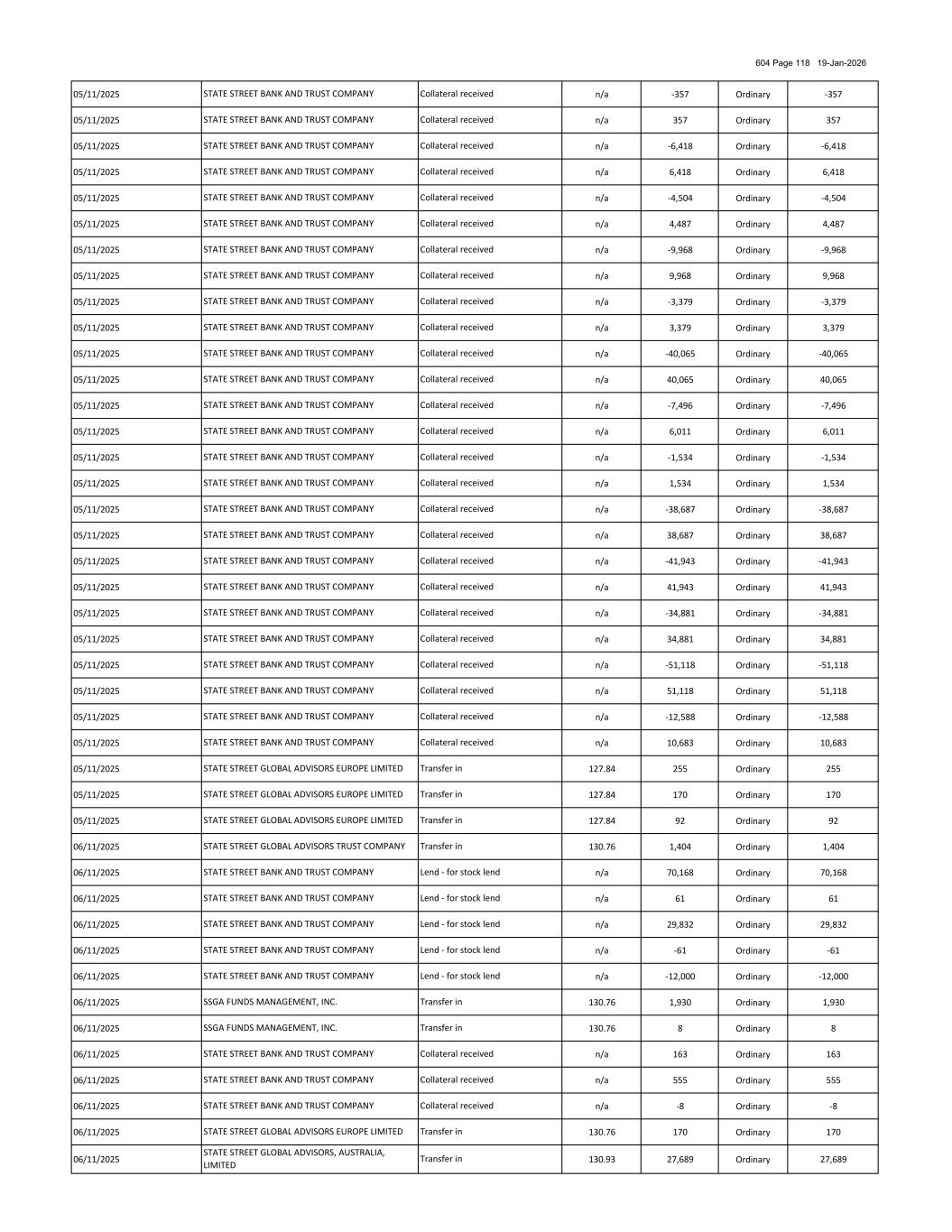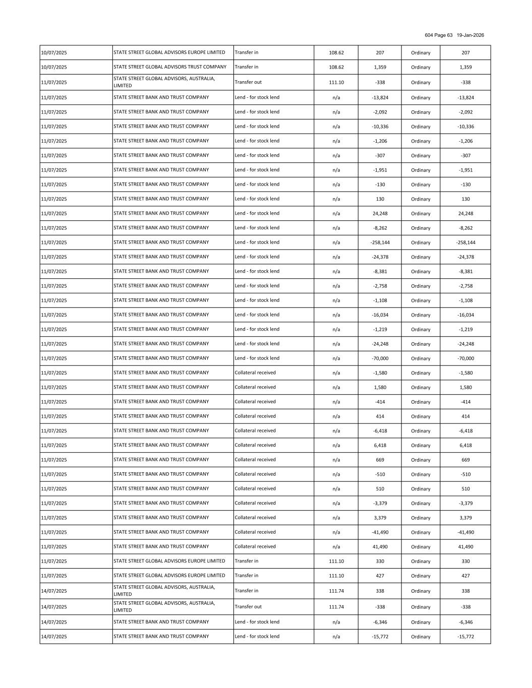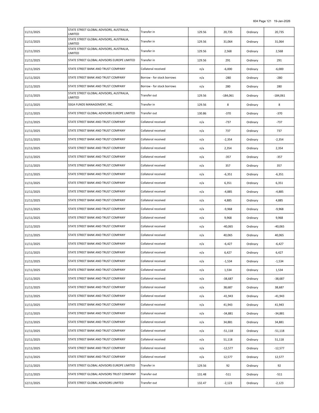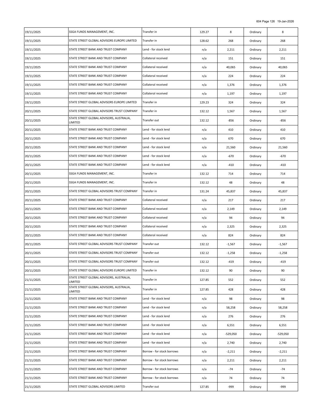 604 Page 120 19-Jan-2026 07/11/2025 n/a 6,256 Ordinary 6,256 07/11/2025 n/a -1,534 Ordinary -1,534 07/11/2025 n/a 1,534 Ordinary 1,534 07/11/2025 n/a -38,687 Ordinary -38,687 07/11/2025 n/a 38,687 Ordinary 38,687 07/11/2025 n/a -41,943 Ordinary -41,943 07/11/2025 n/a 41,943 Ordinary 41,943 07/11/2025 n/a -34,881 Ordinary -34,881 07/11/2025 n/a 34,881 Ordinary 34,881 07/11/2025 n/a -51,118 Ordinary -51,118 07/11/2025 n/a 51,118 Ordinary 51,118 07/11/2025 n/a -10,675 Ordinary -10,675 07/11/2025 n/a 11,680 Ordinary 11,680 10/11/2025 129.79 191 Ordinary 191 10/11/2025 129.79 5,136 Ordinary 5,136 10/11/2025 n/a -85 Ordinary -85 10/11/2025 n/a 1,270 Ordinary 1,270 10/11/2025 n/a 85 Ordinary 85 10/11/2025 n/a -313 Ordinary -313 10/11/2025 n/a -252 Ordinary -252 10/11/2025 n/a -1,281 Ordinary -1,281 10/11/2025 n/a -46,644 Ordinary -46,644 10/11/2025 n/a -11,601 Ordinary -11,601 10/11/2025 n/a -1,560 Ordinary -1,560 10/11/2025 n/a -2,037 Ordinary -2,037 10/11/2025 n/a -1,551 Ordinary -1,551 10/11/2025 n/a -10,832 Ordinary -10,832 10/11/2025 n/a -648 Ordinary -648 10/11/2025 n/a -1,601 Ordinary -1,601 10/11/2025 n/a -7,645 Ordinary -7,645 10/11/2025 n/a -127 Ordinary -127 10/11/2025 n/a -366 Ordinary -366 10/11/2025 n/a -12,357 Ordinary -12,357 10/11/2025 n/a -26 Ordinary -26 10/11/2025 n/a -148 Ordinary -148 10/11/2025 n/a 6,000 Ordinary 6,000 10/11/2025 n/a 201 Ordinary 201 10/11/2025 n/a 67 Ordinary 67 10/11/2025 n/a 171 Ordinary 171 10/11/2025 n/a 897 Ordinary 897 10/11/2025 129.22 -283 Ordinary -283 11/11/2025 131.48 192 Ordinary 192 Collateral received Collateral received Collateral received Collateral receivedSTATE STREET BANK AND TRUST COMPANY Collateral received STATE STREET BANK AND TRUST COMPANY STATE STREET BANK AND TRUST COMPANY STATE STREET BANK AND TRUST COMPANY Collateral received Collateral received STATE STREET BANK AND TRUST COMPANY STATE STREET BANK AND TRUST COMPANY Transfer in STATE STREET BANK AND TRUST COMPANY Collateral received STATE STREET BANK AND TRUST COMPANY STATE STREET BANK AND TRUST COMPANY STATE STREET BANK AND TRUST COMPANY STATE STREET BANK AND TRUST COMPANY Collateral received Collateral received STATE STREET BANK AND TRUST COMPANY STATE STREET GLOBAL ADVISORS LIMITED Collateral received Collateral received Collateral received Collateral received STATE STREET BANK AND TRUST COMPANY Transfer in Lend - for stock lend STATE STREET BANK AND TRUST COMPANY STATE STREET BANK AND TRUST COMPANY Collateral received Collateral received Collateral received Collateral received STATE STREET BANK AND TRUST COMPANY STATE STREET BANK AND TRUST COMPANY Lend - for stock lend Collateral received STATE STREET BANK AND TRUST COMPANY STATE STREET GLOBAL ADVISORS, AUSTRALIA, LIMITED STATE STREET BANK AND TRUST COMPANY STATE STREET BANK AND TRUST COMPANY STATE STREET BANK AND TRUST COMPANY STATE STREET BANK AND TRUST COMPANY Collateral received STATE STREET BANK AND TRUST COMPANY STATE STREET BANK AND TRUST COMPANY Transfer out STATE STREET BANK AND TRUST COMPANY Collateral received Collateral received Lend - for stock lend Transfer in Collateral received Collateral received STATE STREET GLOBAL ADVISORS TRUST COMPANY Collateral received Collateral received STATE STREET BANK AND TRUST COMPANY Collateral received STATE STREET BANK AND TRUST COMPANY Collateral received STATE STREET BANK AND TRUST COMPANY STATE STREET BANK AND TRUST COMPANY Collateral received STATE STREET BANK AND TRUST COMPANY Collateral received STATE STREET BANK AND TRUST COMPANY Collateral received STATE STREET GLOBAL ADVISORS LIMITED STATE STREET BANK AND TRUST COMPANY STATE STREET BANK AND TRUST COMPANY STATE STREET BANK AND TRUST COMPANY STATE STREET BANK AND TRUST COMPANY STATE STREET BANK AND TRUST COMPANY STATE STREET BANK AND TRUST COMPANY Collateral received Collateral received Collateral received STATE STREET BANK AND TRUST COMPANY Collateral received