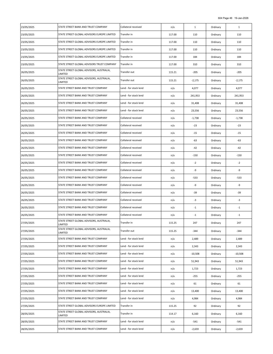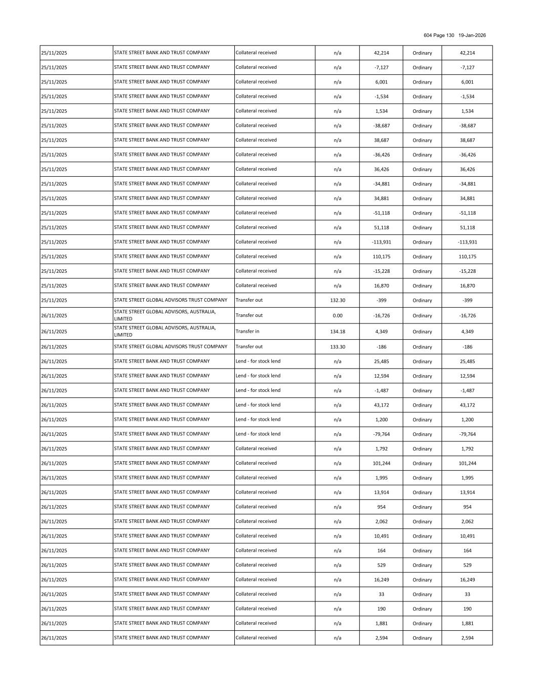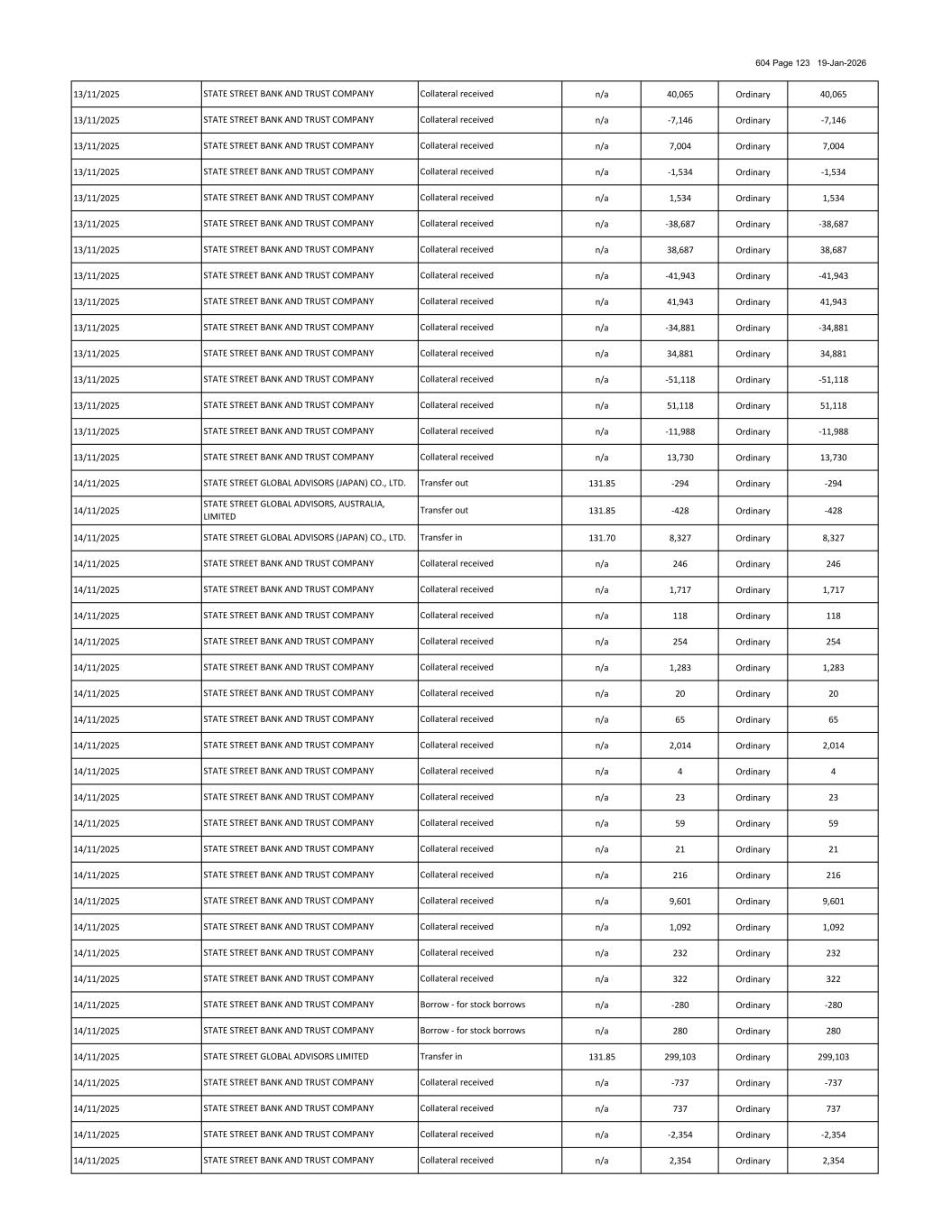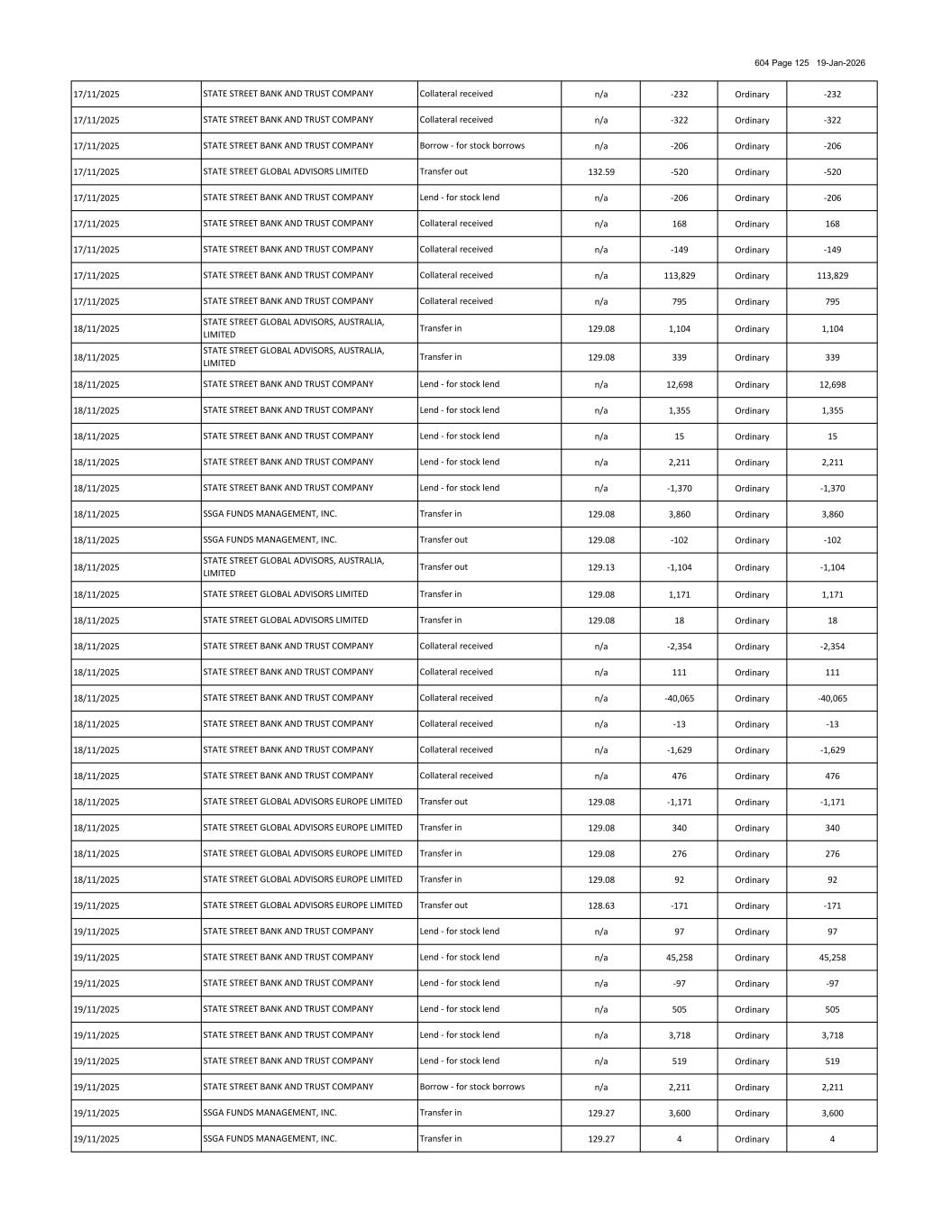 604 Page 120 19-Jan-2026 07/11/2025 n/a 6,256 Ordinary 6,256 07/11/2025 n/a -1,534 Ordinary -1,534 07/11/2025 n/a 1,534 Ordinary 1,534 07/11/2025 n/a -38,687 Ordinary -38,687 07/11/2025 n/a 38,687 Ordinary 38,687 07/11/2025 n/a -41,943 Ordinary -41,943 07/11/2025 n/a 41,943 Ordinary 41,943 07/11/2025 n/a -34,881 Ordinary -34,881 07/11/2025 n/a 34,881 Ordinary 34,881 07/11/2025 n/a -51,118 Ordinary -51,118 07/11/2025 n/a 51,118 Ordinary 51,118 07/11/2025 n/a -10,675 Ordinary -10,675 07/11/2025 n/a 11,680 Ordinary 11,680 10/11/2025 129.79 191 Ordinary 191 10/11/2025 129.79 5,136 Ordinary 5,136 10/11/2025 n/a -85 Ordinary -85 10/11/2025 n/a 1,270 Ordinary 1,270 10/11/2025 n/a 85 Ordinary 85 10/11/2025 n/a -313 Ordinary -313 10/11/2025 n/a -252 Ordinary -252 10/11/2025 n/a -1,281 Ordinary -1,281 10/11/2025 n/a -46,644 Ordinary -46,644 10/11/2025 n/a -11,601 Ordinary -11,601 10/11/2025 n/a -1,560 Ordinary -1,560 10/11/2025 n/a -2,037 Ordinary -2,037 10/11/2025 n/a -1,551 Ordinary -1,551 10/11/2025 n/a -10,832 Ordinary -10,832 10/11/2025 n/a -648 Ordinary -648 10/11/2025 n/a -1,601 Ordinary -1,601 10/11/2025 n/a -7,645 Ordinary -7,645 10/11/2025 n/a -127 Ordinary -127 10/11/2025 n/a -366 Ordinary -366 10/11/2025 n/a -12,357 Ordinary -12,357 10/11/2025 n/a -26 Ordinary -26 10/11/2025 n/a -148 Ordinary -148 10/11/2025 n/a 6,000 Ordinary 6,000 10/11/2025 n/a 201 Ordinary 201 10/11/2025 n/a 67 Ordinary 67 10/11/2025 n/a 171 Ordinary 171 10/11/2025 n/a 897 Ordinary 897 10/11/2025 129.22 -283 Ordinary -283 11/11/2025 131.48 192 Ordinary 192 Collateral received Collateral received Collateral received Collateral receivedSTATE STREET BANK AND TRUST COMPANY Collateral received STATE STREET BANK AND TRUST COMPANY STATE STREET BANK AND TRUST COMPANY STATE STREET BANK AND TRUST COMPANY Collateral received Collateral received STATE STREET BANK AND TRUST COMPANY STATE STREET BANK AND TRUST COMPANY Transfer in STATE STREET BANK AND TRUST COMPANY Collateral received STATE STREET BANK AND TRUST COMPANY STATE STREET BANK AND TRUST COMPANY STATE STREET BANK AND TRUST COMPANY STATE STREET BANK AND TRUST COMPANY Collateral received Collateral received STATE STREET BANK AND TRUST COMPANY STATE STREET GLOBAL ADVISORS LIMITED Collateral received Collateral received Collateral received Collateral received STATE STREET BANK AND TRUST COMPANY Transfer in Lend - for stock lend STATE STREET BANK AND TRUST COMPANY STATE STREET BANK AND TRUST COMPANY Collateral received Collateral received Collateral received Collateral received STATE STREET BANK AND TRUST COMPANY STATE STREET BANK AND TRUST COMPANY Lend - for stock lend Collateral received STATE STREET BANK AND TRUST COMPANY STATE STREET GLOBAL ADVISORS, AUSTRALIA, LIMITED STATE STREET BANK AND TRUST COMPANY STATE STREET BANK AND TRUST COMPANY STATE STREET BANK AND TRUST COMPANY STATE STREET BANK AND TRUST COMPANY Collateral received STATE STREET BANK AND TRUST COMPANY STATE STREET BANK AND TRUST COMPANY Transfer out STATE STREET BANK AND TRUST COMPANY Collateral received Collateral received Lend - for stock lend Transfer in Collateral received Collateral received STATE STREET GLOBAL ADVISORS TRUST COMPANY Collateral received Collateral received STATE STREET BANK AND TRUST COMPANY Collateral received STATE STREET BANK AND TRUST COMPANY Collateral received STATE STREET BANK AND TRUST COMPANY STATE STREET BANK AND TRUST COMPANY Collateral received STATE STREET BANK AND TRUST COMPANY Collateral received STATE STREET BANK AND TRUST COMPANY Collateral received STATE STREET GLOBAL ADVISORS LIMITED STATE STREET BANK AND TRUST COMPANY STATE STREET BANK AND TRUST COMPANY STATE STREET BANK AND TRUST COMPANY STATE STREET BANK AND TRUST COMPANY STATE STREET BANK AND TRUST COMPANY STATE STREET BANK AND TRUST COMPANY Collateral received Collateral received Collateral received STATE STREET BANK AND TRUST COMPANY Collateral received