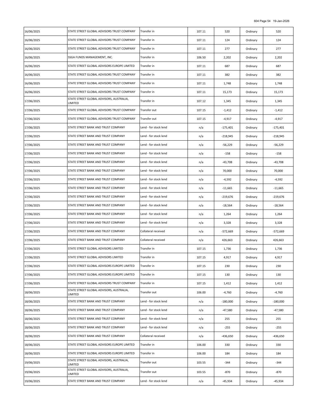 604 Page 53 19-Jan-2026 13/06/2025 106.38 531 Ordinary 531 13/06/2025 106.38 -435 Ordinary -435 13/06/2025 n/a 317 Ordinary 317 13/06/2025 n/a 162,000 Ordinary 162,000 13/06/2025 n/a 115 Ordinary 115 13/06/2025 n/a -115 Ordinary -115 13/06/2025 n/a -317 Ordinary -317 13/06/2025 n/a 64,183 Ordinary 64,183 13/06/2025 n/a -274 Ordinary -274 13/06/2025 106.38 13,290 Ordinary 13,290 13/06/2025 n/a -7,816 Ordinary -7,816 13/06/2025 n/a 7,816 Ordinary 7,816 13/06/2025 n/a -4,058 Ordinary -4,058 13/06/2025 n/a 4,058 Ordinary 4,058 13/06/2025 n/a -43,212 Ordinary -43,212 13/06/2025 n/a 41,490 Ordinary 41,490 13/06/2025 106.38 763 Ordinary 763 13/06/2025 106.38 63 Ordinary 63 16/06/2025 106.50 -242 Ordinary -242 16/06/2025 107.11 -688 Ordinary -688 16/06/2025 107.11 -688 Ordinary -688 16/06/2025 107.11 435 Ordinary 435 16/06/2025 107.11 -382 Ordinary -382 16/06/2025 107.11 -1,748 Ordinary -1,748 16/06/2025 107.11 -520 Ordinary -520 16/06/2025 n/a 15,772 Ordinary 15,772 16/06/2025 n/a 12,265 Ordinary 12,265 16/06/2025 n/a 1,973 Ordinary 1,973 16/06/2025 n/a 138,955 Ordinary 138,955 16/06/2025 n/a 222 Ordinary 222 16/06/2025 n/a 18,000 Ordinary 18,000 16/06/2025 n/a 255 Ordinary 255 16/06/2025 n/a -255 Ordinary -255 16/06/2025 n/a 56,246 Ordinary 56,246 16/06/2025 n/a 3,536 Ordinary 3,536 16/06/2025 n/a 4,572 Ordinary 4,572 16/06/2025 n/a 155,381 Ordinary 155,381 16/06/2025 n/a -6,657 Ordinary -6,657 16/06/2025 n/a -308,324 Ordinary -308,324 16/06/2025 n/a 572,669 Ordinary 572,669 16/06/2025 n/a -26,069 Ordinary -26,069 Transfer in STATE STREET BANK AND TRUST COMPANY Lend - for stock lend Collateral received STATE STREET BANK AND TRUST COMPANY STATE STREET BANK AND TRUST COMPANY Lend - for stock lend STATE STREET BANK AND TRUST COMPANY Transfer in STATE STREET BANK AND TRUST COMPANY Collateral received Lend - for stock lend STATE STREET BANK AND TRUST COMPANY STATE STREET BANK AND TRUST COMPANY SSGA FUNDS MANAGEMENT, INC. STATE STREET BANK AND TRUST COMPANY Transfer out Collateral received Lend - for stock lend Collateral received STATE STREET GLOBAL ADVISORS EUROPE LIMITED STATE STREET BANK AND TRUST COMPANY STATE STREET BANK AND TRUST COMPANY Lend - for stock lend Lend - for stock lend STATE STREET BANK AND TRUST COMPANY STATE STREET GLOBAL ADVISORS TRUST COMPANY STATE STREET BANK AND TRUST COMPANY STATE STREET BANK AND TRUST COMPANY Transfer out Collateral received Lend - for stock lend STATE STREET BANK AND TRUST COMPANY Collateral received Transfer in Lend - for stock lend STATE STREET BANK AND TRUST COMPANY STATE STREET GLOBAL ADVISORS, AUSTRALIA, LIMITED Collateral received STATE STREET BANK AND TRUST COMPANY Transfer in Transfer out Transfer in STATE STREET BANK AND TRUST COMPANY STATE STREET BANK AND TRUST COMPANY STATE STREET GLOBAL ADVISORS, AUSTRALIA, LIMITED Transfer out Lend - for stock lend STATE STREET GLOBAL ADVISORS, AUSTRALIA, LIMITED STATE STREET GLOBAL ADVISORS, AUSTRALIA, LIMITED Transfer out Lend - for stock lend STATE STREET GLOBAL ADVISORS LIMITED STATE STREET BANK AND TRUST COMPANY Transfer out STATE STREET GLOBAL ADVISORS TRUST COMPANY STATE STREET BANK AND TRUST COMPANY Collateral received Lend - for stock lend Transfer out STATE STREET GLOBAL ADVISORS TRUST COMPANY STATE STREET BANK AND TRUST COMPANY STATE STREET BANK AND TRUST COMPANY Collateral received Lend - for stock lend Lend - for stock lend Lend - for stock lend STATE STREET BANK AND TRUST COMPANY STATE STREET GLOBAL ADVISORS, AUSTRALIA, LIMITED STATE STREET GLOBAL ADVISORS TRUST COMPANY Lend - for stock lend Collateral received STATE STREET BANK AND TRUST COMPANY STATE STREET BANK AND TRUST COMPANY Lend - for stock lend STATE STREET BANK AND TRUST COMPANY STATE STREET BANK AND TRUST COMPANY STATE STREET BANK AND TRUST COMPANY Lend - for stock lend Collateral received Lend - for stock lend STATE STREET BANK AND TRUST COMPANY