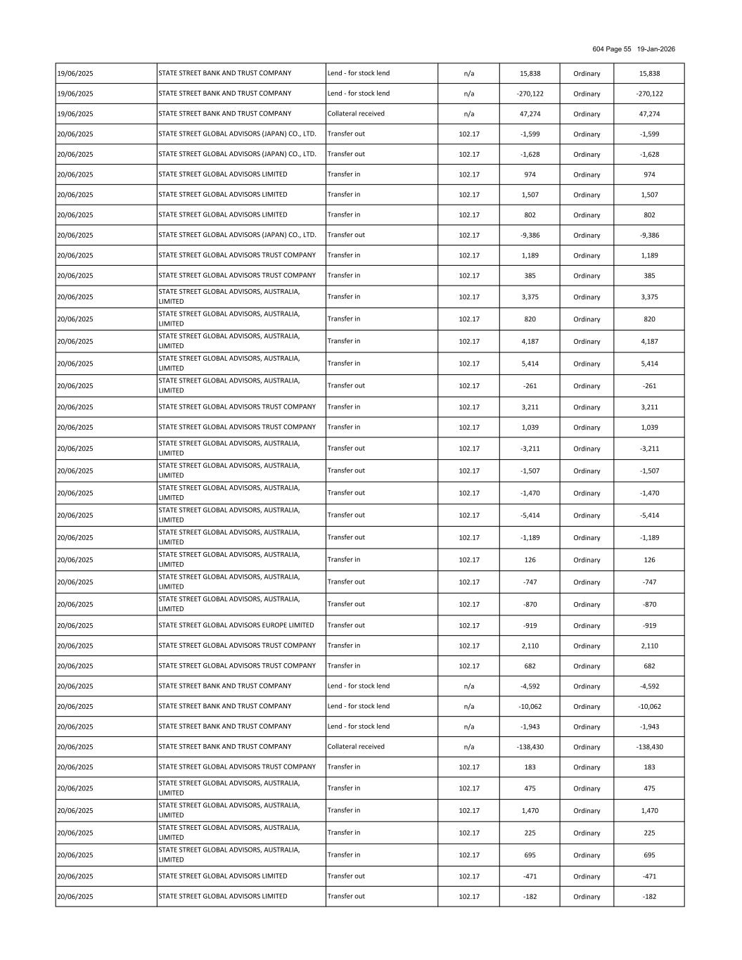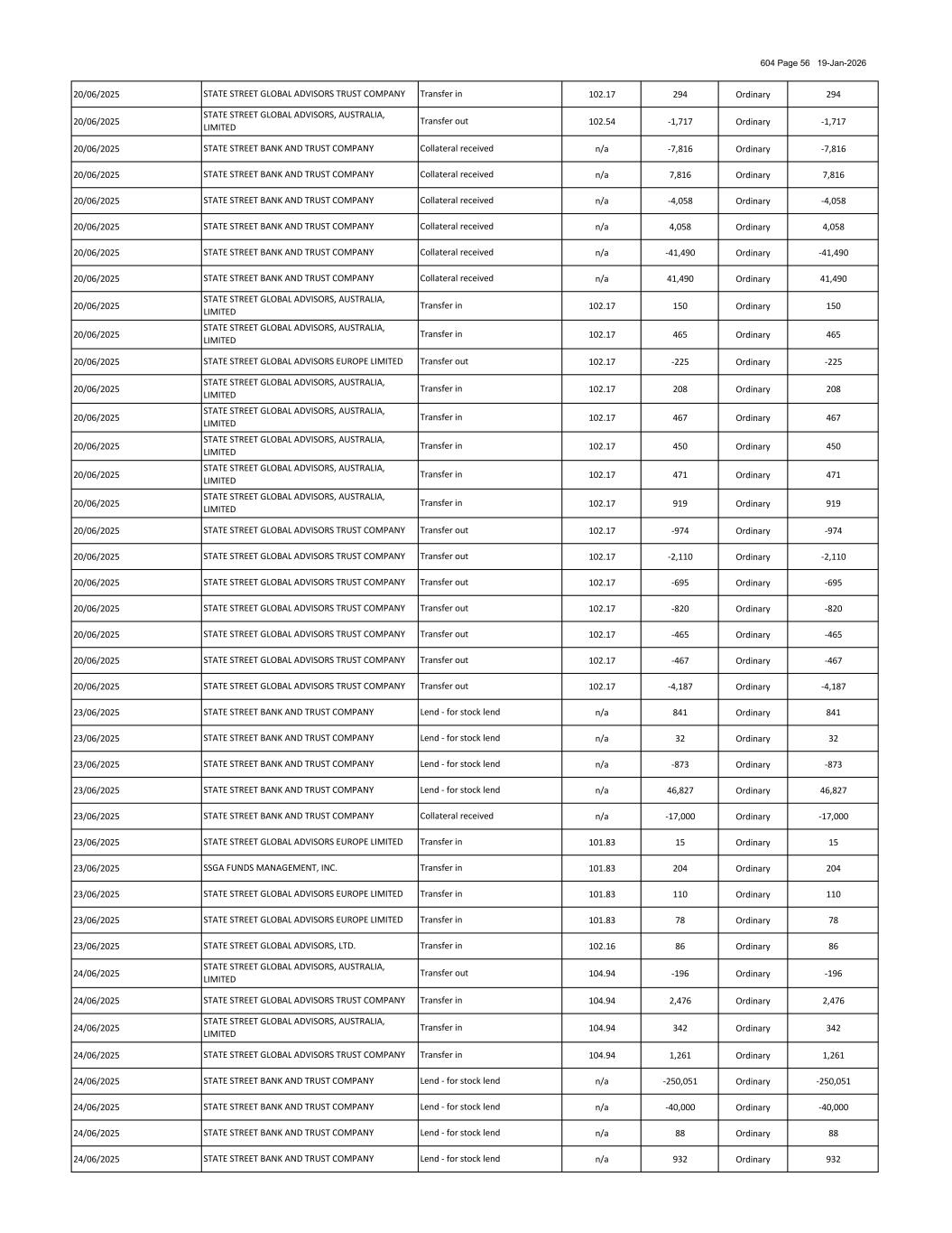 604 Page 55 19-Jan-2026 19/06/2025 n/a 15,838 Ordinary 15,838 19/06/2025 n/a -270,122 Ordinary -270,122 19/06/2025 n/a 47,274 Ordinary 47,274 20/06/2025 102.17 -1,599 Ordinary -1,599 20/06/2025 102.17 -1,628 Ordinary -1,628 20/06/2025 102.17 974 Ordinary 974 20/06/2025 102.17 1,507 Ordinary 1,507 20/06/2025 102.17 802 Ordinary 802 20/06/2025 102.17 -9,386 Ordinary -9,386 20/06/2025 102.17 1,189 Ordinary 1,189 20/06/2025 102.17 385 Ordinary 385 20/06/2025 102.17 3,375 Ordinary 3,375 20/06/2025 102.17 820 Ordinary 820 20/06/2025 102.17 4,187 Ordinary 4,187 20/06/2025 102.17 5,414 Ordinary 5,414 20/06/2025 102.17 -261 Ordinary -261 20/06/2025 102.17 3,211 Ordinary 3,211 20/06/2025 102.17 1,039 Ordinary 1,039 20/06/2025 102.17 -3,211 Ordinary -3,211 20/06/2025 102.17 -1,507 Ordinary -1,507 20/06/2025 102.17 -1,470 Ordinary -1,470 20/06/2025 102.17 -5,414 Ordinary -5,414 20/06/2025 102.17 -1,189 Ordinary -1,189 20/06/2025 102.17 126 Ordinary 126 20/06/2025 102.17 -747 Ordinary -747 20/06/2025 102.17 -870 Ordinary -870 20/06/2025 102.17 -919 Ordinary -919 20/06/2025 102.17 2,110 Ordinary 2,110 20/06/2025 102.17 682 Ordinary 682 20/06/2025 n/a -4,592 Ordinary -4,592 20/06/2025 n/a -10,062 Ordinary -10,062 20/06/2025 n/a -1,943 Ordinary -1,943 20/06/2025 n/a -138,430 Ordinary -138,430 20/06/2025 102.17 183 Ordinary 183 20/06/2025 102.17 475 Ordinary 475 20/06/2025 102.17 1,470 Ordinary 1,470 20/06/2025 102.17 225 Ordinary 225 20/06/2025 102.17 695 Ordinary 695 20/06/2025 102.17 -471 Ordinary -471 20/06/2025 102.17 -182 Ordinary -182 STATE STREET GLOBAL ADVISORS EUROPE LIMITED STATE STREET GLOBAL ADVISORS, AUSTRALIA, LIMITED STATE STREET GLOBAL ADVISORS, AUSTRALIA, LIMITED Transfer in Transfer in Transfer in Transfer out STATE STREET GLOBAL ADVISORS, AUSTRALIA, LIMITED STATE STREET GLOBAL ADVISORS (JAPAN) CO., LTD. STATE STREET GLOBAL ADVISORS, AUSTRALIA, LIMITED Transfer out Transfer out STATE STREET GLOBAL ADVISORS, AUSTRALIA, LIMITED STATE STREET GLOBAL ADVISORS LIMITED STATE STREET GLOBAL ADVISORS TRUST COMPANY STATE STREET GLOBAL ADVISORS LIMITED STATE STREET GLOBAL ADVISORS TRUST COMPANY Transfer in Transfer in Transfer in Transfer out STATE STREET GLOBAL ADVISORS (JAPAN) CO., LTD. Transfer out Lend - for stock lend STATE STREET GLOBAL ADVISORS LIMITED STATE STREET GLOBAL ADVISORS TRUST COMPANY Transfer in Lend - for stock lend STATE STREET GLOBAL ADVISORS TRUST COMPANY STATE STREET GLOBAL ADVISORS LIMITED Transfer out Lend - for stock lend STATE STREET GLOBAL ADVISORS (JAPAN) CO., LTD. STATE STREET BANK AND TRUST COMPANY STATE STREET GLOBAL ADVISORS, AUSTRALIA, LIMITED Transfer out Transfer in Lend - for stock lend STATE STREET BANK AND TRUST COMPANY Lend - for stock lend STATE STREET GLOBAL ADVISORS, AUSTRALIA, LIMITED STATE STREET GLOBAL ADVISORS LIMITED STATE STREET BANK AND TRUST COMPANY Transfer out Transfer in STATE STREET GLOBAL ADVISORS TRUST COMPANY STATE STREET GLOBAL ADVISORS, AUSTRALIA, LIMITED Transfer in STATE STREET BANK AND TRUST COMPANY Collateral received Transfer out STATE STREET BANK AND TRUST COMPANY STATE STREET GLOBAL ADVISORS TRUST COMPANY Transfer in Transfer in Transfer in STATE STREET GLOBAL ADVISORS TRUST COMPANY STATE STREET GLOBAL ADVISORS, AUSTRALIA, LIMITED Transfer in STATE STREET BANK AND TRUST COMPANY Transfer out STATE STREET GLOBAL ADVISORS, AUSTRALIA, LIMITED STATE STREET GLOBAL ADVISORS, AUSTRALIA, LIMITED STATE STREET GLOBAL ADVISORS, AUSTRALIA, LIMITED Collateral received Transfer out Transfer in Transfer in STATE STREET GLOBAL ADVISORS, AUSTRALIA, LIMITED STATE STREET GLOBAL ADVISORS, AUSTRALIA, LIMITED Transfer out Transfer in STATE STREET BANK AND TRUST COMPANY STATE STREET GLOBAL ADVISORS, AUSTRALIA, LIMITED Transfer out STATE STREET GLOBAL ADVISORS, AUSTRALIA, LIMITED STATE STREET GLOBAL ADVISORS, AUSTRALIA, LIMITED Transfer in Transfer out Transfer in