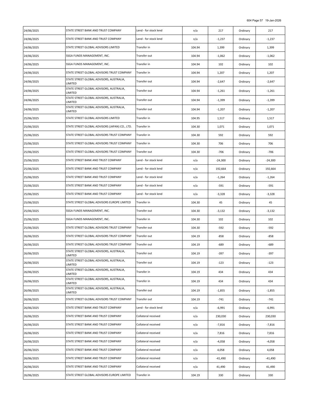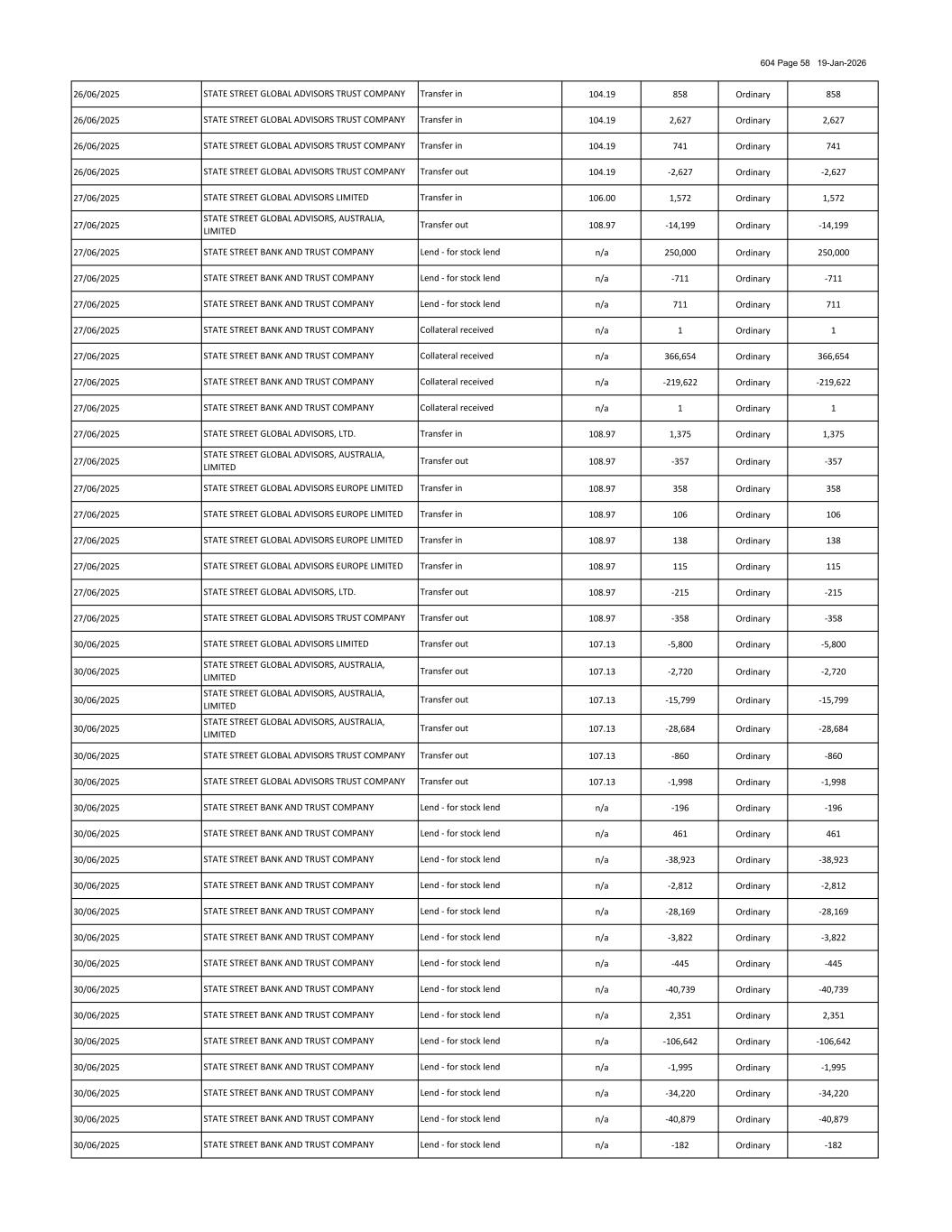 604 Page 57 19-Jan-2026 24/06/2025 n/a 217 Ordinary 217 24/06/2025 n/a -1,237 Ordinary -1,237 24/06/2025 104.94 1,399 Ordinary 1,399 24/06/2025 104.94 -1,062 Ordinary -1,062 24/06/2025 104.94 102 Ordinary 102 24/06/2025 104.94 1,207 Ordinary 1,207 24/06/2025 104.94 -2,647 Ordinary -2,647 24/06/2025 104.94 -1,261 Ordinary -1,261 24/06/2025 104.94 -1,399 Ordinary -1,399 24/06/2025 104.94 -1,207 Ordinary -1,207 25/06/2025 104.95 1,517 Ordinary 1,517 25/06/2025 104.30 1,071 Ordinary 1,071 25/06/2025 104.30 592 Ordinary 592 25/06/2025 104.30 706 Ordinary 706 25/06/2025 104.30 -706 Ordinary -706 25/06/2025 n/a -24,300 Ordinary -24,300 25/06/2025 n/a 192,664 Ordinary 192,664 25/06/2025 n/a -1,264 Ordinary -1,264 25/06/2025 n/a -591 Ordinary -591 25/06/2025 n/a -3,328 Ordinary -3,328 25/06/2025 104.30 45 Ordinary 45 25/06/2025 104.30 -3,132 Ordinary -3,132 25/06/2025 104.30 102 Ordinary 102 25/06/2025 104.30 -592 Ordinary -592 26/06/2025 104.19 -858 Ordinary -858 26/06/2025 104.19 -689 Ordinary -689 26/06/2025 104.19 -397 Ordinary -397 26/06/2025 104.19 -123 Ordinary -123 26/06/2025 104.19 434 Ordinary 434 26/06/2025 104.19 434 Ordinary 434 26/06/2025 104.19 -1,855 Ordinary -1,855 26/06/2025 104.19 -741 Ordinary -741 26/06/2025 n/a -6,991 Ordinary -6,991 26/06/2025 n/a 230,030 Ordinary 230,030 26/06/2025 n/a -7,816 Ordinary -7,816 26/06/2025 n/a 7,816 Ordinary 7,816 26/06/2025 n/a -4,058 Ordinary -4,058 26/06/2025 n/a 4,058 Ordinary 4,058 26/06/2025 n/a -41,490 Ordinary -41,490 26/06/2025 n/a 41,490 Ordinary 41,490 26/06/2025 104.19 330 Ordinary 330 STATE STREET BANK AND TRUST COMPANY Transfer in STATE STREET GLOBAL ADVISORS TRUST COMPANY Transfer out Transfer in Collateral received STATE STREET BANK AND TRUST COMPANY STATE STREET GLOBAL ADVISORS LIMITED SSGA FUNDS MANAGEMENT, INC. STATE STREET GLOBAL ADVISORS (JAPAN) CO., LTD. Transfer in STATE STREET BANK AND TRUST COMPANY Lend - for stock lend Transfer out STATE STREET GLOBAL ADVISORS TRUST COMPANY Transfer out STATE STREET GLOBAL ADVISORS TRUST COMPANY Collateral received Transfer out STATE STREET BANK AND TRUST COMPANY Transfer out STATE STREET BANK AND TRUST COMPANY STATE STREET GLOBAL ADVISORS TRUST COMPANY Transfer out Collateral received STATE STREET GLOBAL ADVISORS TRUST COMPANY SSGA FUNDS MANAGEMENT, INC. Transfer in STATE STREET GLOBAL ADVISORS TRUST COMPANY STATE STREET BANK AND TRUST COMPANY Lend - for stock lend Transfer out Collateral received STATE STREET BANK AND TRUST COMPANY STATE STREET BANK AND TRUST COMPANY Transfer out STATE STREET GLOBAL ADVISORS, AUSTRALIA, LIMITED Transfer in Lend - for stock lend Collateral received SSGA FUNDS MANAGEMENT, INC. STATE STREET BANK AND TRUST COMPANY STATE STREET GLOBAL ADVISORS, AUSTRALIA, LIMITED Lend - for stock lend STATE STREET BANK AND TRUST COMPANY Transfer in STATE STREET GLOBAL ADVISORS, AUSTRALIA, LIMITED STATE STREET BANK AND TRUST COMPANY Transfer out STATE STREET GLOBAL ADVISORS, AUSTRALIA, LIMITED STATE STREET BANK AND TRUST COMPANY Lend - for stock lend Transfer in Transfer in STATE STREET GLOBAL ADVISORS TRUST COMPANY Transfer in Transfer out Transfer out STATE STREET BANK AND TRUST COMPANY STATE STREET GLOBAL ADVISORS, AUSTRALIA, LIMITED Transfer out STATE STREET GLOBAL ADVISORS, AUSTRALIA, LIMITED Lend - for stock lend Transfer out STATE STREET GLOBAL ADVISORS EUROPE LIMITED STATE STREET GLOBAL ADVISORS, AUSTRALIA, LIMITED STATE STREET GLOBAL ADVISORS EUROPE LIMITED Lend - for stock lend Transfer in STATE STREET GLOBAL ADVISORS TRUST COMPANY Transfer out STATE STREET GLOBAL ADVISORS, AUSTRALIA, LIMITED STATE STREET GLOBAL ADVISORS, AUSTRALIA, LIMITED STATE STREET BANK AND TRUST COMPANY Collateral received STATE STREET GLOBAL ADVISORS LIMITED Lend - for stock lend SSGA FUNDS MANAGEMENT, INC. Transfer in STATE STREET BANK AND TRUST COMPANY Transfer in Collateral received