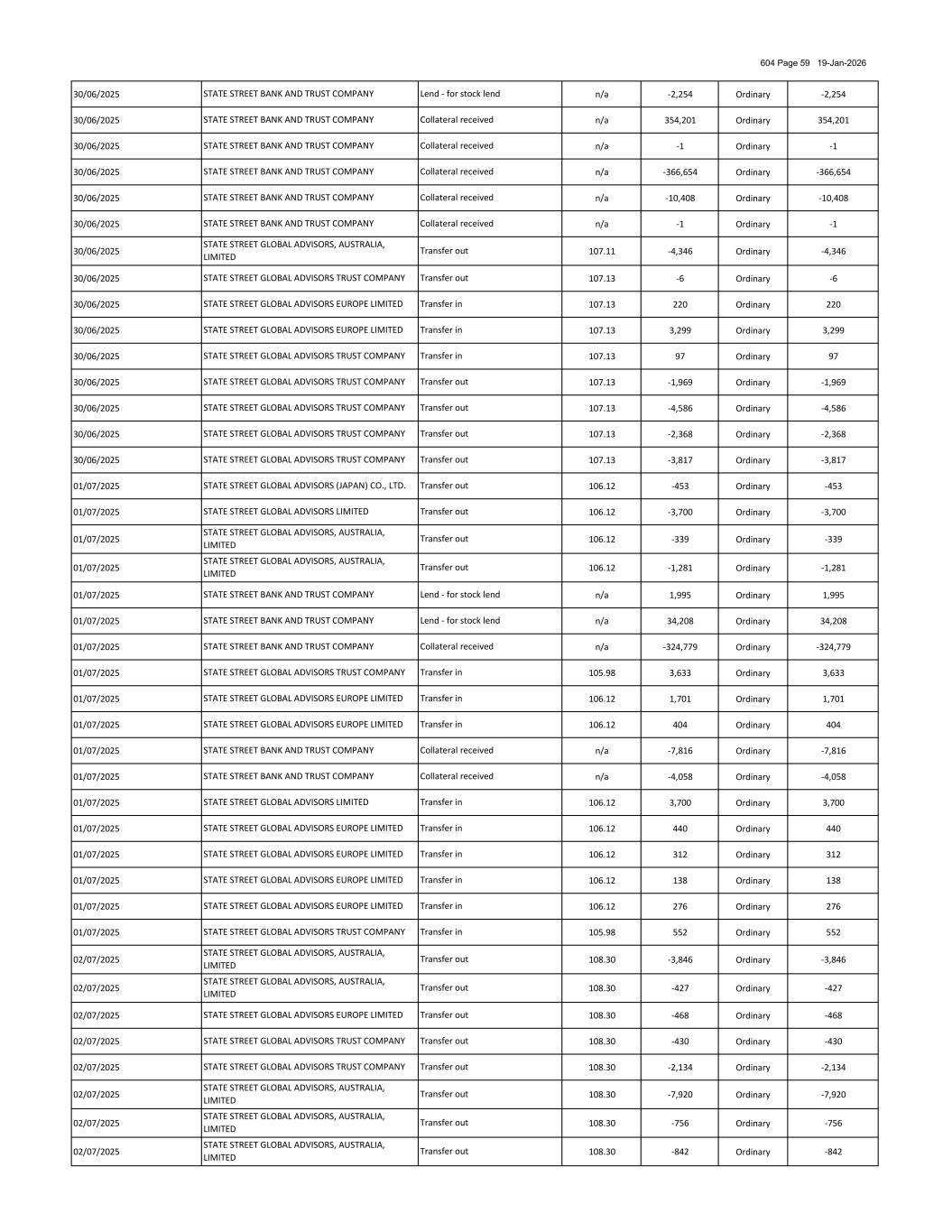 604 Page 59 19-Jan-2026 30/06/2025 n/a -2,254 Ordinary -2,254 30/06/2025 n/a 354,201 Ordinary 354,201 30/06/2025 n/a -1 Ordinary -1 30/06/2025 n/a -366,654 Ordinary -366,654 30/06/2025 n/a -10,408 Ordinary -10,408 30/06/2025 n/a -1 Ordinary -1 30/06/2025 107.11 -4,346 Ordinary -4,346 30/06/2025 107.13 -6 Ordinary -6 30/06/2025 107.13 220 Ordinary 220 30/06/2025 107.13 3,299 Ordinary 3,299 30/06/2025 107.13 97 Ordinary 97 30/06/2025 107.13 -1,969 Ordinary -1,969 30/06/2025 107.13 -4,586 Ordinary -4,586 30/06/2025 107.13 -2,368 Ordinary -2,368 30/06/2025 107.13 -3,817 Ordinary -3,817 01/07/2025 106.12 -453 Ordinary -453 01/07/2025 106.12 -3,700 Ordinary -3,700 01/07/2025 106.12 -339 Ordinary -339 01/07/2025 106.12 -1,281 Ordinary -1,281 01/07/2025 n/a 1,995 Ordinary 1,995 01/07/2025 n/a 34,208 Ordinary 34,208 01/07/2025 n/a -324,779 Ordinary -324,779 01/07/2025 105.98 3,633 Ordinary 3,633 01/07/2025 106.12 1,701 Ordinary 1,701 01/07/2025 106.12 404 Ordinary 404 01/07/2025 n/a -7,816 Ordinary -7,816 01/07/2025 n/a -4,058 Ordinary -4,058 01/07/2025 106.12 3,700 Ordinary 3,700 01/07/2025 106.12 440 Ordinary 440 01/07/2025 106.12 312 Ordinary 312 01/07/2025 106.12 138 Ordinary 138 01/07/2025 106.12 276 Ordinary 276 01/07/2025 105.98 552 Ordinary 552 02/07/2025 108.30 -3,846 Ordinary -3,846 02/07/2025 108.30 -427 Ordinary -427 02/07/2025 108.30 -468 Ordinary -468 02/07/2025 108.30 -430 Ordinary -430 02/07/2025 108.30 -2,134 Ordinary -2,134 02/07/2025 108.30 -7,920 Ordinary -7,920 02/07/2025 108.30 -756 Ordinary -756 02/07/2025 108.30 -842 Ordinary -842 STATE STREET BANK AND TRUST COMPANY Collateral received Transfer out STATE STREET GLOBAL ADVISORS TRUST COMPANY Collateral received Transfer out STATE STREET GLOBAL ADVISORS TRUST COMPANY STATE STREET GLOBAL ADVISORS EUROPE LIMITED Lend - for stock lend Collateral received STATE STREET BANK AND TRUST COMPANY Transfer out STATE STREET GLOBAL ADVISORS EUROPE LIMITED STATE STREET BANK AND TRUST COMPANY STATE STREET GLOBAL ADVISORS (JAPAN) CO., LTD. Transfer out STATE STREET GLOBAL ADVISORS TRUST COMPANY Transfer in Transfer out STATE STREET BANK AND TRUST COMPANY STATE STREET GLOBAL ADVISORS TRUST COMPANY STATE STREET BANK AND TRUST COMPANY Transfer out STATE STREET GLOBAL ADVISORS, AUSTRALIA, LIMITED Transfer out Transfer in Transfer in Collateral received STATE STREET GLOBAL ADVISORS LIMITED STATE STREET GLOBAL ADVISORS, AUSTRALIA, LIMITED Transfer out STATE STREET GLOBAL ADVISORS LIMITED Transfer out Transfer out STATE STREET GLOBAL ADVISORS, AUSTRALIA, LIMITED STATE STREET GLOBAL ADVISORS TRUST COMPANY STATE STREET GLOBAL ADVISORS EUROPE LIMITED Lend - for stock lend STATE STREET GLOBAL ADVISORS, AUSTRALIA, LIMITED Transfer in Transfer in STATE STREET GLOBAL ADVISORS, AUSTRALIA, LIMITED STATE STREET BANK AND TRUST COMPANY STATE STREET GLOBAL ADVISORS, AUSTRALIA, LIMITED Transfer out STATE STREET GLOBAL ADVISORS EUROPE LIMITED STATE STREET GLOBAL ADVISORS EUROPE LIMITED STATE STREET GLOBAL ADVISORS EUROPE LIMITED Collateral received STATE STREET BANK AND TRUST COMPANY Lend - for stock lend Transfer in Transfer in Transfer out STATE STREET GLOBAL ADVISORS TRUST COMPANY Collateral received Transfer in Transfer out STATE STREET GLOBAL ADVISORS EUROPE LIMITED STATE STREET BANK AND TRUST COMPANY STATE STREET BANK AND TRUST COMPANY Transfer in Transfer in STATE STREET GLOBAL ADVISORS EUROPE LIMITED Collateral received STATE STREET BANK AND TRUST COMPANY STATE STREET GLOBAL ADVISORS TRUST COMPANY STATE STREET GLOBAL ADVISORS TRUST COMPANY Transfer out STATE STREET GLOBAL ADVISORS, AUSTRALIA, LIMITED Transfer in Transfer out STATE STREET GLOBAL ADVISORS TRUST COMPANY STATE STREET BANK AND TRUST COMPANY Transfer out Collateral received STATE STREET GLOBAL ADVISORS TRUST COMPANY STATE STREET GLOBAL ADVISORS, AUSTRALIA, LIMITED STATE STREET GLOBAL ADVISORS EUROPE LIMITED Transfer in Transfer out Transfer out