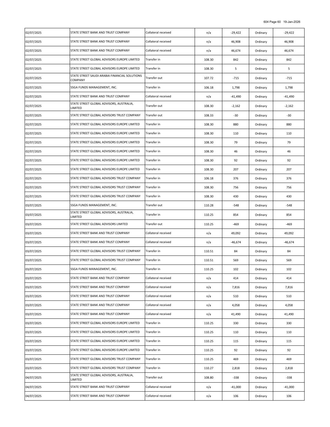 604 Page 60 19-Jan-2026 02/07/2025 n/a -29,422 Ordinary -29,422 02/07/2025 n/a 46,908 Ordinary 46,908 02/07/2025 n/a 46,674 Ordinary 46,674 02/07/2025 108.30 842 Ordinary 842 02/07/2025 108.30 5 Ordinary 5 02/07/2025 107.72 -715 Ordinary -715 02/07/2025 106.18 1,798 Ordinary 1,798 02/07/2025 n/a -41,490 Ordinary -41,490 02/07/2025 108.30 -2,162 Ordinary -2,162 02/07/2025 108.33 -30 Ordinary -30 02/07/2025 108.30 880 Ordinary 880 02/07/2025 108.30 110 Ordinary 110 02/07/2025 108.30 79 Ordinary 79 02/07/2025 108.30 46 Ordinary 46 02/07/2025 108.30 92 Ordinary 92 02/07/2025 108.30 207 Ordinary 207 02/07/2025 106.18 376 Ordinary 376 02/07/2025 108.30 756 Ordinary 756 02/07/2025 108.30 430 Ordinary 430 03/07/2025 110.28 -548 Ordinary -548 03/07/2025 110.25 854 Ordinary 854 03/07/2025 110.25 -469 Ordinary -469 03/07/2025 n/a 49,092 Ordinary 49,092 03/07/2025 n/a -46,674 Ordinary -46,674 03/07/2025 110.51 84 Ordinary 84 03/07/2025 110.51 569 Ordinary 569 03/07/2025 110.25 102 Ordinary 102 03/07/2025 n/a 414 Ordinary 414 03/07/2025 n/a 7,816 Ordinary 7,816 03/07/2025 n/a 510 Ordinary 510 03/07/2025 n/a 4,058 Ordinary 4,058 03/07/2025 n/a 41,490 Ordinary 41,490 03/07/2025 110.25 330 Ordinary 330 03/07/2025 110.25 110 Ordinary 110 03/07/2025 110.25 115 Ordinary 115 03/07/2025 110.25 92 Ordinary 92 03/07/2025 110.25 469 Ordinary 469 03/07/2025 110.27 2,818 Ordinary 2,818 04/07/2025 108.80 -338 Ordinary -338 04/07/2025 n/a -41,000 Ordinary -41,000 04/07/2025 n/a 106 Ordinary 106 STATE STREET GLOBAL ADVISORS TRUST COMPANY SSGA FUNDS MANAGEMENT, INC. STATE STREET BANK AND TRUST COMPANY Collateral received Transfer in STATE STREET BANK AND TRUST COMPANY Collateral received Collateral received STATE STREET SAUDI ARABIA FINANCIAL SOLUTIONS COMPANY Transfer out Collateral received Transfer in STATE STREET BANK AND TRUST COMPANY STATE STREET BANK AND TRUST COMPANY STATE STREET GLOBAL ADVISORS TRUST COMPANY Transfer out STATE STREET BANK AND TRUST COMPANY Transfer out Collateral received STATE STREET GLOBAL ADVISORS TRUST COMPANY STATE STREET GLOBAL ADVISORS, AUSTRALIA, LIMITED Transfer in STATE STREET BANK AND TRUST COMPANY Transfer out Transfer in STATE STREET GLOBAL ADVISORS, AUSTRALIA, LIMITED STATE STREET BANK AND TRUST COMPANY SSGA FUNDS MANAGEMENT, INC. Transfer in STATE STREET GLOBAL ADVISORS LIMITED STATE STREET GLOBAL ADVISORS EUROPE LIMITED Transfer in STATE STREET GLOBAL ADVISORS EUROPE LIMITED Collateral received Collateral received Transfer in STATE STREET GLOBAL ADVISORS EUROPE LIMITED Collateral received STATE STREET BANK AND TRUST COMPANY Transfer in Transfer in Transfer in STATE STREET BANK AND TRUST COMPANY STATE STREET GLOBAL ADVISORS EUROPE LIMITED STATE STREET GLOBAL ADVISORS EUROPE LIMITED Collateral received STATE STREET BANK AND TRUST COMPANY Collateral received Transfer in STATE STREET GLOBAL ADVISORS EUROPE LIMITED STATE STREET BANK AND TRUST COMPANY STATE STREET GLOBAL ADVISORS TRUST COMPANY Transfer in Transfer in STATE STREET GLOBAL ADVISORS EUROPE LIMITED Transfer in Transfer in STATE STREET BANK AND TRUST COMPANY STATE STREET GLOBAL ADVISORS EUROPE LIMITED Collateral received Transfer in Transfer out STATE STREET GLOBAL ADVISORS EUROPE LIMITED STATE STREET GLOBAL ADVISORS TRUST COMPANY STATE STREET GLOBAL ADVISORS EUROPE LIMITED Transfer in STATE STREET GLOBAL ADVISORS TRUST COMPANY Transfer in Transfer in Transfer in STATE STREET GLOBAL ADVISORS TRUST COMPANY STATE STREET GLOBAL ADVISORS, AUSTRALIA, LIMITED STATE STREET BANK AND TRUST COMPANY Transfer in Transfer in Collateral received Collateral received STATE STREET GLOBAL ADVISORS EUROPE LIMITED STATE STREET GLOBAL ADVISORS EUROPE LIMITED STATE STREET GLOBAL ADVISORS TRUST COMPANY Transfer out SSGA FUNDS MANAGEMENT, INC.