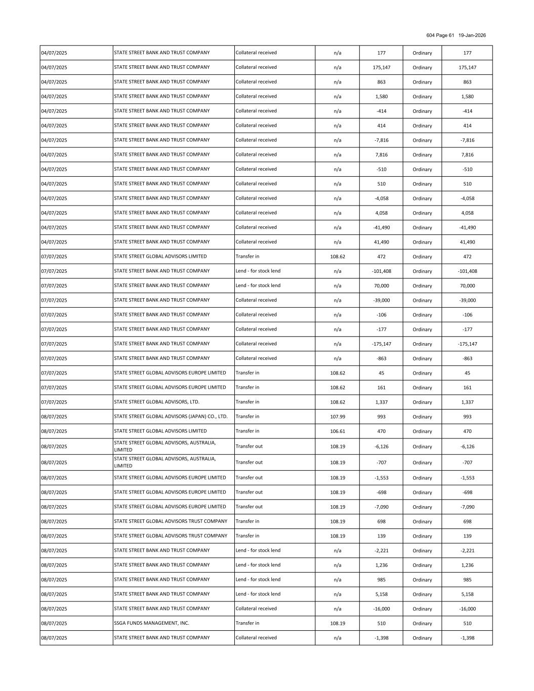 604 Page 61 19-Jan-2026 04/07/2025 n/a 177 Ordinary 177 04/07/2025 n/a 175,147 Ordinary 175,147 04/07/2025 n/a 863 Ordinary 863 04/07/2025 n/a 1,580 Ordinary 1,580 04/07/2025 n/a -414 Ordinary -414 04/07/2025 n/a 414 Ordinary 414 04/07/2025 n/a -7,816 Ordinary -7,816 04/07/2025 n/a 7,816 Ordinary 7,816 04/07/2025 n/a -510 Ordinary -510 04/07/2025 n/a 510 Ordinary 510 04/07/2025 n/a -4,058 Ordinary -4,058 04/07/2025 n/a 4,058 Ordinary 4,058 04/07/2025 n/a -41,490 Ordinary -41,490 04/07/2025 n/a 41,490 Ordinary 41,490 07/07/2025 108.62 472 Ordinary 472 07/07/2025 n/a -101,408 Ordinary -101,408 07/07/2025 n/a 70,000 Ordinary 70,000 07/07/2025 n/a -39,000 Ordinary -39,000 07/07/2025 n/a -106 Ordinary -106 07/07/2025 n/a -177 Ordinary -177 07/07/2025 n/a -175,147 Ordinary -175,147 07/07/2025 n/a -863 Ordinary -863 07/07/2025 108.62 45 Ordinary 45 07/07/2025 108.62 161 Ordinary 161 07/07/2025 108.62 1,337 Ordinary 1,337 08/07/2025 107.99 993 Ordinary 993 08/07/2025 106.61 470 Ordinary 470 08/07/2025 108.19 -6,126 Ordinary -6,126 08/07/2025 108.19 -707 Ordinary -707 08/07/2025 108.19 -1,553 Ordinary -1,553 08/07/2025 108.19 -698 Ordinary -698 08/07/2025 108.19 -7,090 Ordinary -7,090 08/07/2025 108.19 698 Ordinary 698 08/07/2025 108.19 139 Ordinary 139 08/07/2025 n/a -2,221 Ordinary -2,221 08/07/2025 n/a 1,236 Ordinary 1,236 08/07/2025 n/a 985 Ordinary 985 08/07/2025 n/a 5,158 Ordinary 5,158 08/07/2025 n/a -16,000 Ordinary -16,000 08/07/2025 108.19 510 Ordinary 510 08/07/2025 n/a -1,398 Ordinary -1,398 Collateral received STATE STREET GLOBAL ADVISORS TRUST COMPANY Collateral received Transfer in Transfer in STATE STREET BANK AND TRUST COMPANY STATE STREET BANK AND TRUST COMPANY Collateral received STATE STREET GLOBAL ADVISORS EUROPE LIMITED Collateral received STATE STREET BANK AND TRUST COMPANY STATE STREET BANK AND TRUST COMPANY STATE STREET GLOBAL ADVISORS TRUST COMPANY Collateral received STATE STREET GLOBAL ADVISORS EUROPE LIMITED Transfer in Collateral received Lend - for stock lend STATE STREET BANK AND TRUST COMPANY STATE STREET BANK AND TRUST COMPANY Transfer in Lend - for stock lend STATE STREET BANK AND TRUST COMPANY STATE STREET BANK AND TRUST COMPANY Collateral received Collateral received STATE STREET GLOBAL ADVISORS EUROPE LIMITED STATE STREET BANK AND TRUST COMPANY Lend - for stock lend Transfer in STATE STREET GLOBAL ADVISORS (JAPAN) CO., LTD. STATE STREET GLOBAL ADVISORS LIMITED Lend - for stock lend STATE STREET BANK AND TRUST COMPANY Collateral received Transfer in Lend - for stock lend Transfer out STATE STREET BANK AND TRUST COMPANY STATE STREET BANK AND TRUST COMPANY Collateral received STATE STREET GLOBAL ADVISORS, LTD. Transfer in STATE STREET BANK AND TRUST COMPANY STATE STREET BANK AND TRUST COMPANY STATE STREET BANK AND TRUST COMPANY STATE STREET BANK AND TRUST COMPANY Collateral received STATE STREET GLOBAL ADVISORS LIMITED Lend - for stock lend Collateral received STATE STREET BANK AND TRUST COMPANY Collateral received SSGA FUNDS MANAGEMENT, INC. Transfer out Collateral received STATE STREET BANK AND TRUST COMPANY STATE STREET BANK AND TRUST COMPANY Collateral received STATE STREET GLOBAL ADVISORS, AUSTRALIA, LIMITED Collateral received STATE STREET BANK AND TRUST COMPANY Transfer in Transfer out STATE STREET BANK AND TRUST COMPANY STATE STREET BANK AND TRUST COMPANY STATE STREET GLOBAL ADVISORS EUROPE LIMITED STATE STREET BANK AND TRUST COMPANY Collateral received Collateral received Transfer out STATE STREET BANK AND TRUST COMPANY STATE STREET BANK AND TRUST COMPANY Collateral received STATE STREET GLOBAL ADVISORS, AUSTRALIA, LIMITED Transfer in STATE STREET BANK AND TRUST COMPANY STATE STREET BANK AND TRUST COMPANY Collateral received STATE STREET GLOBAL ADVISORS EUROPE LIMITED Transfer out Collateral received
