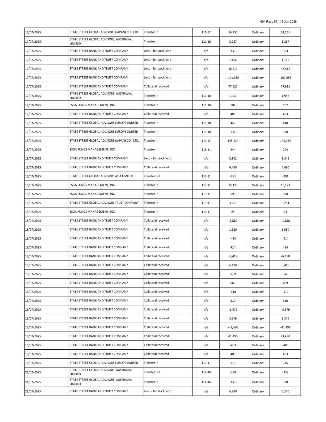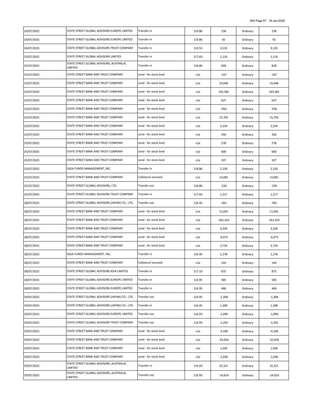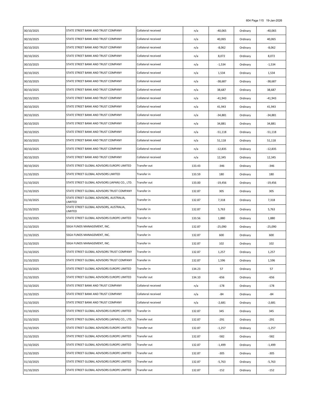 604 Page 69 19-Jan-2026 31/07/2025 n/a 1,792 Ordinary 1,792 31/07/2025 n/a 18,765 Ordinary 18,765 31/07/2025 n/a 45 Ordinary 45 31/07/2025 n/a 2,711 Ordinary 2,711 31/07/2025 n/a 27,048 Ordinary 27,048 31/07/2025 n/a -45 Ordinary -45 31/07/2025 n/a 32,337 Ordinary 32,337 31/07/2025 n/a 52,656 Ordinary 52,656 31/07/2025 n/a 36,878 Ordinary 36,878 31/07/2025 n/a 224,690 Ordinary 224,690 31/07/2025 n/a 109,769 Ordinary 109,769 31/07/2025 n/a 9 Ordinary 9 31/07/2025 n/a 25 Ordinary 25 31/07/2025 n/a 14,084 Ordinary 14,084 31/07/2025 n/a 111 Ordinary 111 31/07/2025 n/a -54,953 Ordinary -54,953 31/07/2025 111.70 238 Ordinary 238 31/07/2025 111.70 1,888 Ordinary 1,888 31/07/2025 112.71 -16 Ordinary -16 31/07/2025 n/a -21 Ordinary -21 31/07/2025 n/a 6,507 Ordinary 6,507 31/07/2025 n/a -828 Ordinary -828 31/07/2025 111.70 -218 Ordinary -218 31/07/2025 111.82 -657 Ordinary -657 01/08/2025 111.40 -927 Ordinary -927 01/08/2025 111.06 -18,135 Ordinary -18,135 01/08/2025 111.19 -16,968 Ordinary -16,968 01/08/2025 111.40 211 Ordinary 211 01/08/2025 110.90 2,005 Ordinary 2,005 01/08/2025 111.40 1,027 Ordinary 1,027 01/08/2025 110.90 612 Ordinary 612 01/08/2025 n/a -81,430 Ordinary -81,430 01/08/2025 n/a -6 Ordinary -6 01/08/2025 n/a -725,855 Ordinary -725,855 01/08/2025 n/a 9,325 Ordinary 9,325 01/08/2025 n/a -158 Ordinary -158 01/08/2025 n/a 158 Ordinary 158 01/08/2025 n/a -9 Ordinary -9 01/08/2025 n/a -25 Ordinary -25 01/08/2025 n/a -14,084 Ordinary -14,084 01/08/2025 n/a -111 Ordinary -111 01/08/2025 n/a 764 Ordinary 764 Collateral received STATE STREET BANK AND TRUST COMPANY STATE STREET GLOBAL ADVISORS (JAPAN) CO., LTD. STATE STREET BANK AND TRUST COMPANY Transfer out STATE STREET BANK AND TRUST COMPANY Lend - for stock lend Collateral received Collateral received STATE STREET BANK AND TRUST COMPANY Transfer in STATE STREET GLOBAL ADVISORS EUROPE LIMITED Lend - for stock lend Transfer in Collateral received STATE STREET BANK AND TRUST COMPANY STATE STREET BANK AND TRUST COMPANY Transfer in Transfer in STATE STREET GLOBAL ADVISORS (JAPAN) CO., LTD. Lend - for stock lend STATE STREET BANK AND TRUST COMPANY STATE STREET BANK AND TRUST COMPANY SSGA FUNDS MANAGEMENT, INC. STATE STREET BANK AND TRUST COMPANY STATE STREET GLOBAL ADVISORS EUROPE LIMITED Transfer out Lend - for stock lend Collateral received Transfer in STATE STREET GLOBAL ADVISORS, LTD. STATE STREET BANK AND TRUST COMPANY Collateral received Lend - for stock lend STATE STREET BANK AND TRUST COMPANY Lend - for stock lend STATE STREET BANK AND TRUST COMPANY Collateral received STATE STREET GLOBAL ADVISORS TRUST COMPANY STATE STREET GLOBAL ADVISORS TRUST COMPANY Collateral received Transfer in STATE STREET BANK AND TRUST COMPANY Lend - for stock lend STATE STREET BANK AND TRUST COMPANY Lend - for stock lend Collateral received STATE STREET BANK AND TRUST COMPANY STATE STREET GLOBAL ADVISORS TRUST COMPANY Lend - for stock lend STATE STREET BANK AND TRUST COMPANY STATE STREET BANK AND TRUST COMPANY Collateral received Lend - for stock lend STATE STREET BANK AND TRUST COMPANY STATE STREET BANK AND TRUST COMPANY STATE STREET BANK AND TRUST COMPANY Lend - for stock lend Transfer out STATE STREET BANK AND TRUST COMPANY Transfer out Lend - for stock lend STATE STREET BANK AND TRUST COMPANY Collateral received STATE STREET BANK AND TRUST COMPANY STATE STREET GLOBAL ADVISORS (JAPAN) CO., LTD. Lend - for stock lend STATE STREET BANK AND TRUST COMPANY STATE STREET BANK AND TRUST COMPANY Lend - for stock lend Collateral received Transfer out STATE STREET GLOBAL ADVISORS LIMITED Lend - for stock lend STATE STREET BANK AND TRUST COMPANY Transfer out STATE STREET BANK AND TRUST COMPANY STATE STREET BANK AND TRUST COMPANY Collateral received STATE STREET BANK AND TRUST COMPANY Lend - for stock lend Lend - for stock lend STATE STREET GLOBAL ADVISORS TRUST COMPANY STATE STREET BANK AND TRUST COMPANY