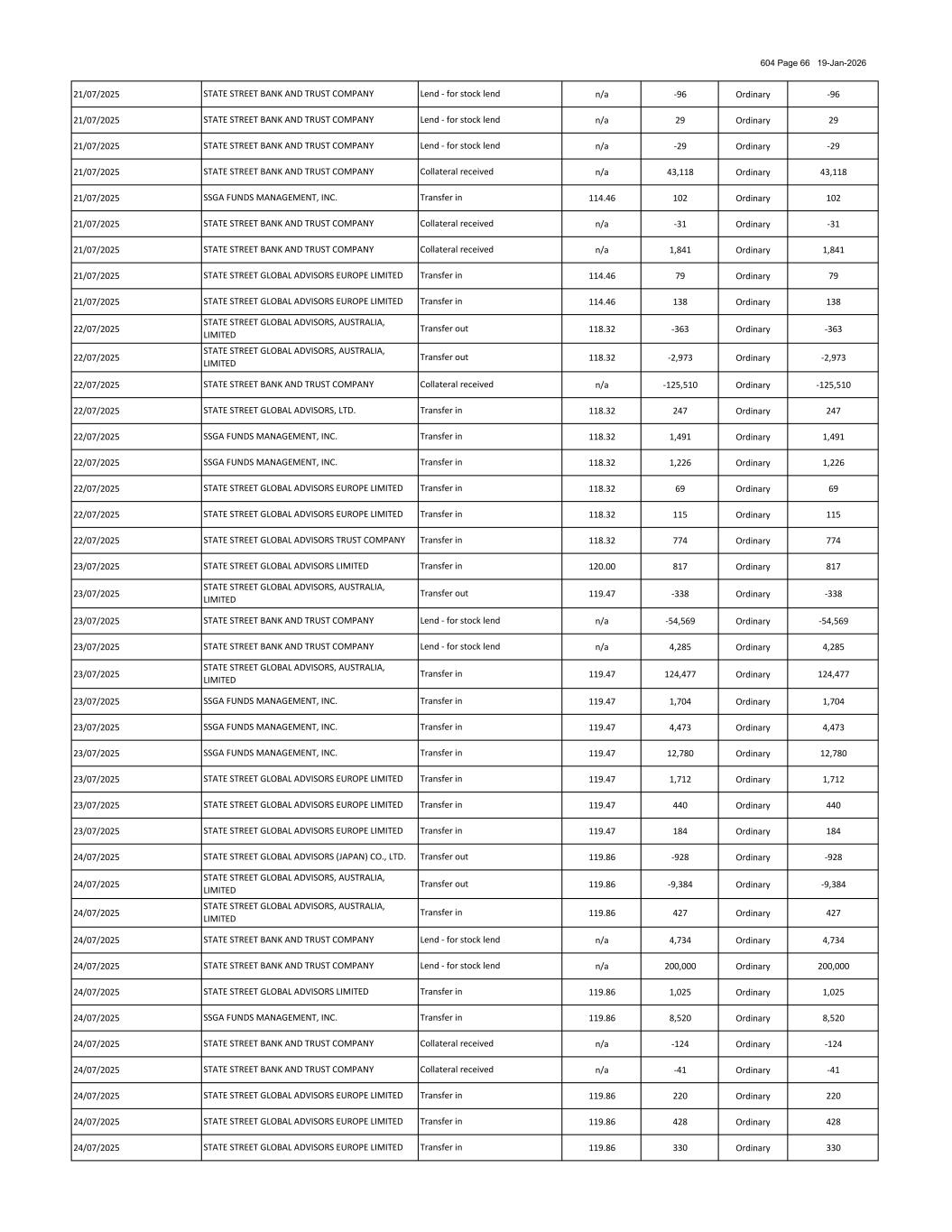 604 Page 66 19-Jan-2026 21/07/2025 n/a -96 Ordinary -96 21/07/2025 n/a 29 Ordinary 29 21/07/2025 n/a -29 Ordinary -29 21/07/2025 n/a 43,118 Ordinary 43,118 21/07/2025 114.46 102 Ordinary 102 21/07/2025 n/a -31 Ordinary -31 21/07/2025 n/a 1,841 Ordinary 1,841 21/07/2025 114.46 79 Ordinary 79 21/07/2025 114.46 138 Ordinary 138 22/07/2025 118.32 -363 Ordinary -363 22/07/2025 118.32 -2,973 Ordinary -2,973 22/07/2025 n/a -125,510 Ordinary -125,510 22/07/2025 118.32 247 Ordinary 247 22/07/2025 118.32 1,491 Ordinary 1,491 22/07/2025 118.32 1,226 Ordinary 1,226 22/07/2025 118.32 69 Ordinary 69 22/07/2025 118.32 115 Ordinary 115 22/07/2025 118.32 774 Ordinary 774 23/07/2025 120.00 817 Ordinary 817 23/07/2025 119.47 -338 Ordinary -338 23/07/2025 n/a -54,569 Ordinary -54,569 23/07/2025 n/a 4,285 Ordinary 4,285 23/07/2025 119.47 124,477 Ordinary 124,477 23/07/2025 119.47 1,704 Ordinary 1,704 23/07/2025 119.47 4,473 Ordinary 4,473 23/07/2025 119.47 12,780 Ordinary 12,780 23/07/2025 119.47 1,712 Ordinary 1,712 23/07/2025 119.47 440 Ordinary 440 23/07/2025 119.47 184 Ordinary 184 24/07/2025 119.86 -928 Ordinary -928 24/07/2025 119.86 -9,384 Ordinary -9,384 24/07/2025 119.86 427 Ordinary 427 24/07/2025 n/a 4,734 Ordinary 4,734 24/07/2025 n/a 200,000 Ordinary 200,000 24/07/2025 119.86 1,025 Ordinary 1,025 24/07/2025 119.86 8,520 Ordinary 8,520 24/07/2025 n/a -124 Ordinary -124 24/07/2025 n/a -41 Ordinary -41 24/07/2025 119.86 220 Ordinary 220 24/07/2025 119.86 428 Ordinary 428 24/07/2025 119.86 330 Ordinary 330 STATE STREET GLOBAL ADVISORS EUROPE LIMITED STATE STREET GLOBAL ADVISORS EUROPE LIMITED SSGA FUNDS MANAGEMENT, INC. Transfer in Collateral received STATE STREET BANK AND TRUST COMPANY Transfer in Transfer in SSGA FUNDS MANAGEMENT, INC. Transfer in STATE STREET BANK AND TRUST COMPANY SSGA FUNDS MANAGEMENT, INC. Transfer out Transfer in STATE STREET GLOBAL ADVISORS EUROPE LIMITED Transfer in STATE STREET BANK AND TRUST COMPANY Transfer in STATE STREET GLOBAL ADVISORS EUROPE LIMITED Collateral received STATE STREET GLOBAL ADVISORS EUROPE LIMITED Transfer in Transfer out STATE STREET GLOBAL ADVISORS EUROPE LIMITED STATE STREET GLOBAL ADVISORS (JAPAN) CO., LTD. Transfer in Transfer out STATE STREET GLOBAL ADVISORS TRUST COMPANY STATE STREET BANK AND TRUST COMPANY Transfer in STATE STREET GLOBAL ADVISORS EUROPE LIMITED Transfer in STATE STREET GLOBAL ADVISORS EUROPE LIMITED STATE STREET GLOBAL ADVISORS EUROPE LIMITED Transfer out Lend - for stock lend STATE STREET GLOBAL ADVISORS, AUSTRALIA, LIMITED STATE STREET GLOBAL ADVISORS, AUSTRALIA, LIMITED STATE STREET GLOBAL ADVISORS, AUSTRALIA, LIMITED STATE STREET GLOBAL ADVISORS LIMITED Transfer in STATE STREET GLOBAL ADVISORS EUROPE LIMITED Lend - for stock lend Transfer in STATE STREET GLOBAL ADVISORS, AUSTRALIA, LIMITED Transfer out STATE STREET BANK AND TRUST COMPANY Lend - for stock lend Lend - for stock lend Lend - for stock lend STATE STREET BANK AND TRUST COMPANY Transfer in STATE STREET BANK AND TRUST COMPANY STATE STREET GLOBAL ADVISORS, AUSTRALIA, LIMITED Transfer in Transfer in STATE STREET GLOBAL ADVISORS, AUSTRALIA, LIMITED STATE STREET BANK AND TRUST COMPANY Collateral received STATE STREET BANK AND TRUST COMPANY Lend - for stock lend STATE STREET BANK AND TRUST COMPANY Lend - for stock lend SSGA FUNDS MANAGEMENT, INC. STATE STREET GLOBAL ADVISORS LIMITED STATE STREET GLOBAL ADVISORS, LTD. Transfer in Transfer in Transfer in STATE STREET BANK AND TRUST COMPANY Transfer in STATE STREET BANK AND TRUST COMPANY Transfer in STATE STREET BANK AND TRUST COMPANY Collateral received SSGA FUNDS MANAGEMENT, INC. Collateral received SSGA FUNDS MANAGEMENT, INC. Transfer in Collateral received SSGA FUNDS MANAGEMENT, INC. Transfer in