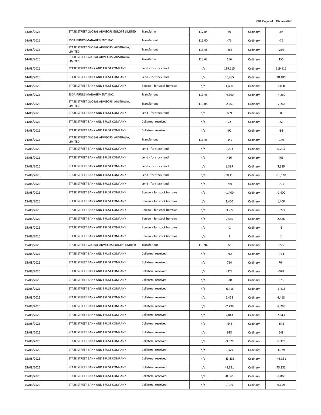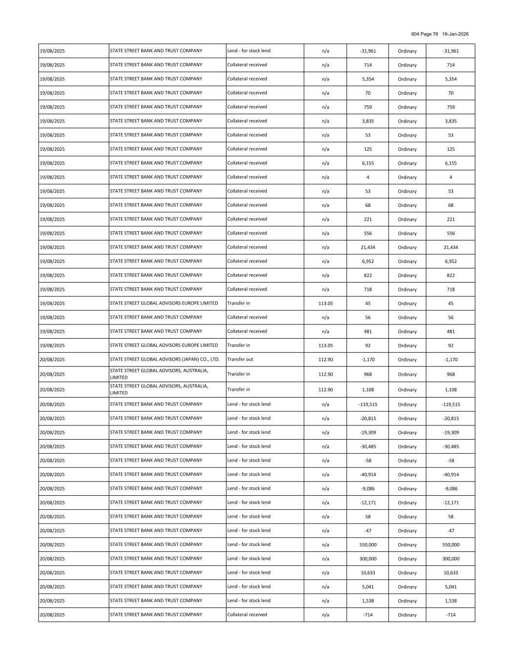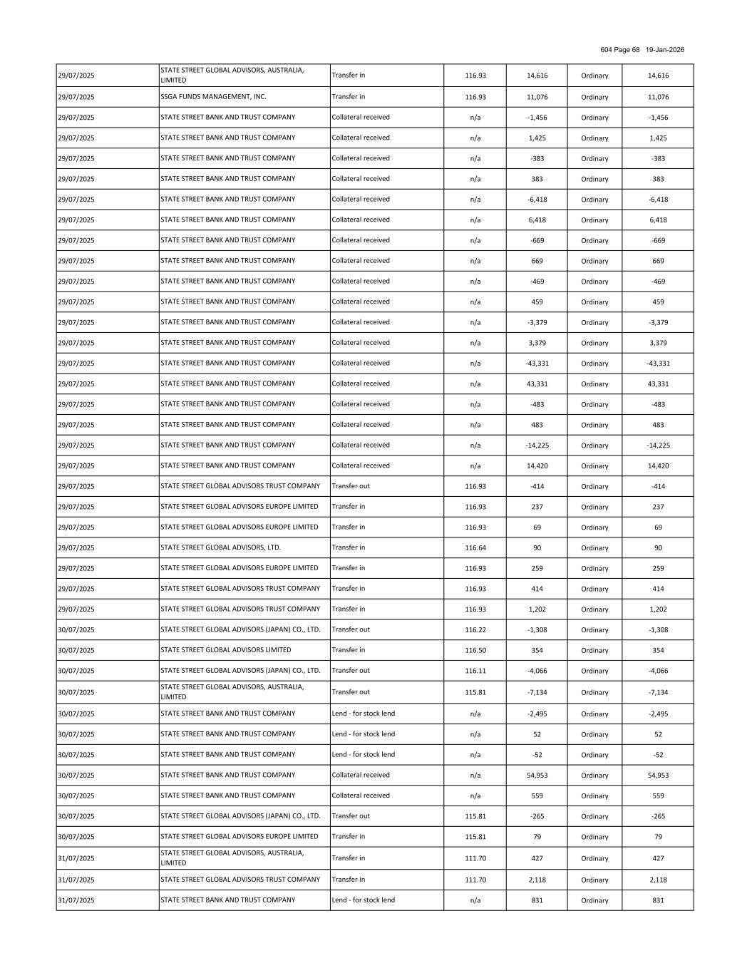 604 Page 76 19-Jan-2026 19/08/2025 n/a -31,961 Ordinary -31,961 19/08/2025 n/a 714 Ordinary 714 19/08/2025 n/a 5,354 Ordinary 5,354 19/08/2025 n/a 70 Ordinary 70 19/08/2025 n/a 759 Ordinary 759 19/08/2025 n/a 3,835 Ordinary 3,835 19/08/2025 n/a 53 Ordinary 53 19/08/2025 n/a 125 Ordinary 125 19/08/2025 n/a 6,155 Ordinary 6,155 19/08/2025 n/a 4 Ordinary 4 19/08/2025 n/a 53 Ordinary 53 19/08/2025 n/a 68 Ordinary 68 19/08/2025 n/a 221 Ordinary 221 19/08/2025 n/a 556 Ordinary 556 19/08/2025 n/a 21,434 Ordinary 21,434 19/08/2025 n/a 6,952 Ordinary 6,952 19/08/2025 n/a 822 Ordinary 822 19/08/2025 n/a 718 Ordinary 718 19/08/2025 113.05 45 Ordinary 45 19/08/2025 n/a 56 Ordinary 56 19/08/2025 n/a 481 Ordinary 481 19/08/2025 113.05 92 Ordinary 92 20/08/2025 112.90 -1,170 Ordinary -1,170 20/08/2025 112.90 968 Ordinary 968 20/08/2025 112.90 1,108 Ordinary 1,108 20/08/2025 n/a -119,515 Ordinary -119,515 20/08/2025 n/a -20,815 Ordinary -20,815 20/08/2025 n/a -19,309 Ordinary -19,309 20/08/2025 n/a -30,485 Ordinary -30,485 20/08/2025 n/a -58 Ordinary -58 20/08/2025 n/a -40,914 Ordinary -40,914 20/08/2025 n/a -9,086 Ordinary -9,086 20/08/2025 n/a -12,171 Ordinary -12,171 20/08/2025 n/a 58 Ordinary 58 20/08/2025 n/a -47 Ordinary -47 20/08/2025 n/a 550,000 Ordinary 550,000 20/08/2025 n/a 300,000 Ordinary 300,000 20/08/2025 n/a 10,633 Ordinary 10,633 20/08/2025 n/a 5,041 Ordinary 5,041 20/08/2025 n/a 1,538 Ordinary 1,538 20/08/2025 n/a -714 Ordinary -714 Lend - for stock lend Collateral received Lend - for stock lend STATE STREET BANK AND TRUST COMPANY Collateral received STATE STREET BANK AND TRUST COMPANY Collateral received STATE STREET BANK AND TRUST COMPANY STATE STREET GLOBAL ADVISORS, AUSTRALIA, LIMITED Lend - for stock lend STATE STREET BANK AND TRUST COMPANY Transfer in Collateral received STATE STREET BANK AND TRUST COMPANY STATE STREET BANK AND TRUST COMPANY Lend - for stock lend Lend - for stock lend Collateral received STATE STREET BANK AND TRUST COMPANY STATE STREET BANK AND TRUST COMPANY STATE STREET GLOBAL ADVISORS, AUSTRALIA, LIMITED STATE STREET BANK AND TRUST COMPANY Collateral received STATE STREET BANK AND TRUST COMPANY Lend - for stock lend STATE STREET BANK AND TRUST COMPANY STATE STREET BANK AND TRUST COMPANY STATE STREET BANK AND TRUST COMPANY Collateral received Lend - for stock lend Collateral received STATE STREET BANK AND TRUST COMPANY Lend - for stock lend Transfer in Lend - for stock lend STATE STREET BANK AND TRUST COMPANY STATE STREET BANK AND TRUST COMPANY Collateral received Collateral received STATE STREET BANK AND TRUST COMPANY STATE STREET BANK AND TRUST COMPANY Collateral received STATE STREET BANK AND TRUST COMPANY Lend - for stock lend STATE STREET BANK AND TRUST COMPANY Collateral received Collateral received STATE STREET BANK AND TRUST COMPANY STATE STREET GLOBAL ADVISORS EUROPE LIMITED Collateral received STATE STREET BANK AND TRUST COMPANY STATE STREET BANK AND TRUST COMPANY Lend - for stock lend STATE STREET BANK AND TRUST COMPANY STATE STREET BANK AND TRUST COMPANY Lend - for stock lend STATE STREET BANK AND TRUST COMPANY STATE STREET BANK AND TRUST COMPANY Collateral received Collateral received STATE STREET BANK AND TRUST COMPANY Lend - for stock lend Collateral received STATE STREET BANK AND TRUST COMPANY STATE STREET GLOBAL ADVISORS EUROPE LIMITED Lend - for stock lend Transfer out Lend - for stock lend STATE STREET BANK AND TRUST COMPANY Collateral received STATE STREET BANK AND TRUST COMPANY Transfer in STATE STREET BANK AND TRUST COMPANY STATE STREET BANK AND TRUST COMPANY STATE STREET BANK AND TRUST COMPANY Collateral received Collateral received STATE STREET BANK AND TRUST COMPANY STATE STREET GLOBAL ADVISORS (JAPAN) CO., LTD. Lend - for stock lend Transfer in STATE STREET BANK AND TRUST COMPANY