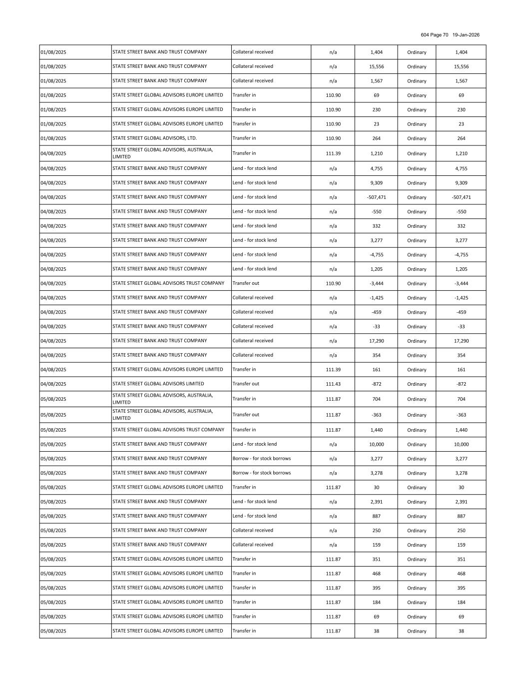 604 Page 70 19-Jan-2026 01/08/2025 n/a 1,404 Ordinary 1,404 01/08/2025 n/a 15,556 Ordinary 15,556 01/08/2025 n/a 1,567 Ordinary 1,567 01/08/2025 110.90 69 Ordinary 69 01/08/2025 110.90 230 Ordinary 230 01/08/2025 110.90 23 Ordinary 23 01/08/2025 110.90 264 Ordinary 264 04/08/2025 111.39 1,210 Ordinary 1,210 04/08/2025 n/a 4,755 Ordinary 4,755 04/08/2025 n/a 9,309 Ordinary 9,309 04/08/2025 n/a -507,471 Ordinary -507,471 04/08/2025 n/a -550 Ordinary -550 04/08/2025 n/a 332 Ordinary 332 04/08/2025 n/a 3,277 Ordinary 3,277 04/08/2025 n/a -4,755 Ordinary -4,755 04/08/2025 n/a 1,205 Ordinary 1,205 04/08/2025 110.90 -3,444 Ordinary -3,444 04/08/2025 n/a -1,425 Ordinary -1,425 04/08/2025 n/a -459 Ordinary -459 04/08/2025 n/a -33 Ordinary -33 04/08/2025 n/a 17,290 Ordinary 17,290 04/08/2025 n/a 354 Ordinary 354 04/08/2025 111.39 161 Ordinary 161 04/08/2025 111.43 -872 Ordinary -872 05/08/2025 111.87 704 Ordinary 704 05/08/2025 111.87 -363 Ordinary -363 05/08/2025 111.87 1,440 Ordinary 1,440 05/08/2025 n/a 10,000 Ordinary 10,000 05/08/2025 n/a 3,277 Ordinary 3,277 05/08/2025 n/a 3,278 Ordinary 3,278 05/08/2025 111.87 30 Ordinary 30 05/08/2025 n/a 2,391 Ordinary 2,391 05/08/2025 n/a 887 Ordinary 887 05/08/2025 n/a 250 Ordinary 250 05/08/2025 n/a 159 Ordinary 159 05/08/2025 111.87 351 Ordinary 351 05/08/2025 111.87 468 Ordinary 468 05/08/2025 111.87 395 Ordinary 395 05/08/2025 111.87 184 Ordinary 184 05/08/2025 111.87 69 Ordinary 69 05/08/2025 111.87 38 Ordinary 38 Transfer in Collateral received STATE STREET GLOBAL ADVISORS EUROPE LIMITED STATE STREET BANK AND TRUST COMPANY STATE STREET BANK AND TRUST COMPANY Transfer in STATE STREET GLOBAL ADVISORS EUROPE LIMITED Borrow - for stock borrows STATE STREET GLOBAL ADVISORS TRUST COMPANY STATE STREET GLOBAL ADVISORS EUROPE LIMITED Collateral received Transfer in STATE STREET BANK AND TRUST COMPANY STATE STREET GLOBAL ADVISORS, AUSTRALIA, LIMITED Lend - for stock lend STATE STREET BANK AND TRUST COMPANY STATE STREET GLOBAL ADVISORS EUROPE LIMITED STATE STREET BANK AND TRUST COMPANY Collateral received Transfer in STATE STREET GLOBAL ADVISORS, LTD. Lend - for stock lend Collateral received STATE STREET BANK AND TRUST COMPANY Lend - for stock lend STATE STREET GLOBAL ADVISORS EUROPE LIMITED Lend - for stock lend STATE STREET BANK AND TRUST COMPANY STATE STREET BANK AND TRUST COMPANY Collateral received STATE STREET BANK AND TRUST COMPANY Collateral received STATE STREET BANK AND TRUST COMPANY Collateral received Lend - for stock lend Transfer in STATE STREET BANK AND TRUST COMPANY Lend - for stock lend STATE STREET BANK AND TRUST COMPANY STATE STREET BANK AND TRUST COMPANY Transfer in STATE STREET GLOBAL ADVISORS EUROPE LIMITED Collateral received STATE STREET BANK AND TRUST COMPANY STATE STREET BANK AND TRUST COMPANY Transfer out Lend - for stock lend Collateral received STATE STREET BANK AND TRUST COMPANY STATE STREET GLOBAL ADVISORS EUROPE LIMITED Transfer out Transfer in Lend - for stock lend Transfer in Transfer in STATE STREET GLOBAL ADVISORS LIMITED STATE STREET BANK AND TRUST COMPANY STATE STREET BANK AND TRUST COMPANY STATE STREET BANK AND TRUST COMPANY Collateral received Lend - for stock lend STATE STREET GLOBAL ADVISORS EUROPE LIMITED STATE STREET BANK AND TRUST COMPANY Lend - for stock lend STATE STREET GLOBAL ADVISORS EUROPE LIMITED Transfer in Transfer in STATE STREET GLOBAL ADVISORS, AUSTRALIA, LIMITED Transfer in STATE STREET BANK AND TRUST COMPANY STATE STREET GLOBAL ADVISORS, AUSTRALIA, LIMITED STATE STREET BANK AND TRUST COMPANY Transfer in Borrow - for stock borrows STATE STREET BANK AND TRUST COMPANY STATE STREET GLOBAL ADVISORS EUROPE LIMITED Transfer out STATE STREET GLOBAL ADVISORS EUROPE LIMITED STATE STREET GLOBAL ADVISORS TRUST COMPANY Transfer in Transfer in Lend - for stock lend