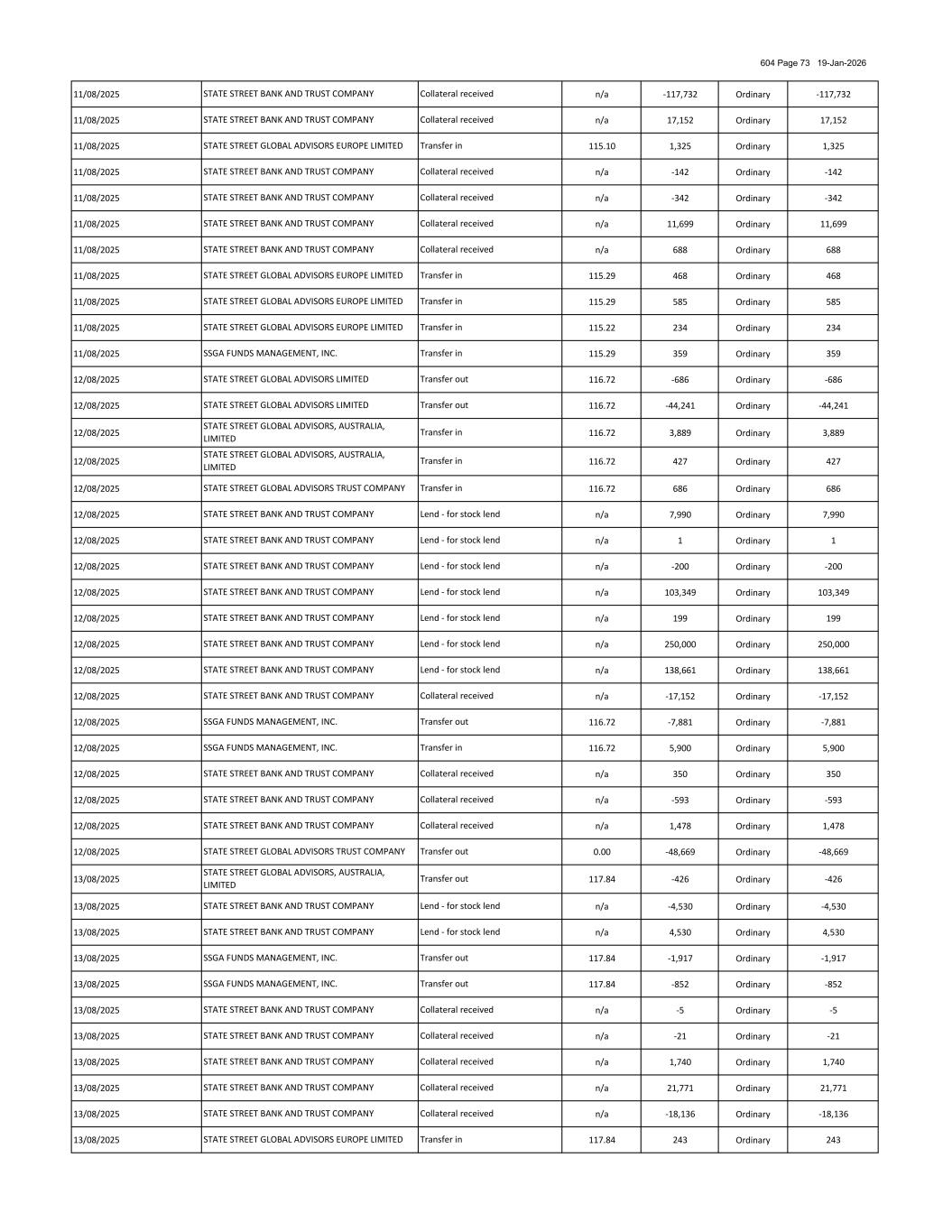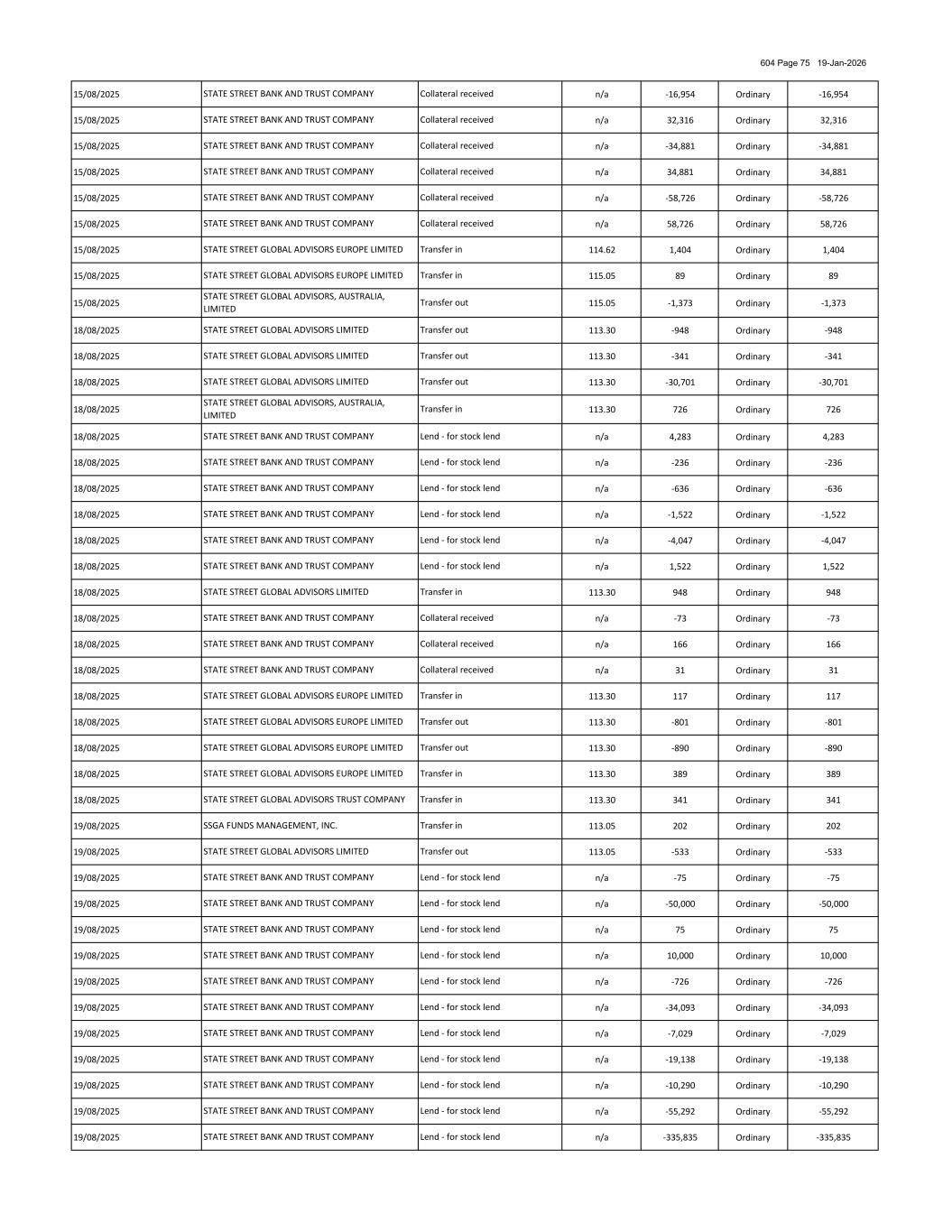 604 Page 73 19-Jan-2026 11/08/2025 n/a -117,732 Ordinary -117,732 11/08/2025 n/a 17,152 Ordinary 17,152 11/08/2025 115.10 1,325 Ordinary 1,325 11/08/2025 n/a -142 Ordinary -142 11/08/2025 n/a -342 Ordinary -342 11/08/2025 n/a 11,699 Ordinary 11,699 11/08/2025 n/a 688 Ordinary 688 11/08/2025 115.29 468 Ordinary 468 11/08/2025 115.29 585 Ordinary 585 11/08/2025 115.22 234 Ordinary 234 11/08/2025 115.29 359 Ordinary 359 12/08/2025 116.72 -686 Ordinary -686 12/08/2025 116.72 -44,241 Ordinary -44,241 12/08/2025 116.72 3,889 Ordinary 3,889 12/08/2025 116.72 427 Ordinary 427 12/08/2025 116.72 686 Ordinary 686 12/08/2025 n/a 7,990 Ordinary 7,990 12/08/2025 n/a 1 Ordinary 1 12/08/2025 n/a -200 Ordinary -200 12/08/2025 n/a 103,349 Ordinary 103,349 12/08/2025 n/a 199 Ordinary 199 12/08/2025 n/a 250,000 Ordinary 250,000 12/08/2025 n/a 138,661 Ordinary 138,661 12/08/2025 n/a -17,152 Ordinary -17,152 12/08/2025 116.72 -7,881 Ordinary -7,881 12/08/2025 116.72 5,900 Ordinary 5,900 12/08/2025 n/a 350 Ordinary 350 12/08/2025 n/a -593 Ordinary -593 12/08/2025 n/a 1,478 Ordinary 1,478 12/08/2025 0.00 -48,669 Ordinary -48,669 13/08/2025 117.84 -426 Ordinary -426 13/08/2025 n/a -4,530 Ordinary -4,530 13/08/2025 n/a 4,530 Ordinary 4,530 13/08/2025 117.84 -1,917 Ordinary -1,917 13/08/2025 117.84 -852 Ordinary -852 13/08/2025 n/a -5 Ordinary -5 13/08/2025 n/a -21 Ordinary -21 13/08/2025 n/a 1,740 Ordinary 1,740 13/08/2025 n/a 21,771 Ordinary 21,771 13/08/2025 n/a -18,136 Ordinary -18,136 13/08/2025 117.84 243 Ordinary 243 STATE STREET BANK AND TRUST COMPANY Collateral received Transfer in STATE STREET BANK AND TRUST COMPANY STATE STREET GLOBAL ADVISORS, AUSTRALIA, LIMITED SSGA FUNDS MANAGEMENT, INC. Collateral received Collateral received STATE STREET GLOBAL ADVISORS EUROPE LIMITED STATE STREET GLOBAL ADVISORS, AUSTRALIA, LIMITED Collateral received Collateral received Lend - for stock lend STATE STREET BANK AND TRUST COMPANY STATE STREET BANK AND TRUST COMPANY STATE STREET BANK AND TRUST COMPANY Collateral received STATE STREET GLOBAL ADVISORS TRUST COMPANY STATE STREET BANK AND TRUST COMPANY Collateral received Lend - for stock lend Collateral received Transfer in STATE STREET BANK AND TRUST COMPANY STATE STREET BANK AND TRUST COMPANY Transfer out STATE STREET BANK AND TRUST COMPANY STATE STREET BANK AND TRUST COMPANY Lend - for stock lend STATE STREET BANK AND TRUST COMPANY STATE STREET BANK AND TRUST COMPANY Collateral received STATE STREET BANK AND TRUST COMPANY STATE STREET BANK AND TRUST COMPANY STATE STREET GLOBAL ADVISORS TRUST COMPANY STATE STREET GLOBAL ADVISORS EUROPE LIMITED Transfer out Transfer in Lend - for stock lend Transfer in Lend - for stock lend STATE STREET BANK AND TRUST COMPANY Transfer in Lend - for stock lend STATE STREET BANK AND TRUST COMPANY STATE STREET GLOBAL ADVISORS EUROPE LIMITED Lend - for stock lend Lend - for stock lend Transfer in STATE STREET GLOBAL ADVISORS, AUSTRALIA, LIMITED STATE STREET GLOBAL ADVISORS EUROPE LIMITED SSGA FUNDS MANAGEMENT, INC. STATE STREET BANK AND TRUST COMPANY Lend - for stock lend Collateral received Transfer out STATE STREET BANK AND TRUST COMPANY Transfer out STATE STREET BANK AND TRUST COMPANY STATE STREET GLOBAL ADVISORS EUROPE LIMITED Transfer out Collateral received STATE STREET GLOBAL ADVISORS LIMITED STATE STREET BANK AND TRUST COMPANY Transfer out Collateral received STATE STREET BANK AND TRUST COMPANY SSGA FUNDS MANAGEMENT, INC. Collateral received Transfer out STATE STREET BANK AND TRUST COMPANY Collateral received Transfer in SSGA FUNDS MANAGEMENT, INC. Collateral received Transfer in STATE STREET BANK AND TRUST COMPANY STATE STREET GLOBAL ADVISORS LIMITED Transfer in SSGA FUNDS MANAGEMENT, INC. Transfer in STATE STREET BANK AND TRUST COMPANY