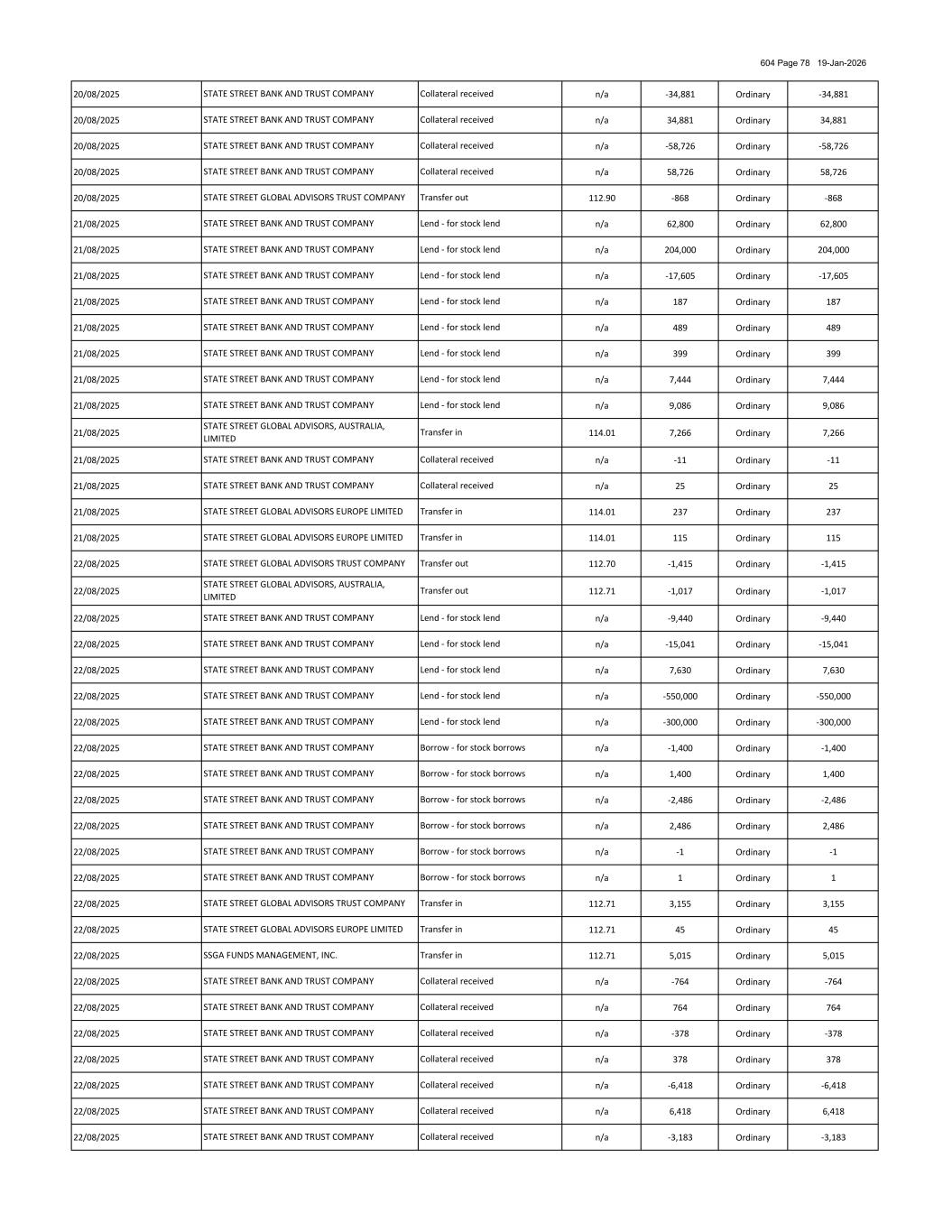 604 Page 78 19-Jan-2026 20/08/2025 n/a -34,881 Ordinary -34,881 20/08/2025 n/a 34,881 Ordinary 34,881 20/08/2025 n/a -58,726 Ordinary -58,726 20/08/2025 n/a 58,726 Ordinary 58,726 20/08/2025 112.90 -868 Ordinary -868 21/08/2025 n/a 62,800 Ordinary 62,800 21/08/2025 n/a 204,000 Ordinary 204,000 21/08/2025 n/a -17,605 Ordinary -17,605 21/08/2025 n/a 187 Ordinary 187 21/08/2025 n/a 489 Ordinary 489 21/08/2025 n/a 399 Ordinary 399 21/08/2025 n/a 7,444 Ordinary 7,444 21/08/2025 n/a 9,086 Ordinary 9,086 21/08/2025 114.01 7,266 Ordinary 7,266 21/08/2025 n/a -11 Ordinary -11 21/08/2025 n/a 25 Ordinary 25 21/08/2025 114.01 237 Ordinary 237 21/08/2025 114.01 115 Ordinary 115 22/08/2025 112.70 -1,415 Ordinary -1,415 22/08/2025 112.71 -1,017 Ordinary -1,017 22/08/2025 n/a -9,440 Ordinary -9,440 22/08/2025 n/a -15,041 Ordinary -15,041 22/08/2025 n/a 7,630 Ordinary 7,630 22/08/2025 n/a -550,000 Ordinary -550,000 22/08/2025 n/a -300,000 Ordinary -300,000 22/08/2025 n/a -1,400 Ordinary -1,400 22/08/2025 n/a 1,400 Ordinary 1,400 22/08/2025 n/a -2,486 Ordinary -2,486 22/08/2025 n/a 2,486 Ordinary 2,486 22/08/2025 n/a -1 Ordinary -1 22/08/2025 n/a 1 Ordinary 1 22/08/2025 112.71 3,155 Ordinary 3,155 22/08/2025 112.71 45 Ordinary 45 22/08/2025 112.71 5,015 Ordinary 5,015 22/08/2025 n/a -764 Ordinary -764 22/08/2025 n/a 764 Ordinary 764 22/08/2025 n/a -378 Ordinary -378 22/08/2025 n/a 378 Ordinary 378 22/08/2025 n/a -6,418 Ordinary -6,418 22/08/2025 n/a 6,418 Ordinary 6,418 22/08/2025 n/a -3,183 Ordinary -3,183 Transfer in Lend - for stock lend STATE STREET BANK AND TRUST COMPANY Transfer out STATE STREET BANK AND TRUST COMPANY Lend - for stock lend Lend - for stock lend STATE STREET GLOBAL ADVISORS TRUST COMPANY STATE STREET BANK AND TRUST COMPANY Borrow - for stock borrows STATE STREET GLOBAL ADVISORS TRUST COMPANY STATE STREET BANK AND TRUST COMPANY Transfer in Lend - for stock lend STATE STREET BANK AND TRUST COMPANY STATE STREET BANK AND TRUST COMPANY Lend - for stock lend STATE STREET GLOBAL ADVISORS, AUSTRALIA, LIMITED STATE STREET GLOBAL ADVISORS EUROPE LIMITED Lend - for stock lend Collateral received STATE STREET BANK AND TRUST COMPANY STATE STREET BANK AND TRUST COMPANY Transfer in Lend - for stock lend STATE STREET BANK AND TRUST COMPANY Collateral received Lend - for stock lend STATE STREET BANK AND TRUST COMPANY Transfer in STATE STREET BANK AND TRUST COMPANY SSGA FUNDS MANAGEMENT, INC. STATE STREET BANK AND TRUST COMPANY Collateral received Collateral received STATE STREET BANK AND TRUST COMPANY STATE STREET BANK AND TRUST COMPANY Lend - for stock lend Lend - for stock lend STATE STREET BANK AND TRUST COMPANY Collateral received STATE STREET GLOBAL ADVISORS, AUSTRALIA, LIMITED STATE STREET BANK AND TRUST COMPANY Borrow - for stock borrows Collateral received STATE STREET BANK AND TRUST COMPANY Collateral received Collateral received STATE STREET BANK AND TRUST COMPANY STATE STREET BANK AND TRUST COMPANY Collateral received STATE STREET BANK AND TRUST COMPANY STATE STREET BANK AND TRUST COMPANY STATE STREET BANK AND TRUST COMPANY STATE STREET BANK AND TRUST COMPANY Borrow - for stock borrows Collateral received Transfer out Collateral received Borrow - for stock borrows STATE STREET BANK AND TRUST COMPANY Transfer in Lend - for stock lend STATE STREET BANK AND TRUST COMPANY Collateral received STATE STREET BANK AND TRUST COMPANY STATE STREET GLOBAL ADVISORS TRUST COMPANY Borrow - for stock borrows Transfer in STATE STREET BANK AND TRUST COMPANY STATE STREET BANK AND TRUST COMPANY Lend - for stock lend STATE STREET GLOBAL ADVISORS EUROPE LIMITED STATE STREET BANK AND TRUST COMPANY STATE STREET BANK AND TRUST COMPANY Transfer out STATE STREET BANK AND TRUST COMPANY Lend - for stock lend Collateral received Borrow - for stock borrows STATE STREET GLOBAL ADVISORS EUROPE LIMITED STATE STREET BANK AND TRUST COMPANY