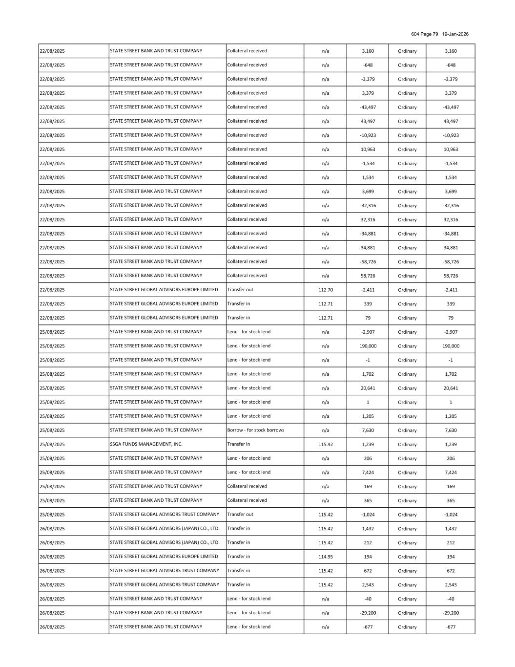 604 Page 79 19-Jan-2026 22/08/2025 n/a 3,160 Ordinary 3,160 22/08/2025 n/a -648 Ordinary -648 22/08/2025 n/a -3,379 Ordinary -3,379 22/08/2025 n/a 3,379 Ordinary 3,379 22/08/2025 n/a -43,497 Ordinary -43,497 22/08/2025 n/a 43,497 Ordinary 43,497 22/08/2025 n/a -10,923 Ordinary -10,923 22/08/2025 n/a 10,963 Ordinary 10,963 22/08/2025 n/a -1,534 Ordinary -1,534 22/08/2025 n/a 1,534 Ordinary 1,534 22/08/2025 n/a 3,699 Ordinary 3,699 22/08/2025 n/a -32,316 Ordinary -32,316 22/08/2025 n/a 32,316 Ordinary 32,316 22/08/2025 n/a -34,881 Ordinary -34,881 22/08/2025 n/a 34,881 Ordinary 34,881 22/08/2025 n/a -58,726 Ordinary -58,726 22/08/2025 n/a 58,726 Ordinary 58,726 22/08/2025 112.70 -2,411 Ordinary -2,411 22/08/2025 112.71 339 Ordinary 339 22/08/2025 112.71 79 Ordinary 79 25/08/2025 n/a -2,907 Ordinary -2,907 25/08/2025 n/a 190,000 Ordinary 190,000 25/08/2025 n/a -1 Ordinary -1 25/08/2025 n/a 1,702 Ordinary 1,702 25/08/2025 n/a 20,641 Ordinary 20,641 25/08/2025 n/a 1 Ordinary 1 25/08/2025 n/a 1,205 Ordinary 1,205 25/08/2025 n/a 7,630 Ordinary 7,630 25/08/2025 115.42 1,239 Ordinary 1,239 25/08/2025 n/a 206 Ordinary 206 25/08/2025 n/a 7,424 Ordinary 7,424 25/08/2025 n/a 169 Ordinary 169 25/08/2025 n/a 365 Ordinary 365 25/08/2025 115.42 -1,024 Ordinary -1,024 26/08/2025 115.42 1,432 Ordinary 1,432 26/08/2025 115.42 212 Ordinary 212 26/08/2025 114.95 194 Ordinary 194 26/08/2025 115.42 672 Ordinary 672 26/08/2025 115.42 2,543 Ordinary 2,543 26/08/2025 n/a -40 Ordinary -40 26/08/2025 n/a -29,200 Ordinary -29,200 26/08/2025 n/a -677 Ordinary -677 Collateral received STATE STREET GLOBAL ADVISORS TRUST COMPANY STATE STREET BANK AND TRUST COMPANY STATE STREET BANK AND TRUST COMPANY Transfer in Lend - for stock lend Collateral received STATE STREET BANK AND TRUST COMPANY Collateral received STATE STREET BANK AND TRUST COMPANY STATE STREET BANK AND TRUST COMPANY Transfer in Collateral received STATE STREET BANK AND TRUST COMPANY STATE STREET BANK AND TRUST COMPANY STATE STREET BANK AND TRUST COMPANY Transfer in Lend - for stock lend Collateral received STATE STREET GLOBAL ADVISORS (JAPAN) CO., LTD. STATE STREET BANK AND TRUST COMPANY Lend - for stock lend STATE STREET GLOBAL ADVISORS EUROPE LIMITED Collateral received Collateral received Transfer in STATE STREET BANK AND TRUST COMPANY STATE STREET BANK AND TRUST COMPANY STATE STREET BANK AND TRUST COMPANY Lend - for stock lend Collateral received STATE STREET GLOBAL ADVISORS (JAPAN) CO., LTD. Collateral received STATE STREET BANK AND TRUST COMPANY STATE STREET BANK AND TRUST COMPANY Borrow - for stock borrows Collateral received Collateral received STATE STREET GLOBAL ADVISORS TRUST COMPANY STATE STREET BANK AND TRUST COMPANY Transfer in STATE STREET BANK AND TRUST COMPANY STATE STREET BANK AND TRUST COMPANY STATE STREET BANK AND TRUST COMPANY Lend - for stock lend Lend - for stock lend STATE STREET BANK AND TRUST COMPANY STATE STREET BANK AND TRUST COMPANY Transfer out STATE STREET GLOBAL ADVISORS TRUST COMPANY Collateral received STATE STREET BANK AND TRUST COMPANY Lend - for stock lend Transfer in STATE STREET BANK AND TRUST COMPANY Transfer in Collateral received STATE STREET BANK AND TRUST COMPANY STATE STREET GLOBAL ADVISORS EUROPE LIMITED Lend - for stock lend Transfer in Lend - for stock lend STATE STREET GLOBAL ADVISORS EUROPE LIMITED STATE STREET BANK AND TRUST COMPANY Collateral received STATE STREET BANK AND TRUST COMPANY SSGA FUNDS MANAGEMENT, INC. STATE STREET BANK AND TRUST COMPANY STATE STREET BANK AND TRUST COMPANY Collateral received STATE STREET BANK AND TRUST COMPANY STATE STREET GLOBAL ADVISORS EUROPE LIMITED Collateral received Lend - for stock lend STATE STREET BANK AND TRUST COMPANY Transfer out Collateral received Lend - for stock lend Collateral received STATE STREET BANK AND TRUST COMPANY STATE STREET BANK AND TRUST COMPANY STATE STREET BANK AND TRUST COMPANY Collateral received Lend - for stock lend