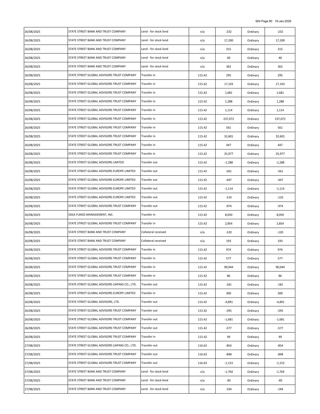604 Page 80 19-Jan-2026 26/08/2025 n/a -232 Ordinary -232 26/08/2025 n/a 17,200 Ordinary 17,200 26/08/2025 n/a 315 Ordinary 315 26/08/2025 n/a 40 Ordinary 40 26/08/2025 n/a 362 Ordinary 362 26/08/2025 115.42 295 Ordinary 295 26/08/2025 115.42 17,103 Ordinary 17,103 26/08/2025 115.42 1,681 Ordinary 1,681 26/08/2025 115.42 1,288 Ordinary 1,288 26/08/2025 115.42 1,114 Ordinary 1,114 26/08/2025 115.42 237,072 Ordinary 237,072 26/08/2025 115.42 561 Ordinary 561 26/08/2025 115.42 32,601 Ordinary 32,601 26/08/2025 115.42 447 Ordinary 447 26/08/2025 115.42 25,977 Ordinary 25,977 26/08/2025 115.42 -1,288 Ordinary -1,288 26/08/2025 115.42 -561 Ordinary -561 26/08/2025 115.42 -447 Ordinary -447 26/08/2025 115.42 -1,114 Ordinary -1,114 26/08/2025 115.42 -110 Ordinary -110 26/08/2025 115.42 -974 Ordinary -974 26/08/2025 115.42 8,050 Ordinary 8,050 26/08/2025 115.42 2,854 Ordinary 2,854 26/08/2025 n/a -120 Ordinary -120 26/08/2025 n/a 193 Ordinary 193 26/08/2025 115.42 974 Ordinary 974 26/08/2025 115.42 577 Ordinary 577 26/08/2025 115.42 90,044 Ordinary 90,044 26/08/2025 115.42 86 Ordinary 86 26/08/2025 115.42 -181 Ordinary -181 26/08/2025 115.42 300 Ordinary 300 26/08/2025 115.42 -4,891 Ordinary -4,891 26/08/2025 115.42 -295 Ordinary -295 26/08/2025 115.42 -1,681 Ordinary -1,681 26/08/2025 115.42 -577 Ordinary -577 26/08/2025 115.42 49 Ordinary 49 27/08/2025 116.63 -854 Ordinary -854 27/08/2025 116.63 -848 Ordinary -848 27/08/2025 116.63 -1,153 Ordinary -1,153 27/08/2025 n/a -1,764 Ordinary -1,764 27/08/2025 n/a -85 Ordinary -85 27/08/2025 n/a -194 Ordinary -194 Transfer out Transfer in STATE STREET GLOBAL ADVISORS TRUST COMPANY STATE STREET BANK AND TRUST COMPANY Transfer in Transfer in STATE STREET BANK AND TRUST COMPANY Lend - for stock lend STATE STREET GLOBAL ADVISORS TRUST COMPANY Transfer out Transfer out STATE STREET GLOBAL ADVISORS TRUST COMPANY STATE STREET GLOBAL ADVISORS TRUST COMPANY Transfer in Transfer out Transfer in STATE STREET GLOBAL ADVISORS TRUST COMPANY STATE STREET BANK AND TRUST COMPANY Transfer out Lend - for stock lend STATE STREET GLOBAL ADVISORS (JAPAN) CO., LTD. STATE STREET GLOBAL ADVISORS TRUST COMPANY STATE STREET GLOBAL ADVISORS TRUST COMPANY STATE STREET GLOBAL ADVISORS EUROPE LIMITED Transfer out Transfer in STATE STREET GLOBAL ADVISORS TRUST COMPANY STATE STREET GLOBAL ADVISORS TRUST COMPANY STATE STREET GLOBAL ADVISORS LIMITED Lend - for stock lend Transfer in STATE STREET BANK AND TRUST COMPANY Lend - for stock lend Transfer in Transfer out STATE STREET GLOBAL ADVISORS TRUST COMPANY STATE STREET BANK AND TRUST COMPANY STATE STREET GLOBAL ADVISORS TRUST COMPANY Transfer in Lend - for stock lend STATE STREET GLOBAL ADVISORS EUROPE LIMITED STATE STREET GLOBAL ADVISORS EUROPE LIMITED Transfer out Transfer out Transfer in STATE STREET GLOBAL ADVISORS EUROPE LIMITED STATE STREET GLOBAL ADVISORS TRUST COMPANY Transfer out Transfer out STATE STREET BANK AND TRUST COMPANY STATE STREET GLOBAL ADVISORS TRUST COMPANY Transfer in STATE STREET BANK AND TRUST COMPANY STATE STREET GLOBAL ADVISORS (JAPAN) CO., LTD. STATE STREET GLOBAL ADVISORS EUROPE LIMITED STATE STREET GLOBAL ADVISORS, LTD. STATE STREET GLOBAL ADVISORS TRUST COMPANY STATE STREET GLOBAL ADVISORS TRUST COMPANY Transfer out Transfer in Transfer in Collateral received Transfer in STATE STREET GLOBAL ADVISORS TRUST COMPANY Transfer out SSGA FUNDS MANAGEMENT, INC. Lend - for stock lend STATE STREET GLOBAL ADVISORS TRUST COMPANY Transfer out Transfer in STATE STREET GLOBAL ADVISORS TRUST COMPANY Transfer in STATE STREET BANK AND TRUST COMPANY STATE STREET GLOBAL ADVISORS TRUST COMPANY STATE STREET BANK AND TRUST COMPANY Collateral received Lend - for stock lend Transfer in STATE STREET GLOBAL ADVISORS TRUST COMPANY Transfer in STATE STREET GLOBAL ADVISORS TRUST COMPANY Lend - for stock lend STATE STREET GLOBAL ADVISORS TRUST COMPANY STATE STREET BANK AND TRUST COMPANY