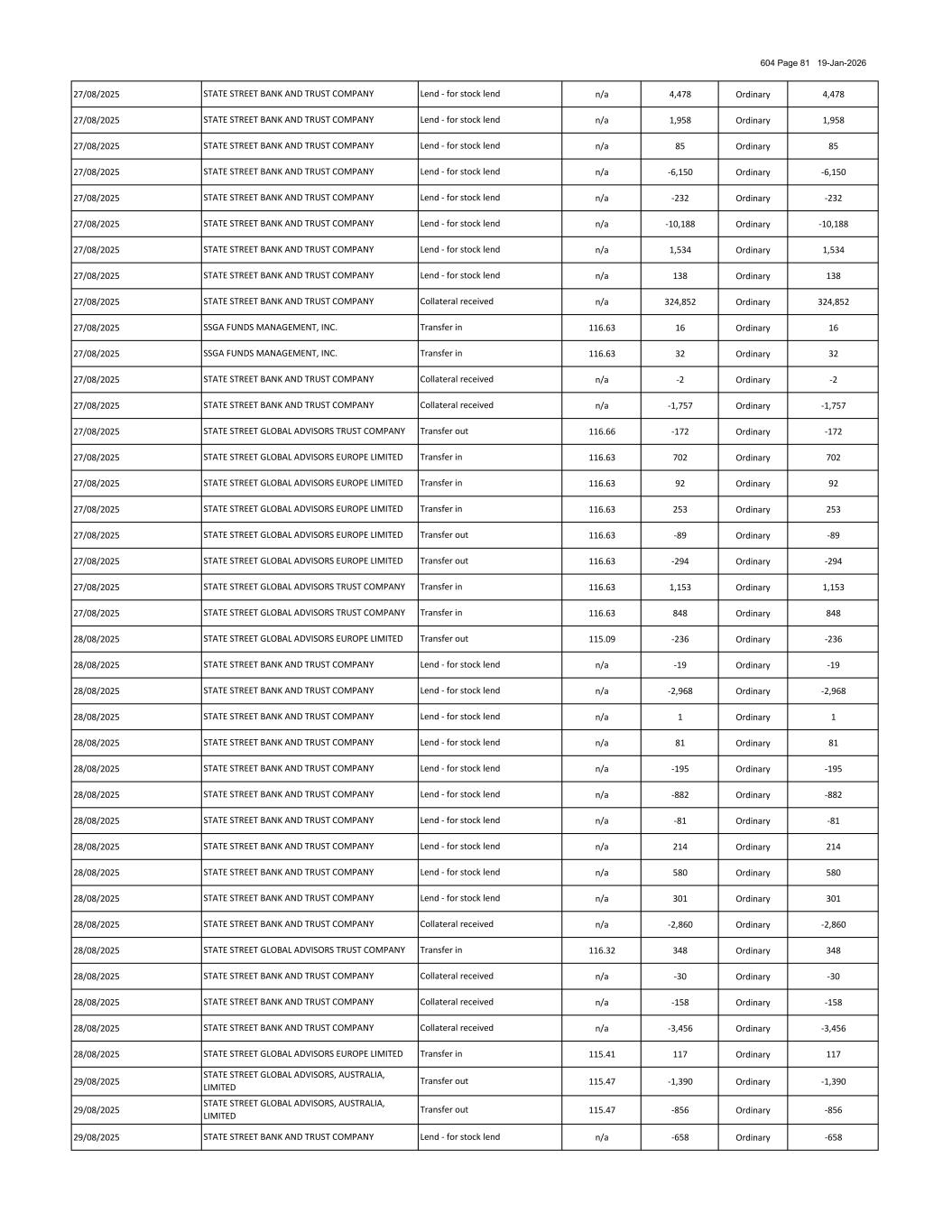 604 Page 81 19-Jan-2026 27/08/2025 n/a 4,478 Ordinary 4,478 27/08/2025 n/a 1,958 Ordinary 1,958 27/08/2025 n/a 85 Ordinary 85 27/08/2025 n/a -6,150 Ordinary -6,150 27/08/2025 n/a -232 Ordinary -232 27/08/2025 n/a -10,188 Ordinary -10,188 27/08/2025 n/a 1,534 Ordinary 1,534 27/08/2025 n/a 138 Ordinary 138 27/08/2025 n/a 324,852 Ordinary 324,852 27/08/2025 116.63 16 Ordinary 16 27/08/2025 116.63 32 Ordinary 32 27/08/2025 n/a -2 Ordinary -2 27/08/2025 n/a -1,757 Ordinary -1,757 27/08/2025 116.66 -172 Ordinary -172 27/08/2025 116.63 702 Ordinary 702 27/08/2025 116.63 92 Ordinary 92 27/08/2025 116.63 253 Ordinary 253 27/08/2025 116.63 -89 Ordinary -89 27/08/2025 116.63 -294 Ordinary -294 27/08/2025 116.63 1,153 Ordinary 1,153 27/08/2025 116.63 848 Ordinary 848 28/08/2025 115.09 -236 Ordinary -236 28/08/2025 n/a -19 Ordinary -19 28/08/2025 n/a -2,968 Ordinary -2,968 28/08/2025 n/a 1 Ordinary 1 28/08/2025 n/a 81 Ordinary 81 28/08/2025 n/a -195 Ordinary -195 28/08/2025 n/a -882 Ordinary -882 28/08/2025 n/a -81 Ordinary -81 28/08/2025 n/a 214 Ordinary 214 28/08/2025 n/a 580 Ordinary 580 28/08/2025 n/a 301 Ordinary 301 28/08/2025 n/a -2,860 Ordinary -2,860 28/08/2025 116.32 348 Ordinary 348 28/08/2025 n/a -30 Ordinary -30 28/08/2025 n/a -158 Ordinary -158 28/08/2025 n/a -3,456 Ordinary -3,456 28/08/2025 115.41 117 Ordinary 117 29/08/2025 115.47 -1,390 Ordinary -1,390 29/08/2025 115.47 -856 Ordinary -856 29/08/2025 n/a -658 Ordinary -658 STATE STREET GLOBAL ADVISORS, AUSTRALIA, LIMITED STATE STREET BANK AND TRUST COMPANY Lend - for stock lend STATE STREET GLOBAL ADVISORS EUROPE LIMITED Transfer out Lend - for stock lend Transfer out STATE STREET BANK AND TRUST COMPANY STATE STREET GLOBAL ADVISORS EUROPE LIMITED Transfer in Lend - for stock lend STATE STREET BANK AND TRUST COMPANY STATE STREET GLOBAL ADVISORS EUROPE LIMITED STATE STREET BANK AND TRUST COMPANY Lend - for stock lend STATE STREET BANK AND TRUST COMPANY STATE STREET GLOBAL ADVISORS EUROPE LIMITED Lend - for stock lend Lend - for stock lend STATE STREET GLOBAL ADVISORS, AUSTRALIA, LIMITED Transfer out STATE STREET BANK AND TRUST COMPANY Lend - for stock lend Transfer in Transfer in STATE STREET BANK AND TRUST COMPANY STATE STREET BANK AND TRUST COMPANY Collateral received STATE STREET GLOBAL ADVISORS EUROPE LIMITED SSGA FUNDS MANAGEMENT, INC. Lend - for stock lend Transfer in STATE STREET BANK AND TRUST COMPANY STATE STREET GLOBAL ADVISORS TRUST COMPANY Collateral received Transfer out STATE STREET BANK AND TRUST COMPANY Transfer in STATE STREET BANK AND TRUST COMPANY STATE STREET GLOBAL ADVISORS TRUST COMPANY STATE STREET BANK AND TRUST COMPANY Collateral received STATE STREET GLOBAL ADVISORS EUROPE LIMITED Lend - for stock lend SSGA FUNDS MANAGEMENT, INC. Lend - for stock lend Collateral received STATE STREET BANK AND TRUST COMPANY Transfer in Lend - for stock lend Transfer out Lend - for stock lend STATE STREET BANK AND TRUST COMPANY STATE STREET BANK AND TRUST COMPANY Collateral received STATE STREET BANK AND TRUST COMPANY STATE STREET BANK AND TRUST COMPANY Lend - for stock lend STATE STREET BANK AND TRUST COMPANY Lend - for stock lend STATE STREET GLOBAL ADVISORS TRUST COMPANY Collateral received STATE STREET GLOBAL ADVISORS TRUST COMPANY STATE STREET BANK AND TRUST COMPANY STATE STREET BANK AND TRUST COMPANY Transfer in Lend - for stock lend STATE STREET BANK AND TRUST COMPANY Collateral received Lend - for stock lend STATE STREET BANK AND TRUST COMPANY STATE STREET BANK AND TRUST COMPANY Lend - for stock lend Transfer out STATE STREET GLOBAL ADVISORS EUROPE LIMITED STATE STREET BANK AND TRUST COMPANY Transfer in STATE STREET BANK AND TRUST COMPANY Lend - for stock lend STATE STREET BANK AND TRUST COMPANY Transfer in Lend - for stock lend