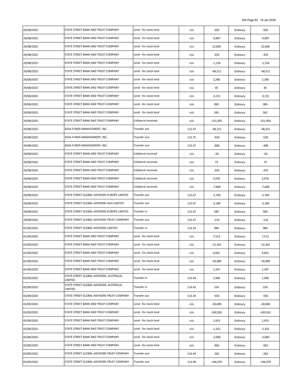 604 Page 82 19-Jan-2026 29/08/2025 n/a -503 Ordinary -503 29/08/2025 n/a -9,897 Ordinary -9,897 29/08/2025 n/a 12,600 Ordinary 12,600 29/08/2025 n/a -333 Ordinary -333 29/08/2025 n/a -1,156 Ordinary -1,156 29/08/2025 n/a -48,511 Ordinary -48,511 29/08/2025 n/a 2,280 Ordinary 2,280 29/08/2025 n/a 45 Ordinary 45 29/08/2025 n/a -3,151 Ordinary -3,151 29/08/2025 n/a 983 Ordinary 983 29/08/2025 n/a 581 Ordinary 581 29/08/2025 n/a -321,992 Ordinary -321,992 29/08/2025 115.47 -48,151 Ordinary -48,151 29/08/2025 115.75 -530 Ordinary -530 29/08/2025 115.47 -408 Ordinary -408 29/08/2025 n/a -26 Ordinary -26 29/08/2025 n/a 73 Ordinary 73 29/08/2025 n/a -243 Ordinary -243 29/08/2025 n/a 5,976 Ordinary 5,976 29/08/2025 n/a -7,608 Ordinary -7,608 29/08/2025 115.47 -2,769 Ordinary -2,769 29/08/2025 115.47 -3,184 Ordinary -3,184 29/08/2025 115.47 585 Ordinary 585 29/08/2025 115.47 -119 Ordinary -119 01/09/2025 114.33 984 Ordinary 984 01/09/2025 n/a 7,513 Ordinary 7,513 01/09/2025 n/a -15,361 Ordinary -15,361 01/09/2025 n/a 6,601 Ordinary 6,601 01/09/2025 n/a -29,480 Ordinary -29,480 01/09/2025 n/a 1,247 Ordinary 1,247 02/09/2025 114.44 1,946 Ordinary 1,946 02/09/2025 114.42 254 Ordinary 254 02/09/2025 114.44 -556 Ordinary -556 02/09/2025 n/a -30,000 Ordinary -30,000 02/09/2025 n/a -249,261 Ordinary -249,261 02/09/2025 n/a 1,923 Ordinary 1,923 02/09/2025 n/a -1,331 Ordinary -1,331 02/09/2025 n/a -2,000 Ordinary -2,000 02/09/2025 n/a -662 Ordinary -662 02/09/2025 114.44 -262 Ordinary -262 02/09/2025 113.99 -146,070 Ordinary -146,070 STATE STREET GLOBAL ADVISORS, AUSTRALIA, LIMITED STATE STREET BANK AND TRUST COMPANY STATE STREET BANK AND TRUST COMPANY Transfer in Transfer out Lend - for stock lend Transfer in Collateral received Lend - for stock lend STATE STREET GLOBAL ADVISORS TRUST COMPANY Lend - for stock lend STATE STREET GLOBAL ADVISORS EUROPE LIMITED STATE STREET BANK AND TRUST COMPANY Transfer out Transfer out Lend - for stock lend STATE STREET GLOBAL ADVISORS, AUSTRALIA, LIMITED STATE STREET GLOBAL ADVISORS EUROPE LIMITED STATE STREET BANK AND TRUST COMPANY STATE STREET BANK AND TRUST COMPANY Transfer out Transfer out STATE STREET BANK AND TRUST COMPANY Lend - for stock lend STATE STREET GLOBAL ADVISORS ASIA LIMITED Lend - for stock lend STATE STREET BANK AND TRUST COMPANY Lend - for stock lend Lend - for stock lend SSGA FUNDS MANAGEMENT, INC. STATE STREET BANK AND TRUST COMPANY Transfer in Transfer out Lend - for stock lend STATE STREET BANK AND TRUST COMPANY STATE STREET GLOBAL ADVISORS TRUST COMPANY Lend - for stock lend Collateral received Lend - for stock lend STATE STREET BANK AND TRUST COMPANY STATE STREET BANK AND TRUST COMPANY SSGA FUNDS MANAGEMENT, INC. Lend - for stock lend Lend - for stock lend SSGA FUNDS MANAGEMENT, INC. STATE STREET BANK AND TRUST COMPANY Transfer out STATE STREET BANK AND TRUST COMPANY Lend - for stock lend STATE STREET BANK AND TRUST COMPANY STATE STREET GLOBAL ADVISORS LIMITED STATE STREET BANK AND TRUST COMPANY Lend - for stock lend STATE STREET BANK AND TRUST COMPANY STATE STREET BANK AND TRUST COMPANY Lend - for stock lend Lend - for stock lend Collateral received STATE STREET BANK AND TRUST COMPANY Transfer out Lend - for stock lend STATE STREET GLOBAL ADVISORS TRUST COMPANY STATE STREET BANK AND TRUST COMPANY Collateral received Lend - for stock lend STATE STREET BANK AND TRUST COMPANY STATE STREET BANK AND TRUST COMPANY STATE STREET BANK AND TRUST COMPANY Transfer out Lend - for stock lend Collateral received STATE STREET BANK AND TRUST COMPANY STATE STREET BANK AND TRUST COMPANY Transfer in STATE STREET BANK AND TRUST COMPANY Collateral received Lend - for stock lend STATE STREET GLOBAL ADVISORS TRUST COMPANY Lend - for stock lend STATE STREET BANK AND TRUST COMPANY STATE STREET BANK AND TRUST COMPANY STATE STREET BANK AND TRUST COMPANY